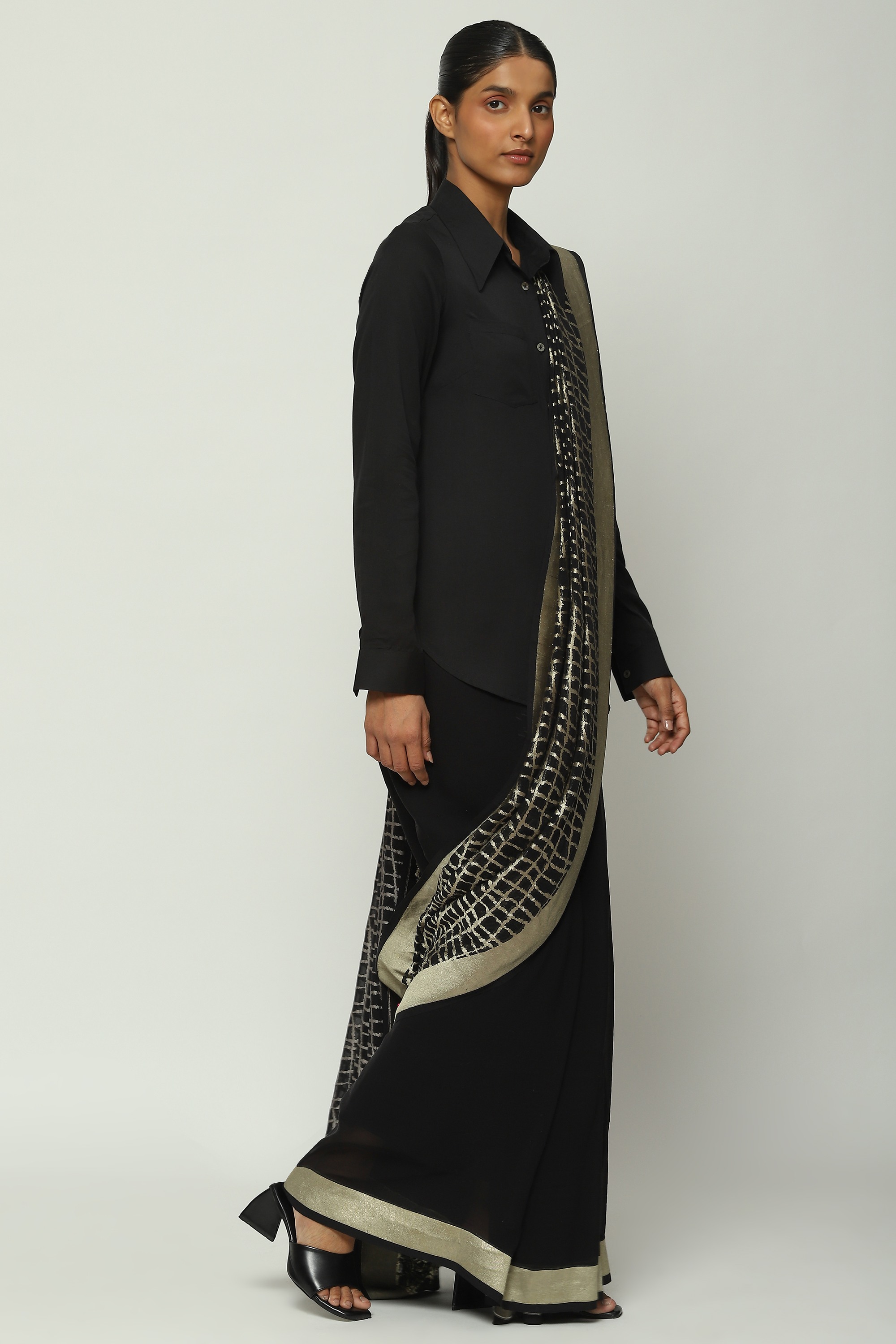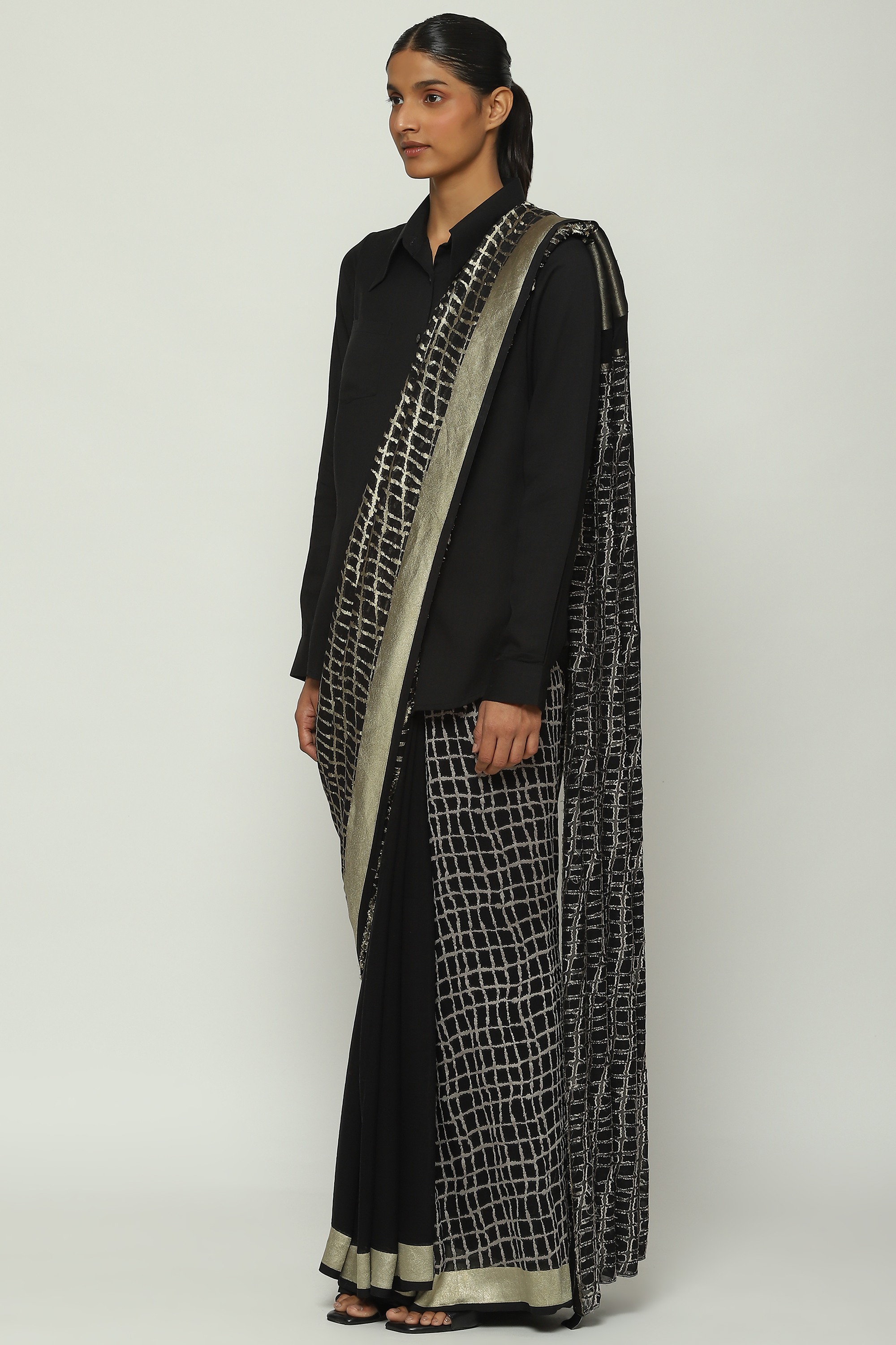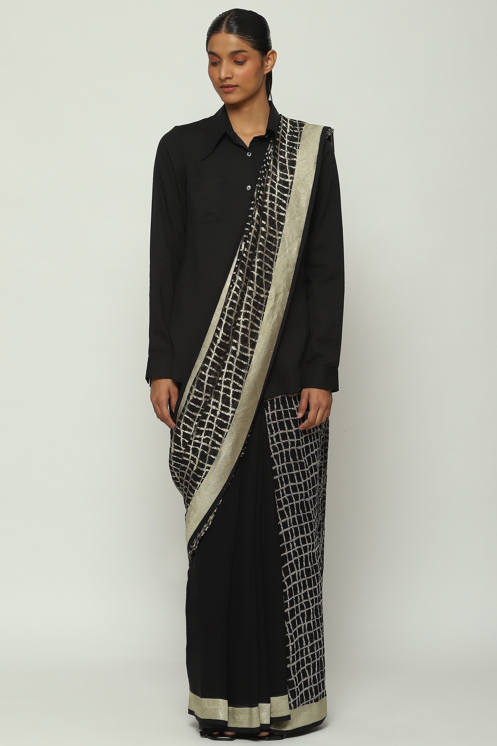 A black saree embellished with golden thread. Crafted in semi-sheer silk georgette, the pattern on this piece is woven in zari using the brocade technique. Ideal for an evening soiree.