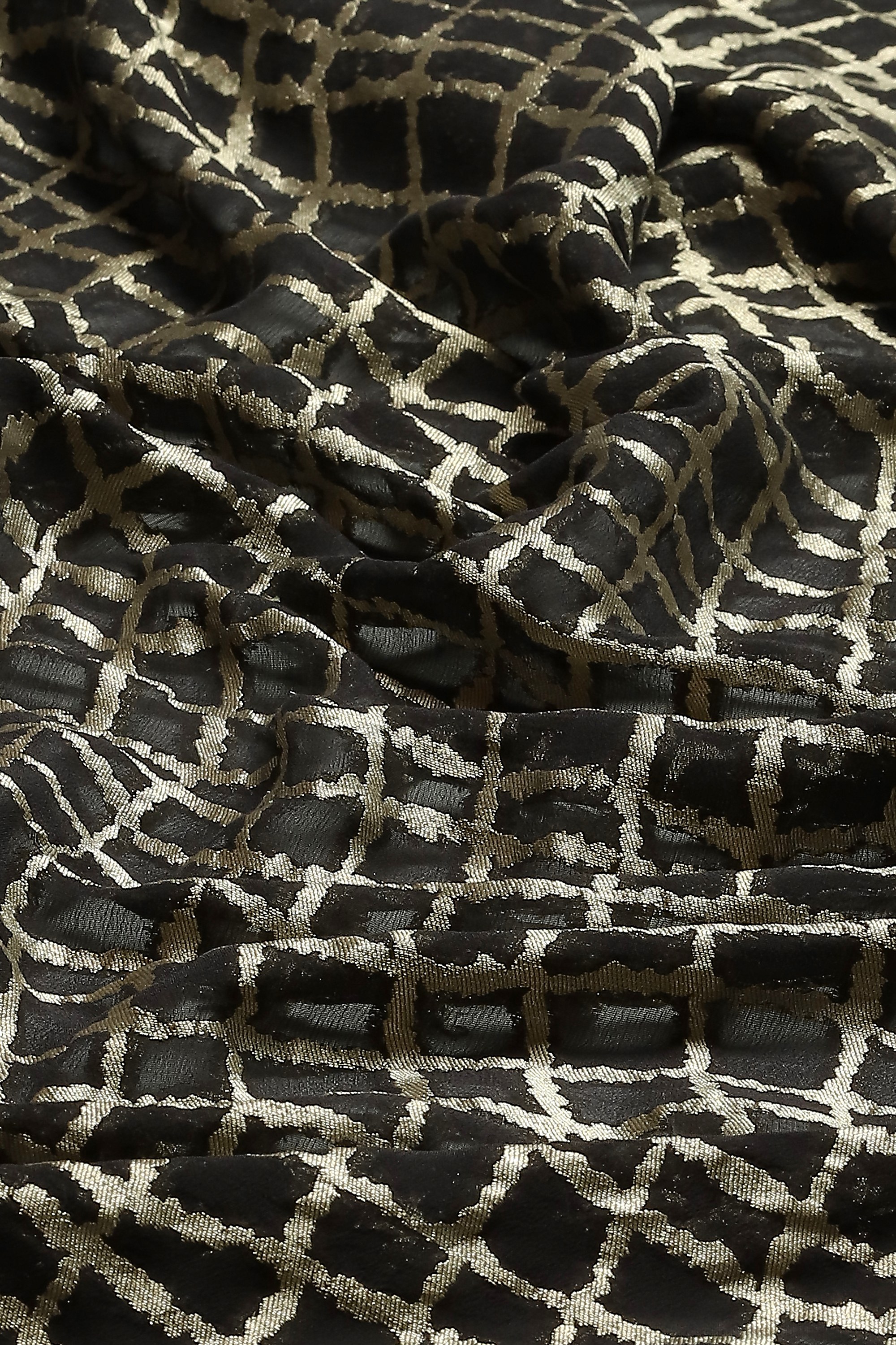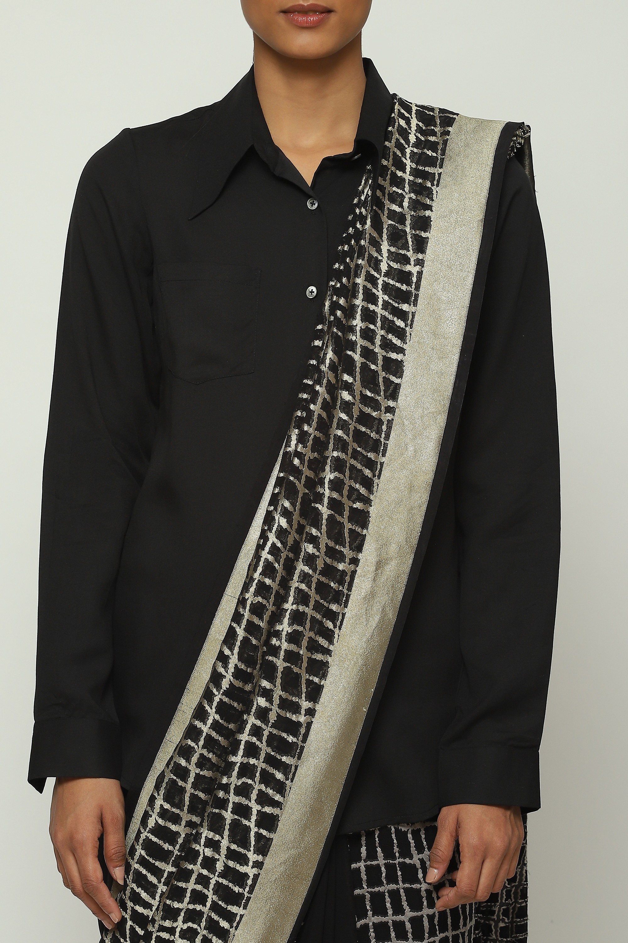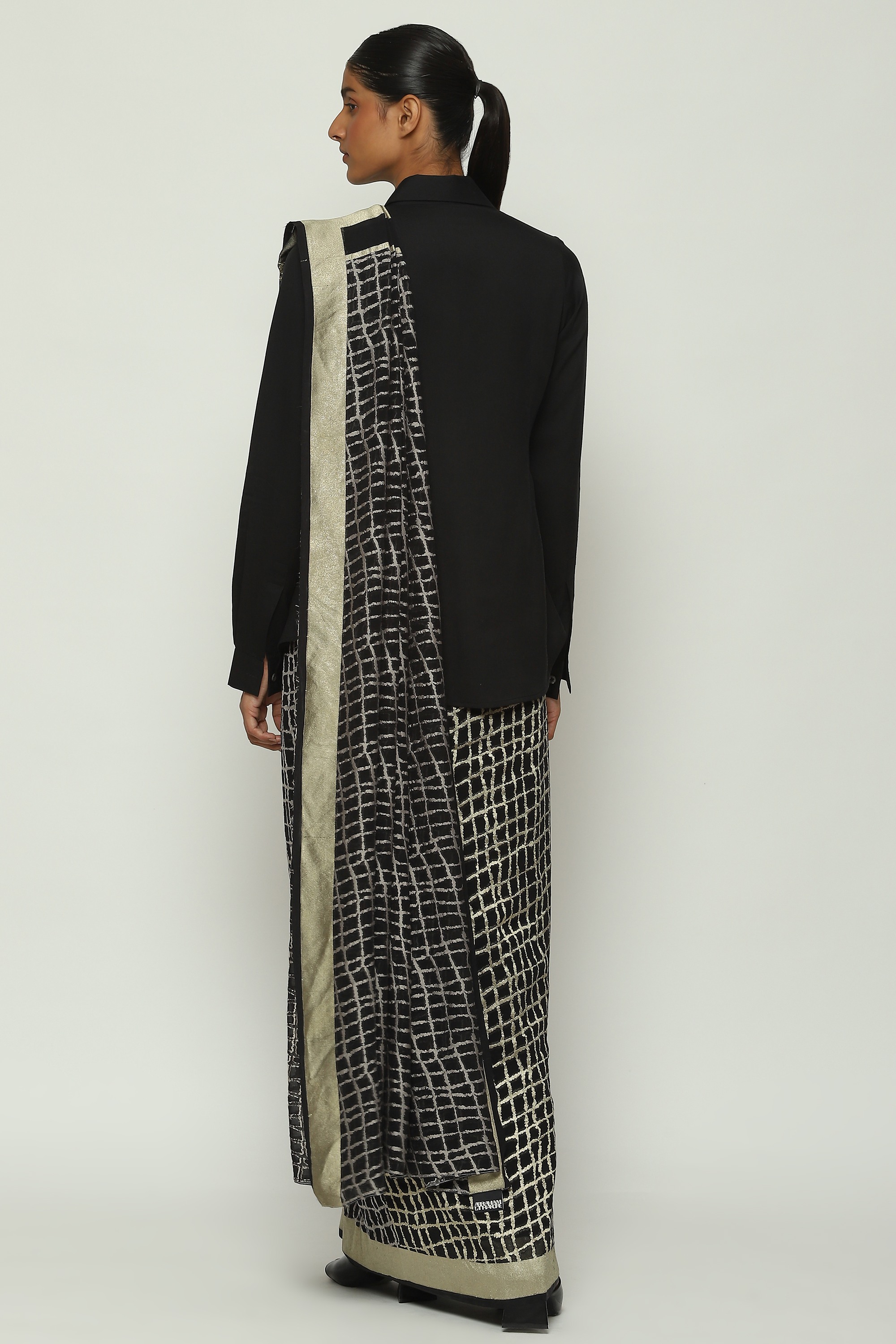 A black saree embellished with golden thread. Crafted in semi-sheer silk georgette, the pattern on this piece is woven in zari using the brocade technique. Ideal for an evening soiree.