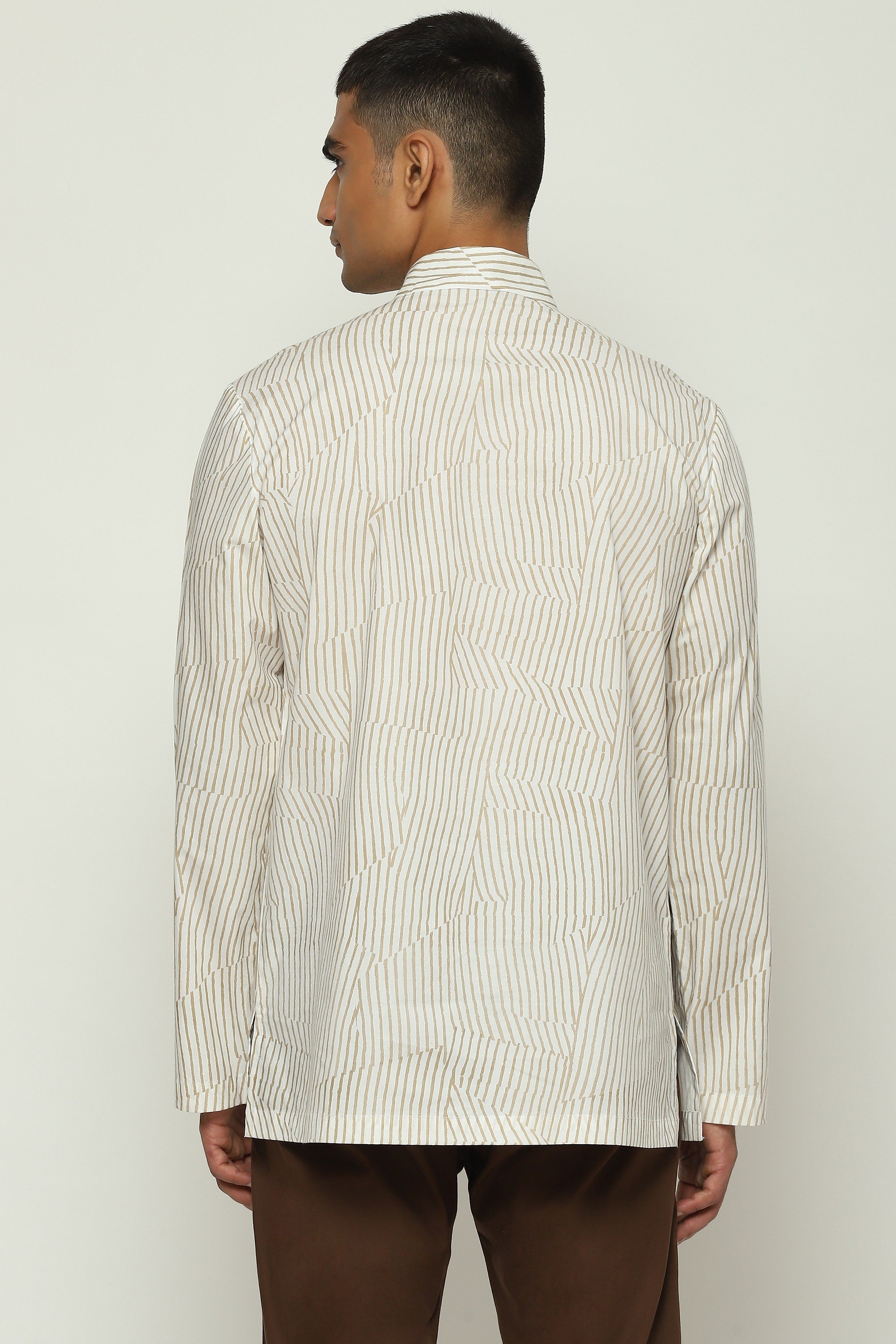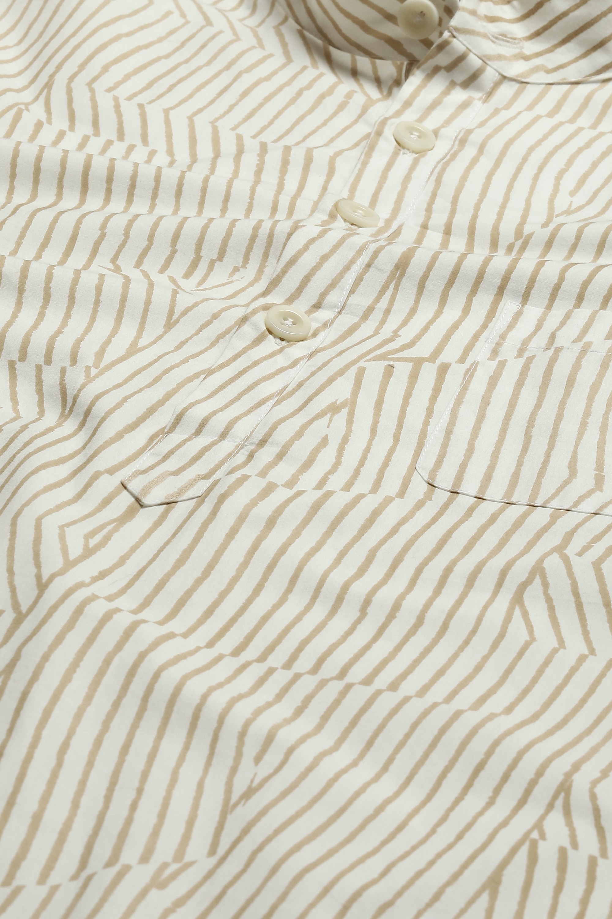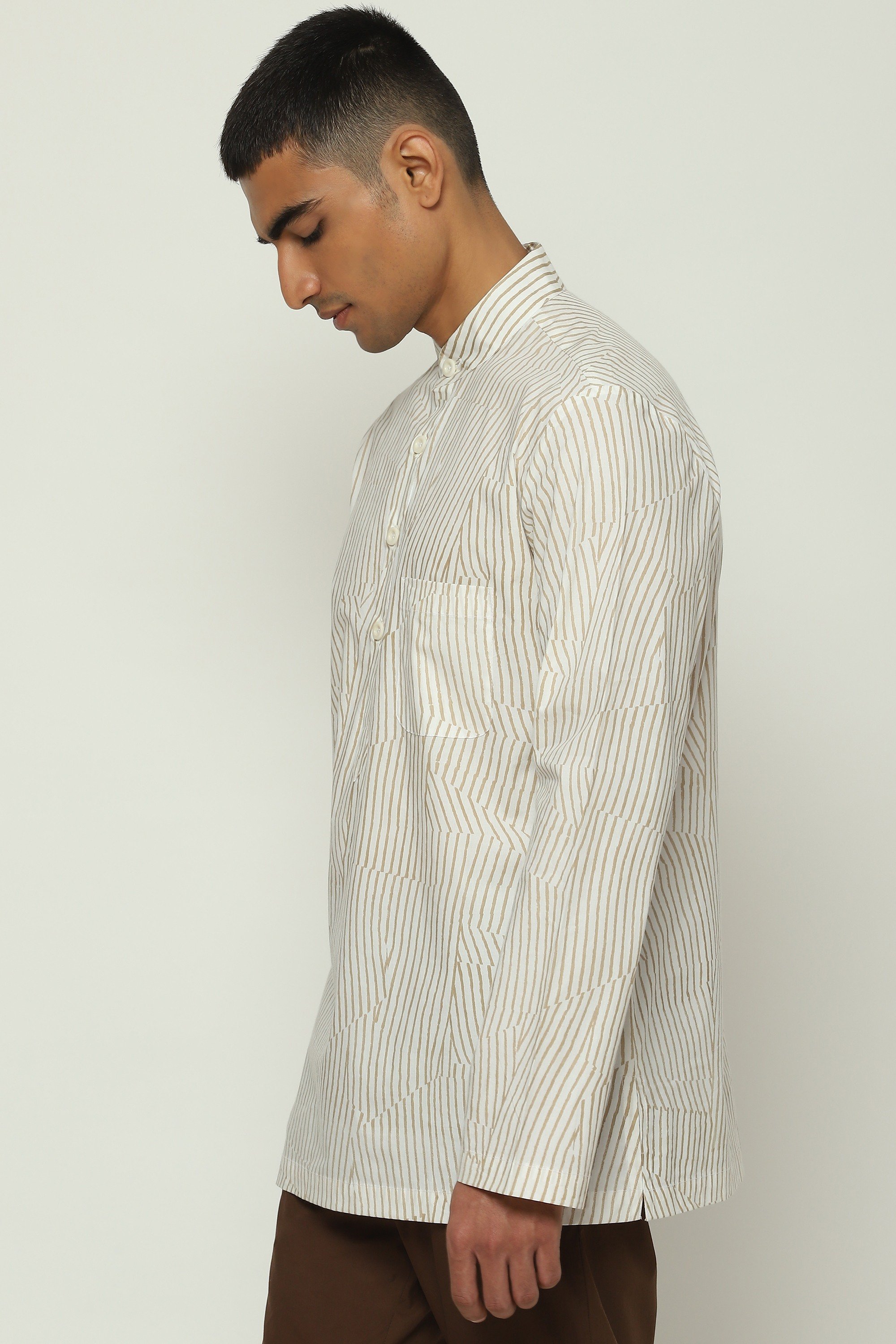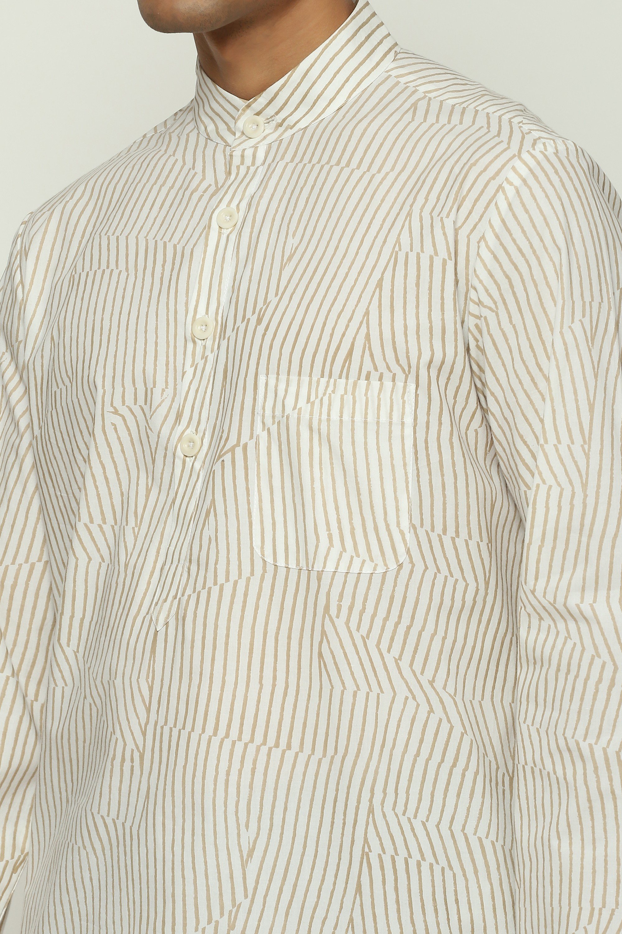 Degraded channels of communication, depicted with broken pinstripes on an ecru kurta. Body Language, from Abraham & Thakore, plays with the nuances of human connection in the digital age. Crafted in cotton. Ideal for hopping across echo chambers.