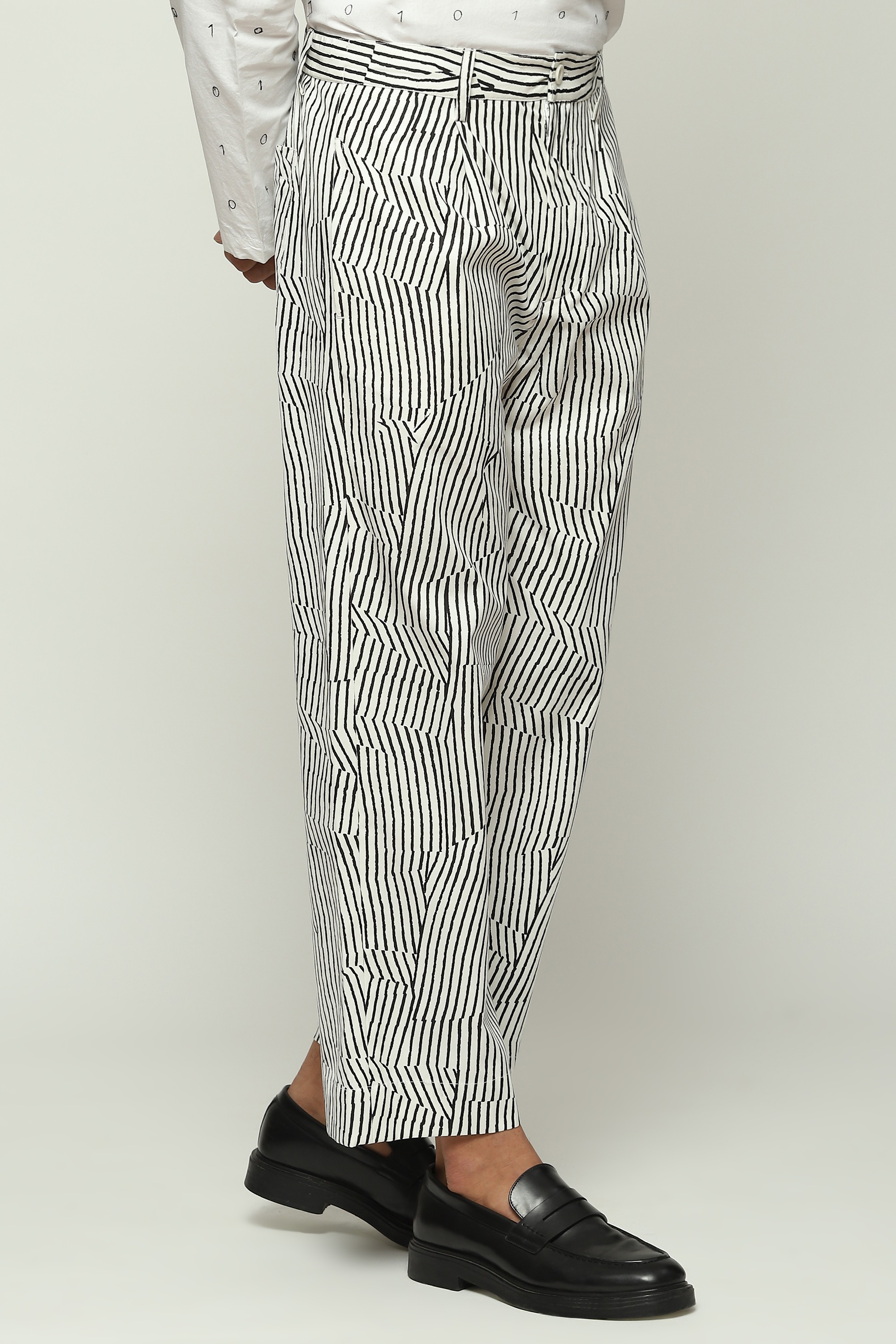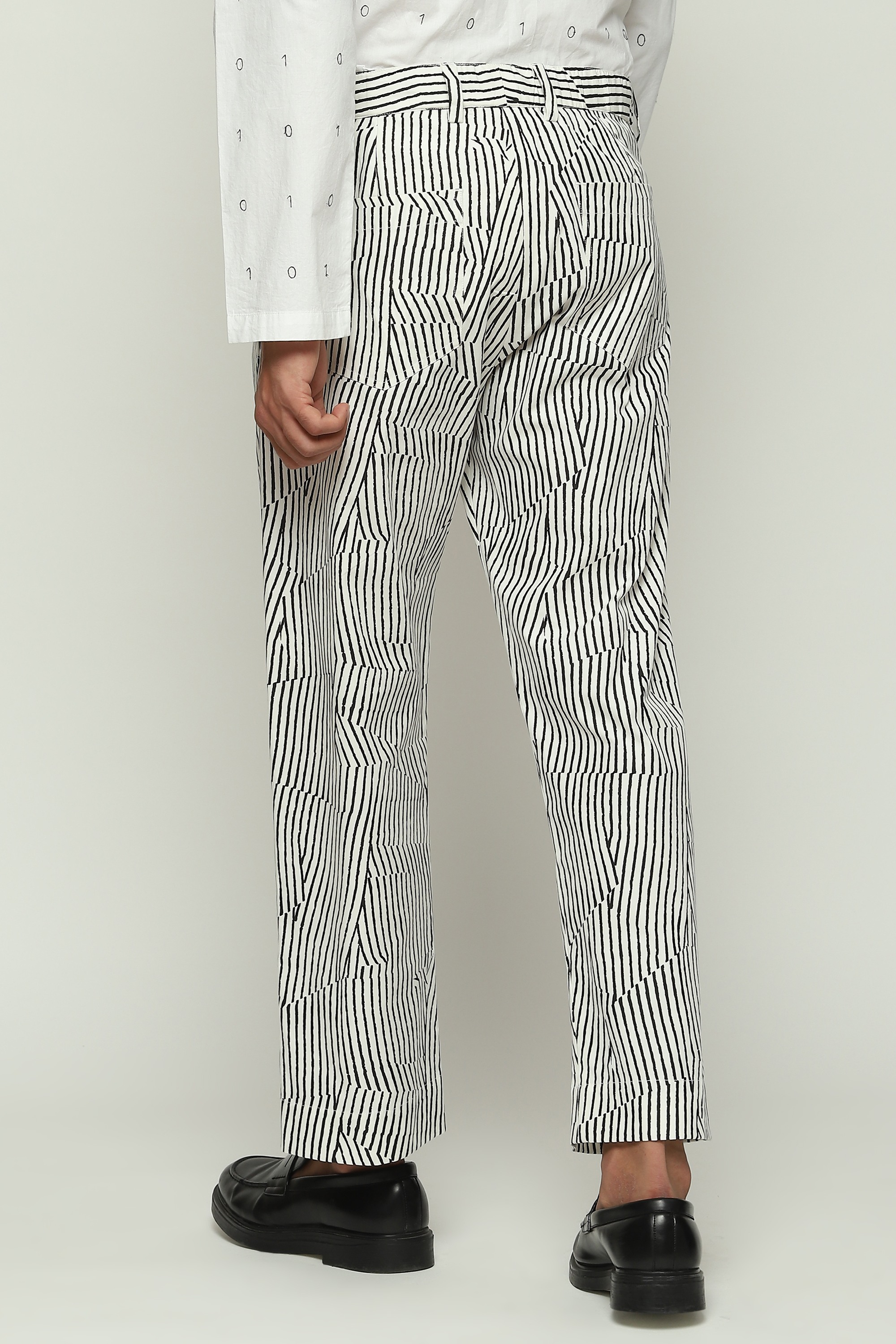 Degraded channels of communication, depicted with broken pinstripes on a white pair of straight trousers.