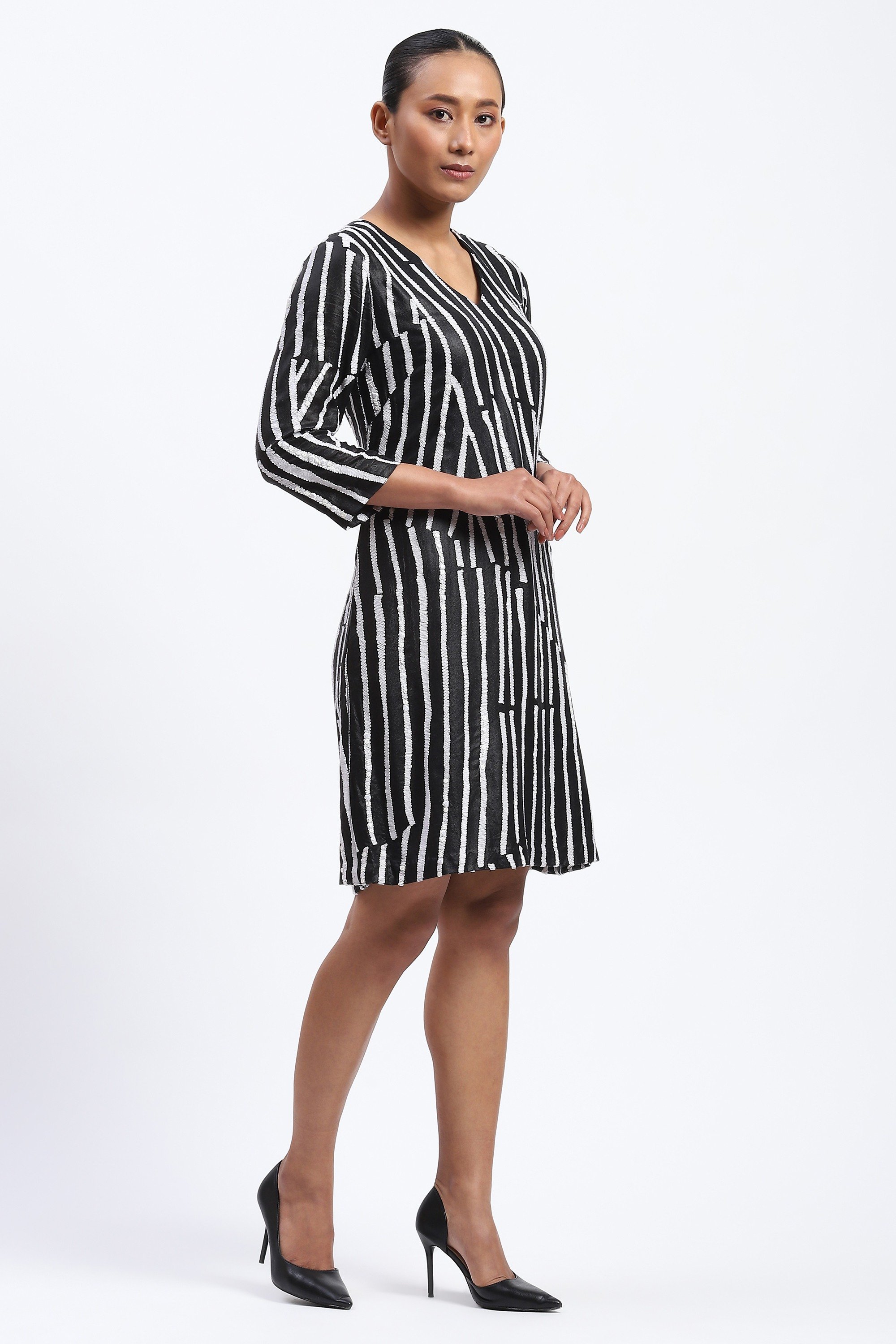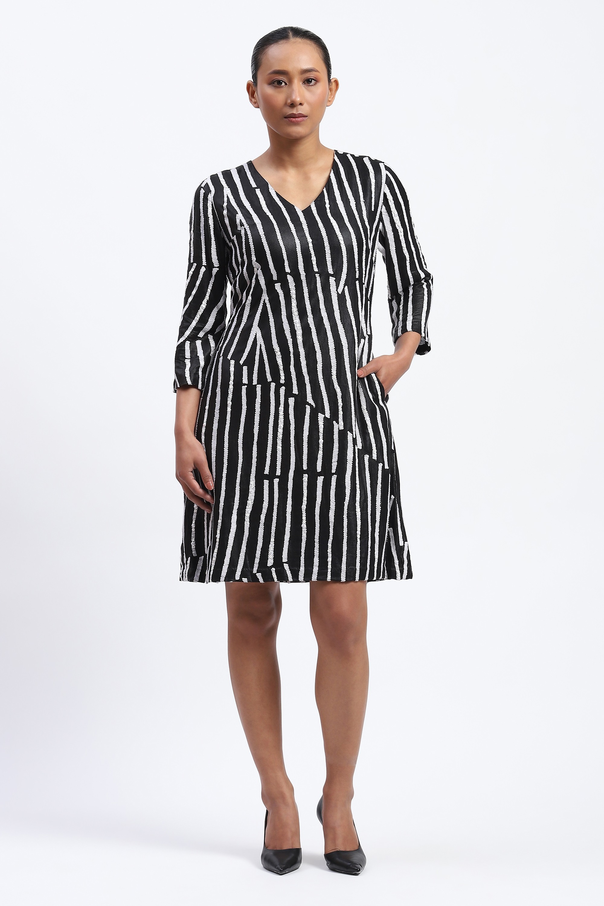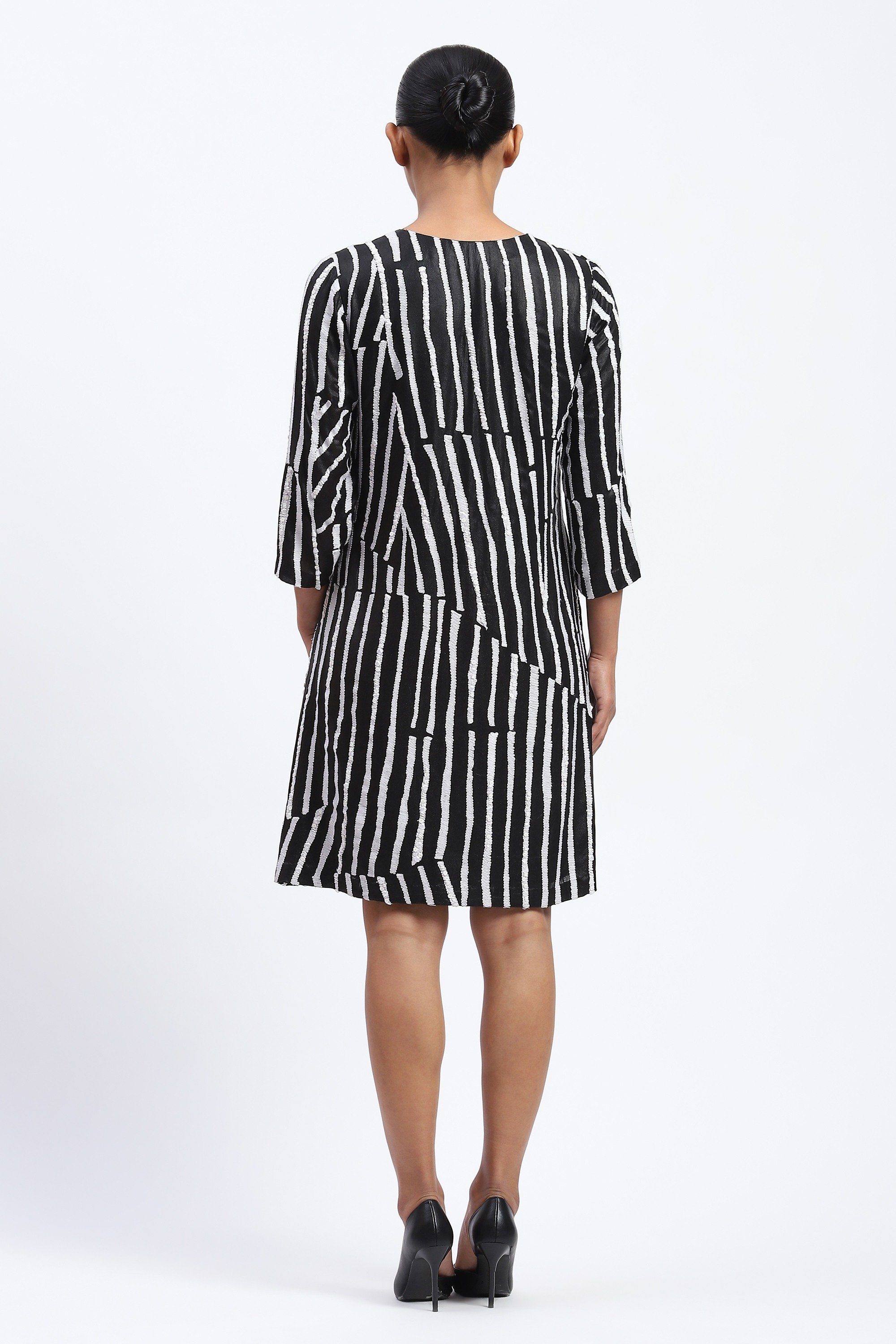 This limited edition piece has been made using an embroidered broken stripe pattern on georgette using a mix of crewel embroidery and assorted trims to create a glamorous optical look.