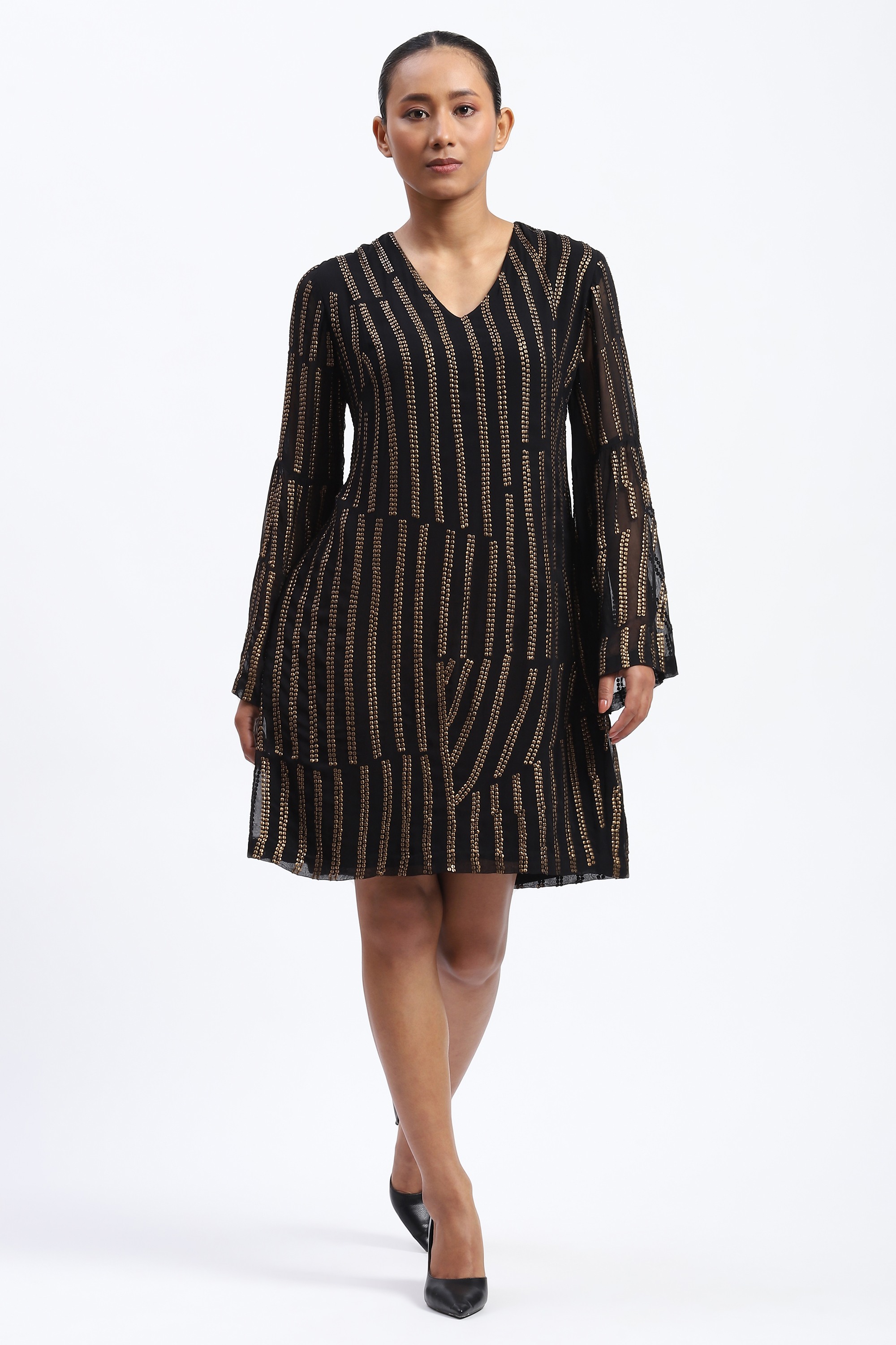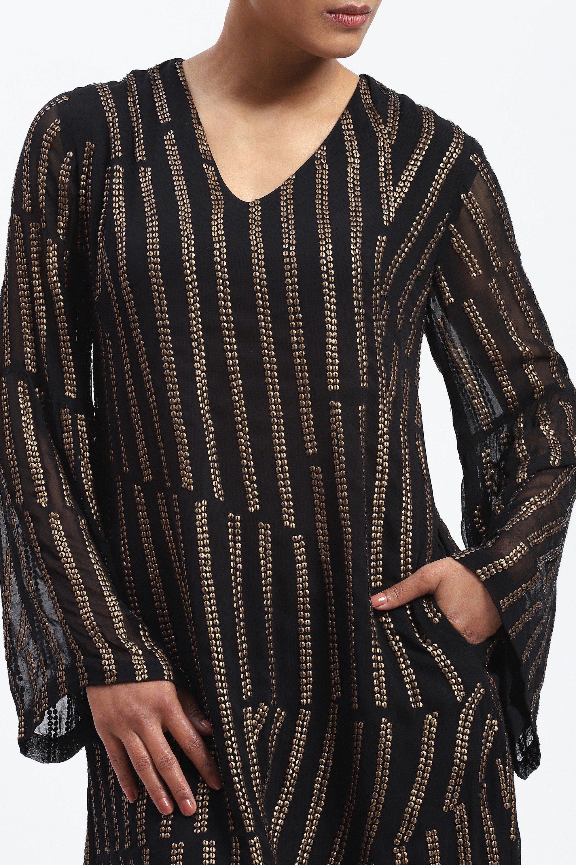 This limited edition piece has been made using an embroidered broken stripe pattern on georgette using dull metallic sequins to create a glamorous optical look.