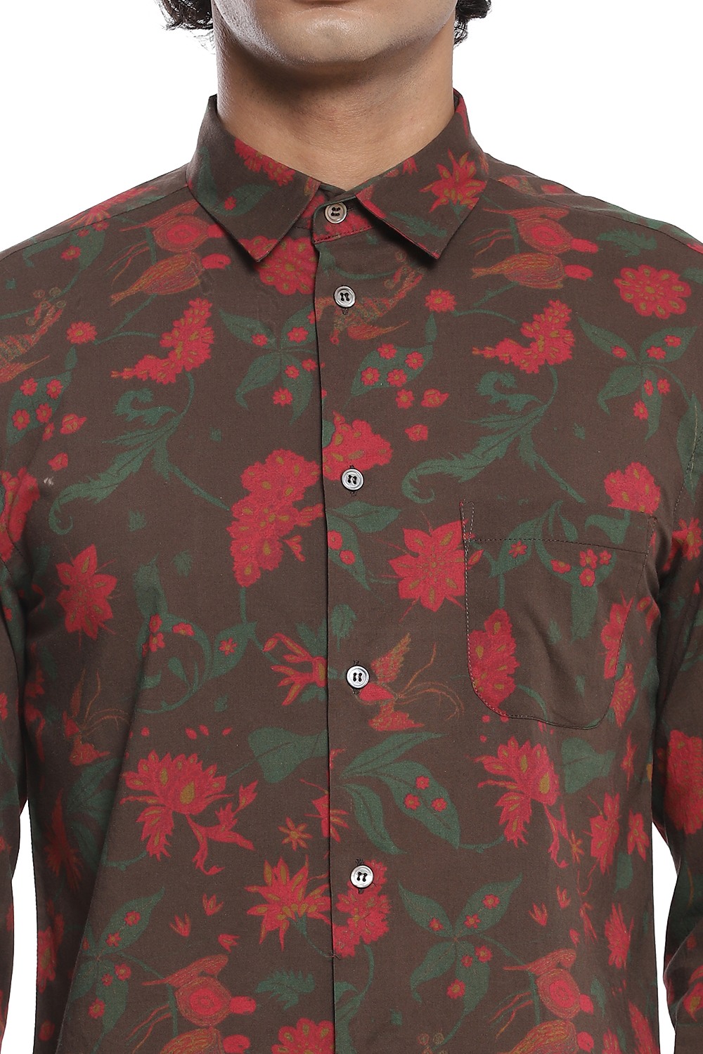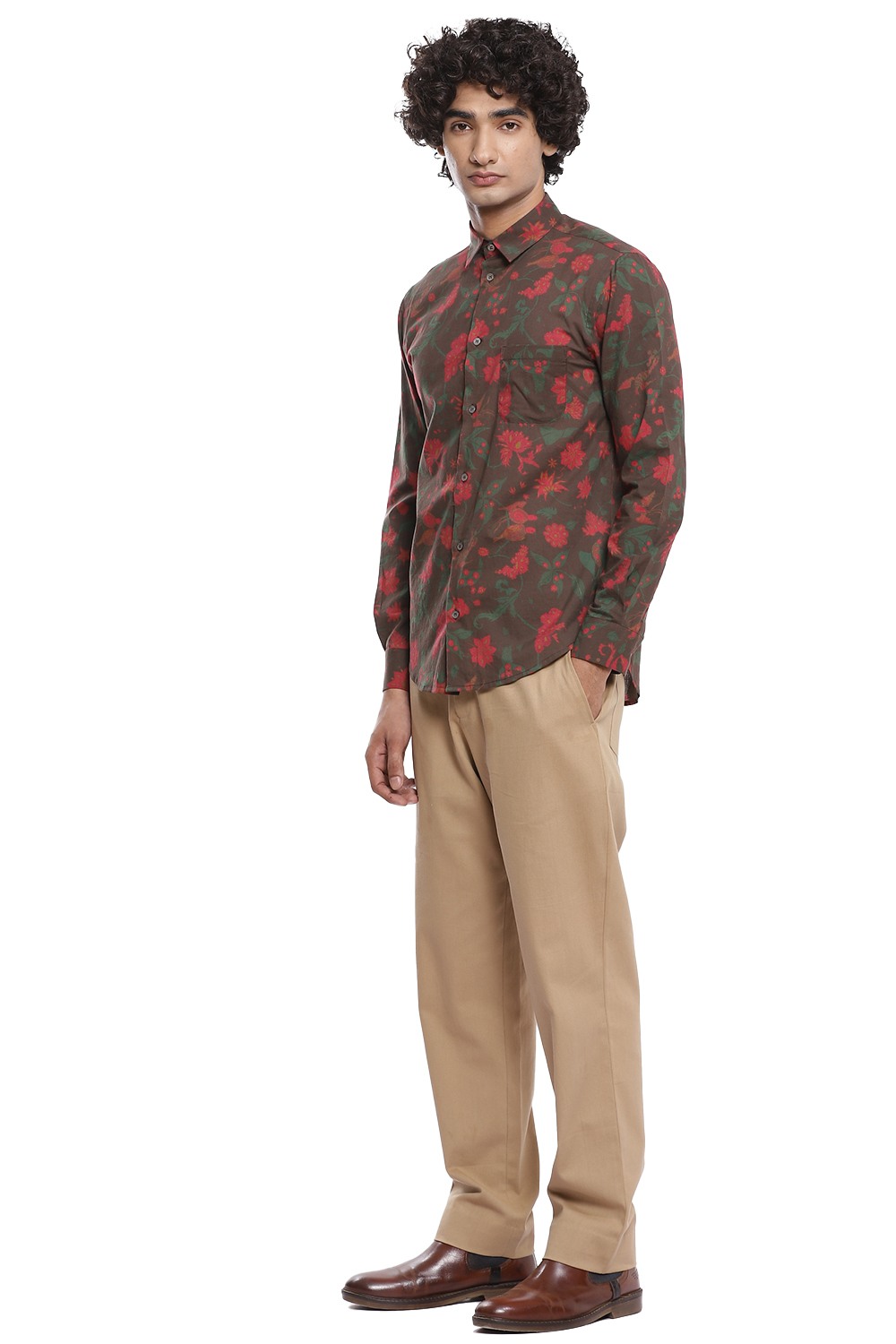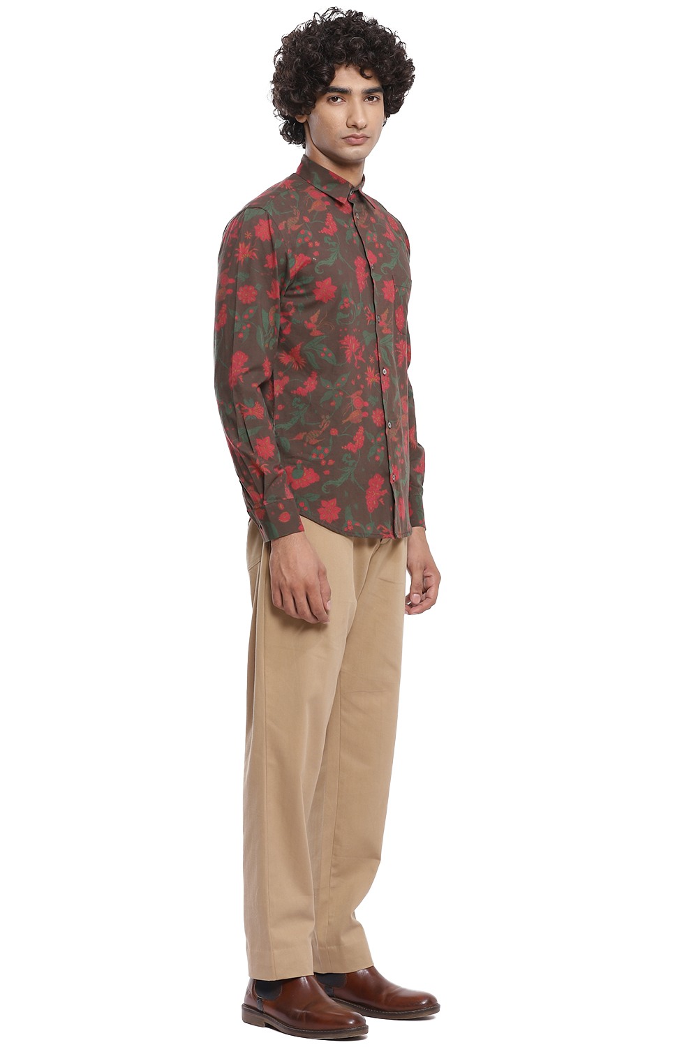 Multicolour floral printed shirt inspired by chintz on a brown ground, crafted from cotton cambric. This shirt is cut for an easy and comfortable fit.