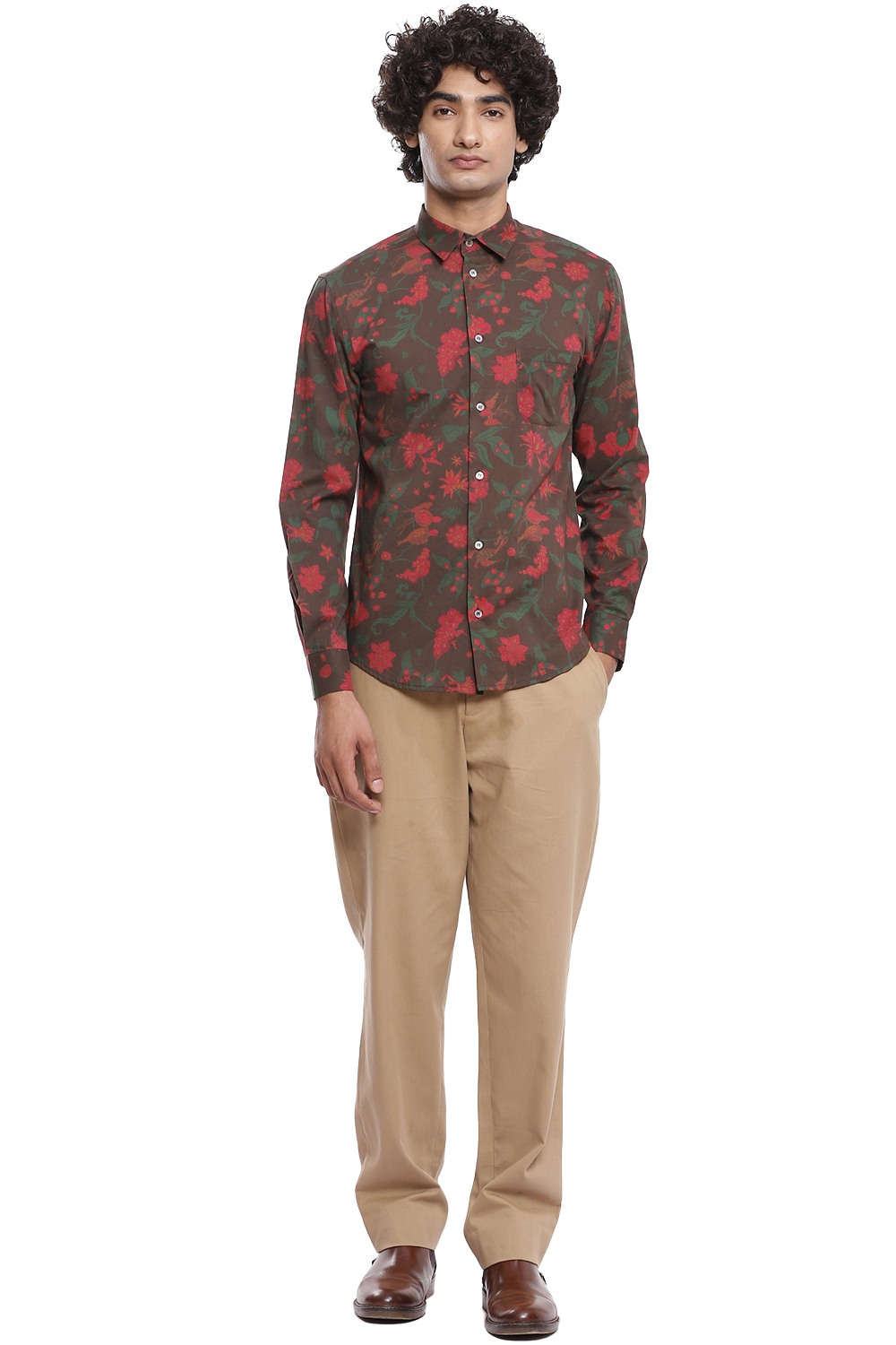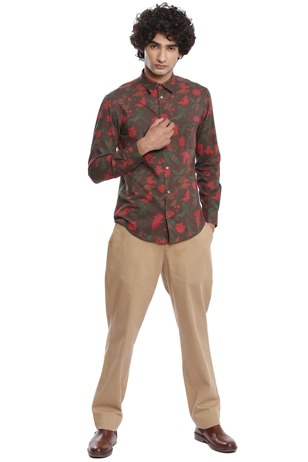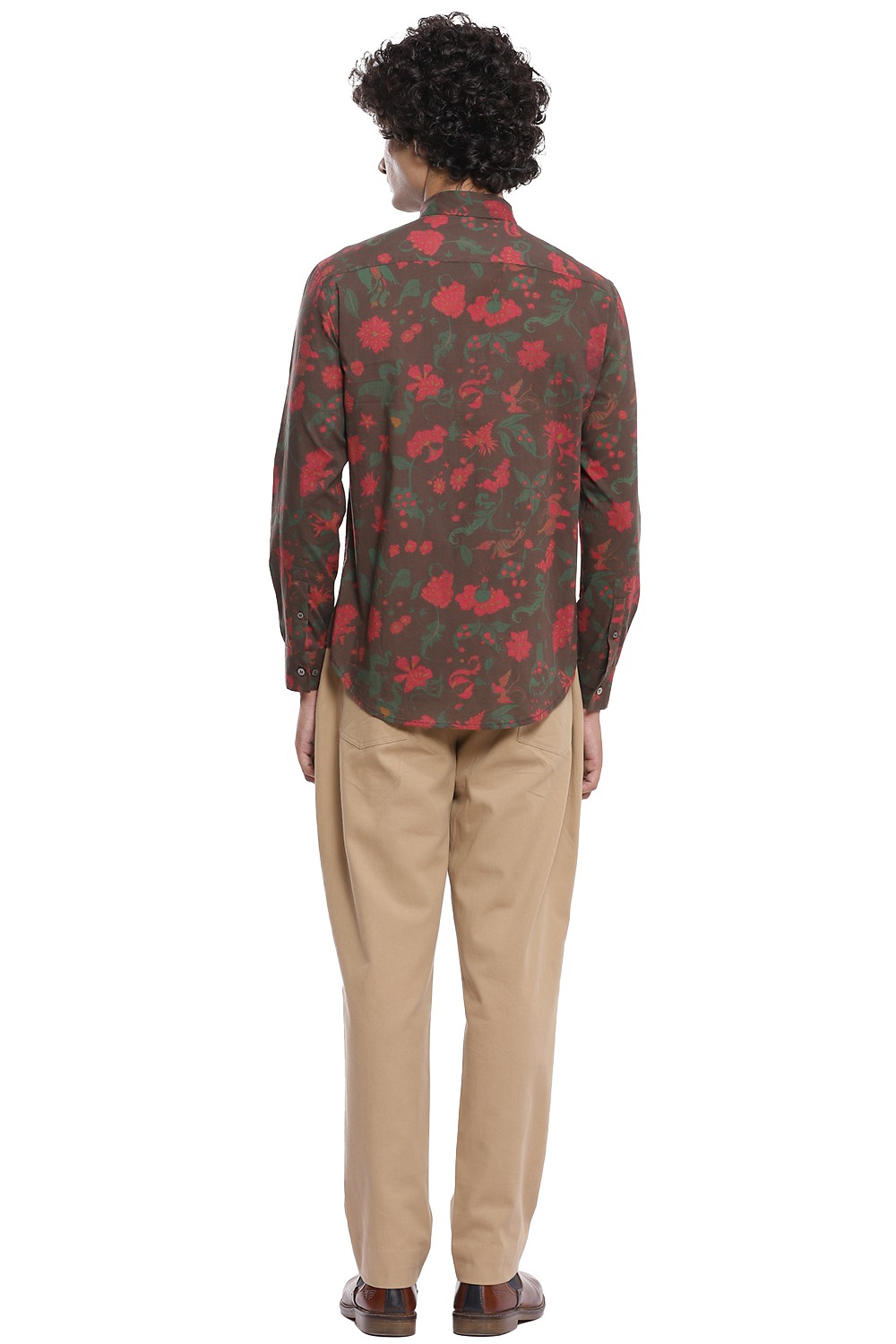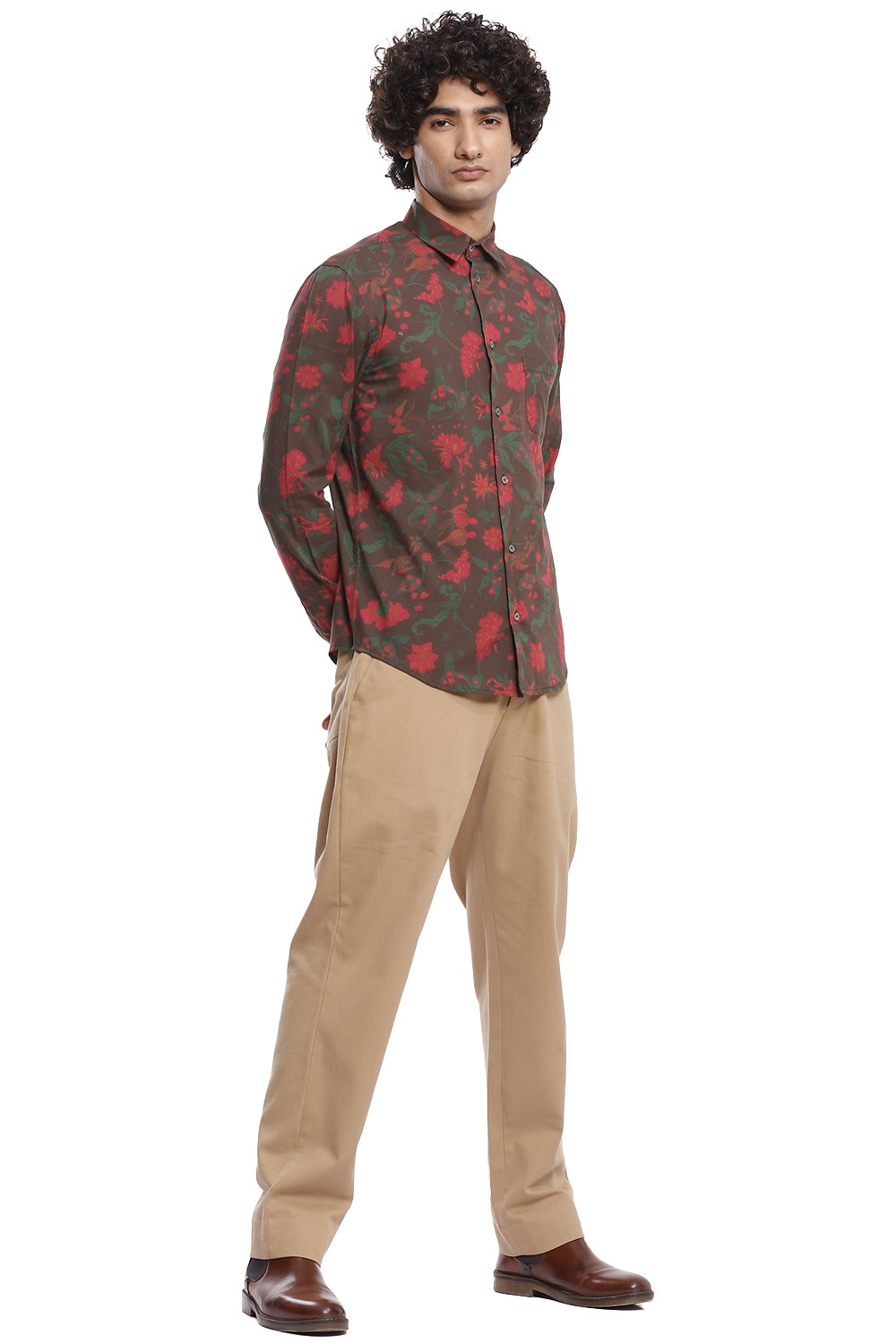 Multicolour floral printed shirt inspired by chintz on a brown ground, crafted from cotton cambric. This shirt is cut for an easy and comfortable fit.