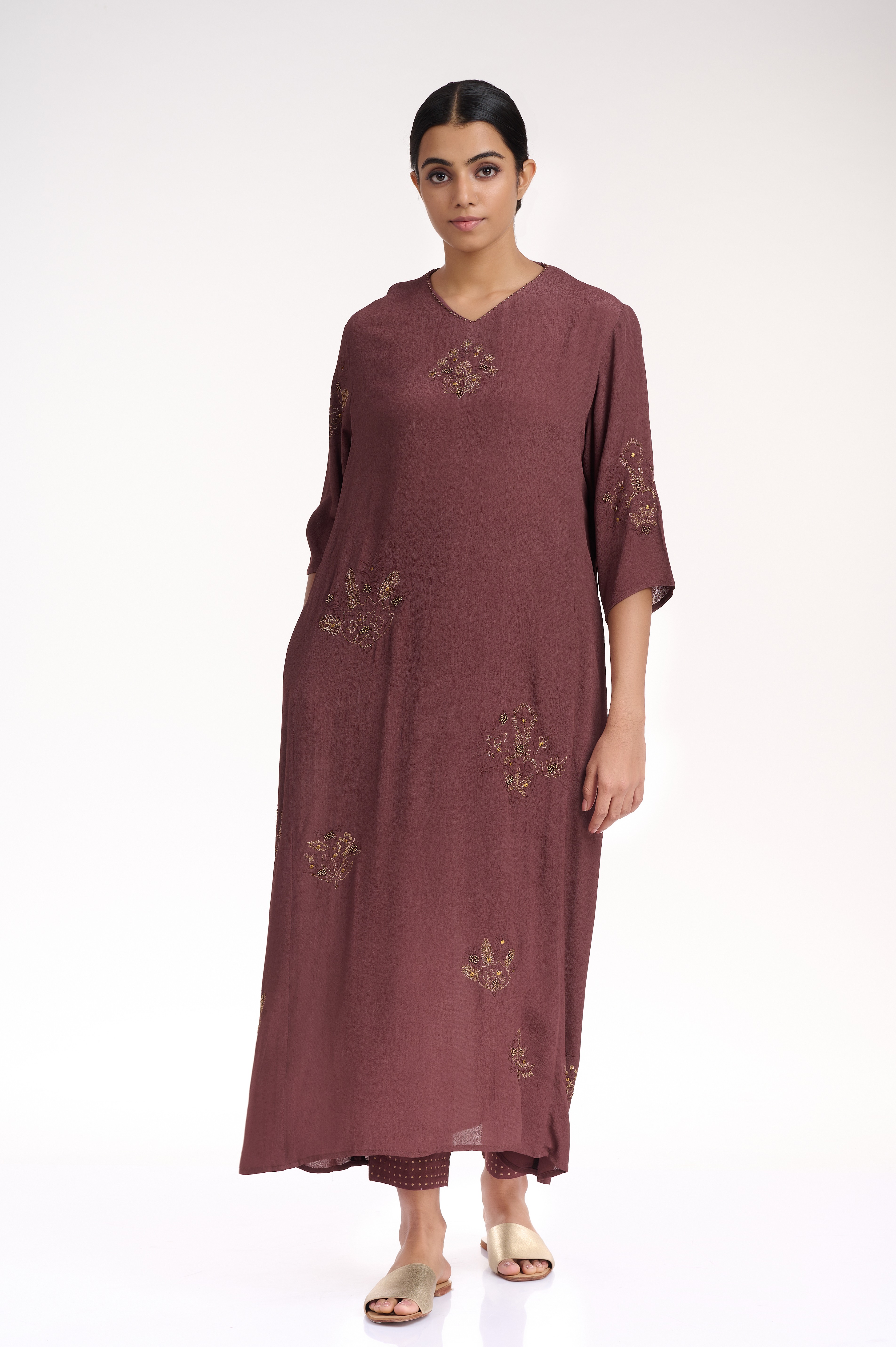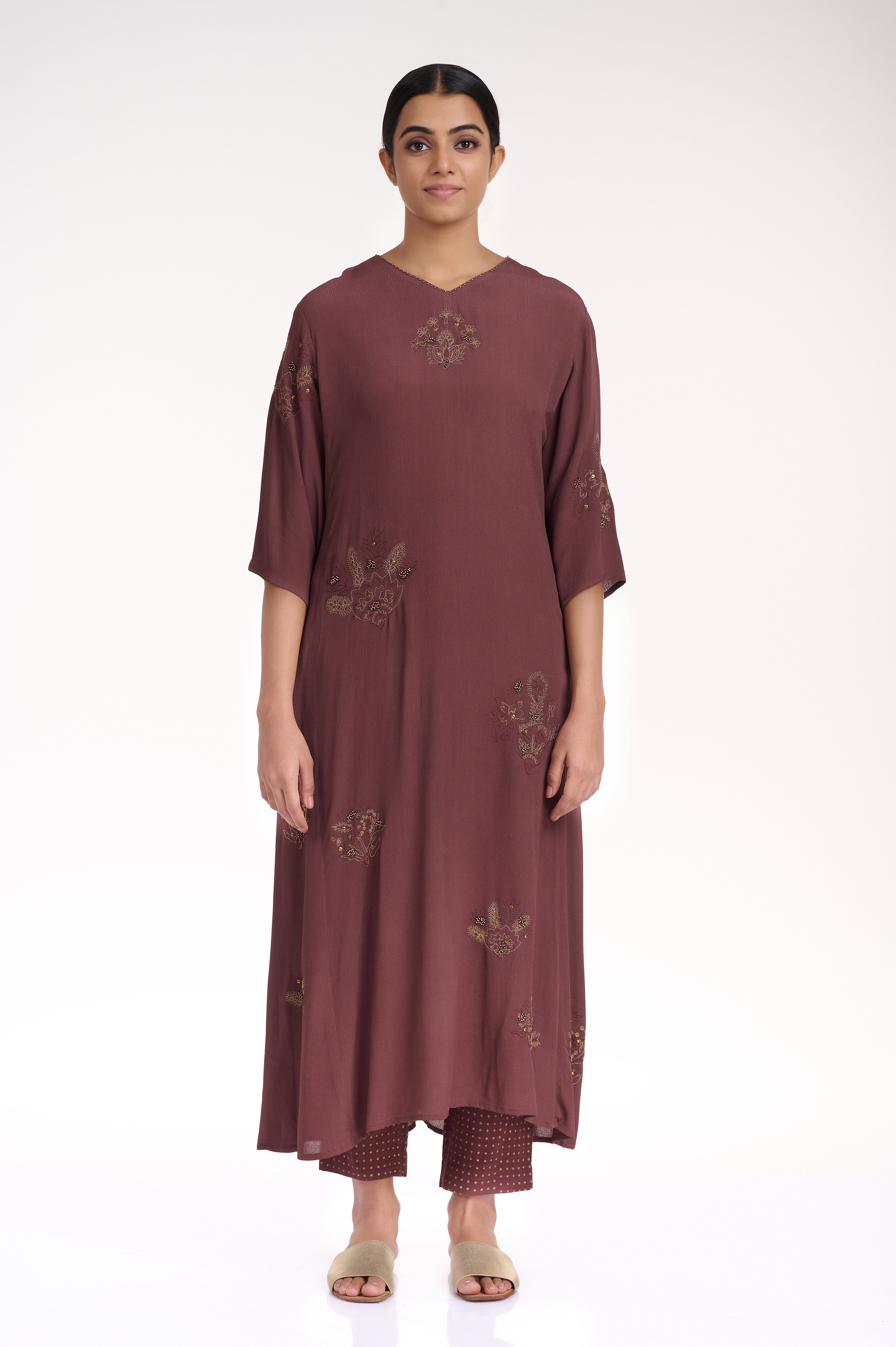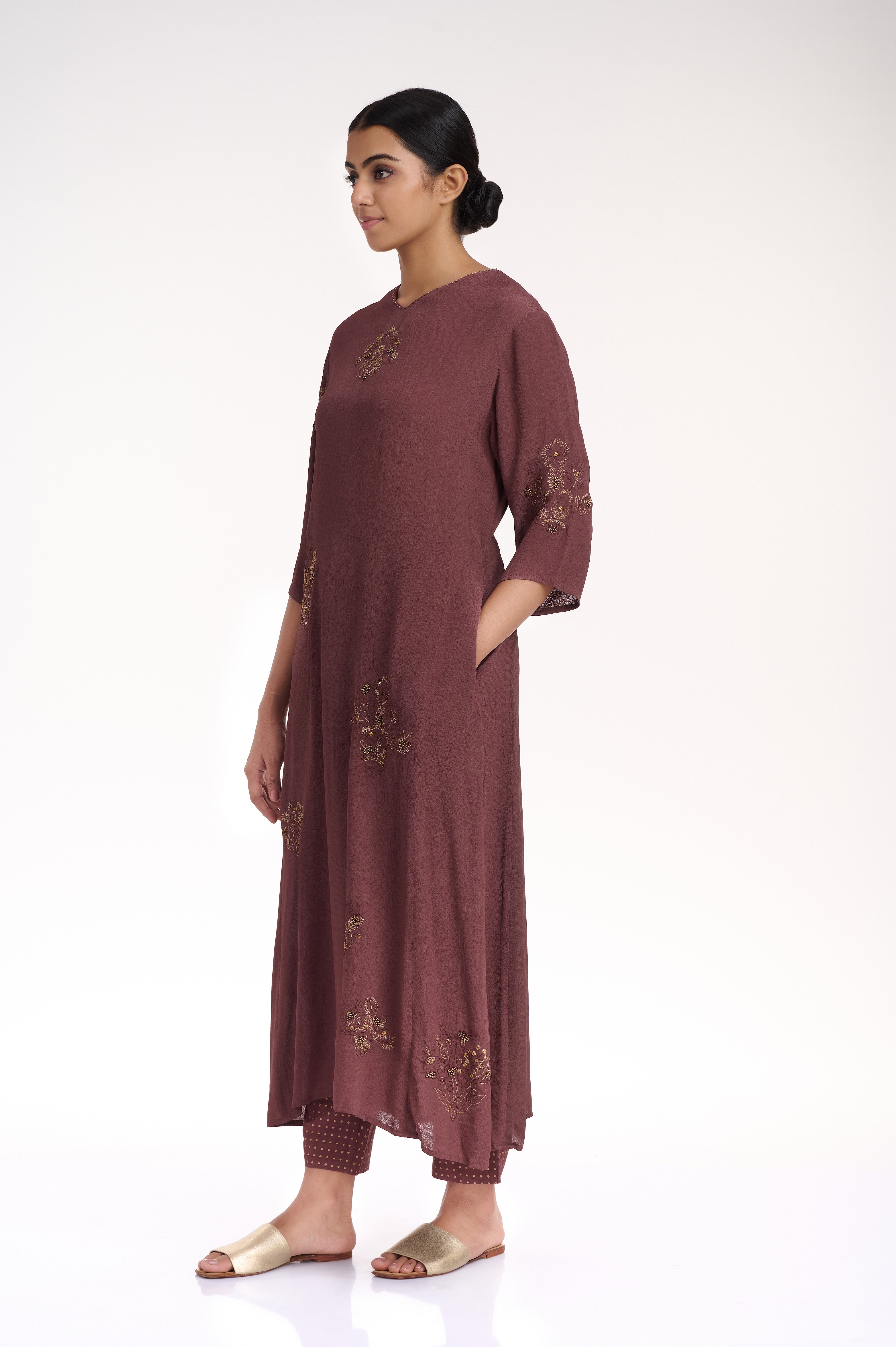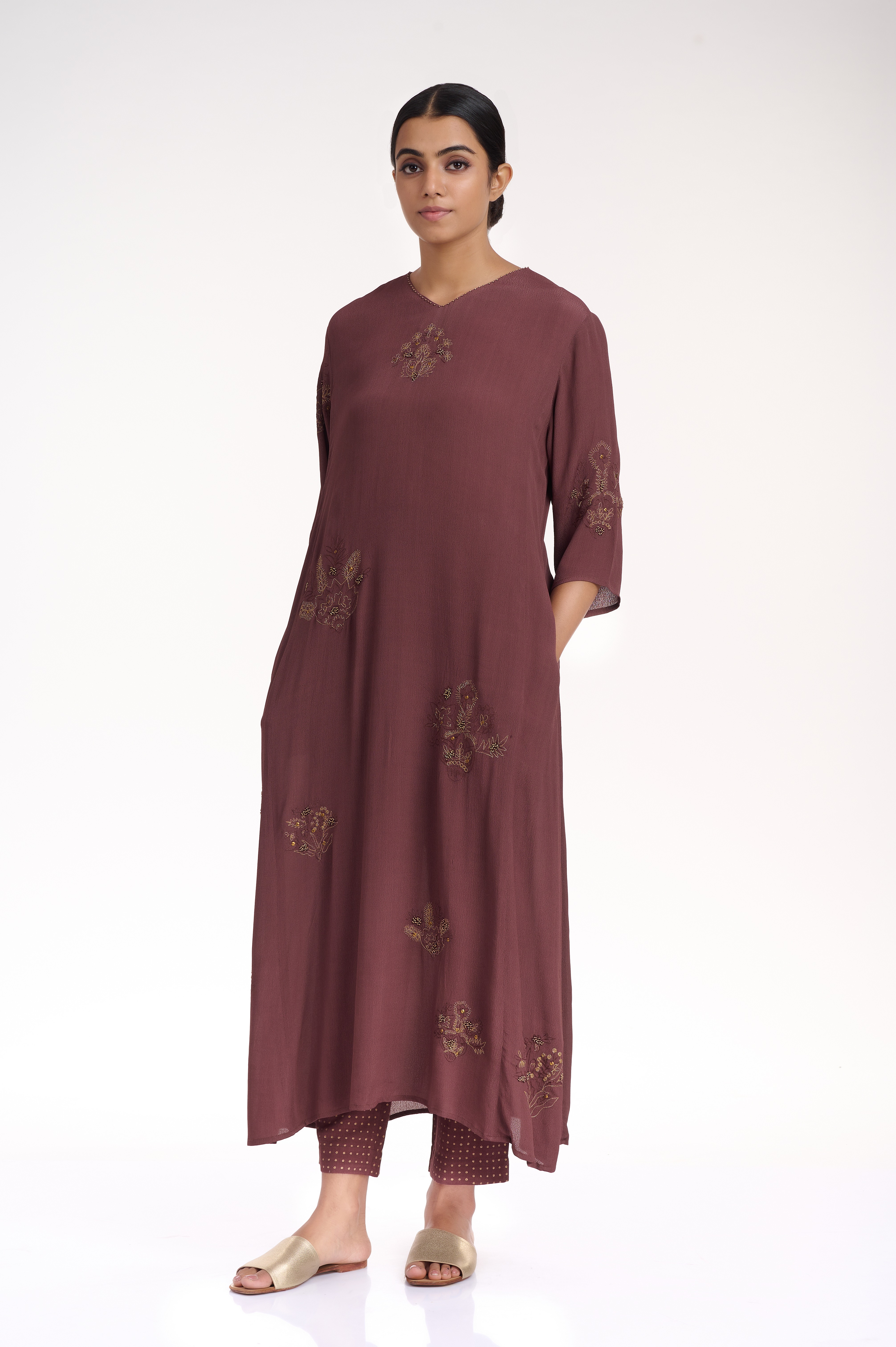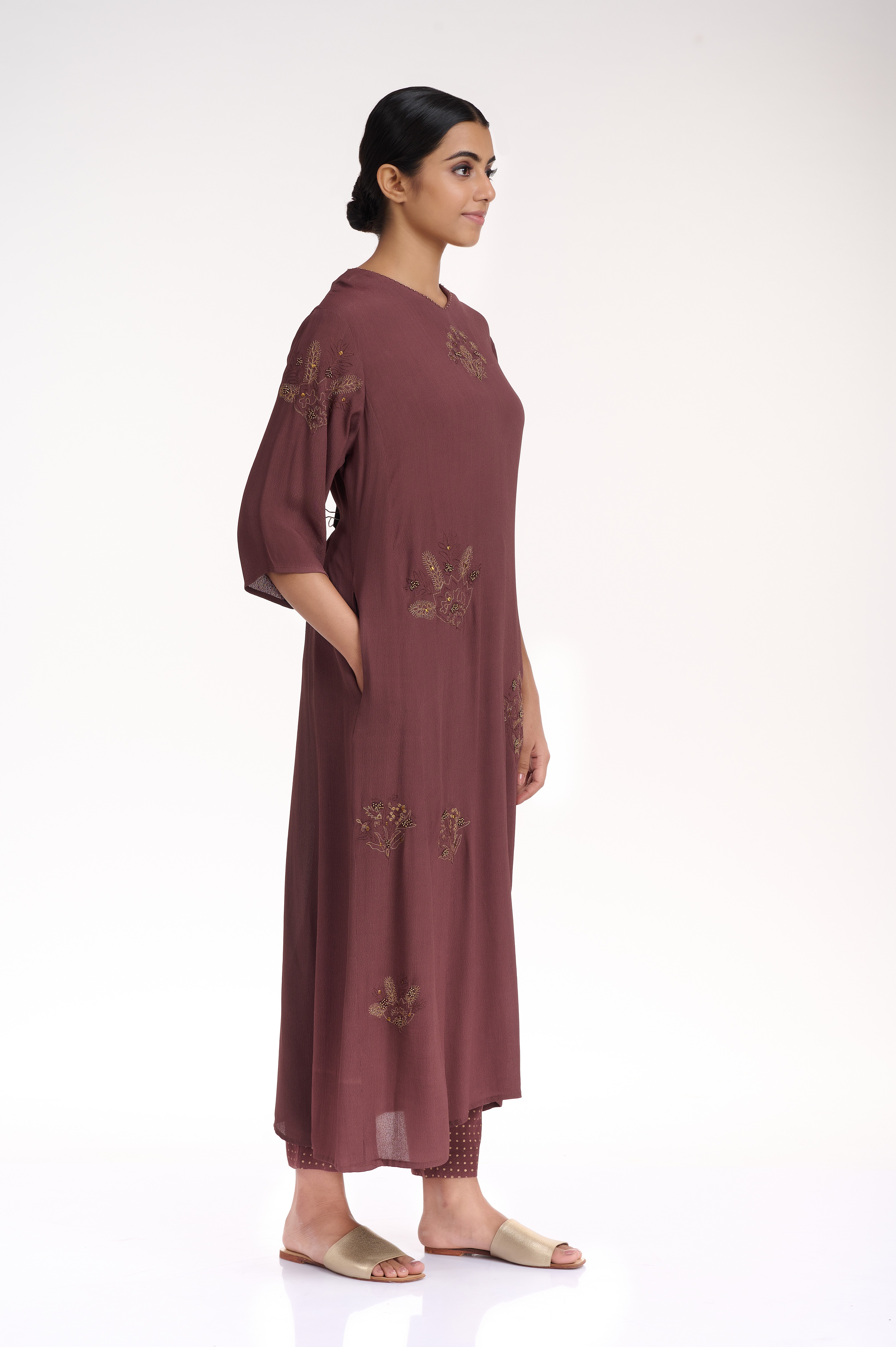 Twirl and swirl in this breezy silhouette, crafted in fluid crepe, with gold thread engineered floral embroidery detailed with gold beads on brown. Pockets on the side seams. coordinate your look with straight cropped pants cut from the same fabric.