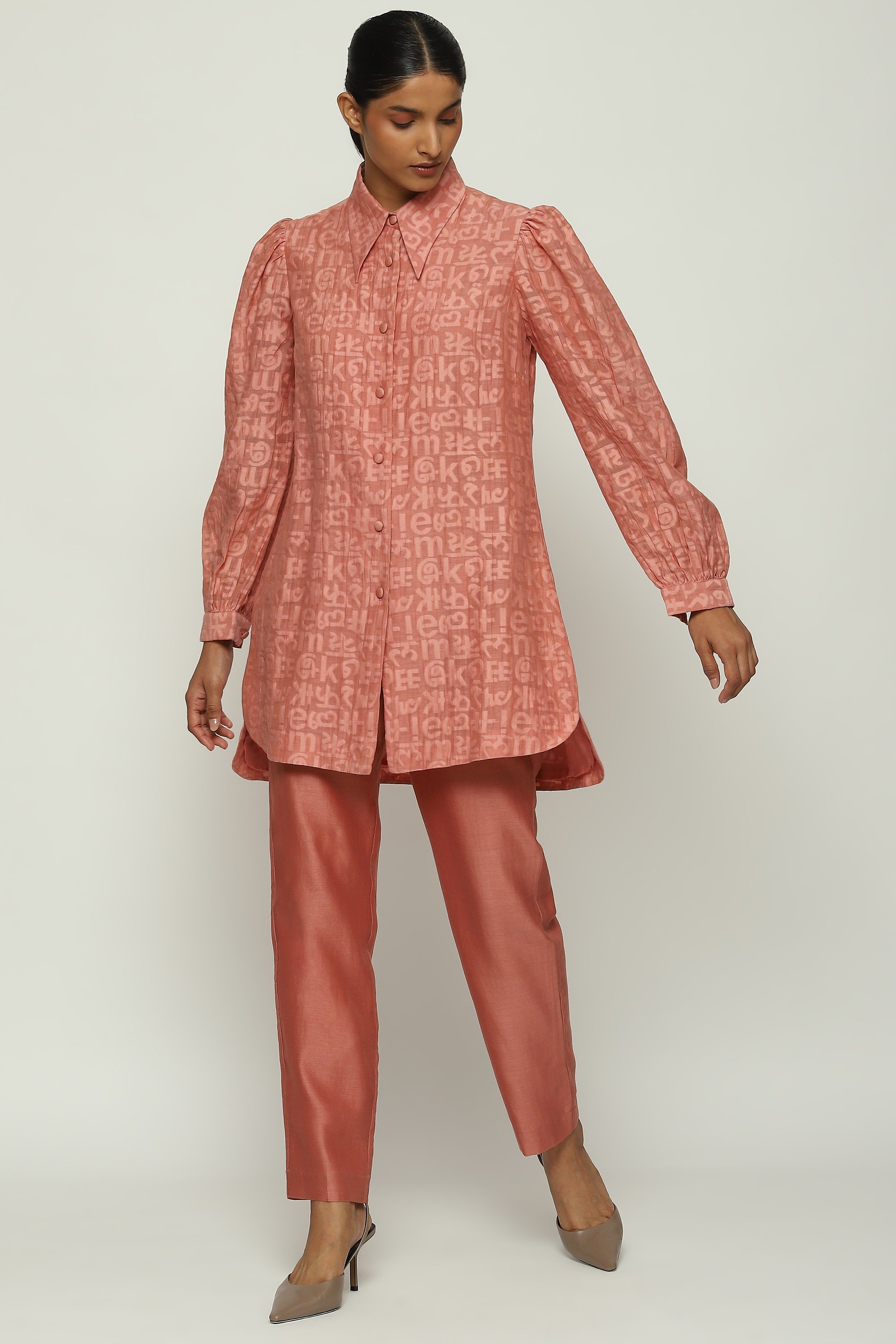 Body Language, from Abraham & Thakore plays with the primordial — an examination of language itself in fabric. Crafted in a handwowen blend of silk and cotton. Its tone-on-tone calligraphy brocade casts illusions in darkness and light.