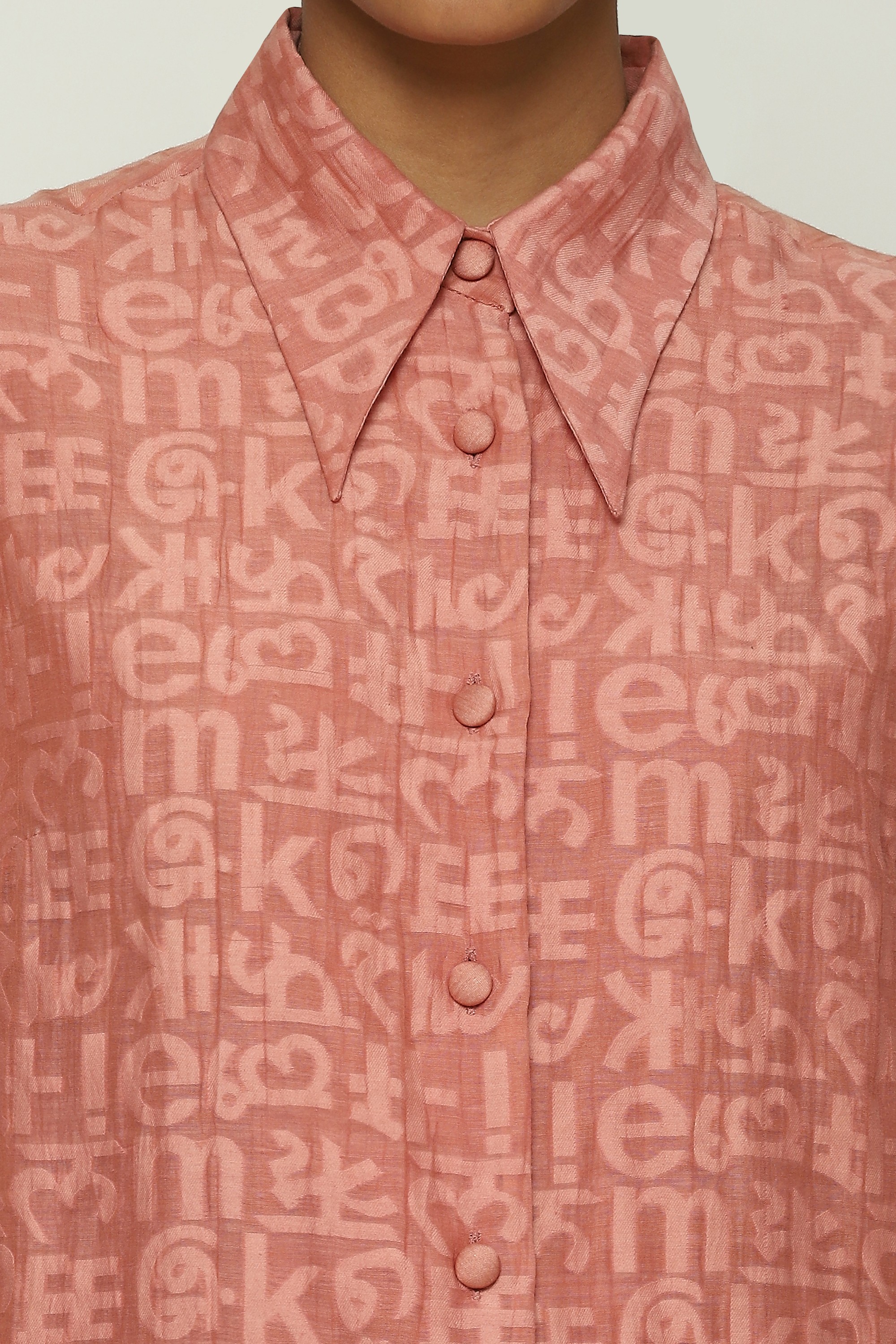 An abridged alphabet, woven in brocade on a redwood shirt