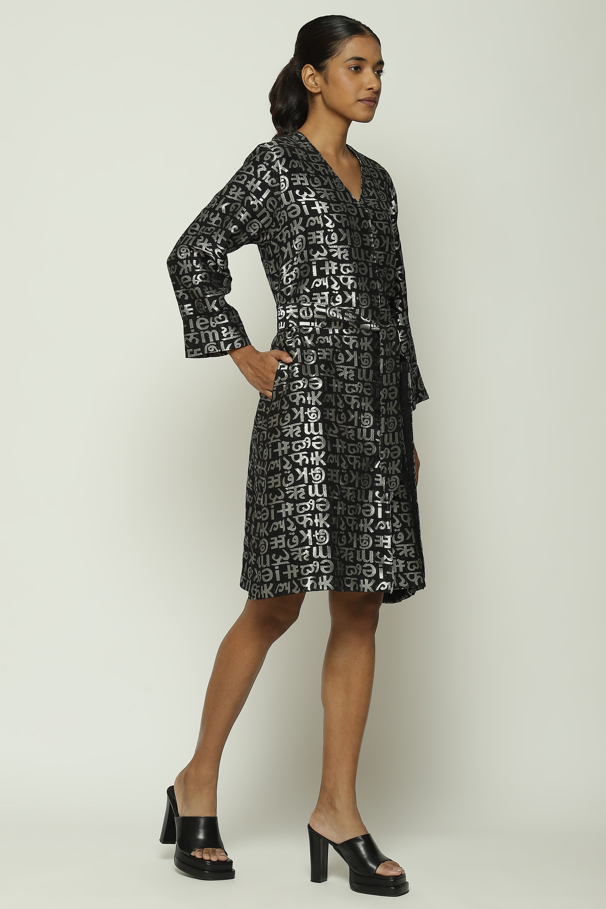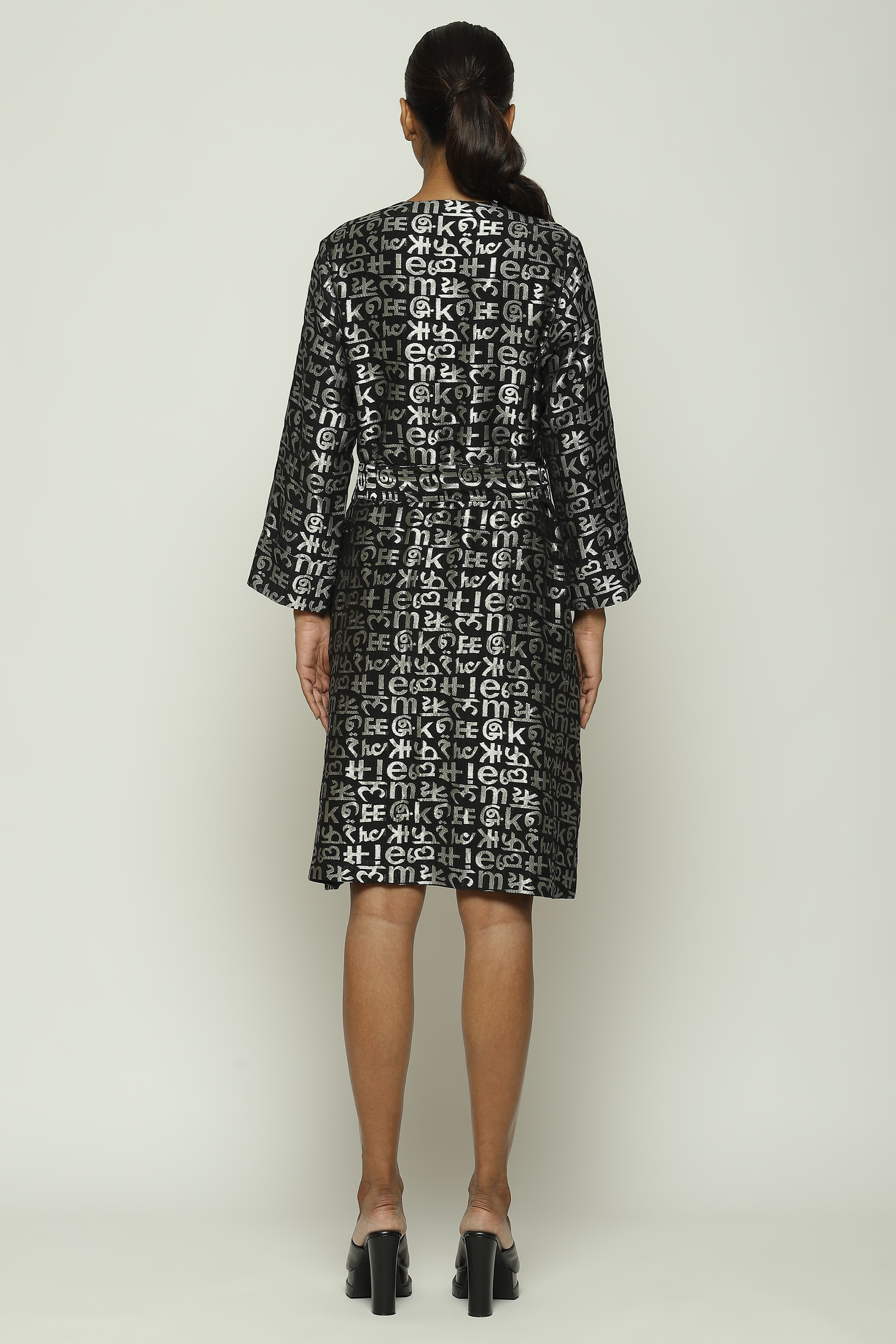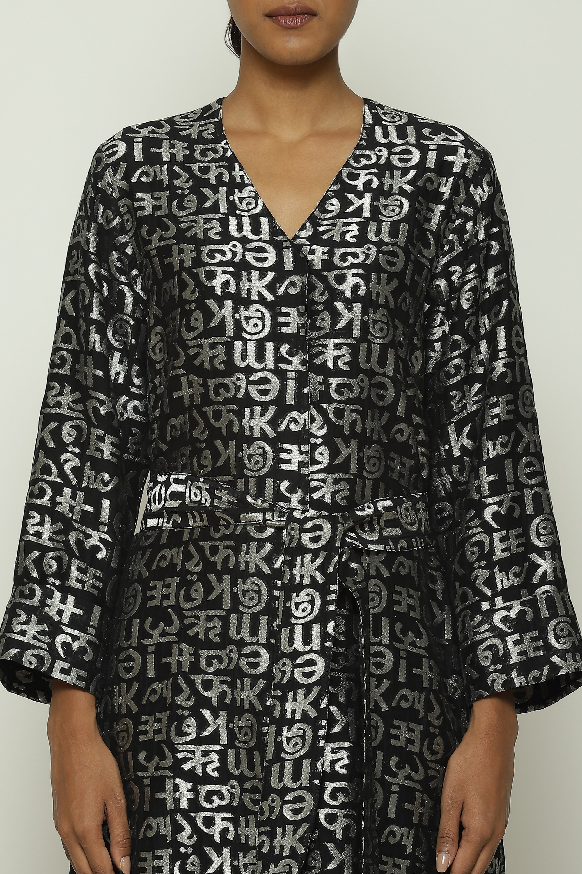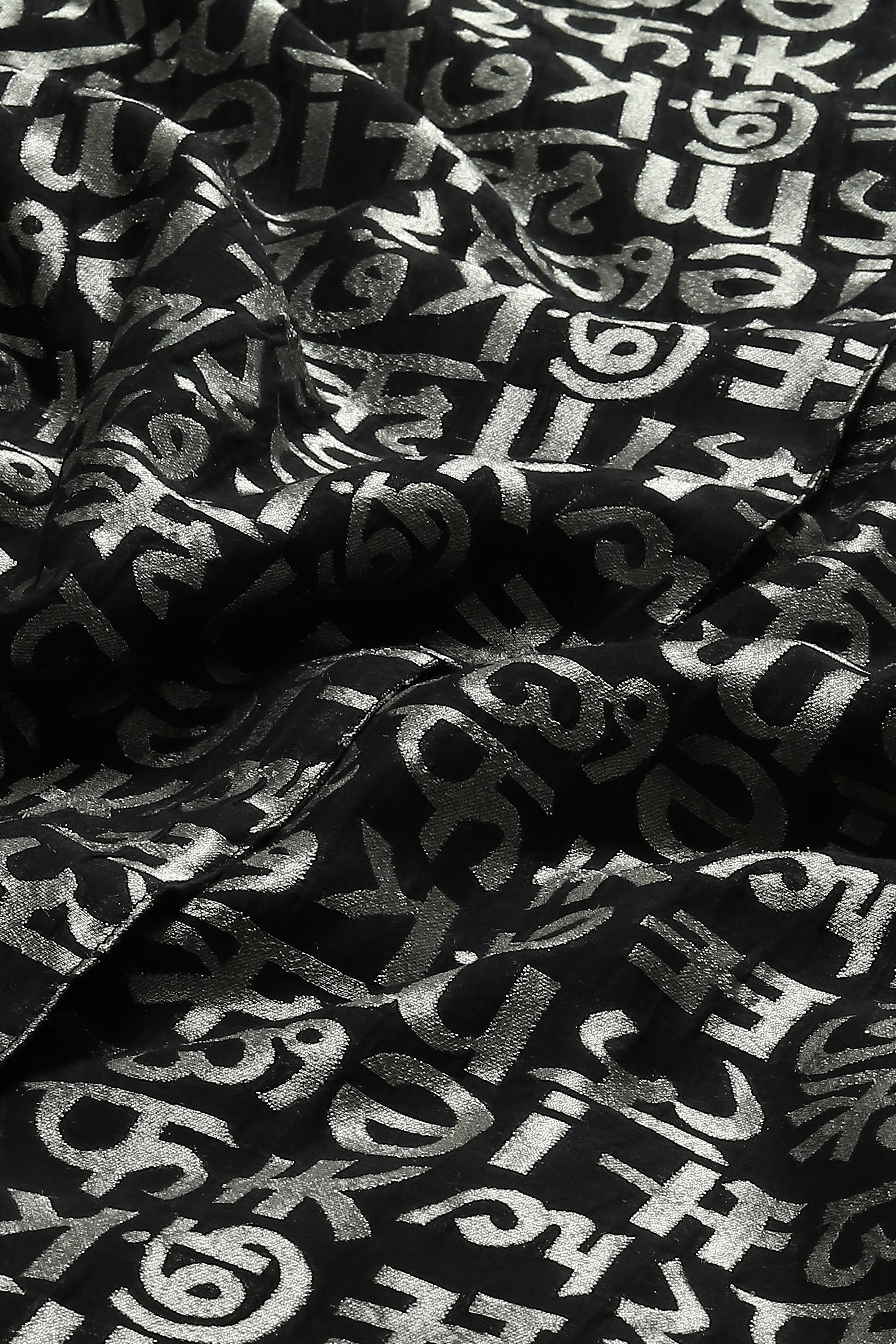 An abridged alphabet, woven in silver zari brocade on a black dress.