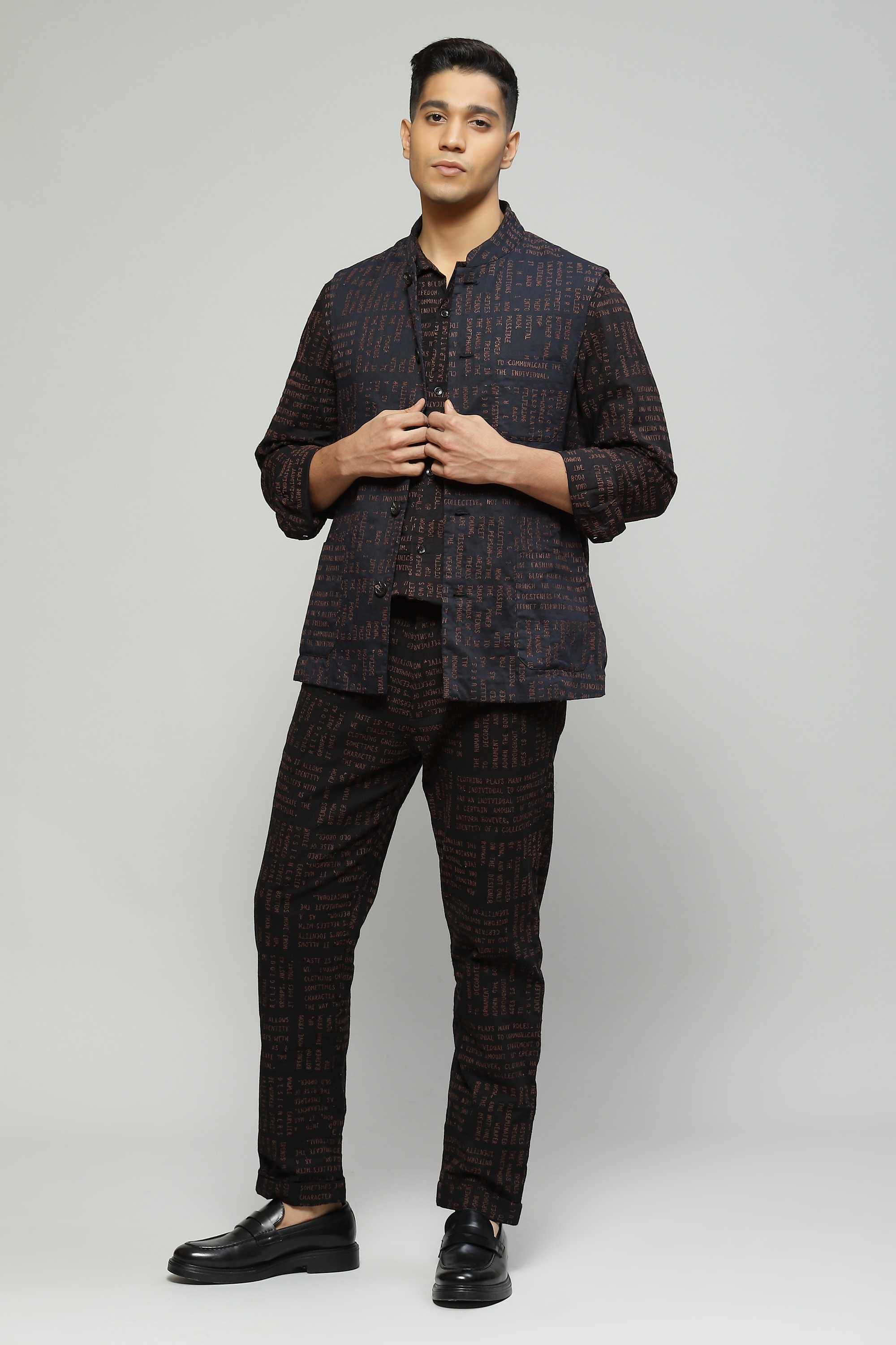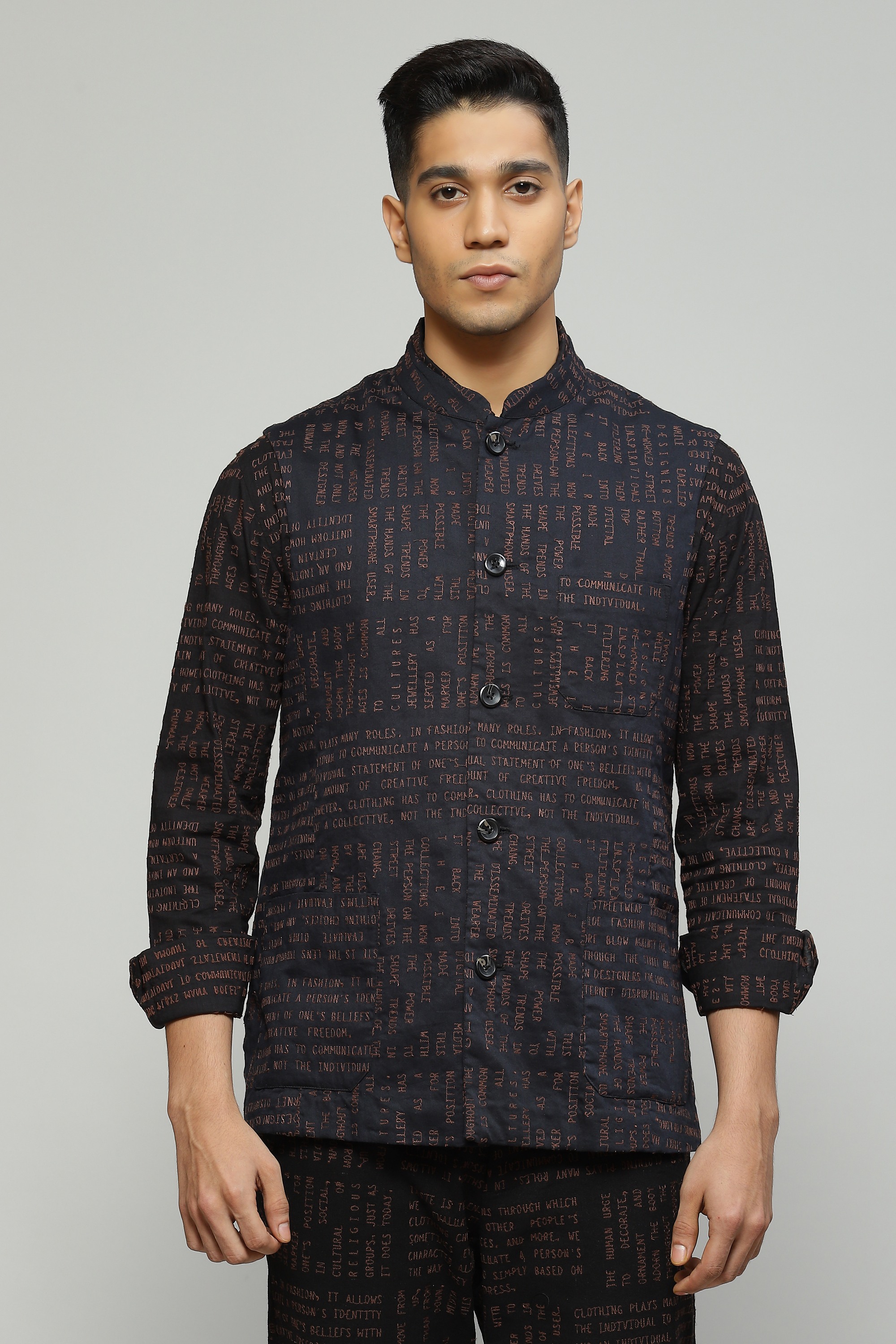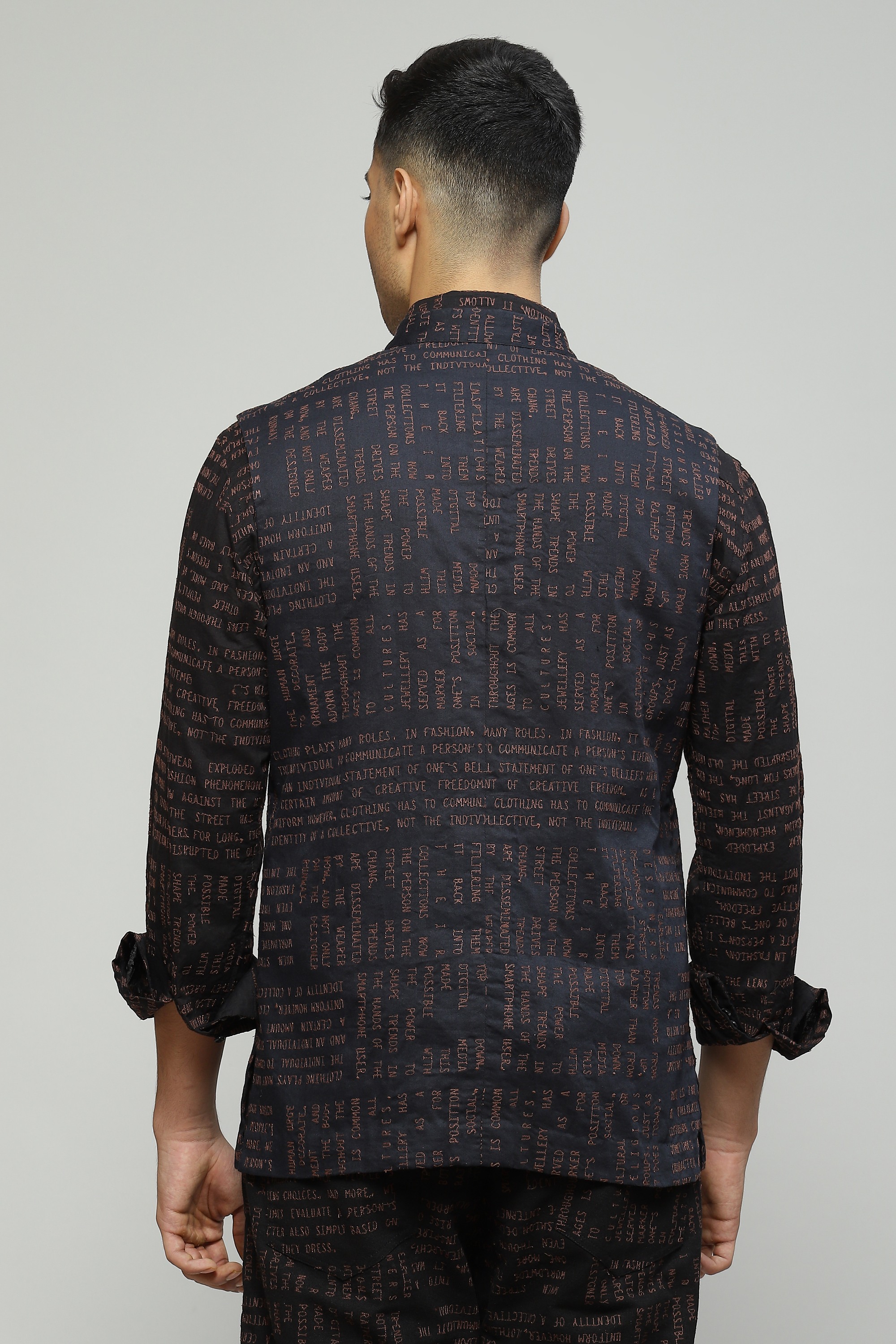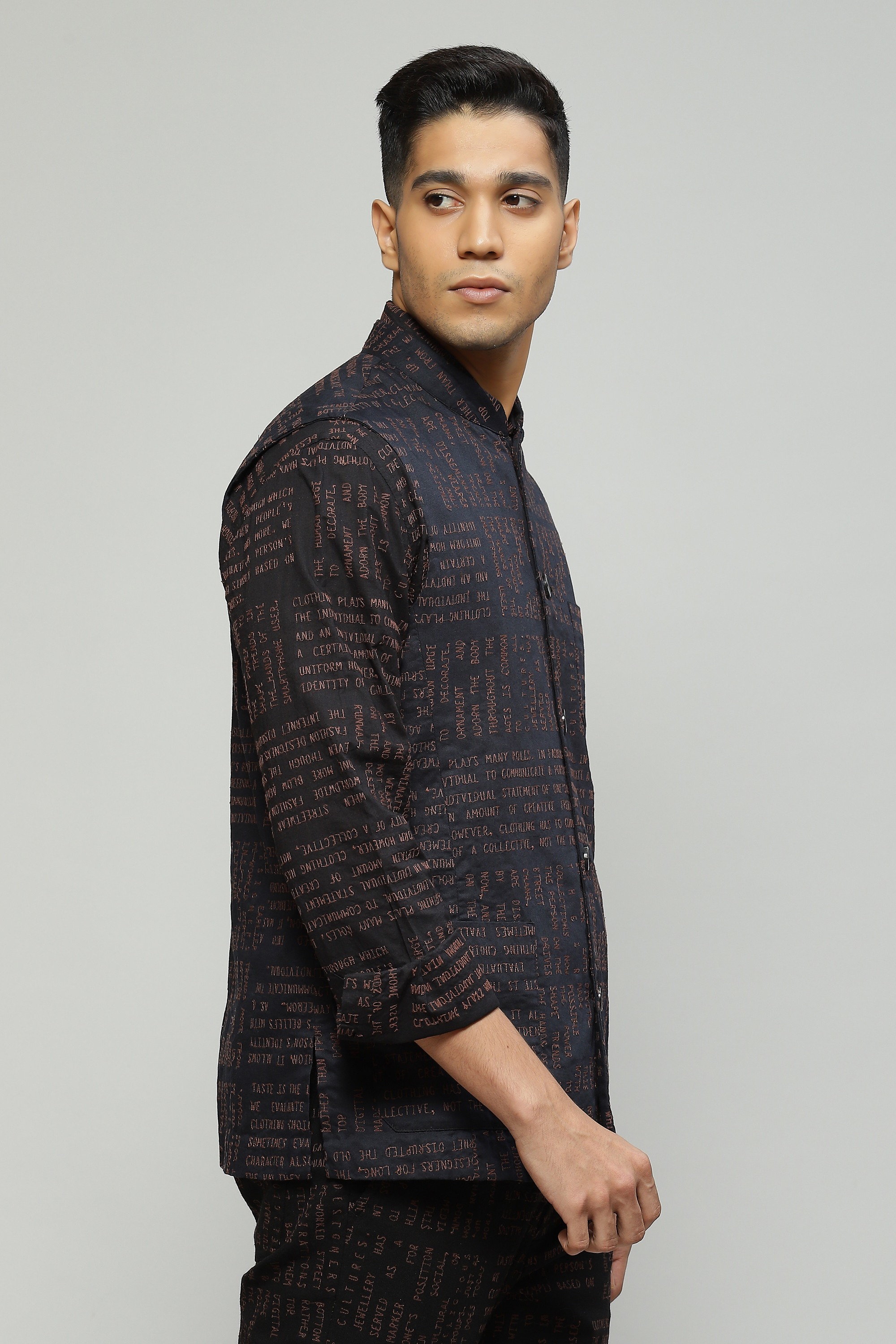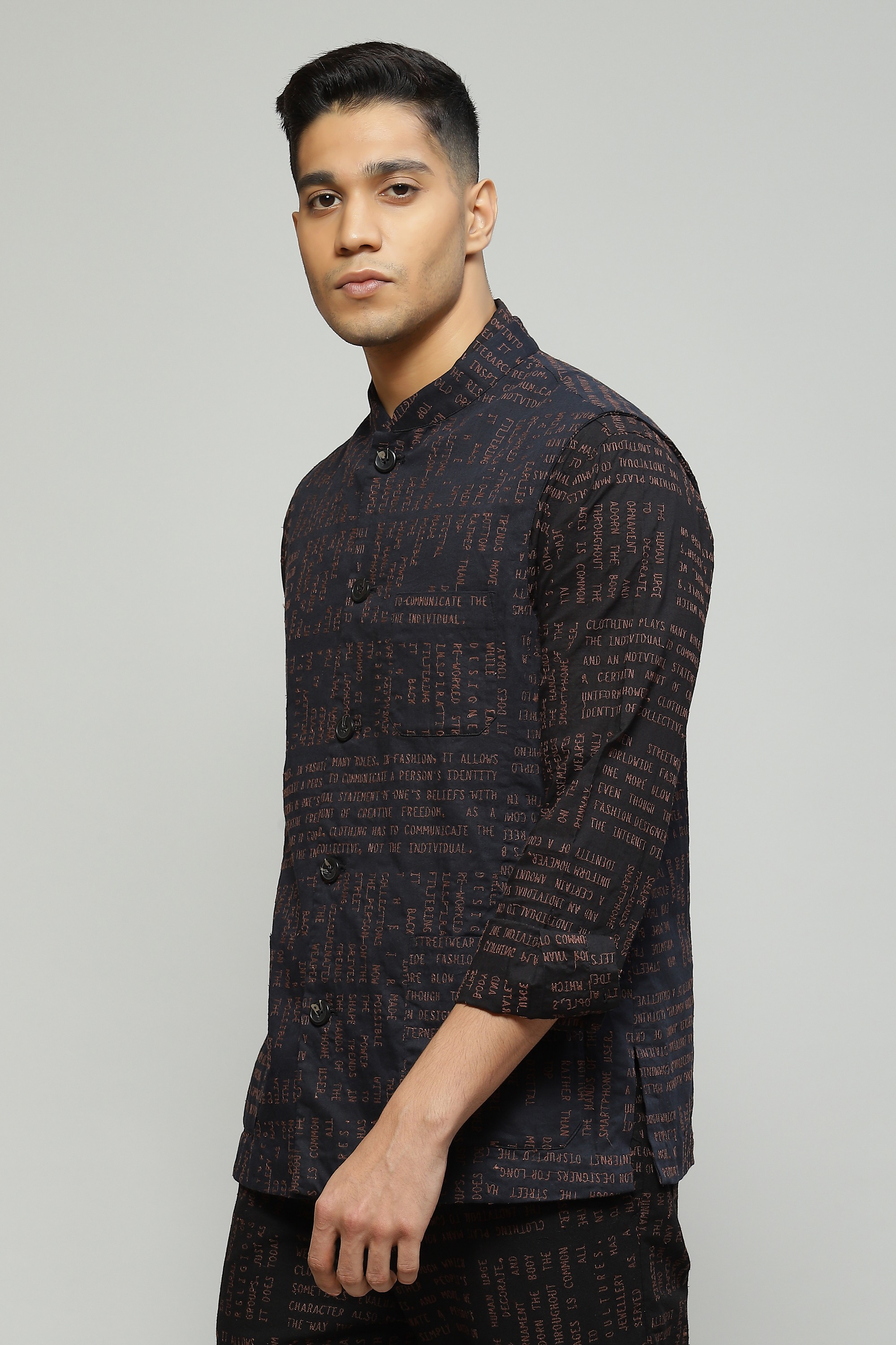 A classic black bundi crafted in organic cotton featuring a modern calligraphy embroidery An unconventinal look for festive evenings