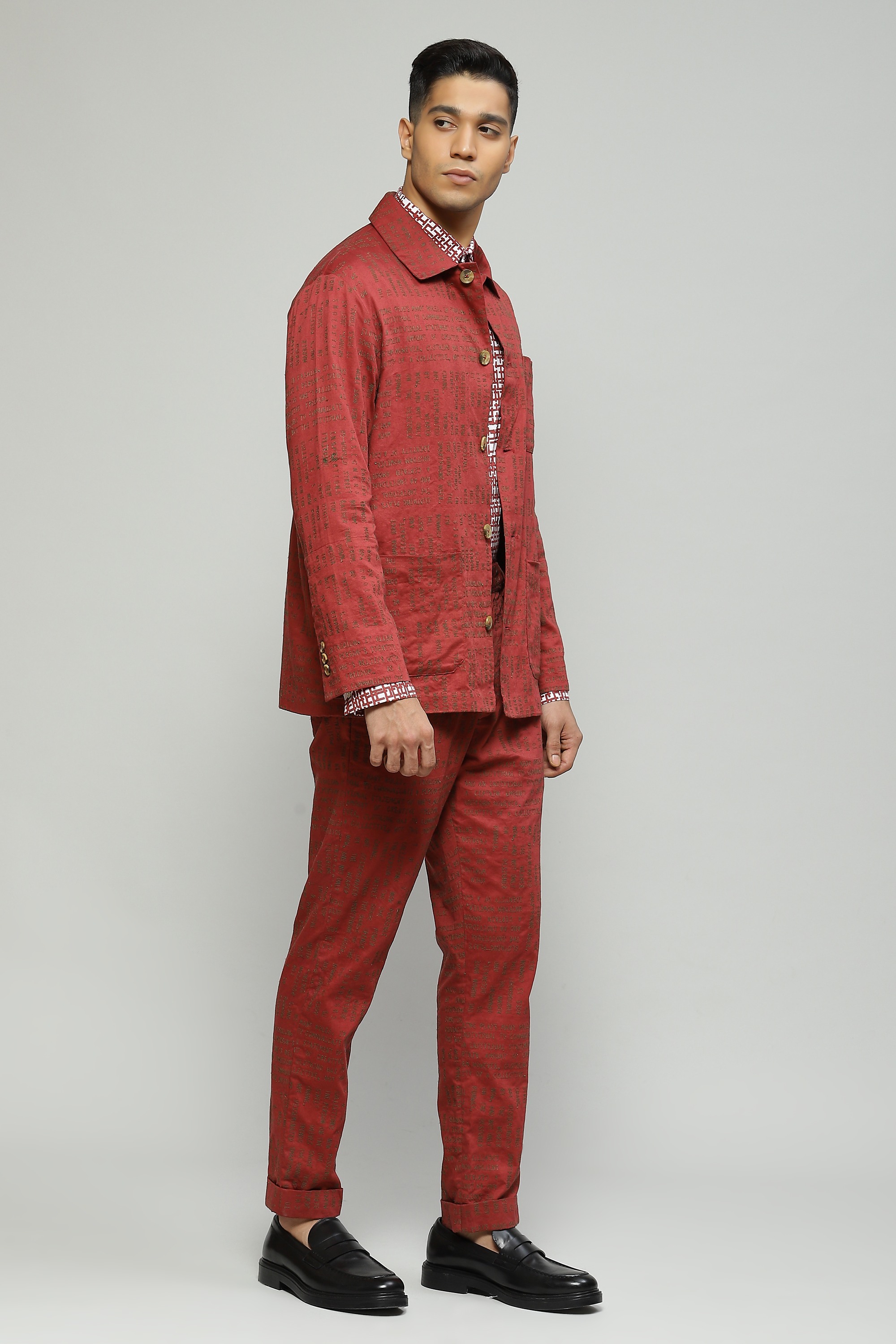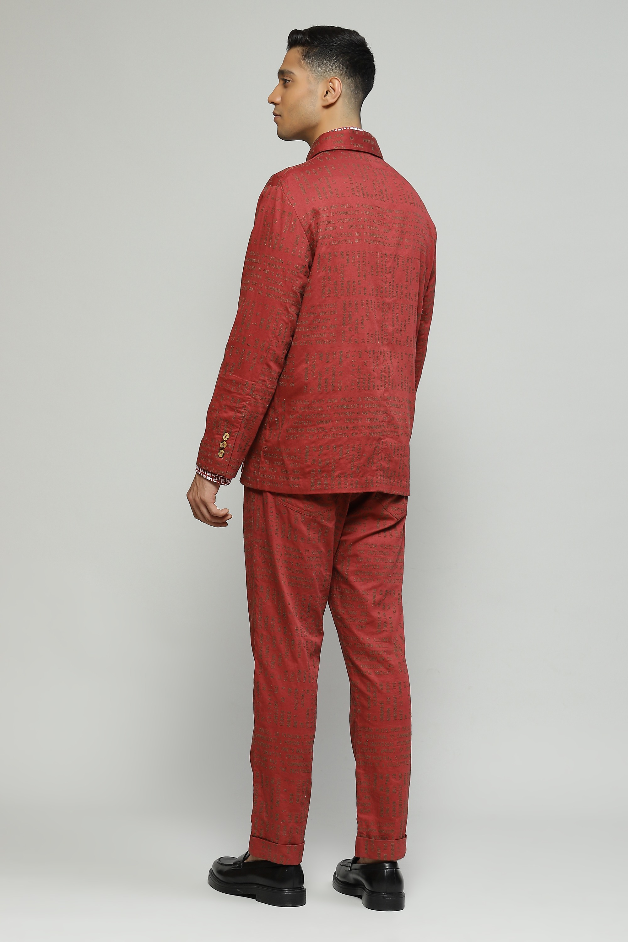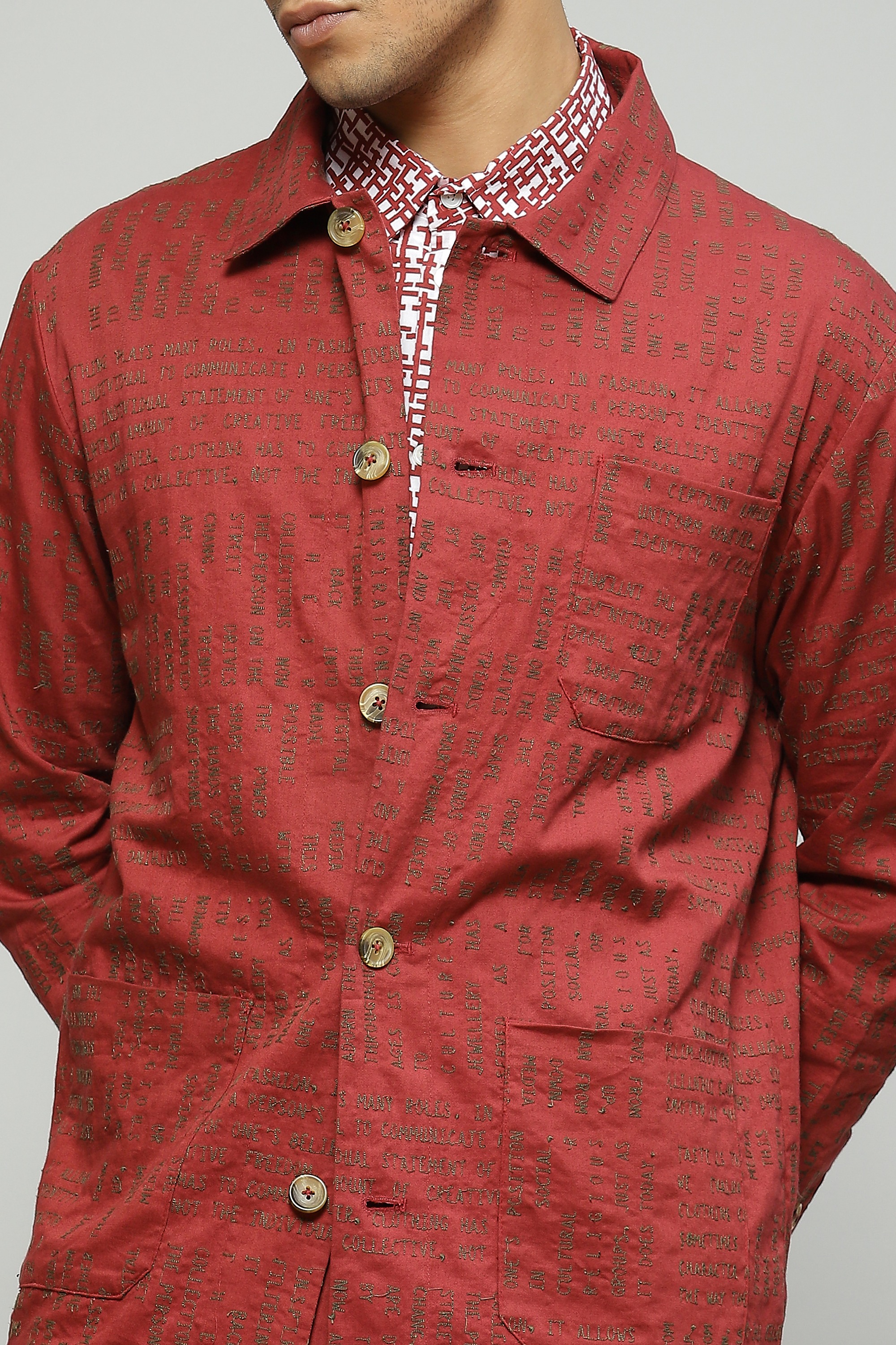 In an alluring shade of madder this structured jacket is crafted in organic cotton Featuring offbeat calligraphy embroidery, make this the statement piece your closet deserves