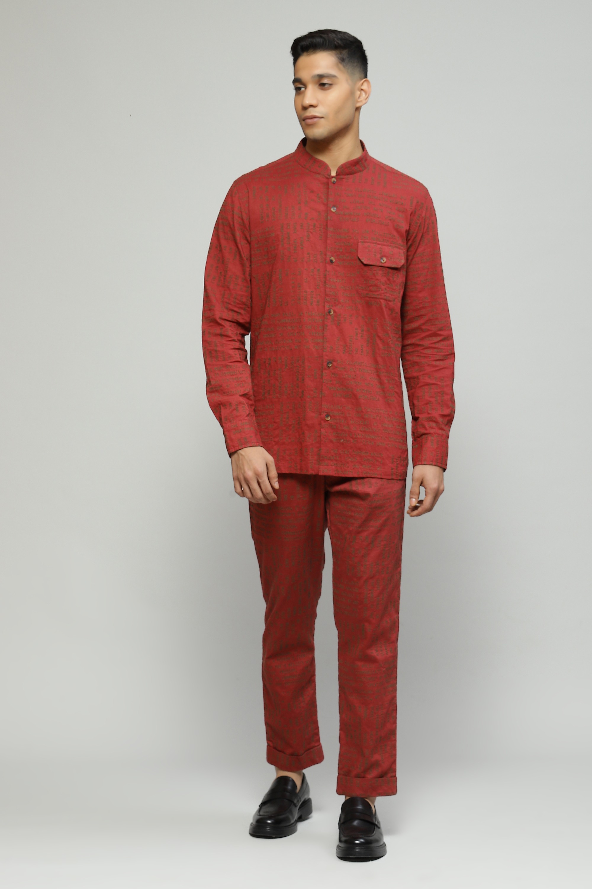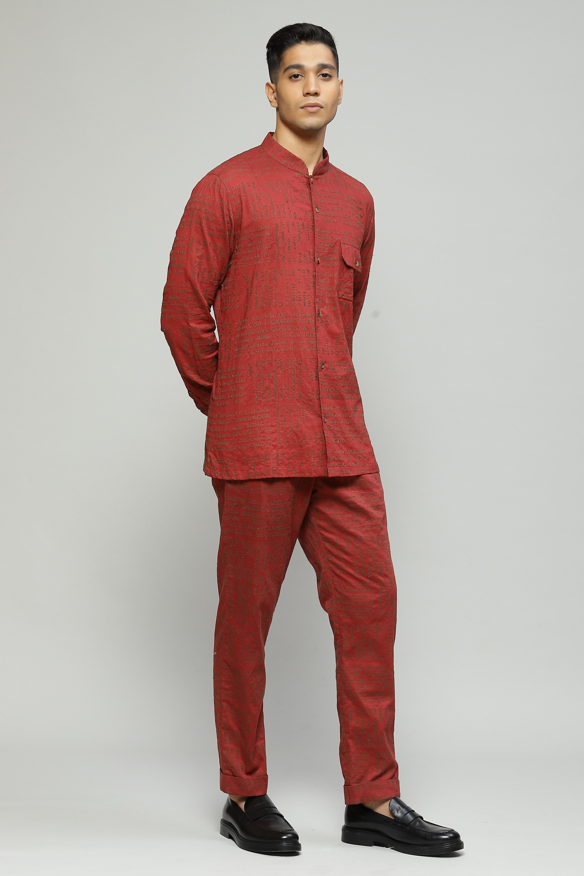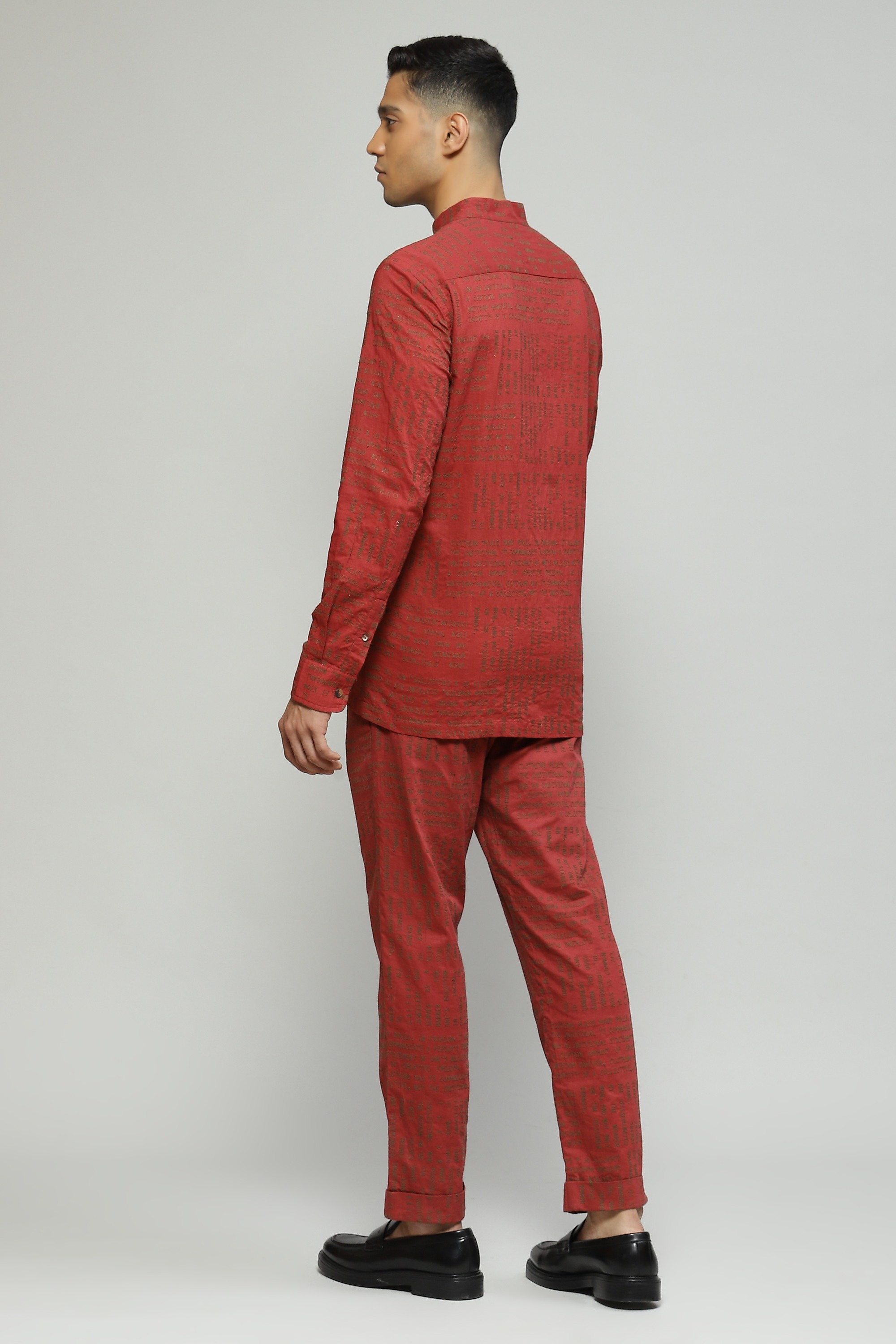 A madder-hued shirt made in airy cambric fabric Embroidered with whimsical calligraphy motifs elevate your evening ensemble through this piece