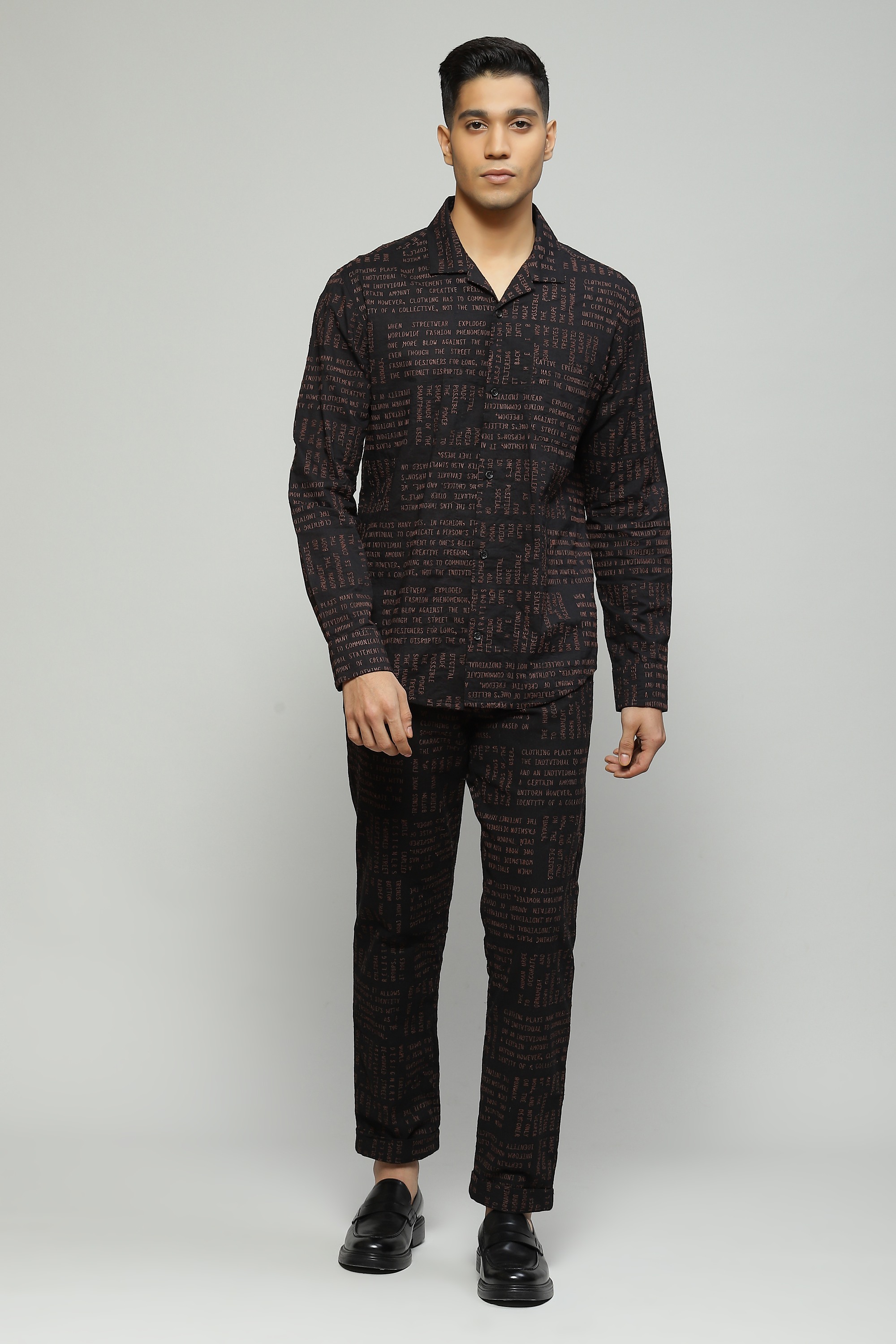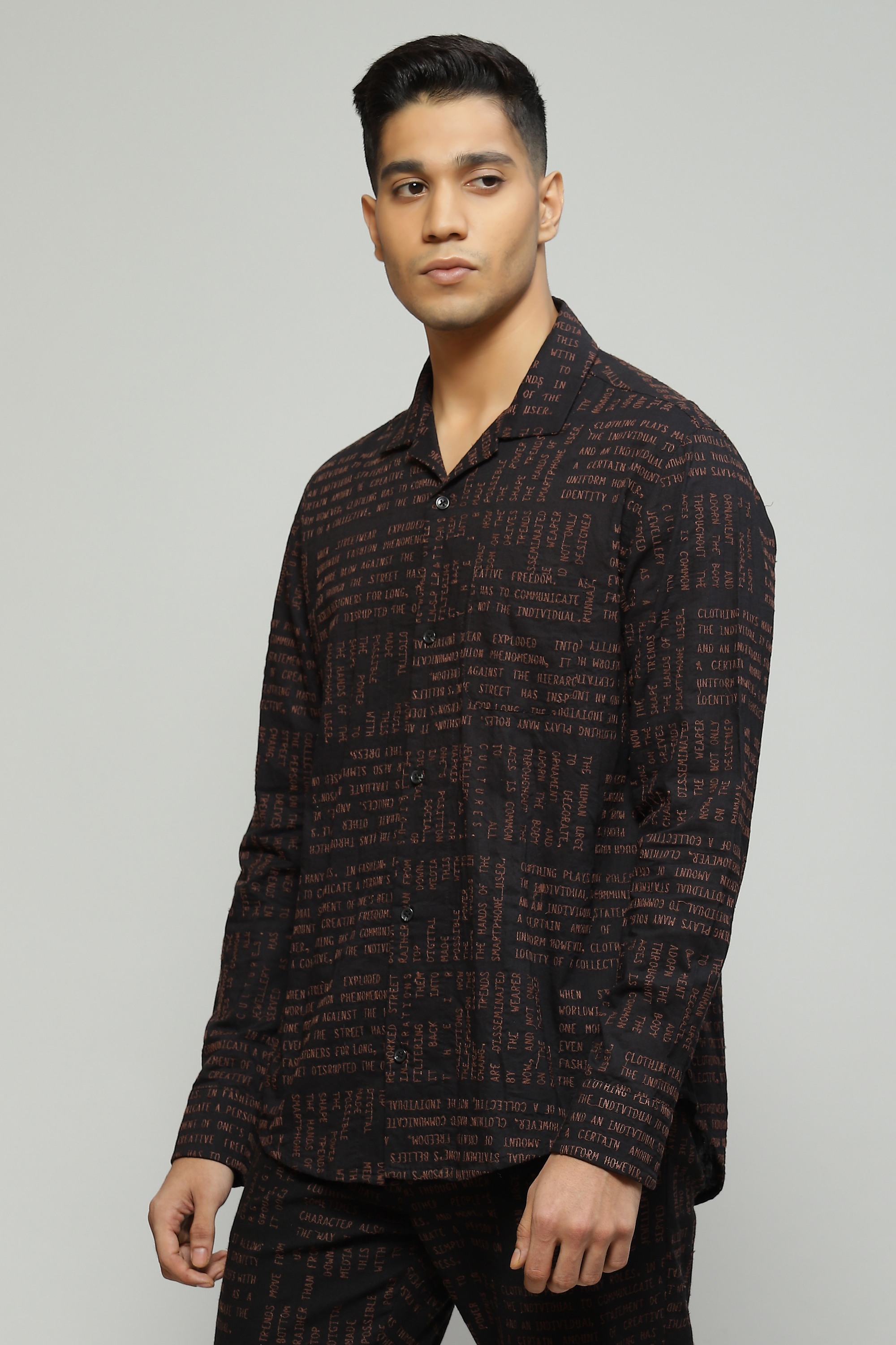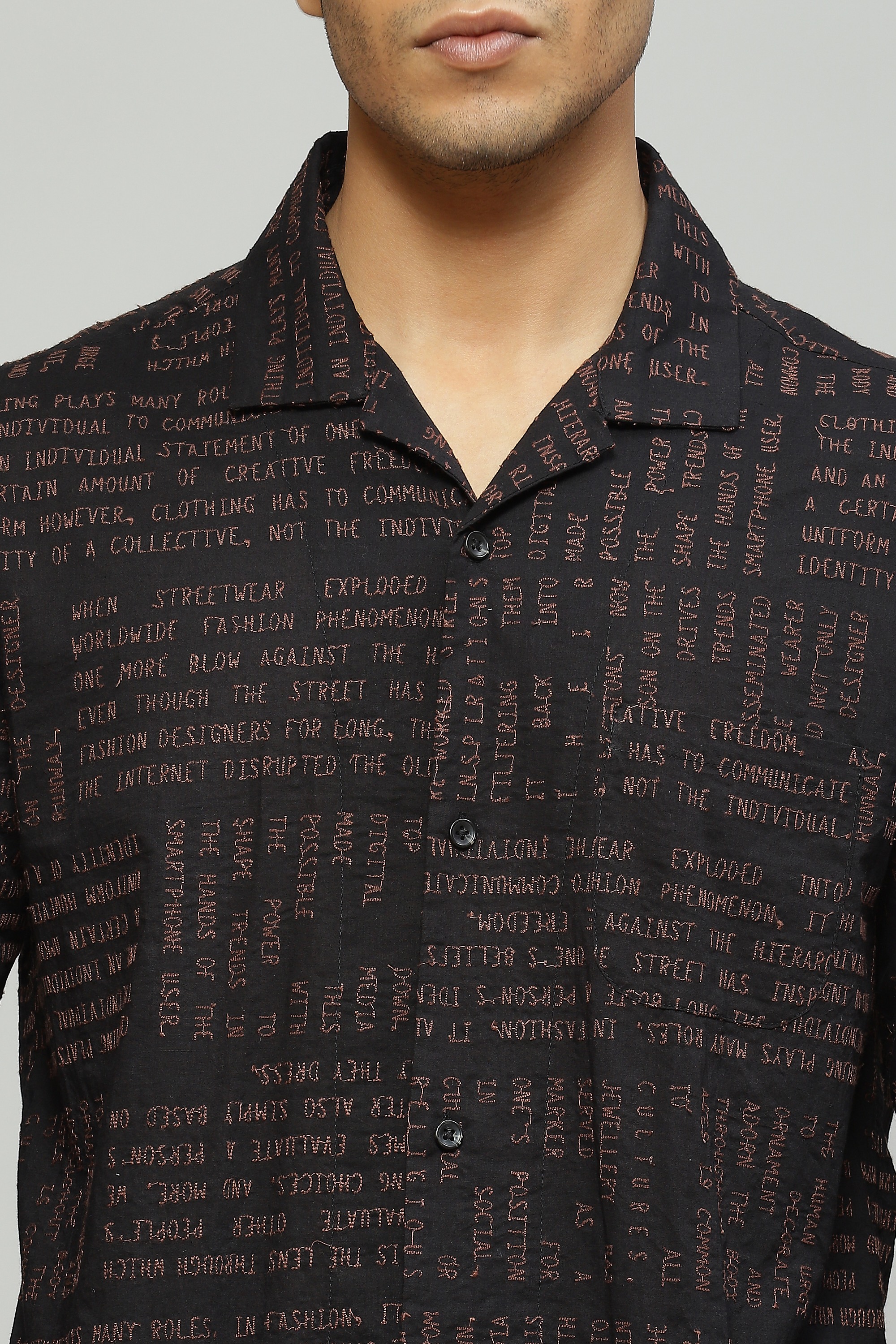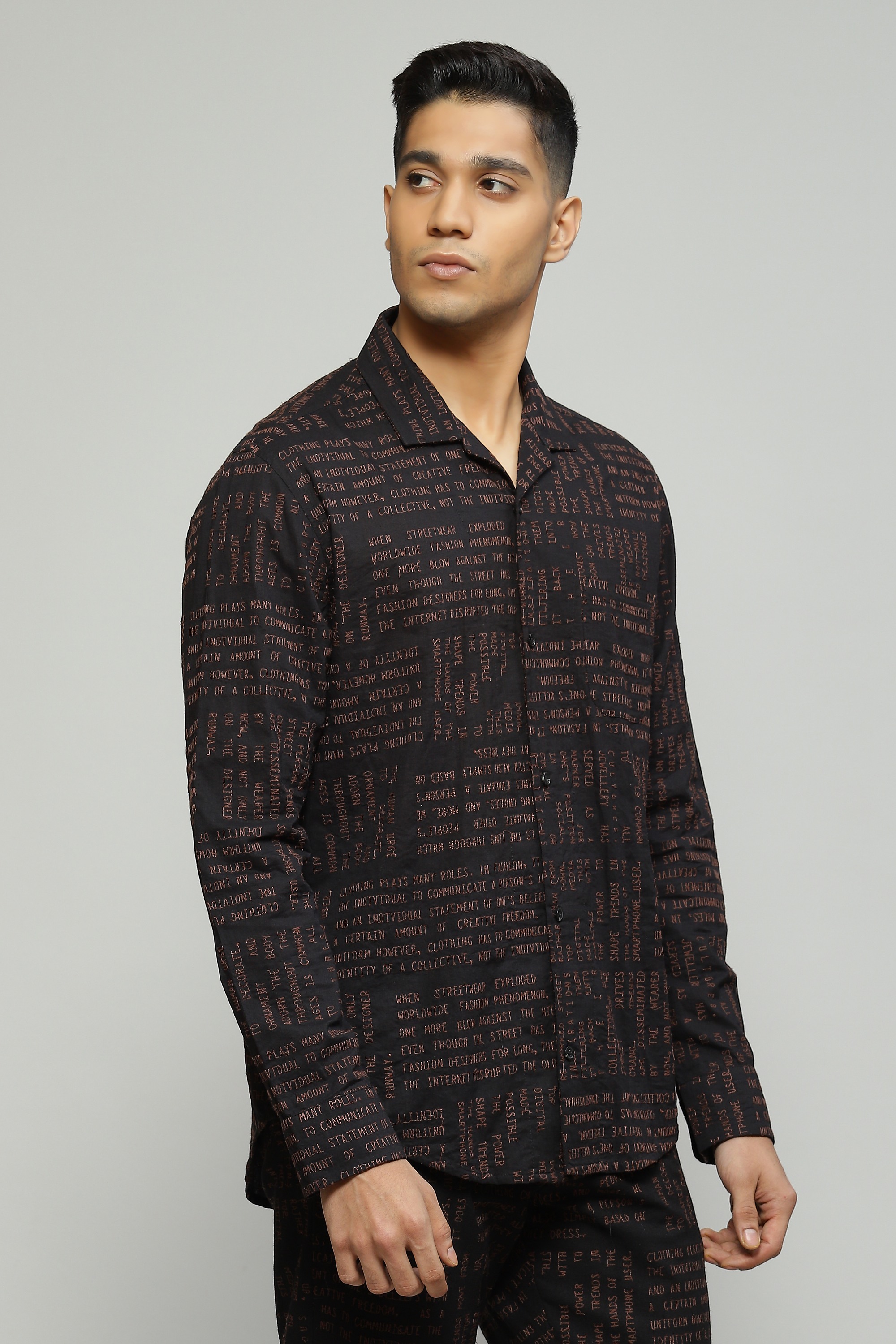 Embroidered with whimsical calligraphy motifs this black shirt is crafted in lightweight cambric