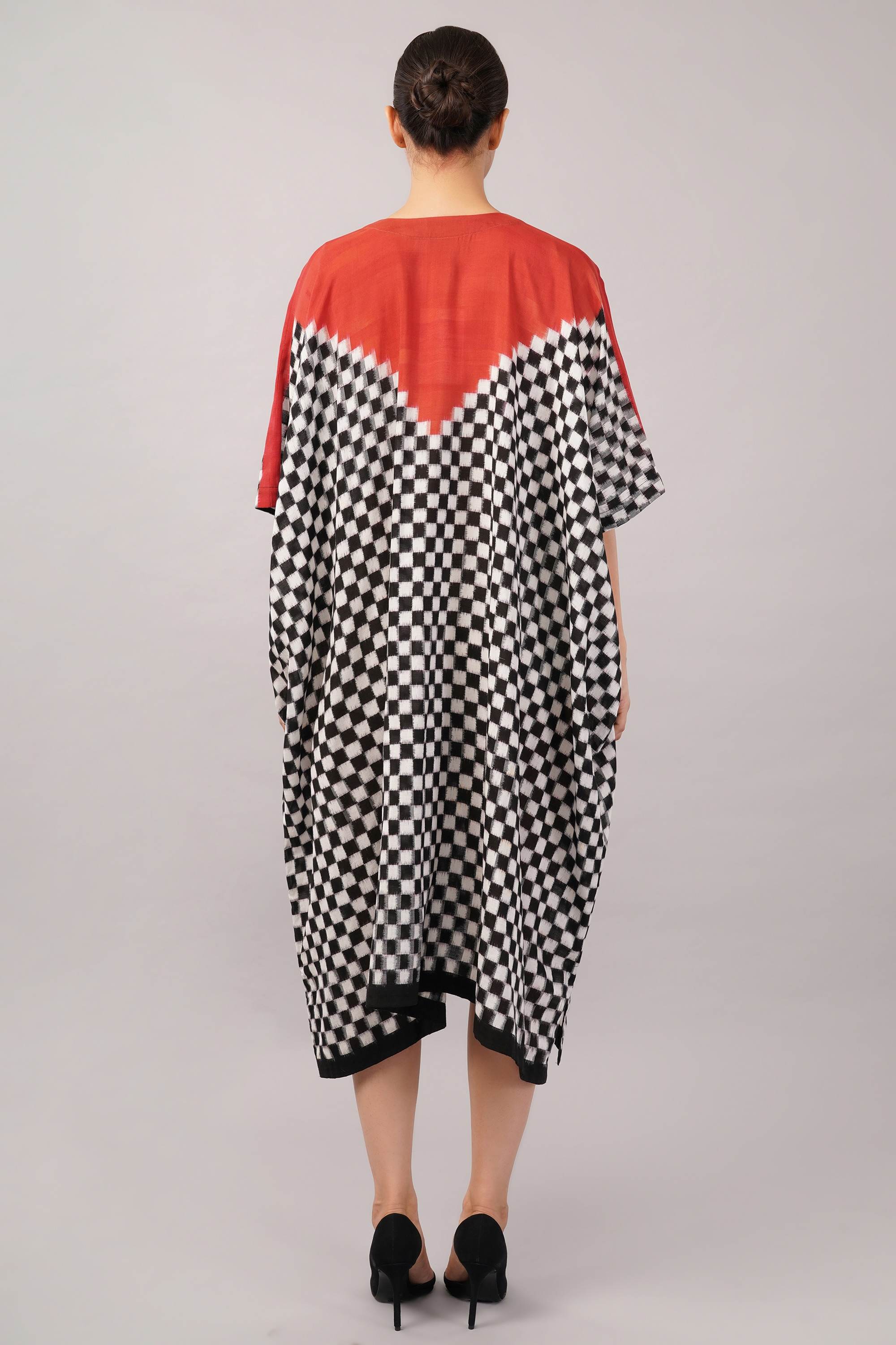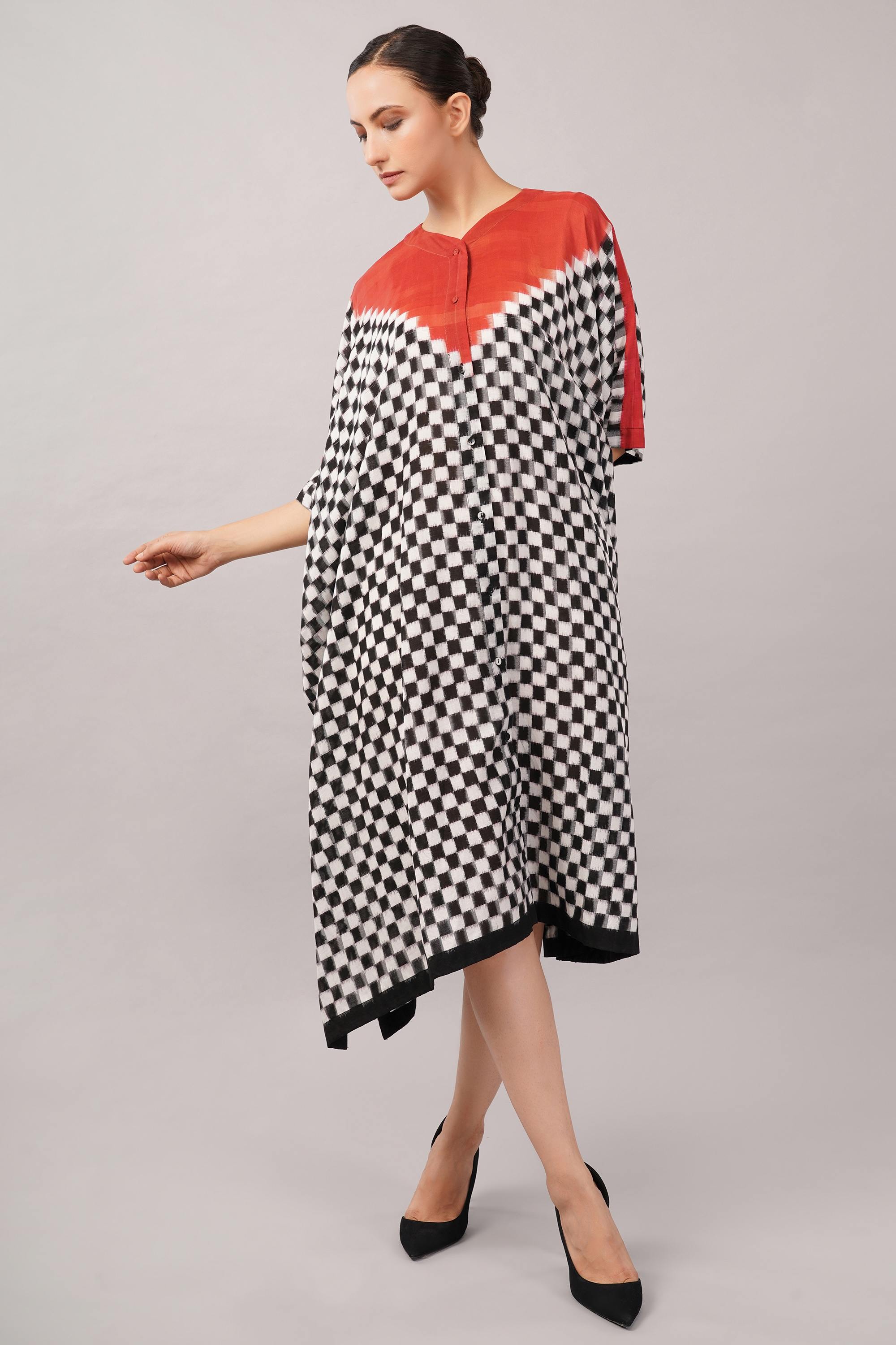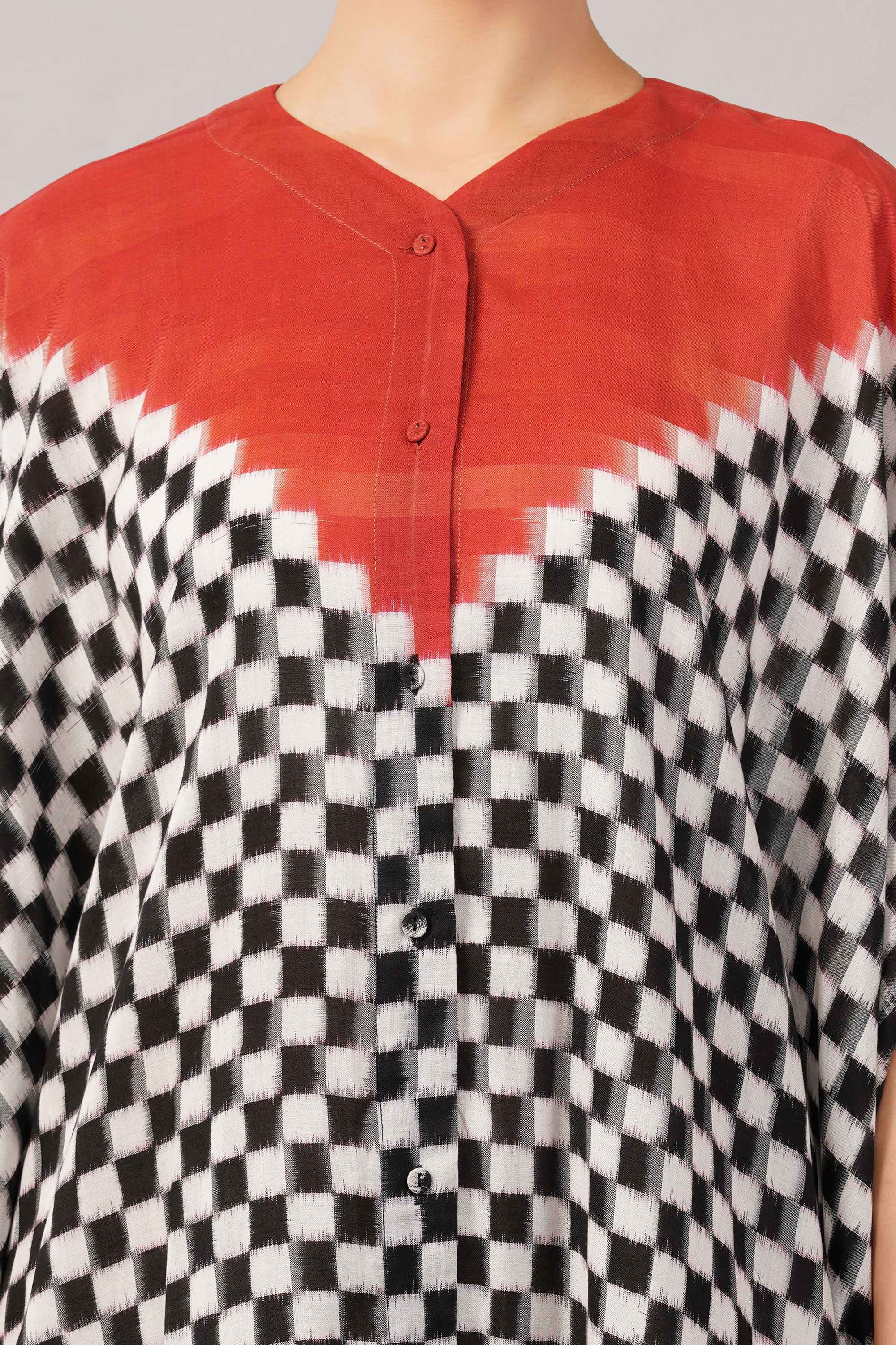 This limited edition piece has been made using a specially woven handloom double ikat in a checkerboard pattern, finished with an engineered contrast yoke. Designed for the discerning aesthete with an eye for statement-making detail.