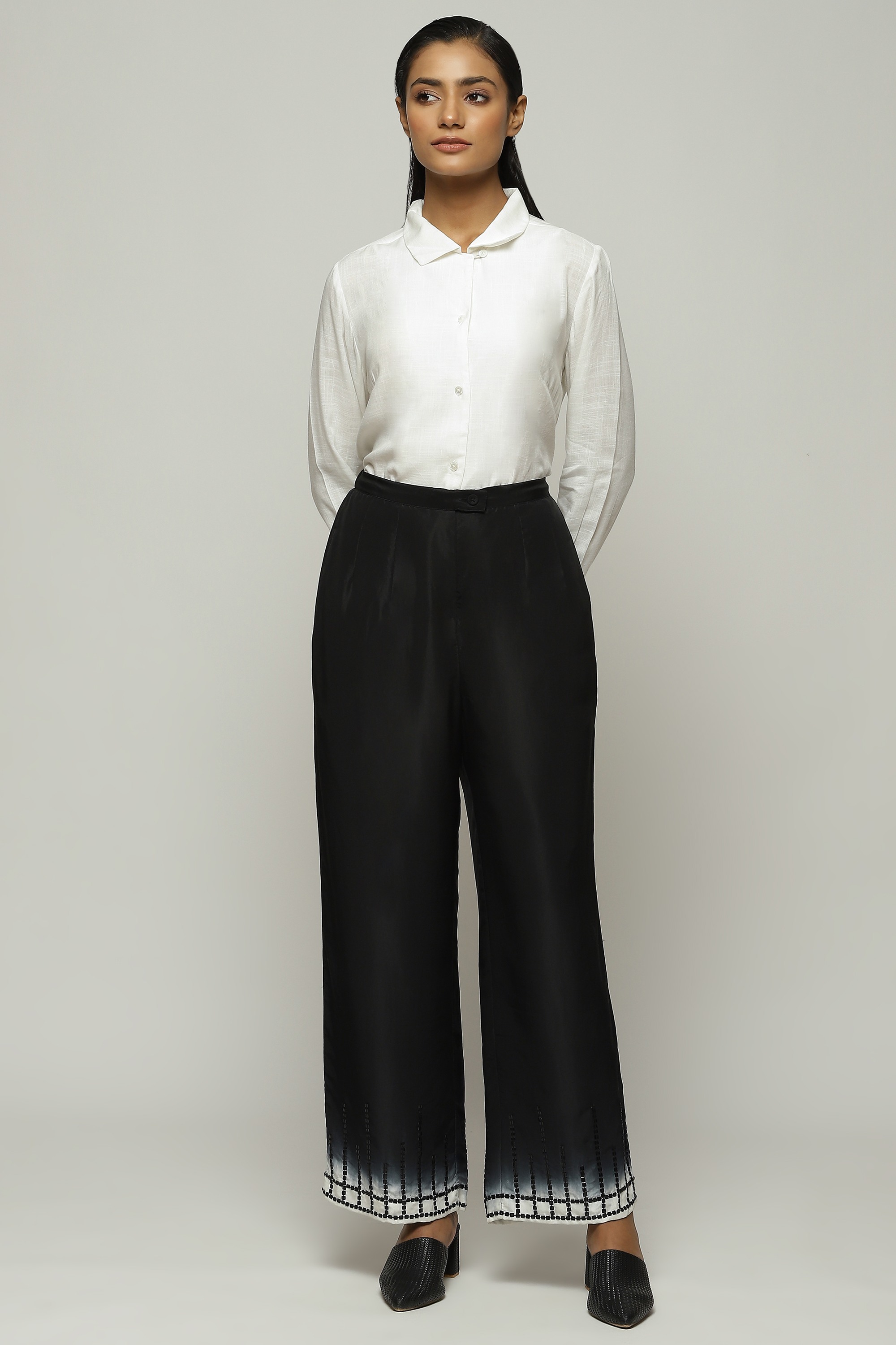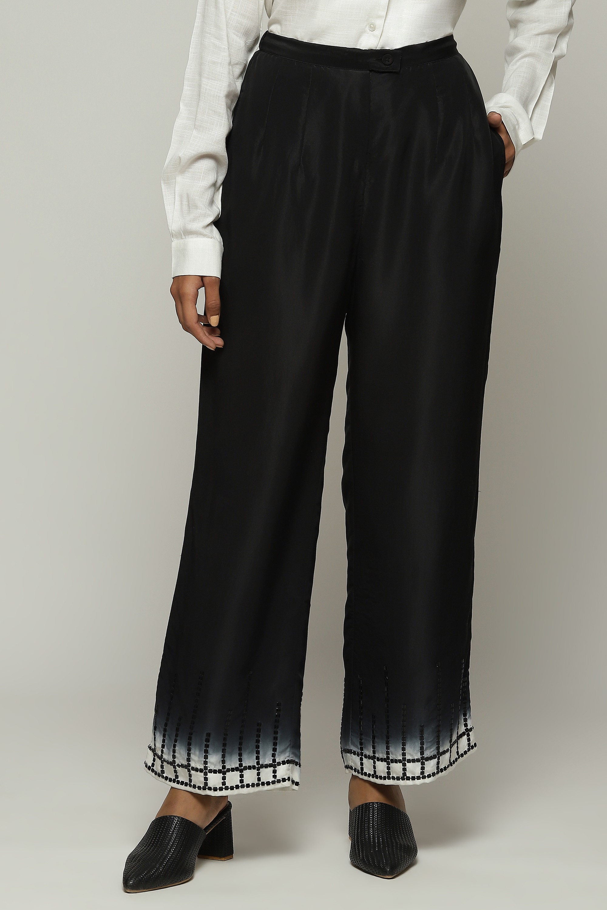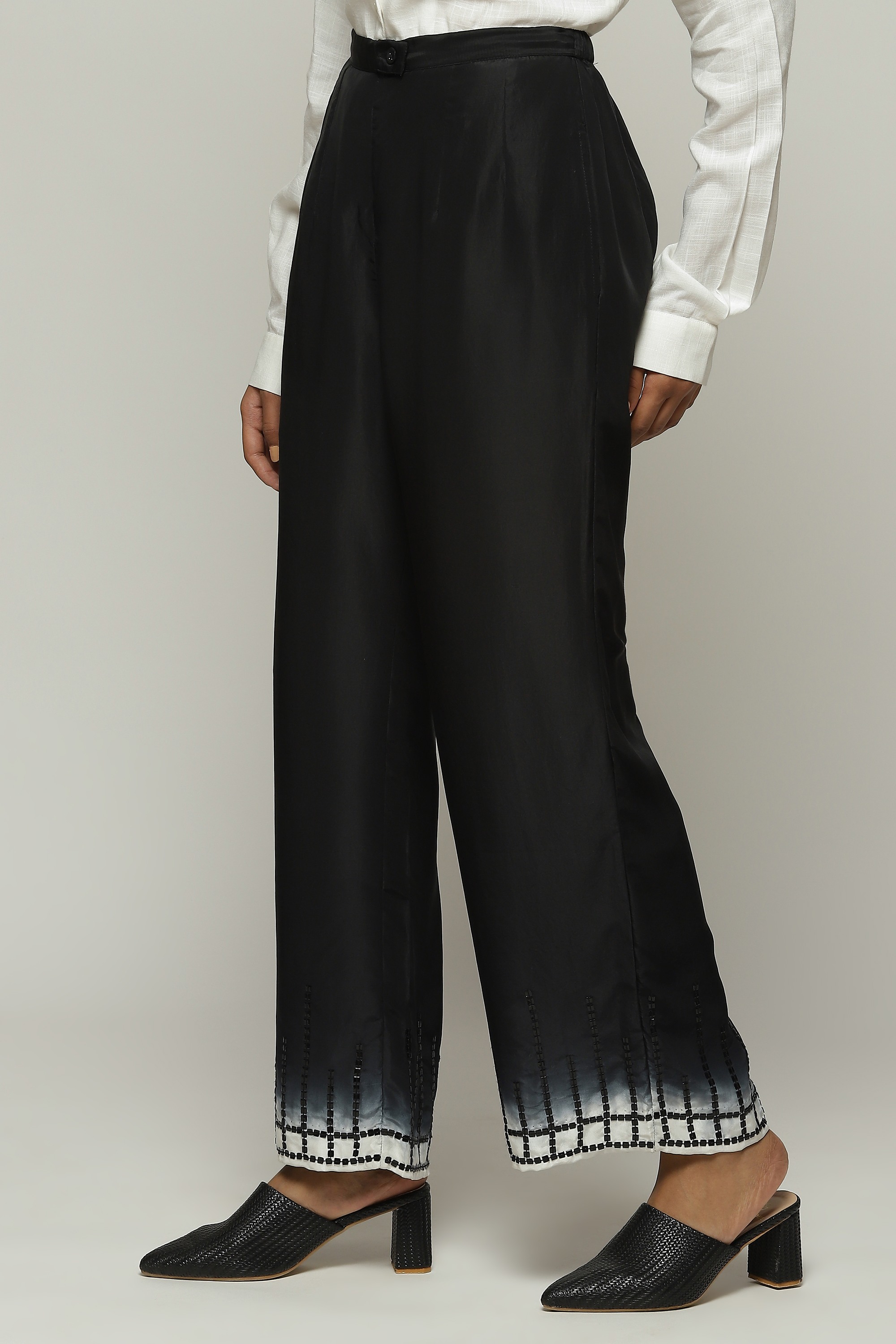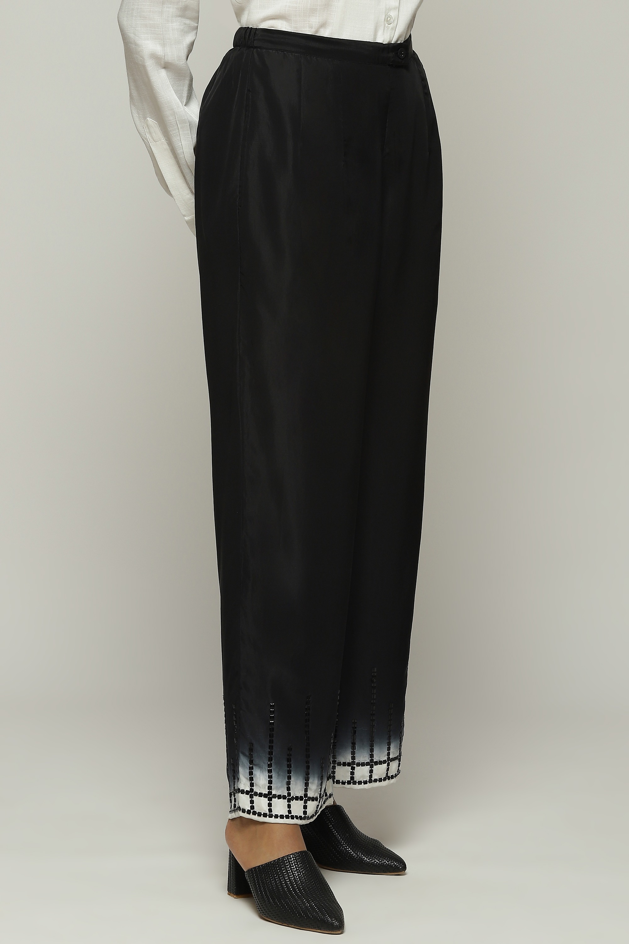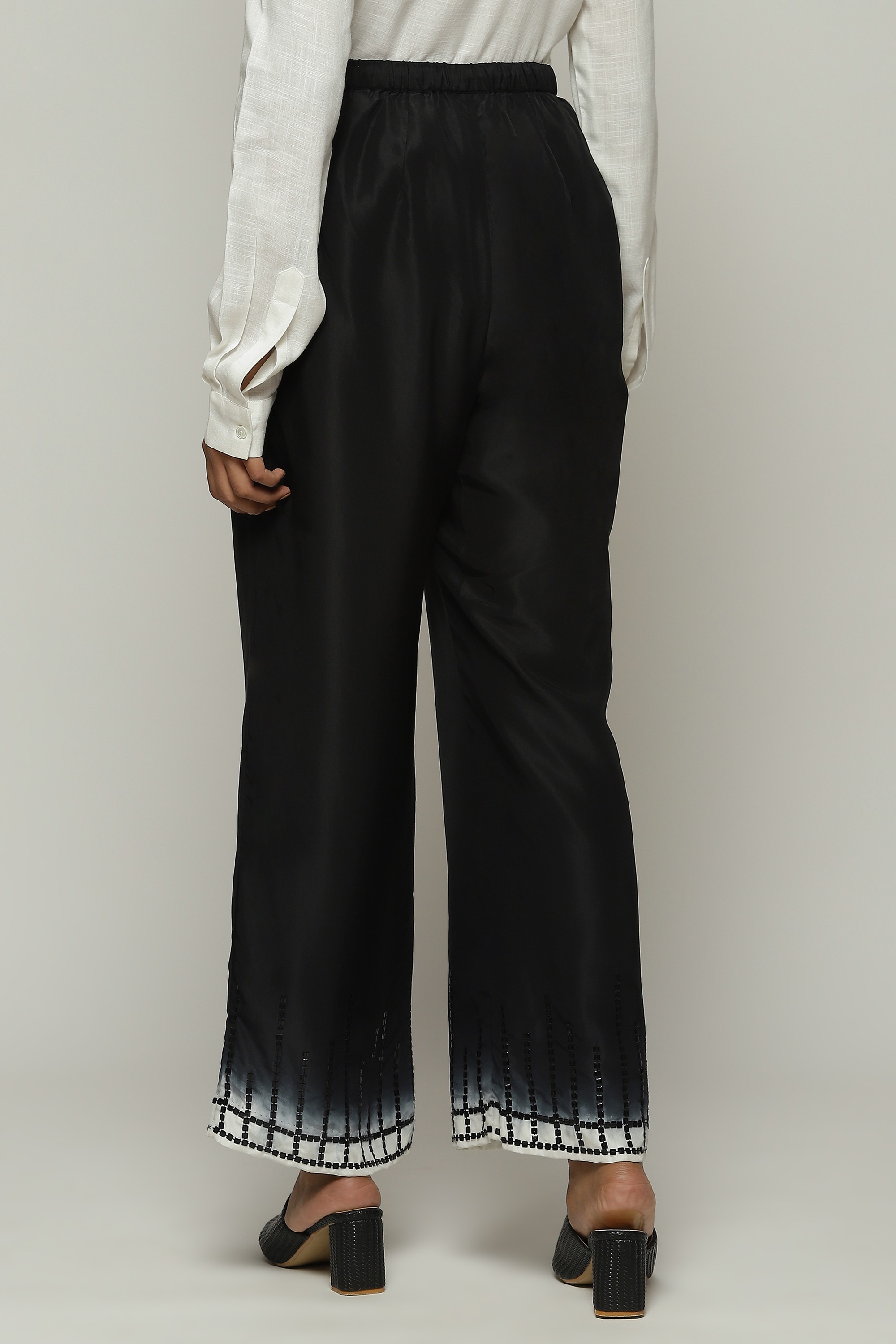 A pair of ombre-dyed straight pants, embroidered with square sequins.