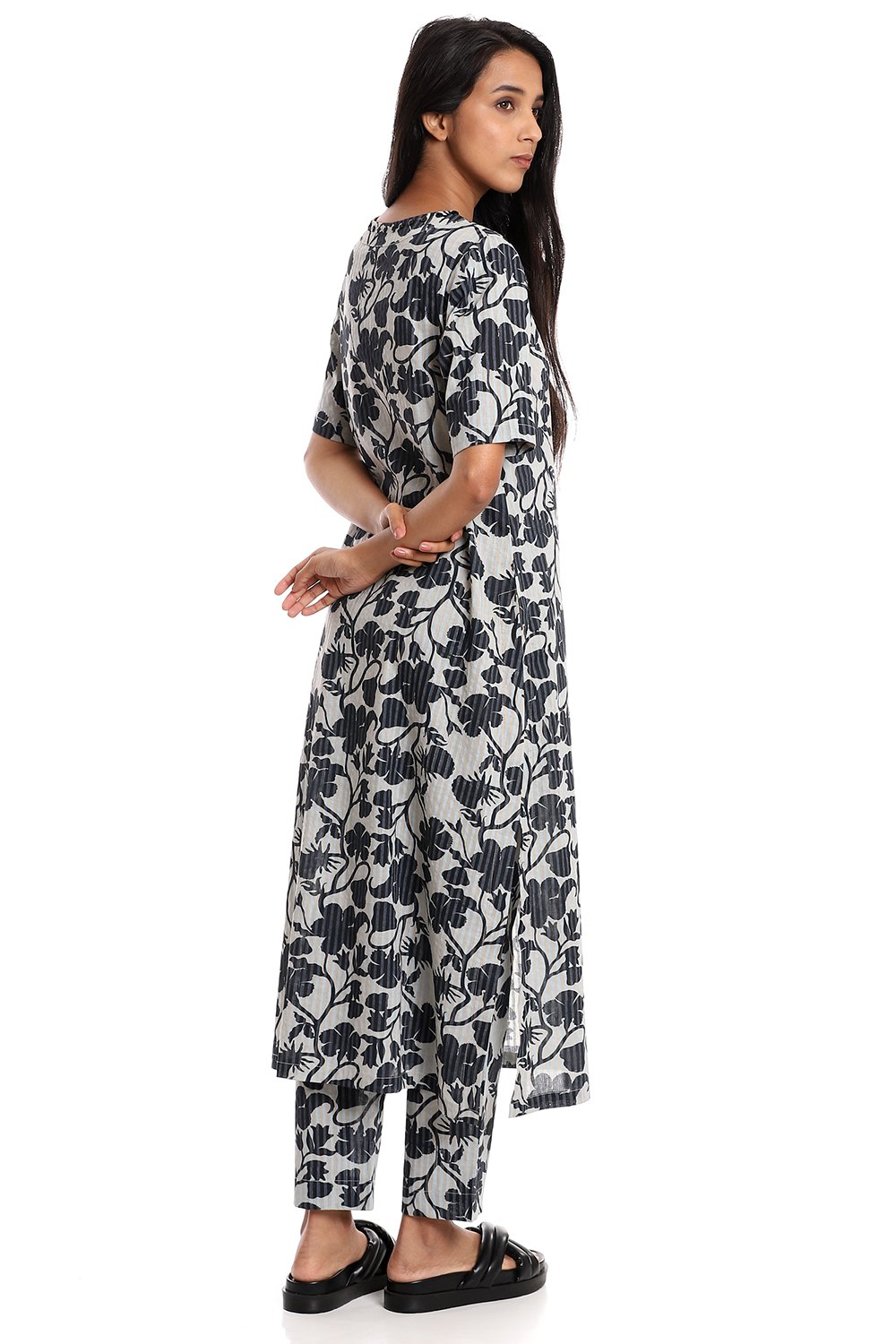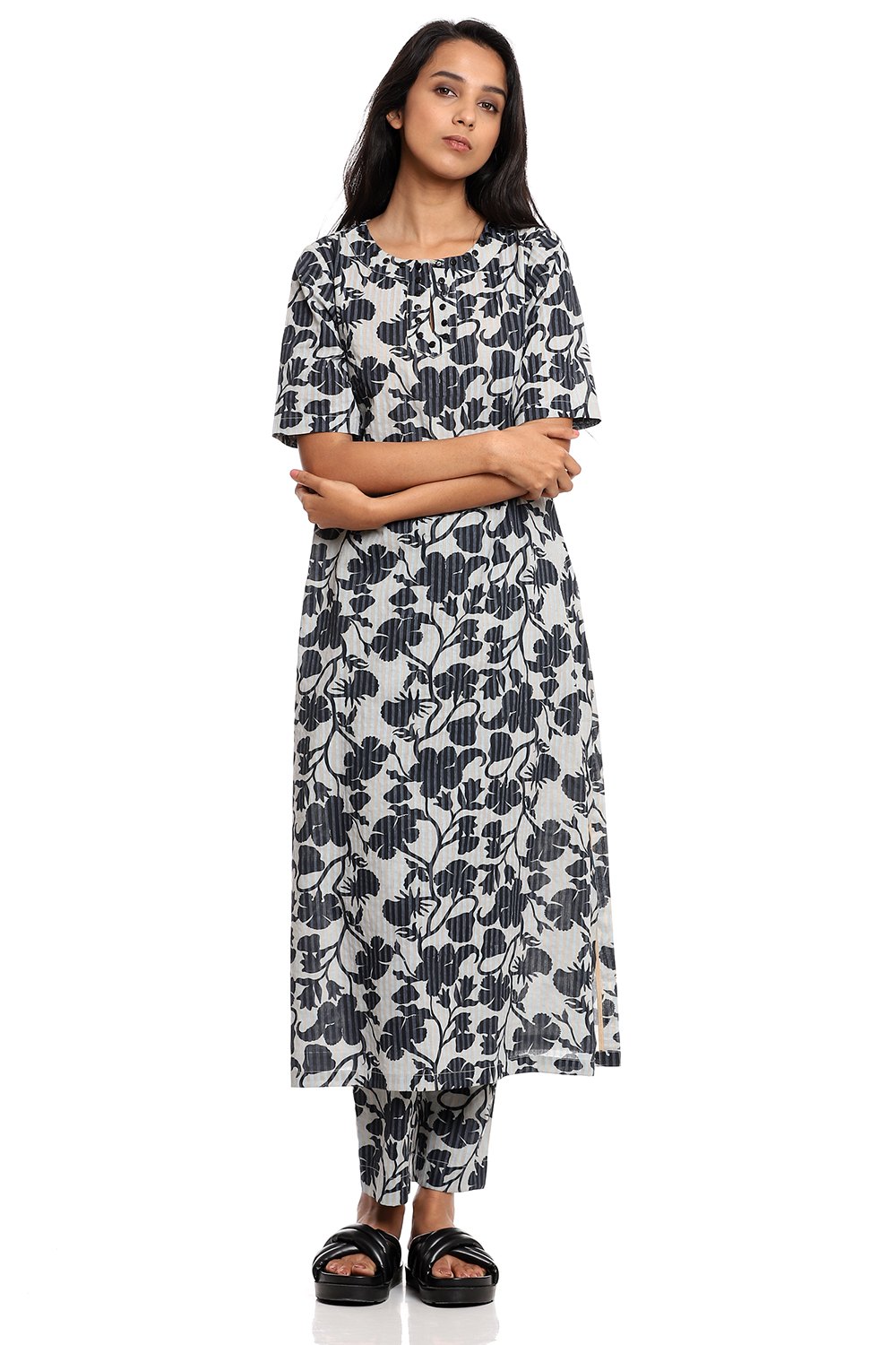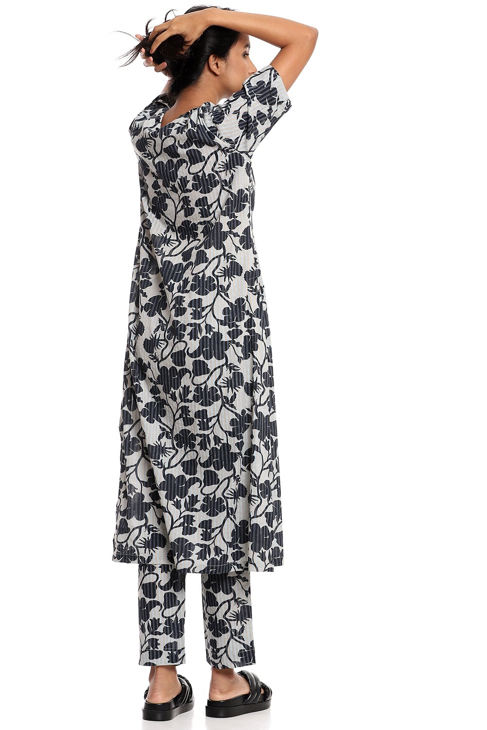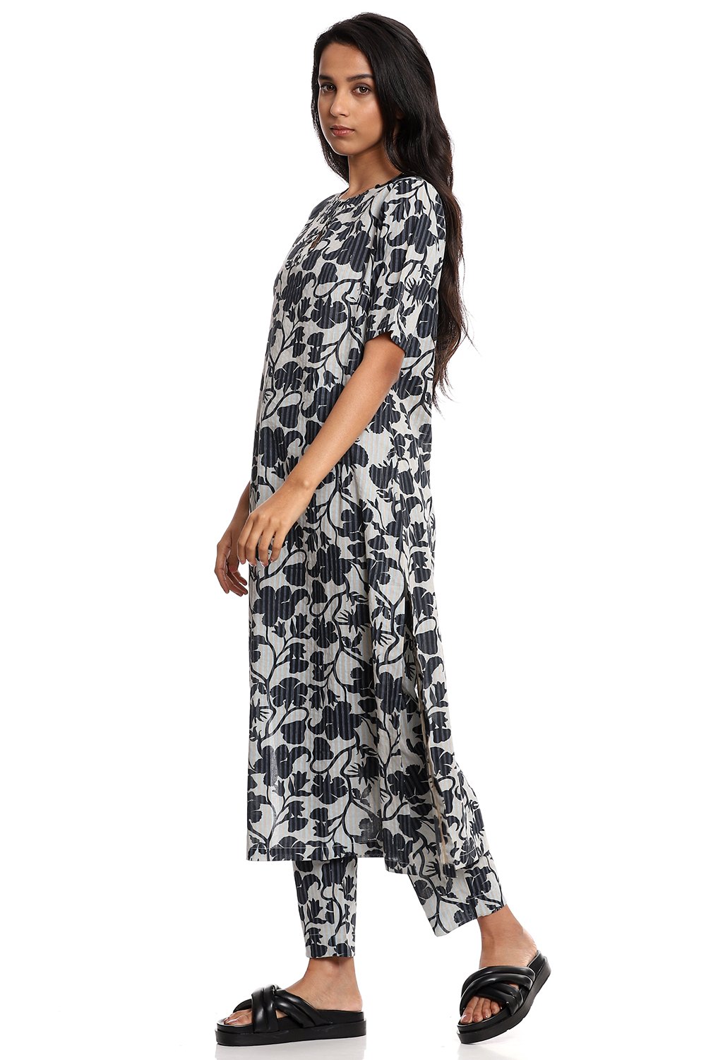 A classic kurta, an allover chintz print in navy, crafted from breathable cotton cambric fabric, on aqua and beige stripes. Add narrow cropped pants to your personal style cut from the same fabric.