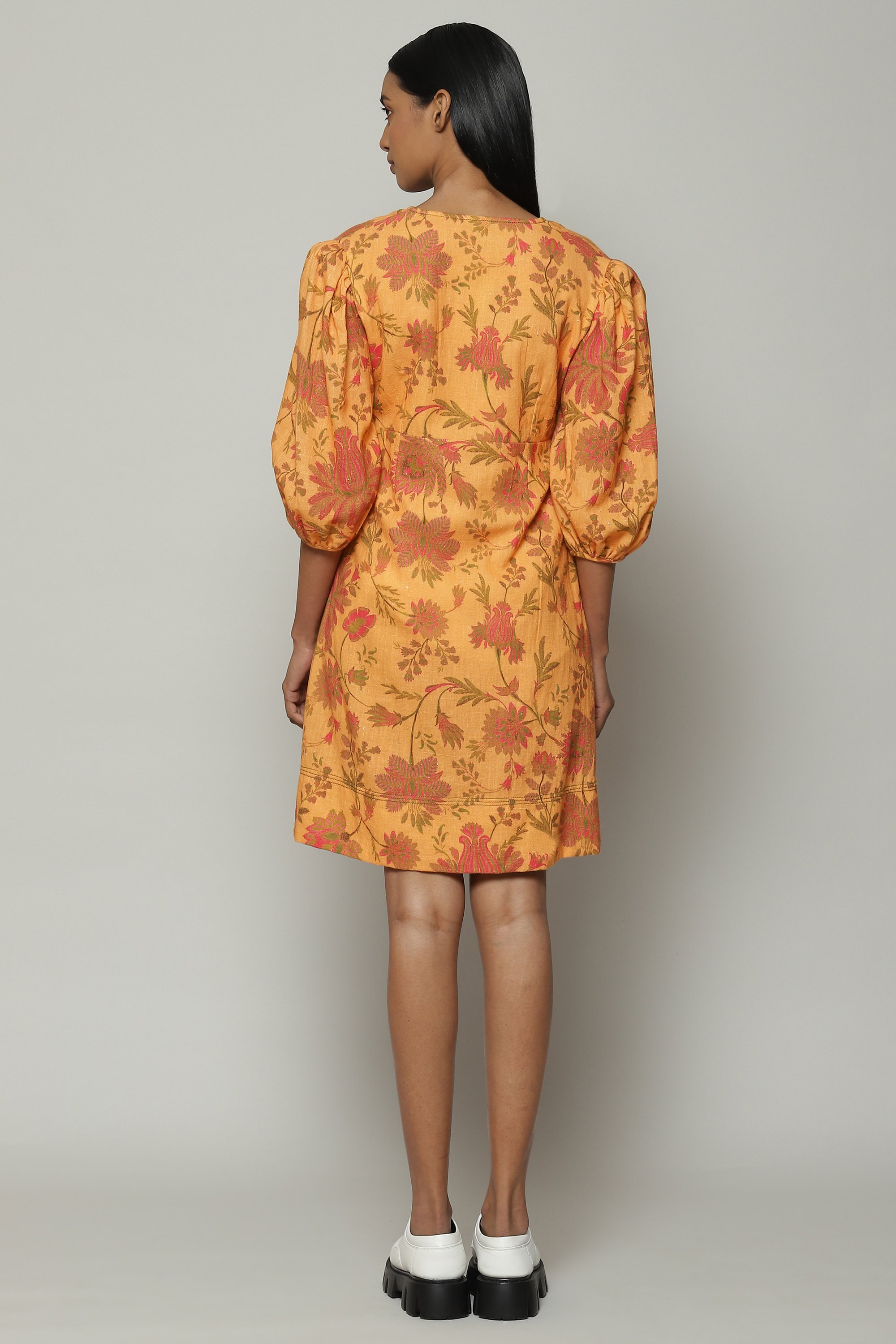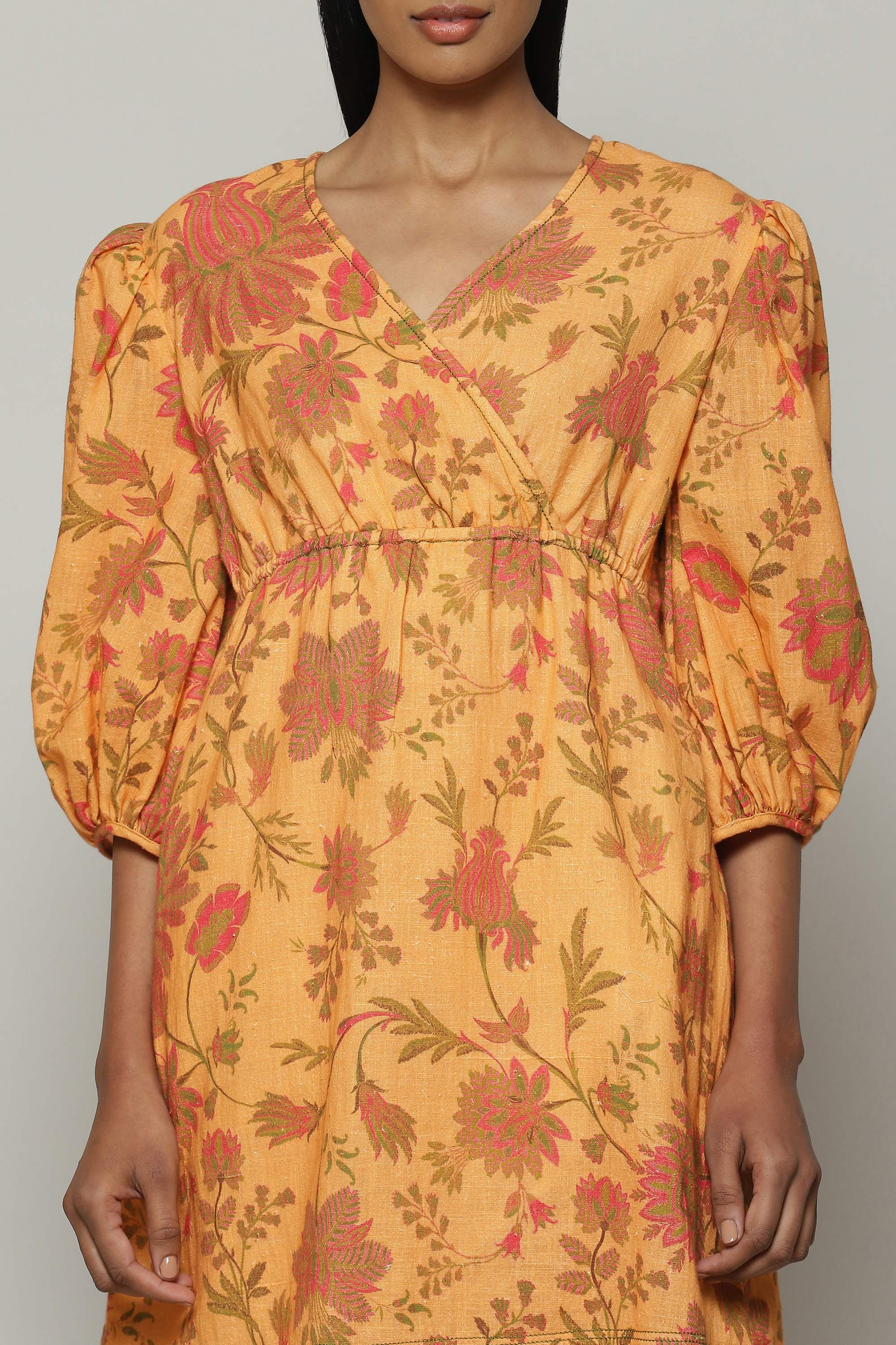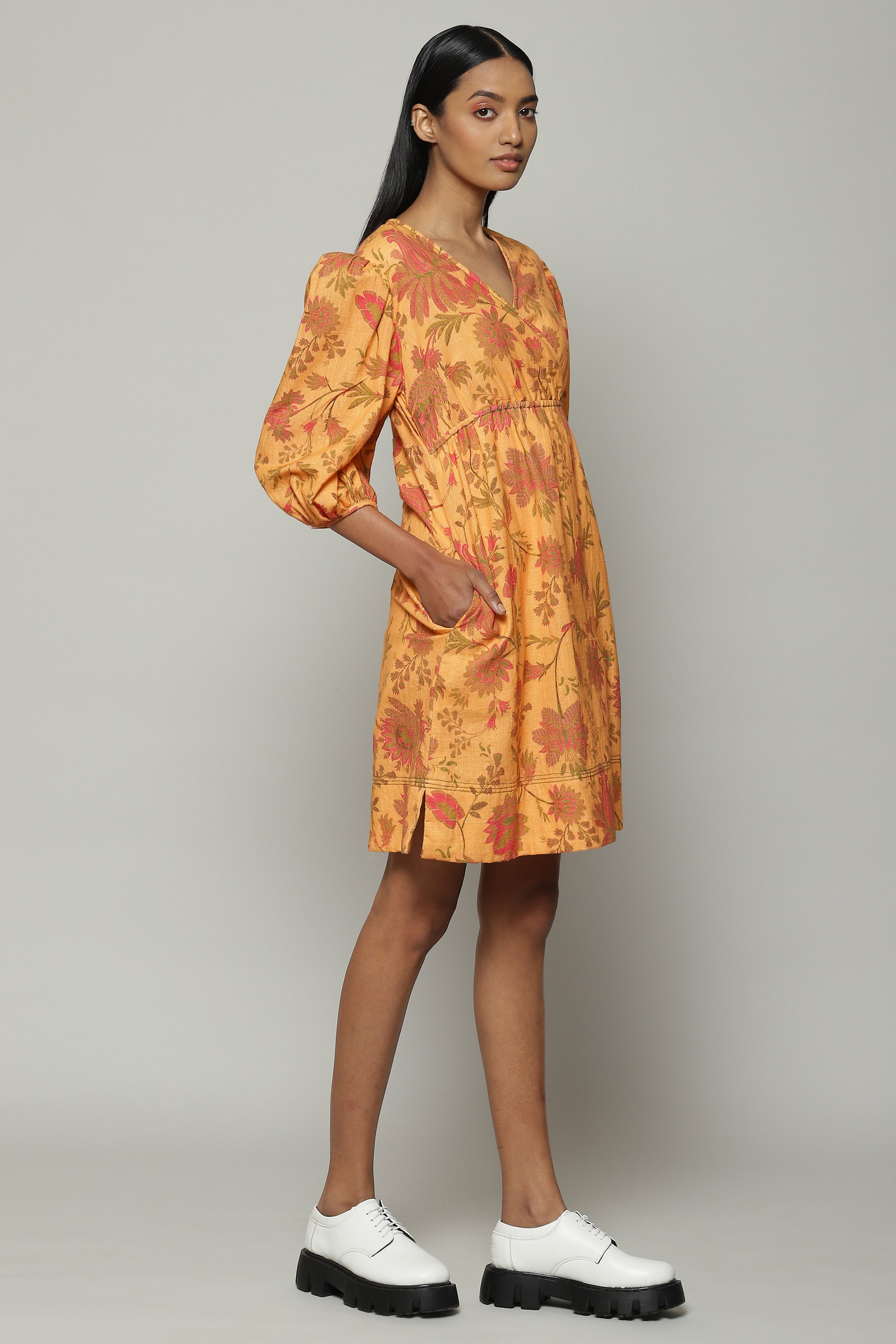 A floral dress coloured in the hues of an early sunset. Printed Chintz motifs adorn the rustic cotton fabric. Keeps you comfortable from dusk to dawn.