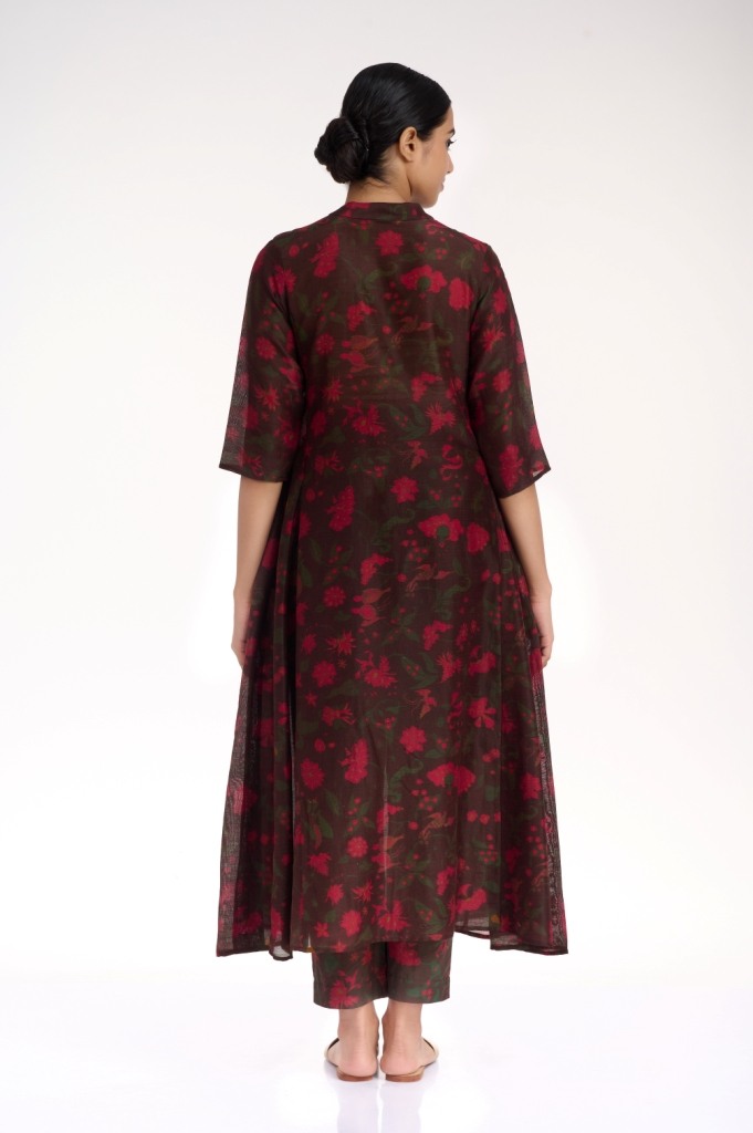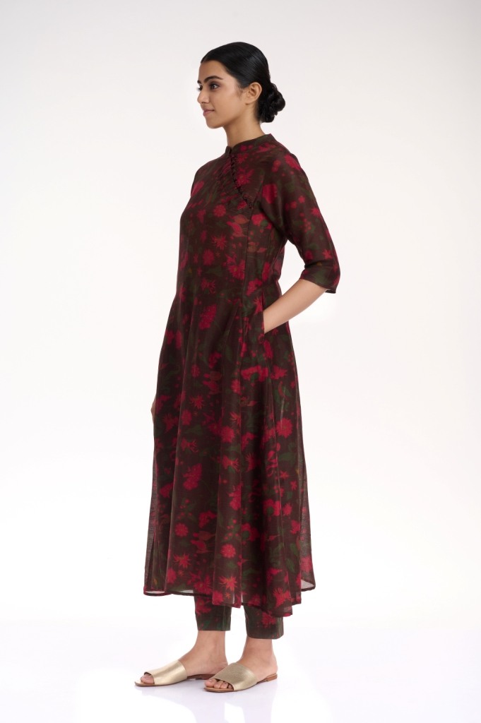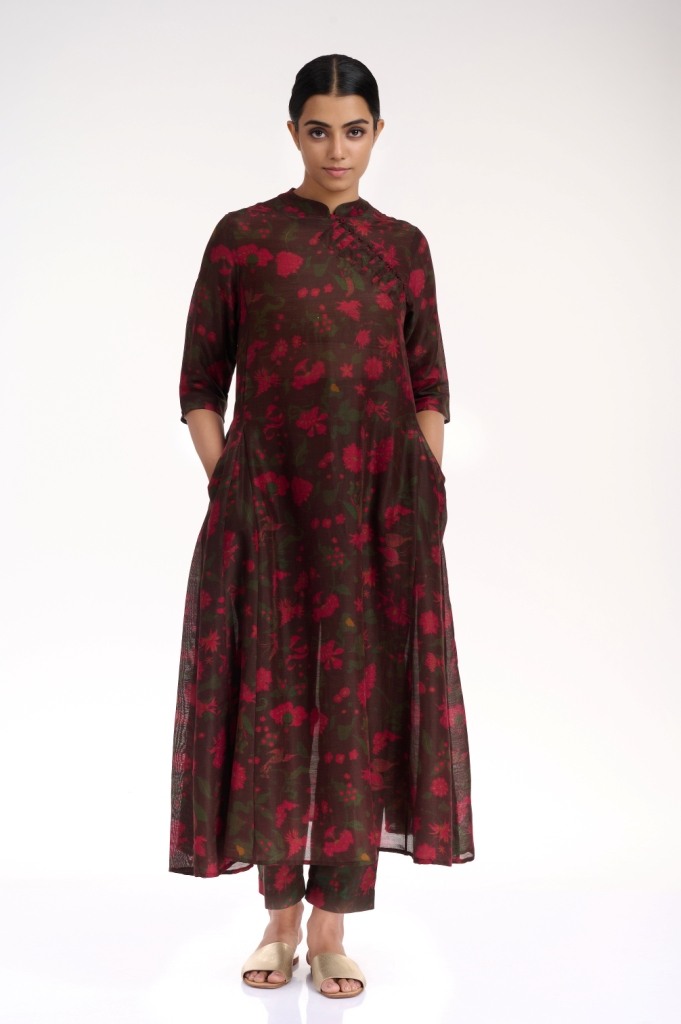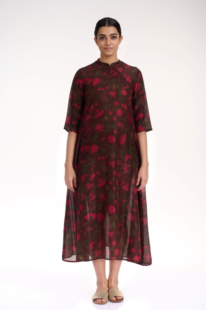 Brown floral printed kali dress, inspired by chintz, cut from silk-cotton, detailed asymmetric neckline with button closures and pocket on side seems.