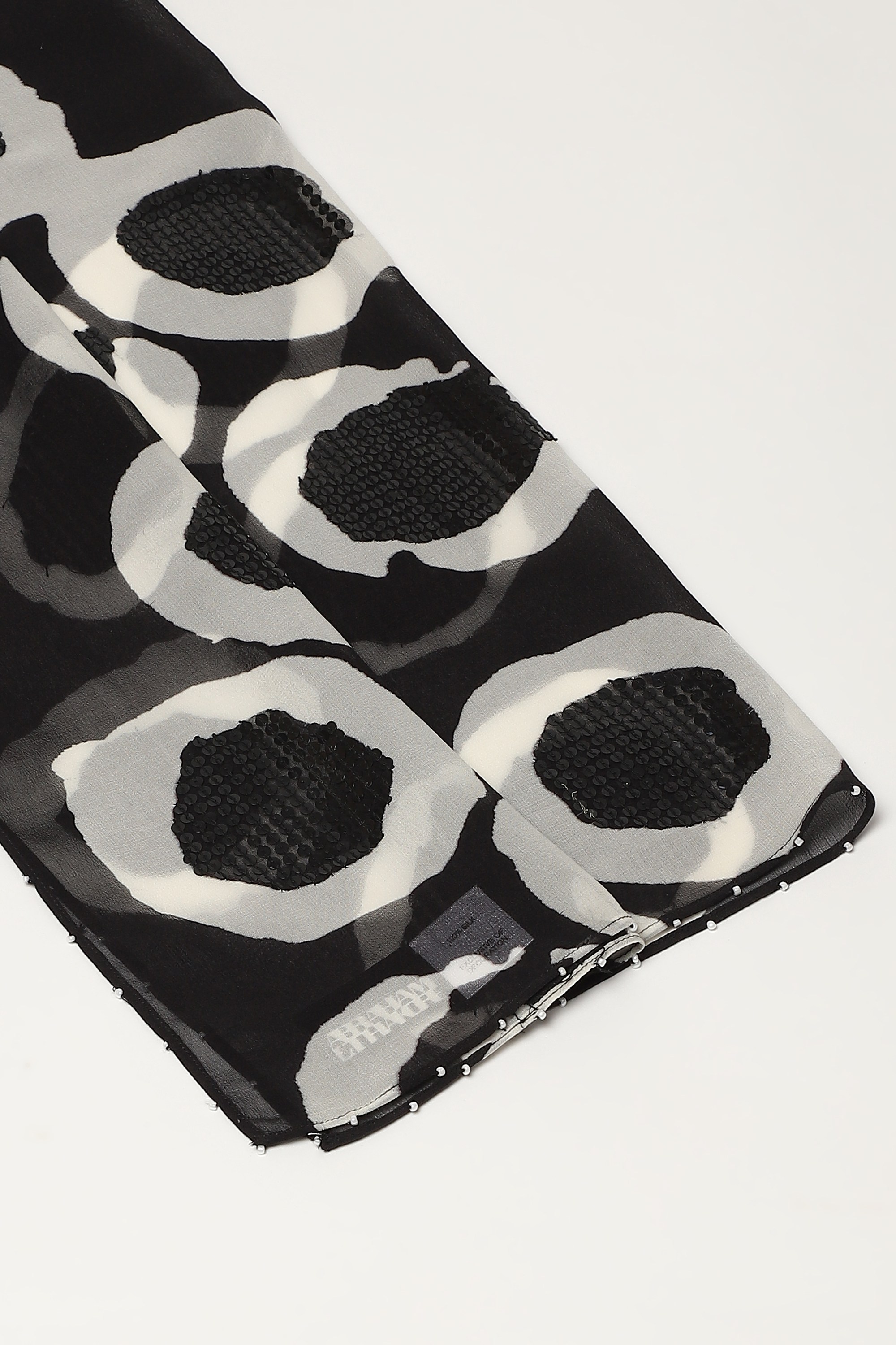 A lightweight black scarf embroidered with sequins.