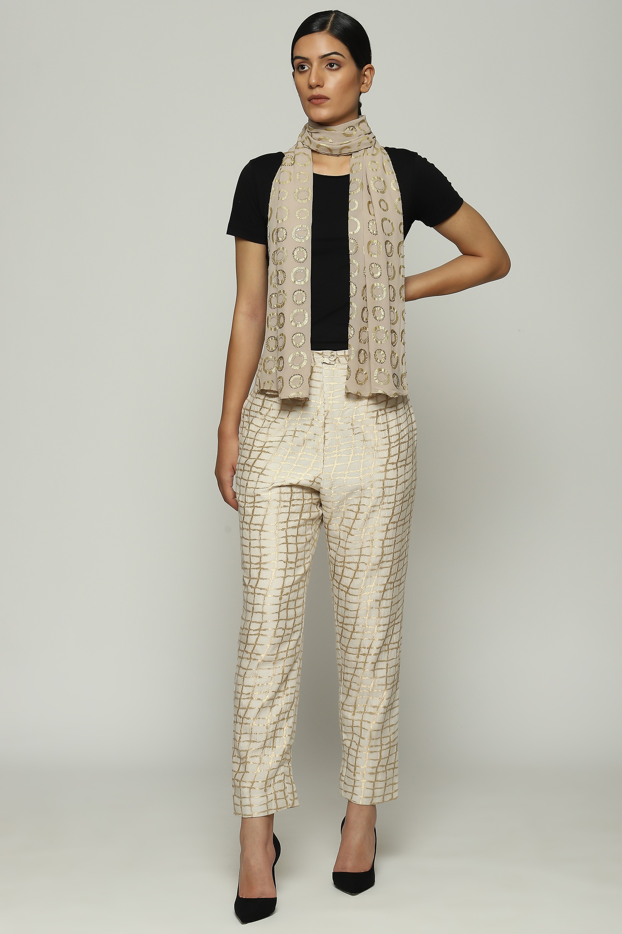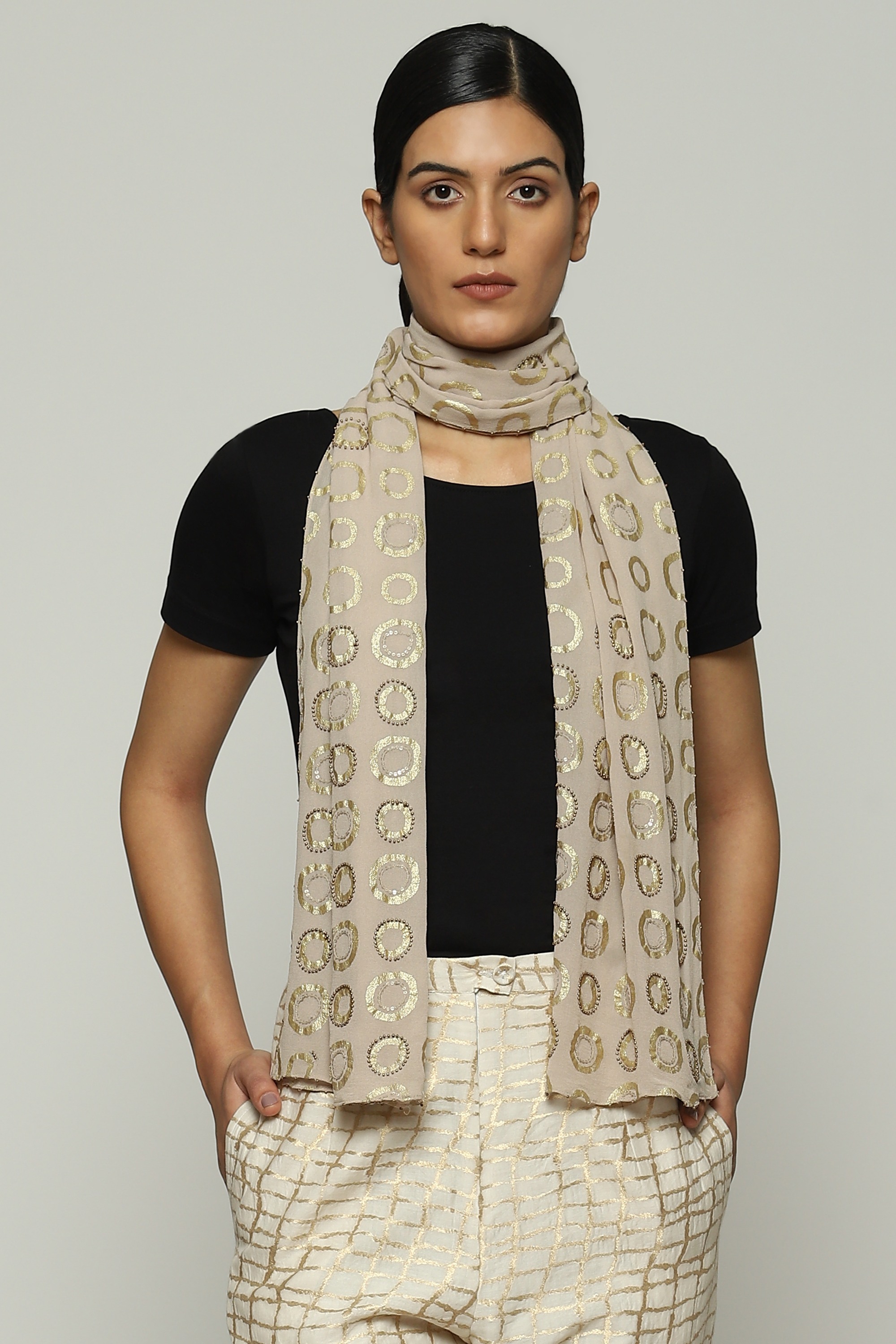 Crafted in semi-sheer Georgette silk, this scarf features delicate gold foil printing along with Hand Adda embroidered golden beads.