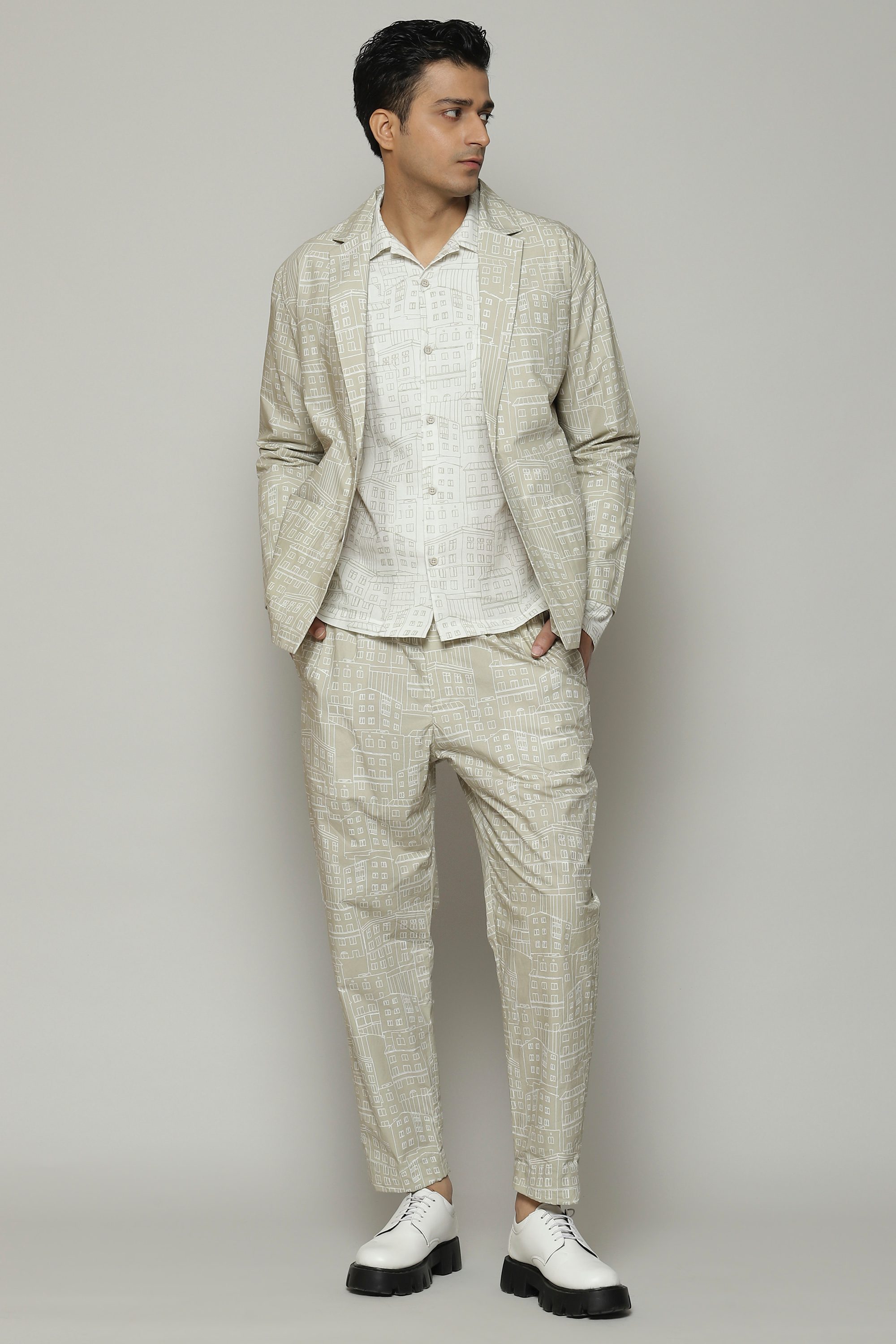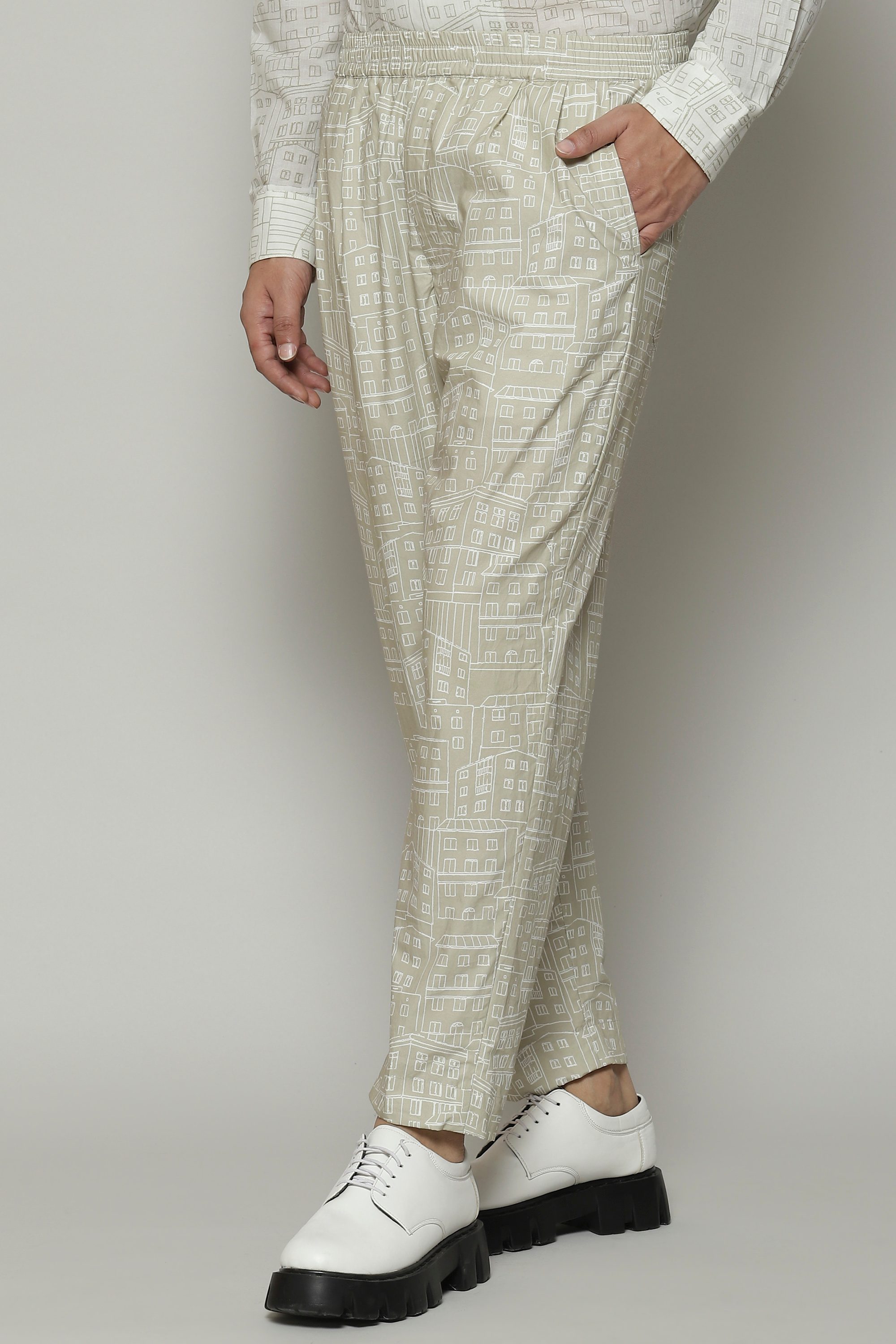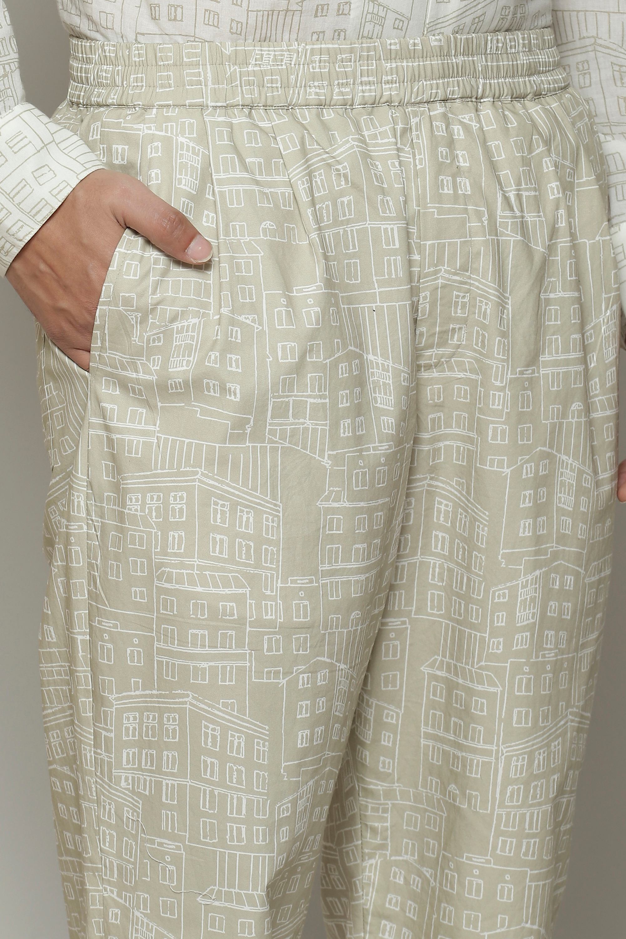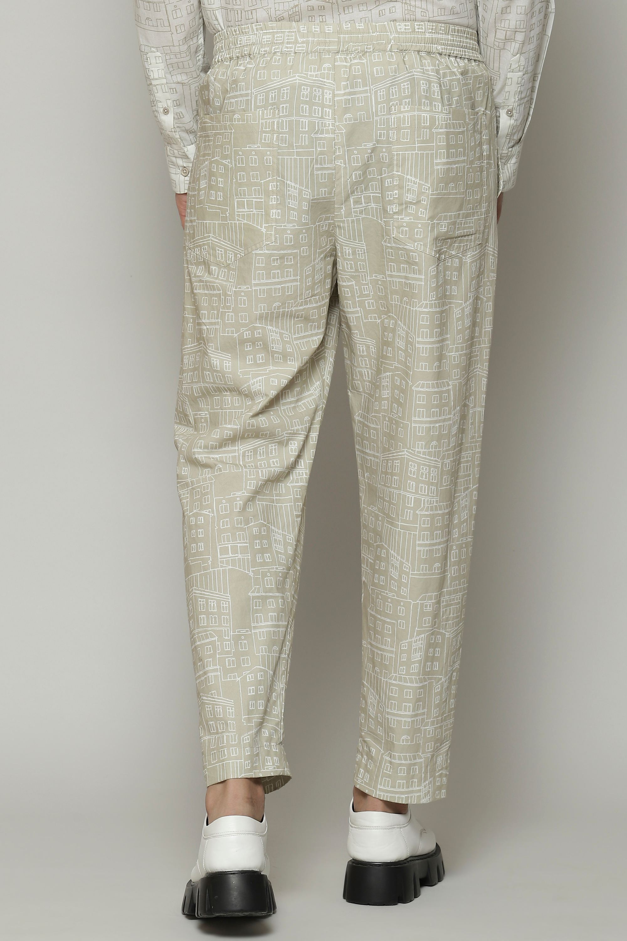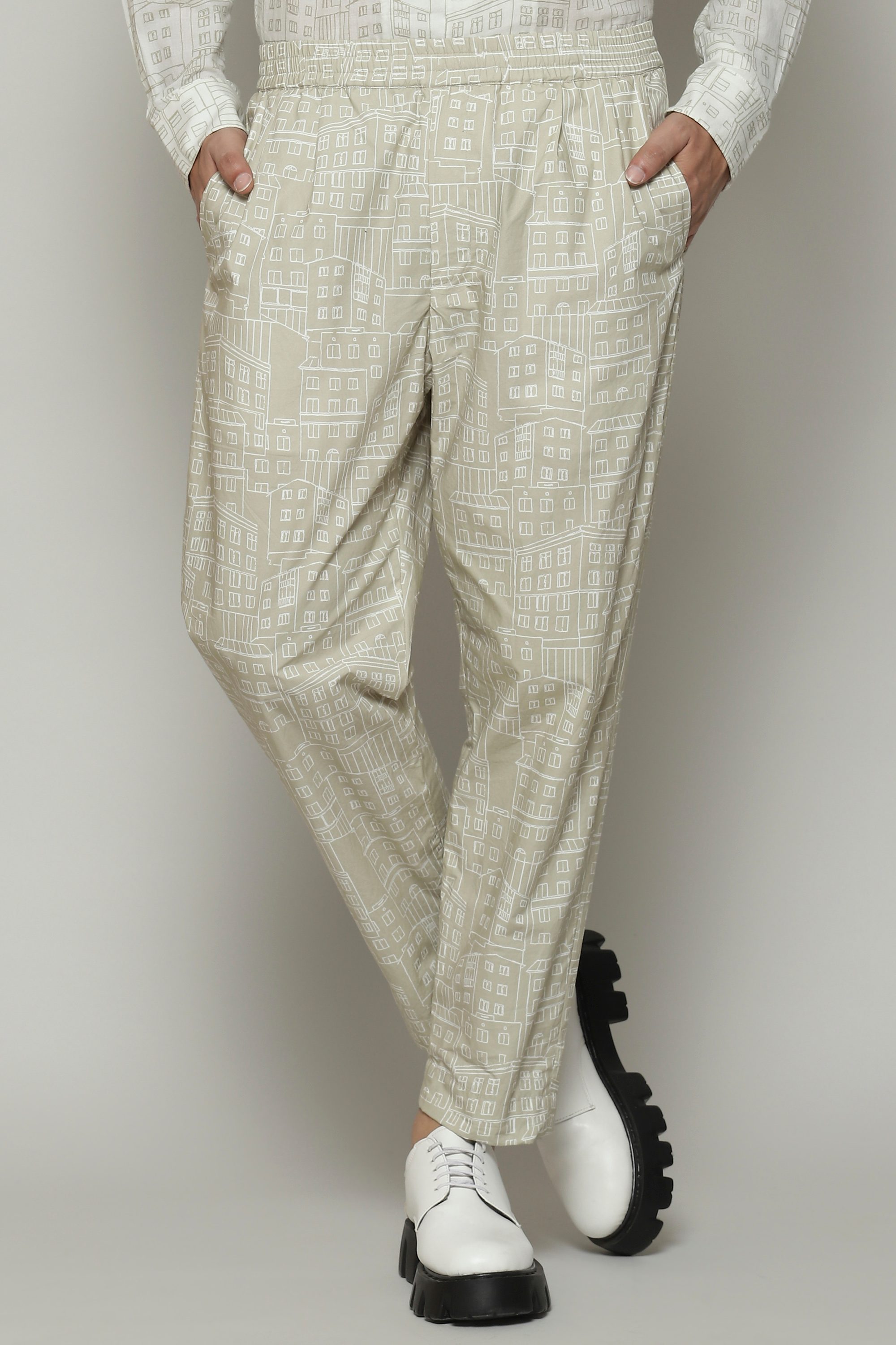 Effortless poplin pants that pair well with shirts, both casual and formal. The compact weave used to create this fabric makes its light and breathable. Features an understated digital cityscape print, for a touch of glam.