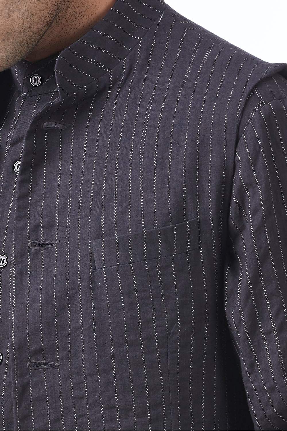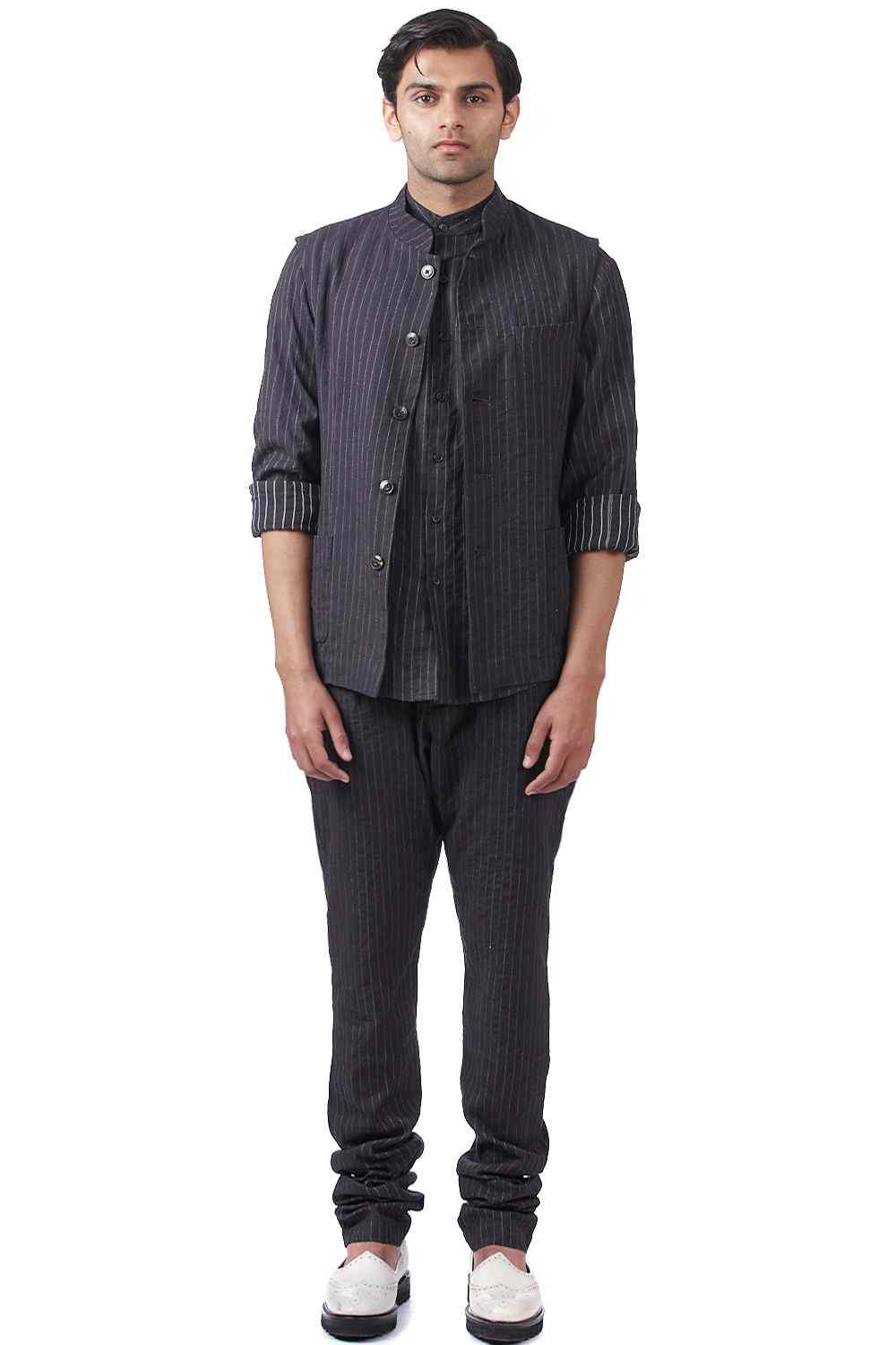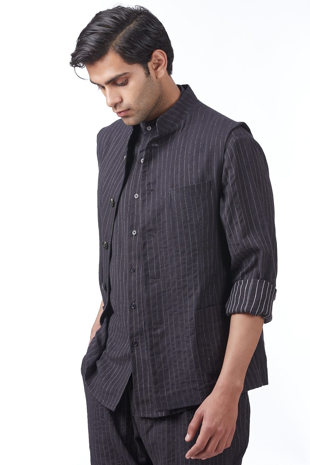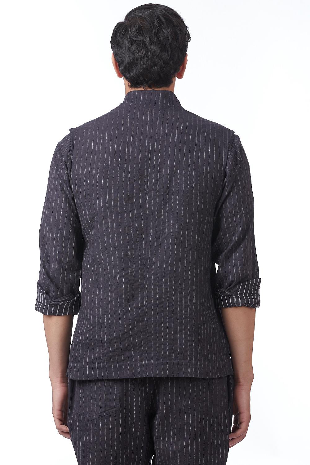 Classic Workwear Bundi. Crafted In Hand Spun Handwoven Cotton Fabric With Emroidered Pinstripes. Features Nehru Collar And Bespoke Scratchy Pinstripes, Offering A Pattern Unique To Each Piece With Our Signature Regular Fit. Abraham & Thakore Menswear Jackets Are 'Unconstructed' - Designed With A Softer Cut And Are Semi Lined - To Create A Contemporary Easy Fit, With The Comfort Of A Shirt Wear Them With Our Exclusive Shirts And 'Yogi' Pants For A Crisp Yet Relaxed Look
