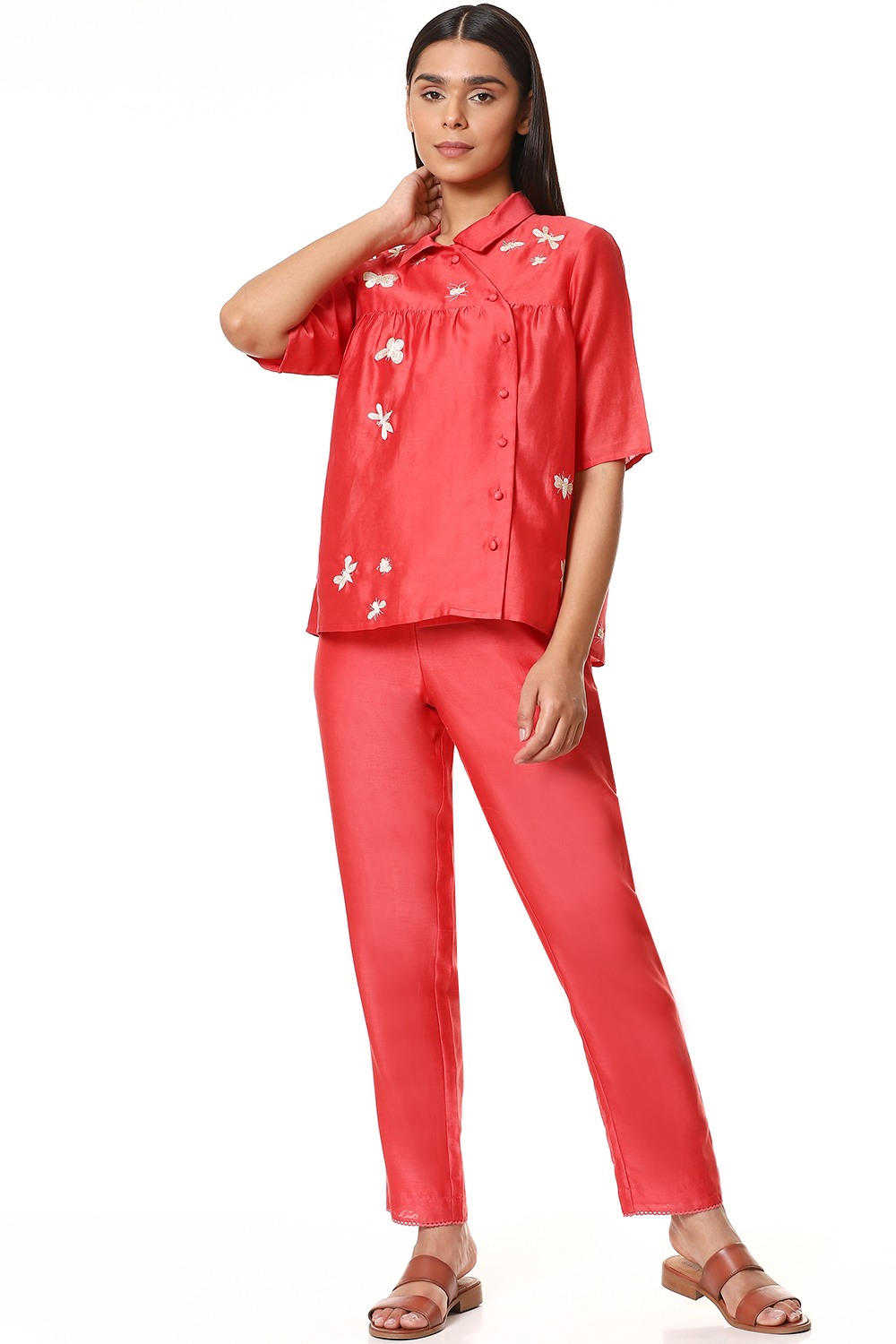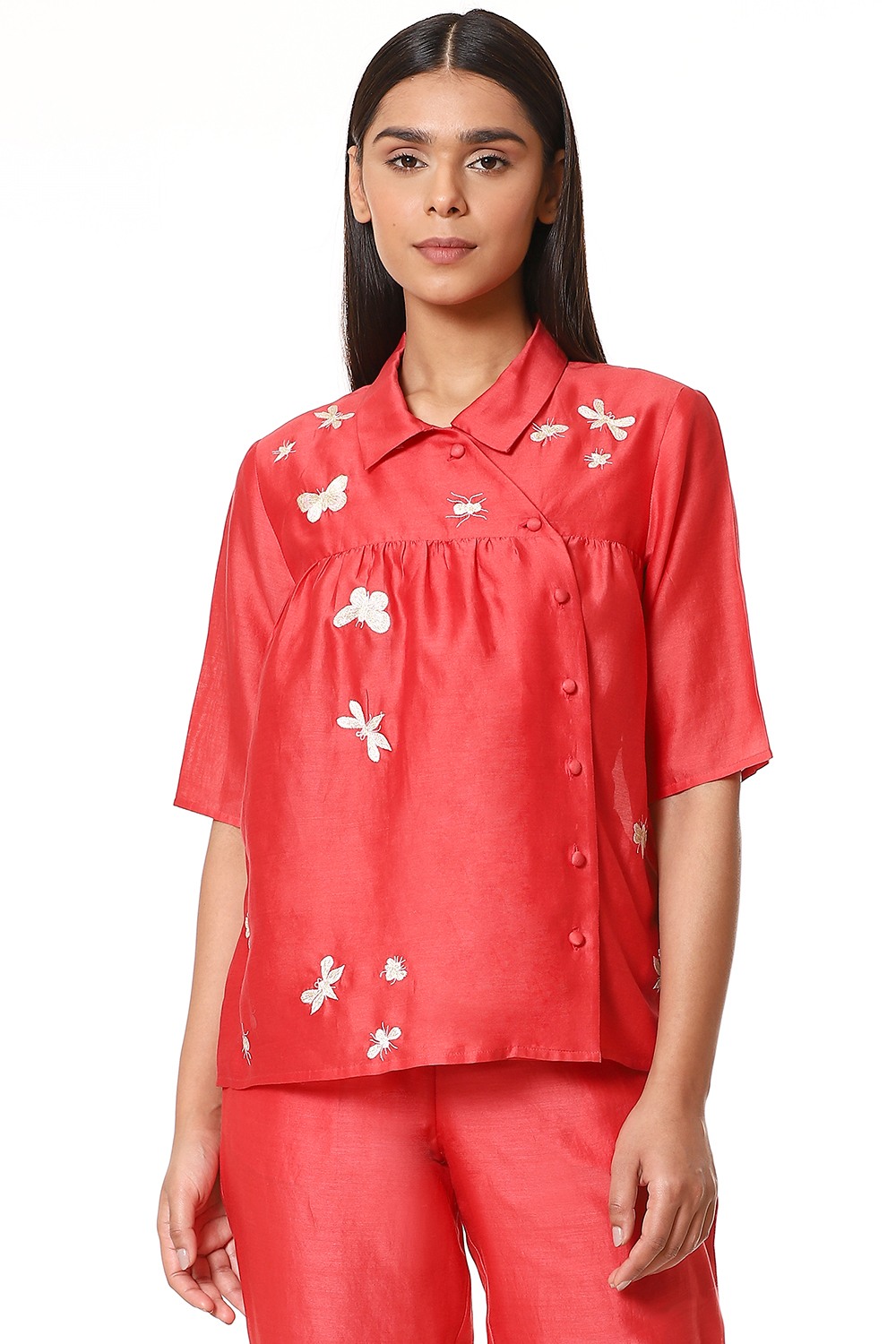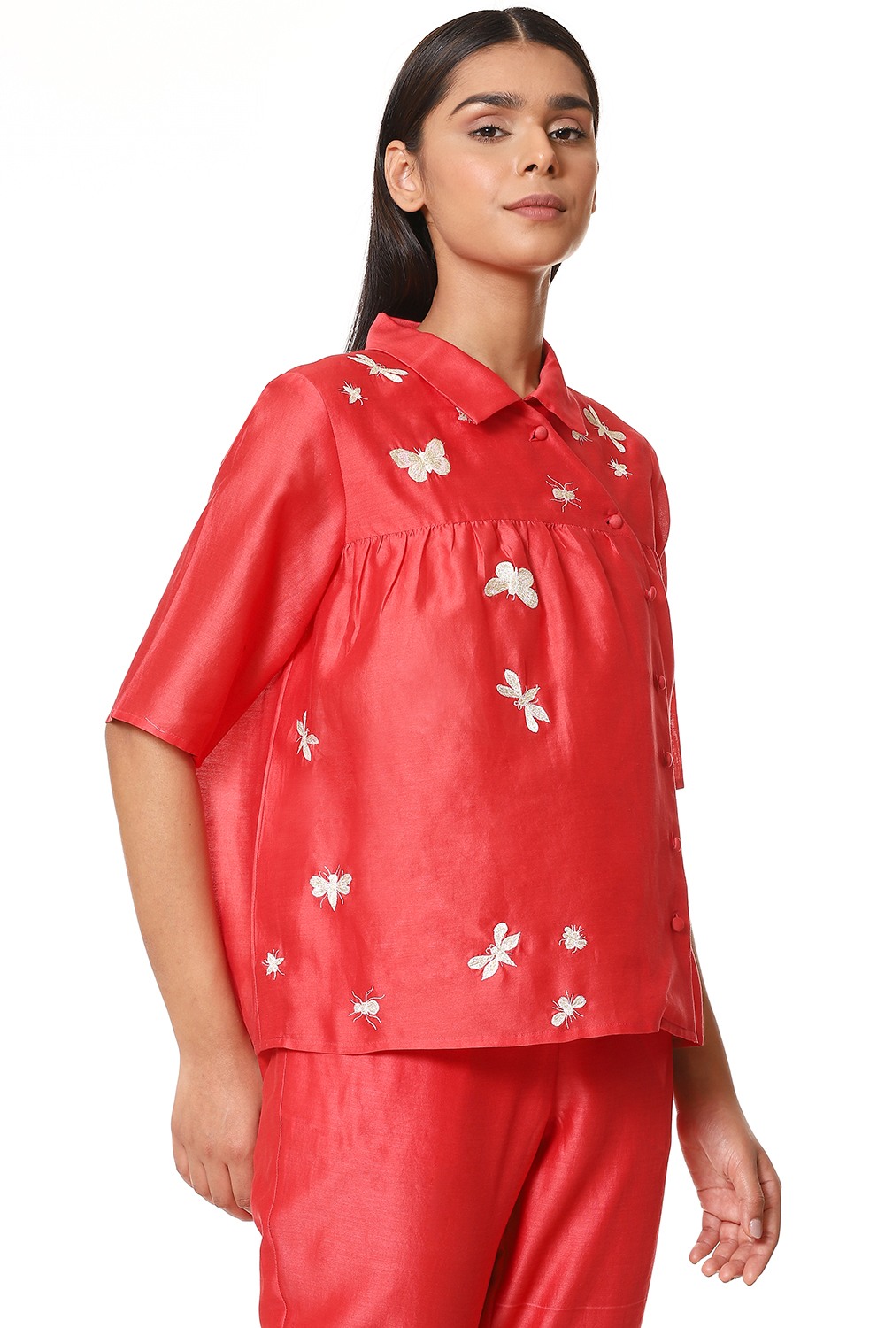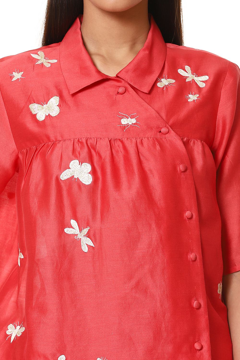 Fall in love with this kedia top in refreshing coral, crafted from lightweight silk-cotton texture, detailed with embroidered insects in ivory and gold thread. Fabric buttons on the side with soft gathers on the yoke. Specially created for your everyday clothing needs.