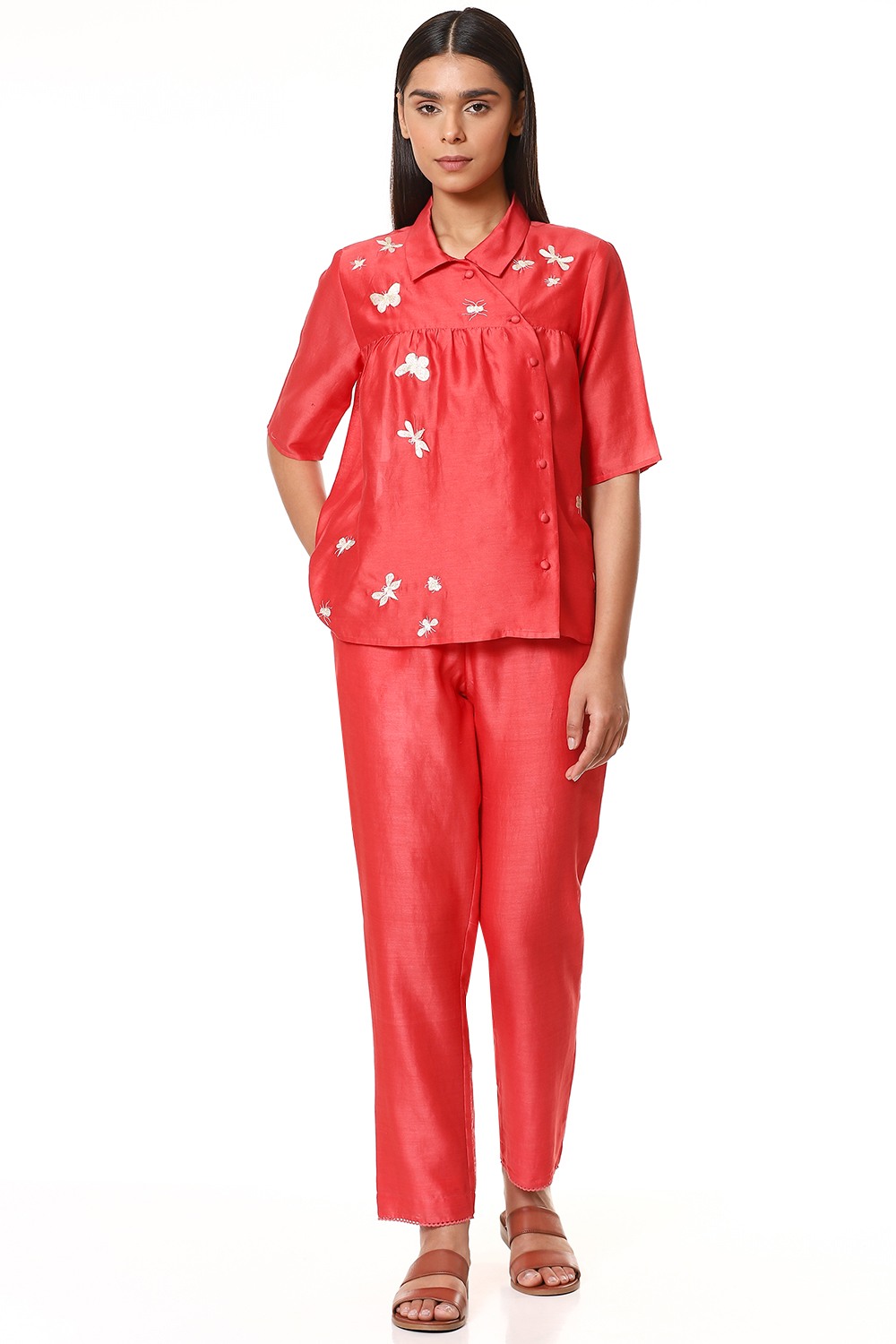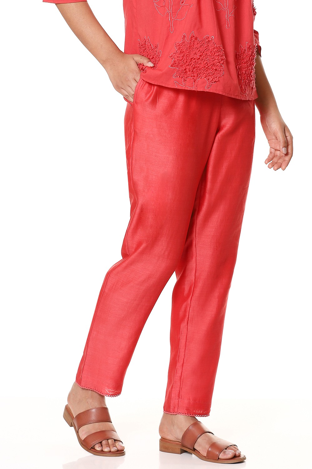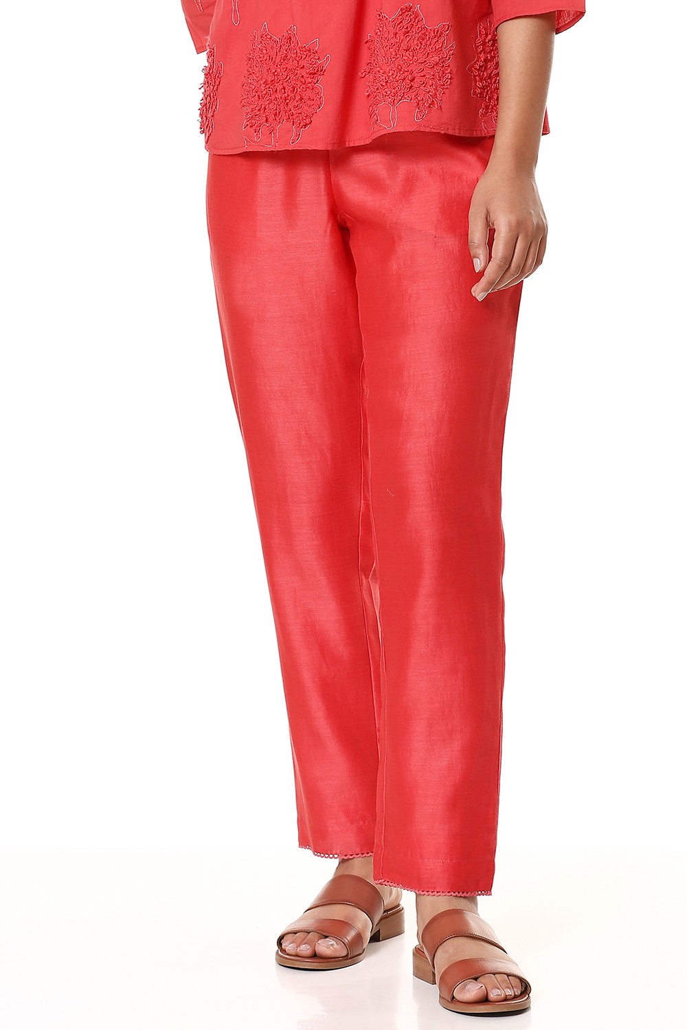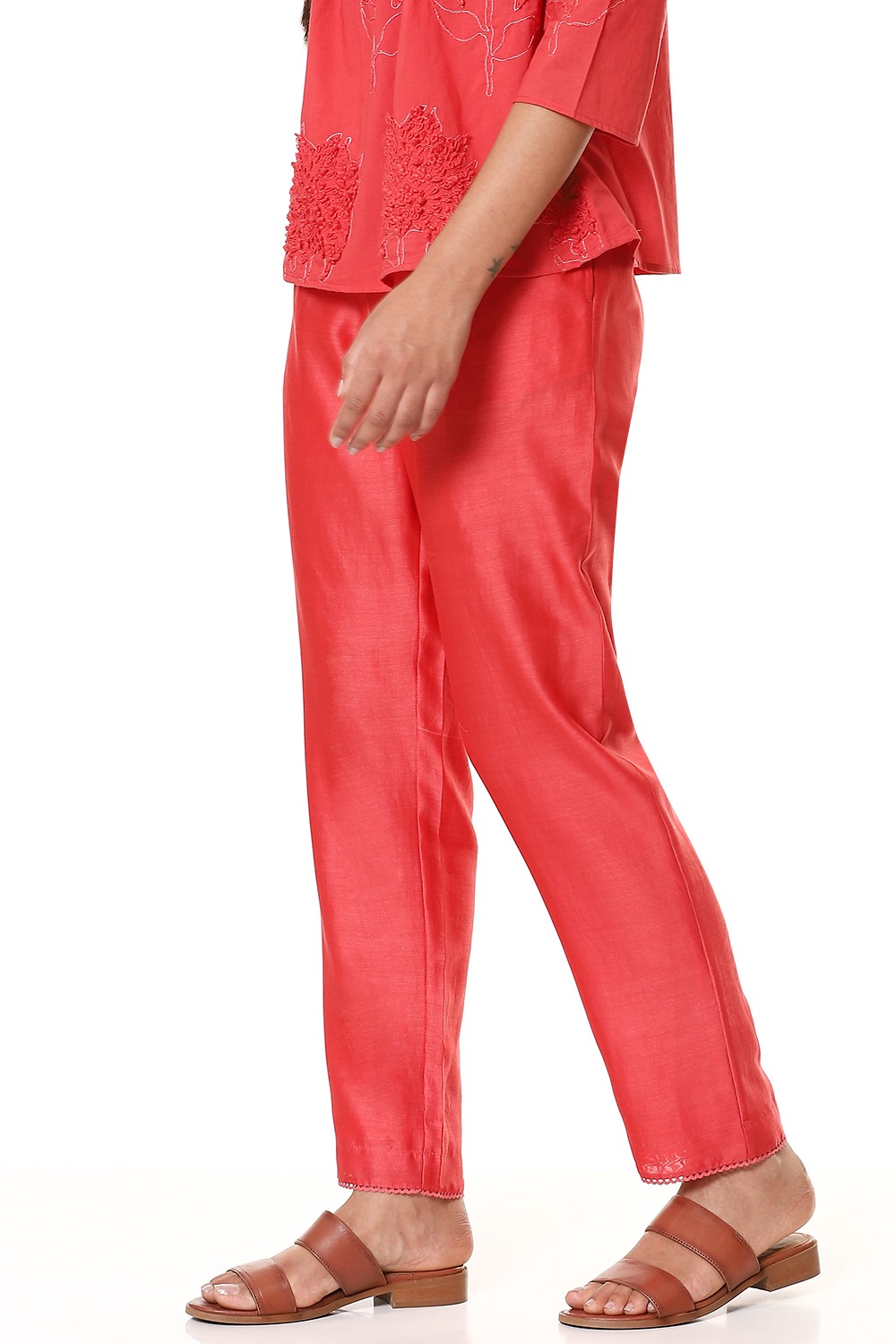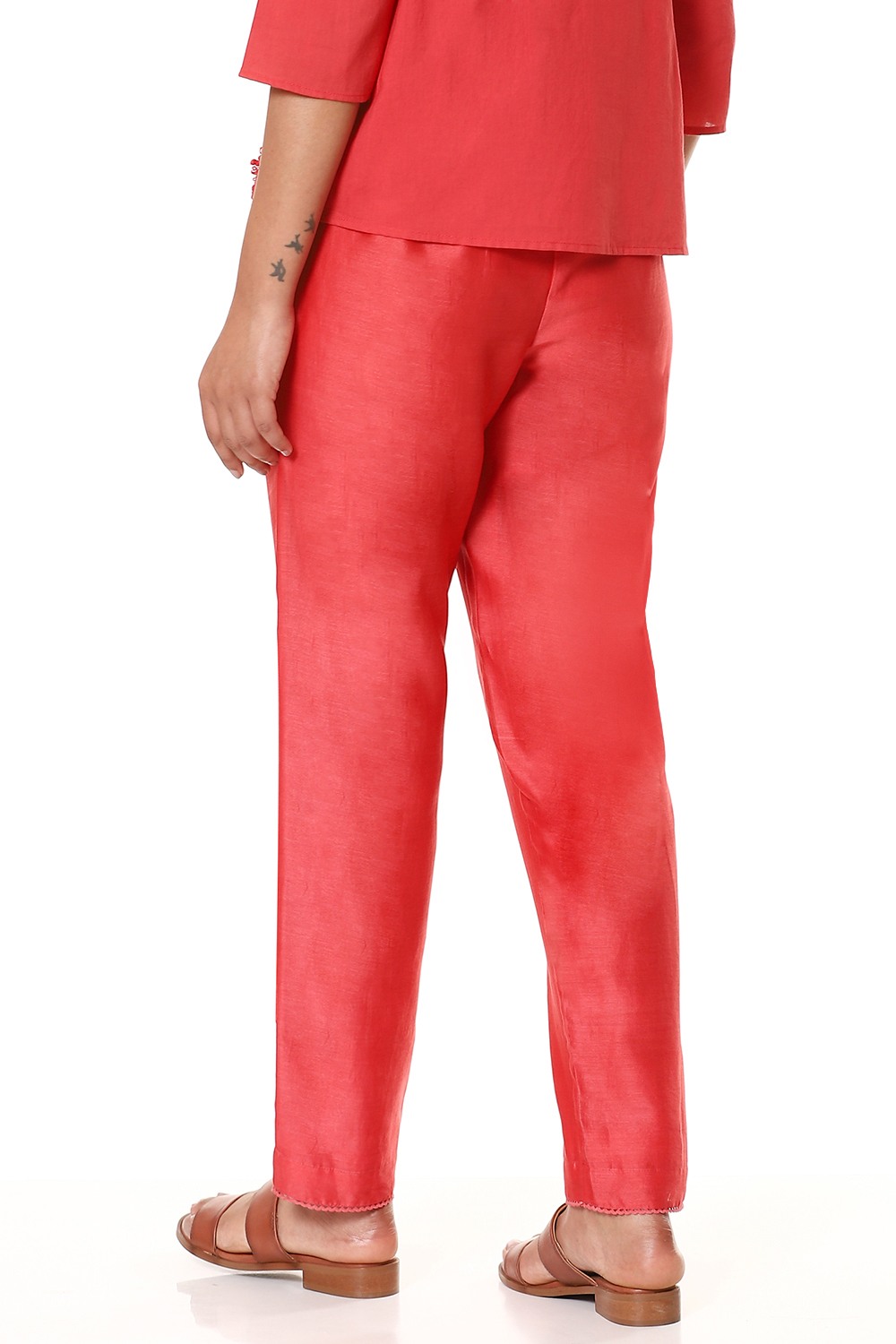 An everyday regular and comfortable pair of cropped pants in refreshing coral, cut from lightweight silk-cotton texture and has a lining in cotton voile. Added soft elastic waistband for an easy and comfortable fit which works great for all body types. Specially crafted for your everyday clothing needs.