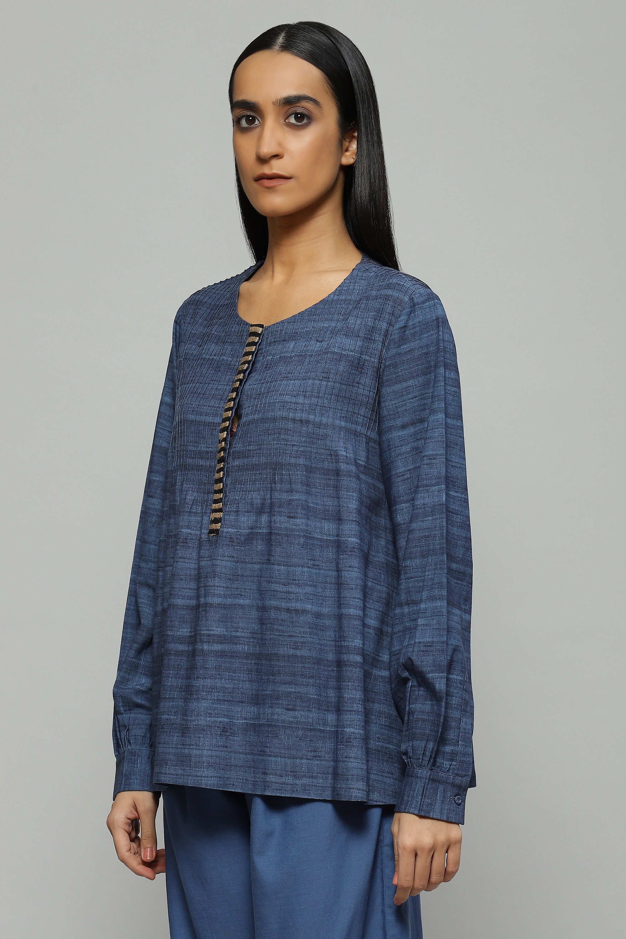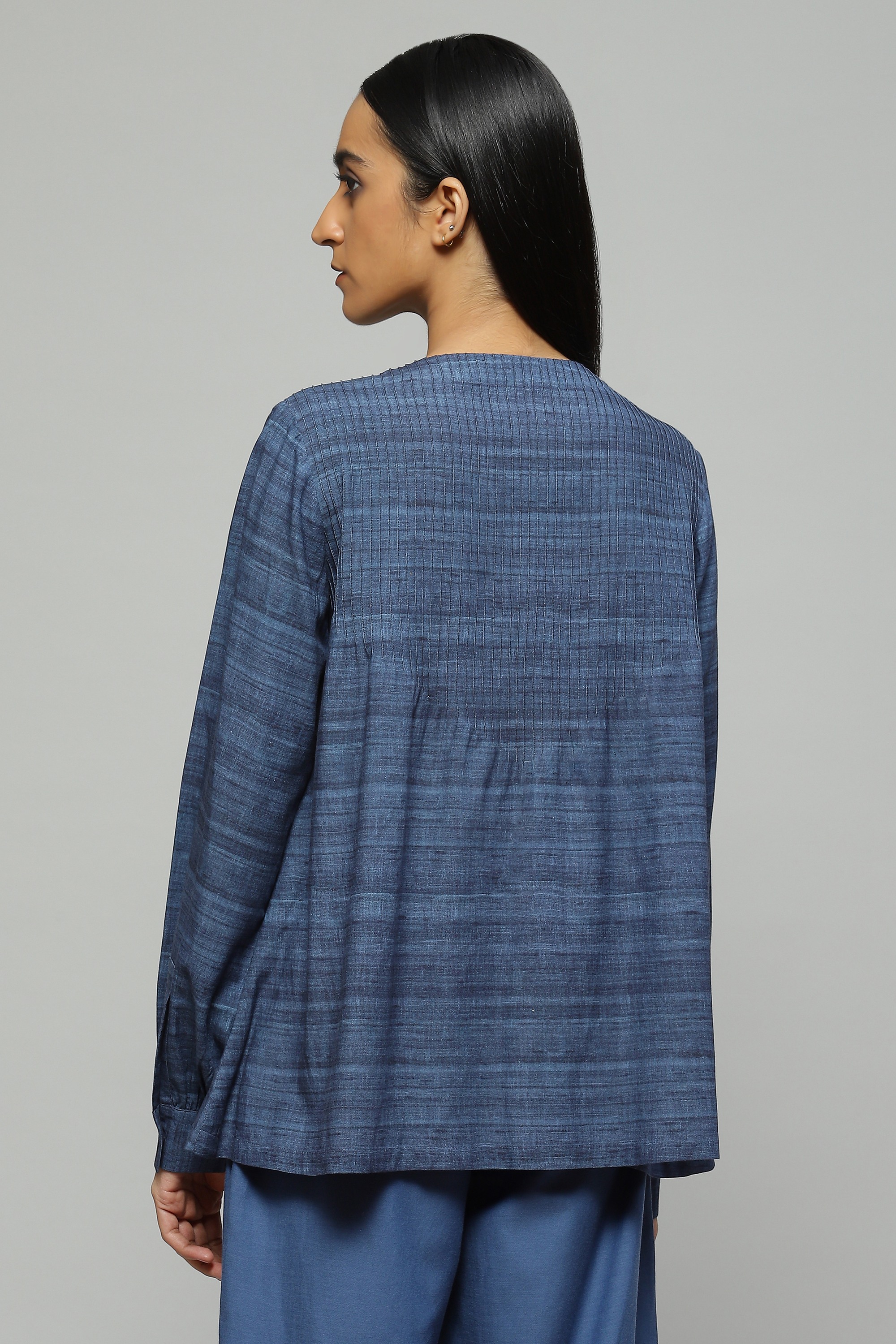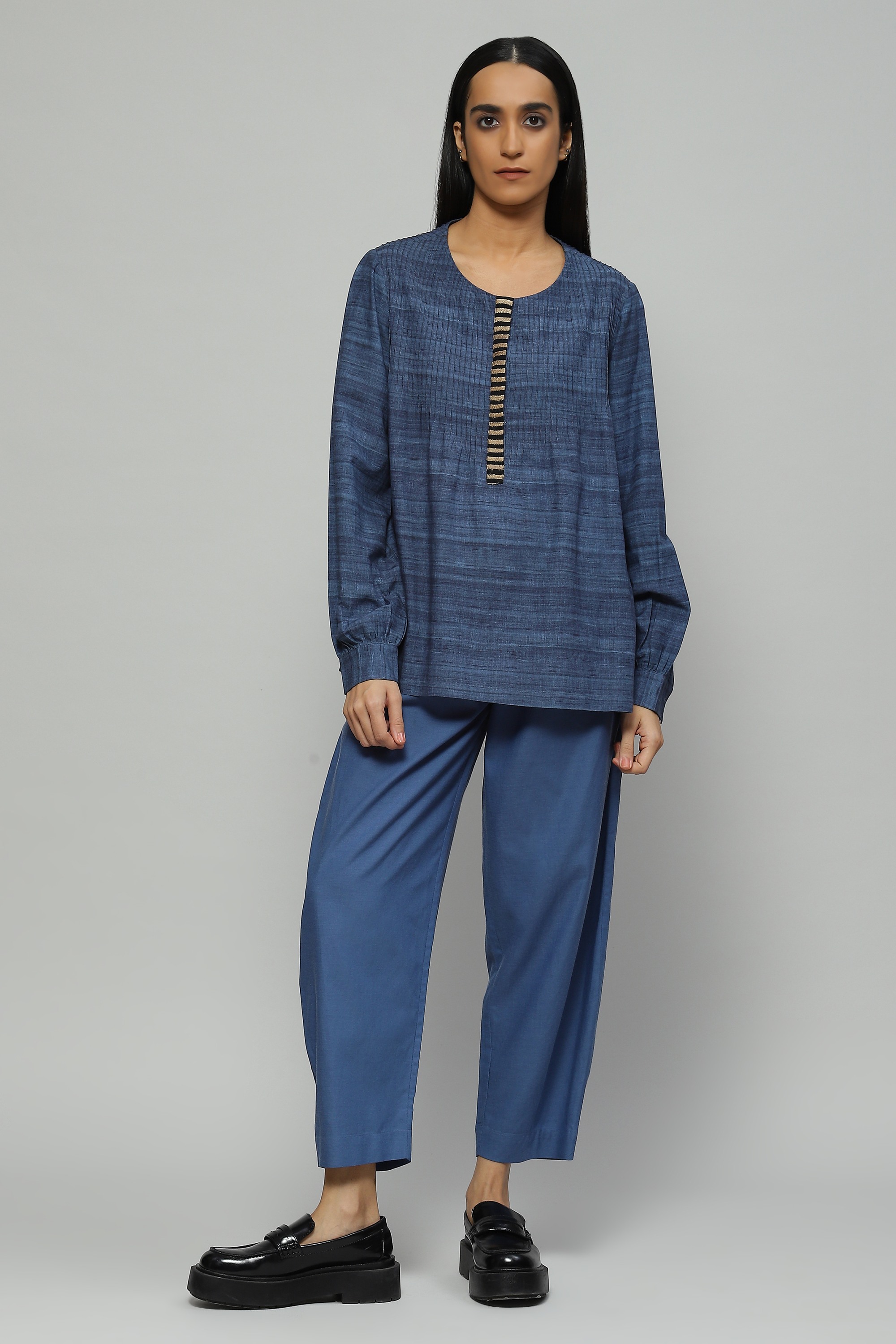 A light-weight blouse in a soothing shade of cornflower is embellished with tussar yarn embroidery It features engineered pin tucks and a a trompe l'oeil effect of wild tussar fabric printed onto a viscose cotton blend, your fail-safe piece while on the go