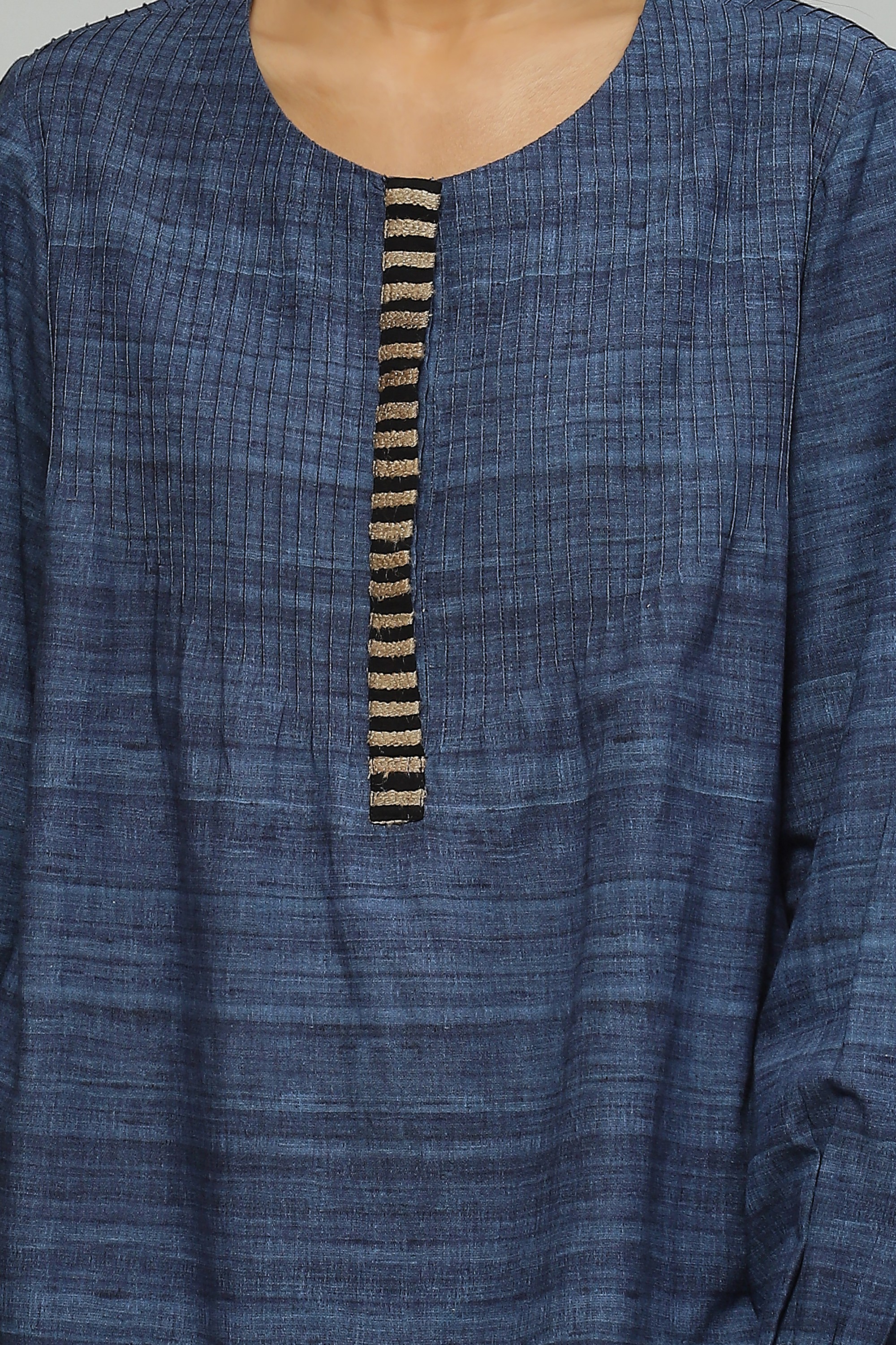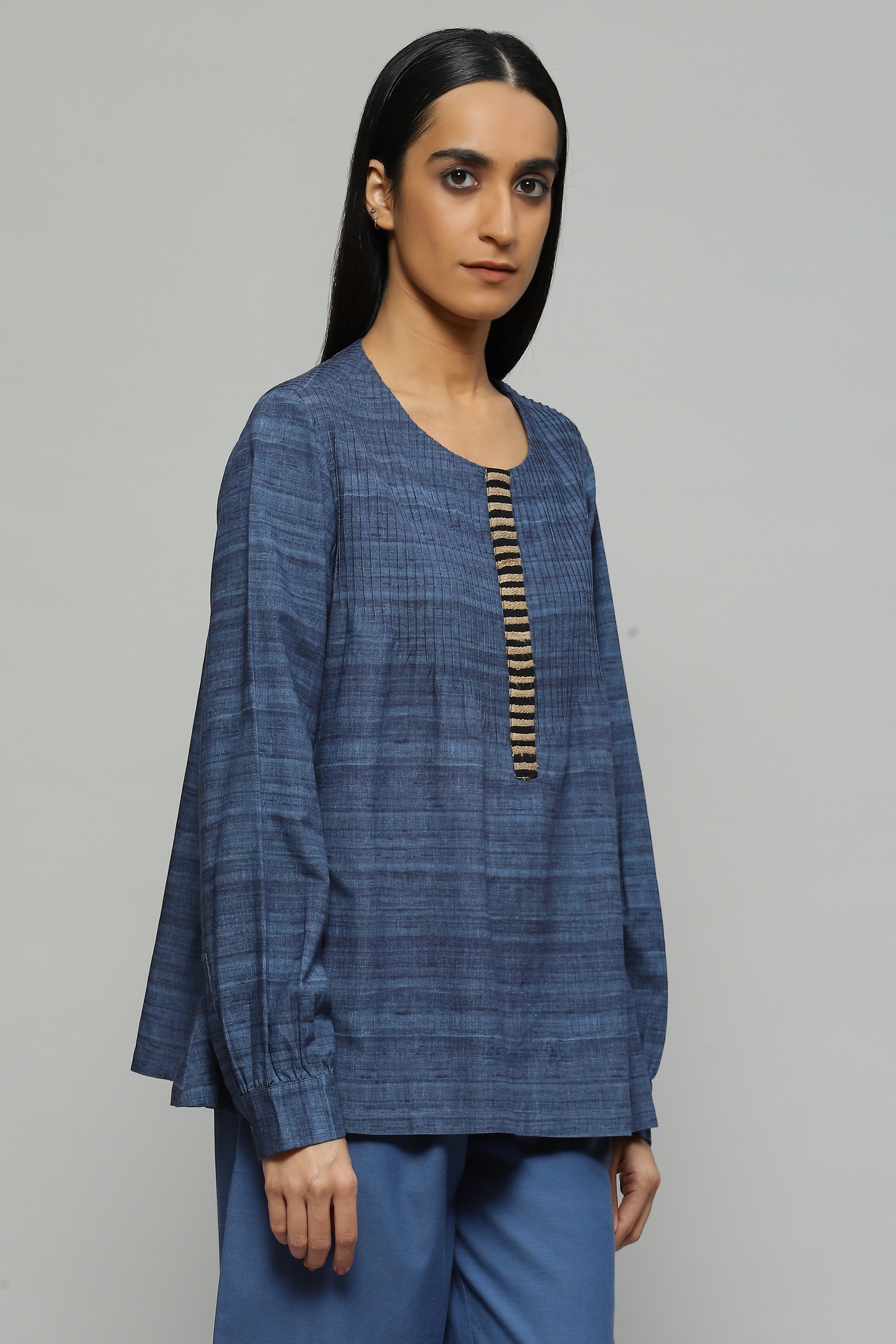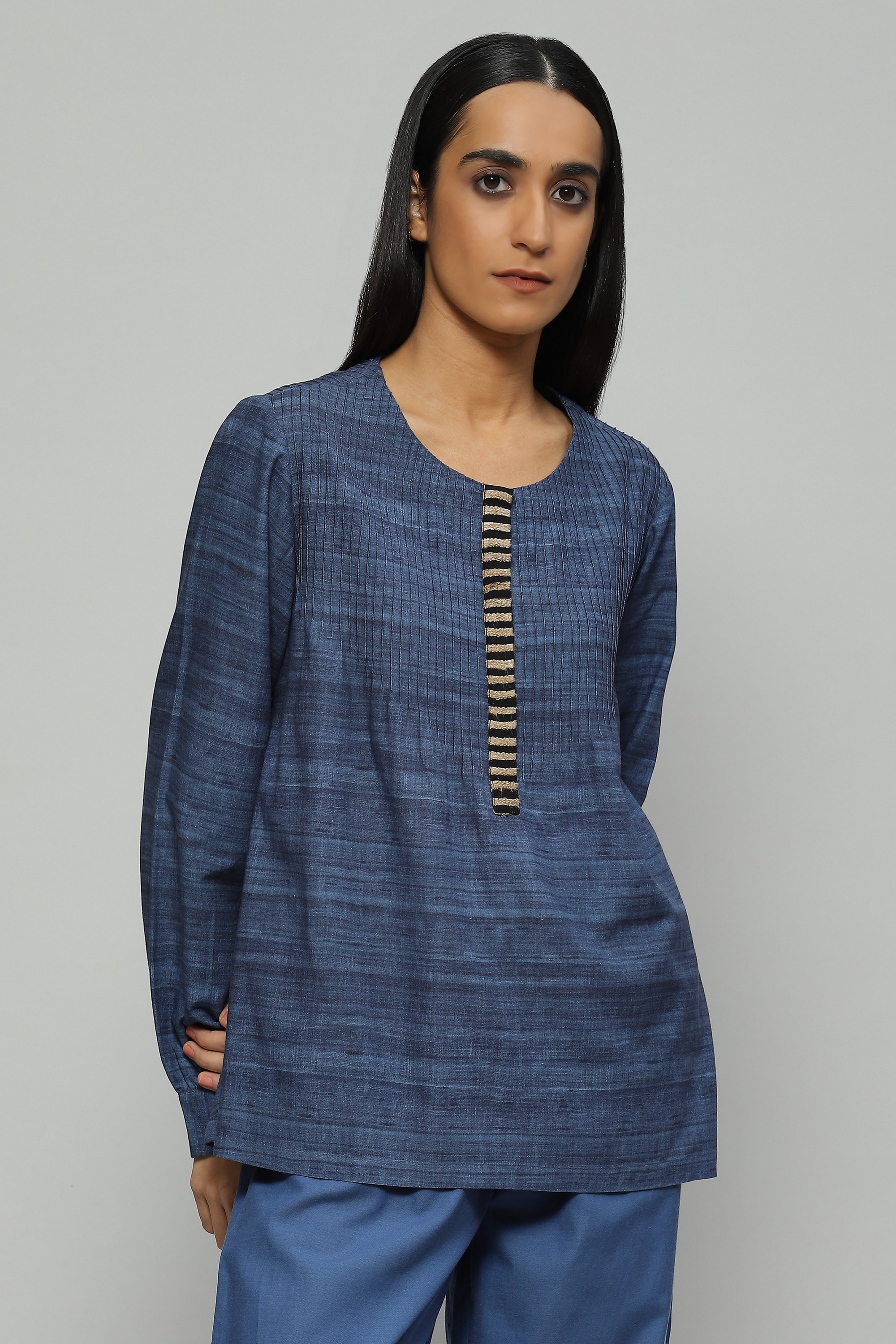 A light-weight blouse in a soothing shade of cornflower is embellished with tussar yarn embroidery It features engineered pin tucks and a a trompe l'oeil effect of wild tussar fabric printed onto a viscose cotton blend, your fail-safe piece while on the go