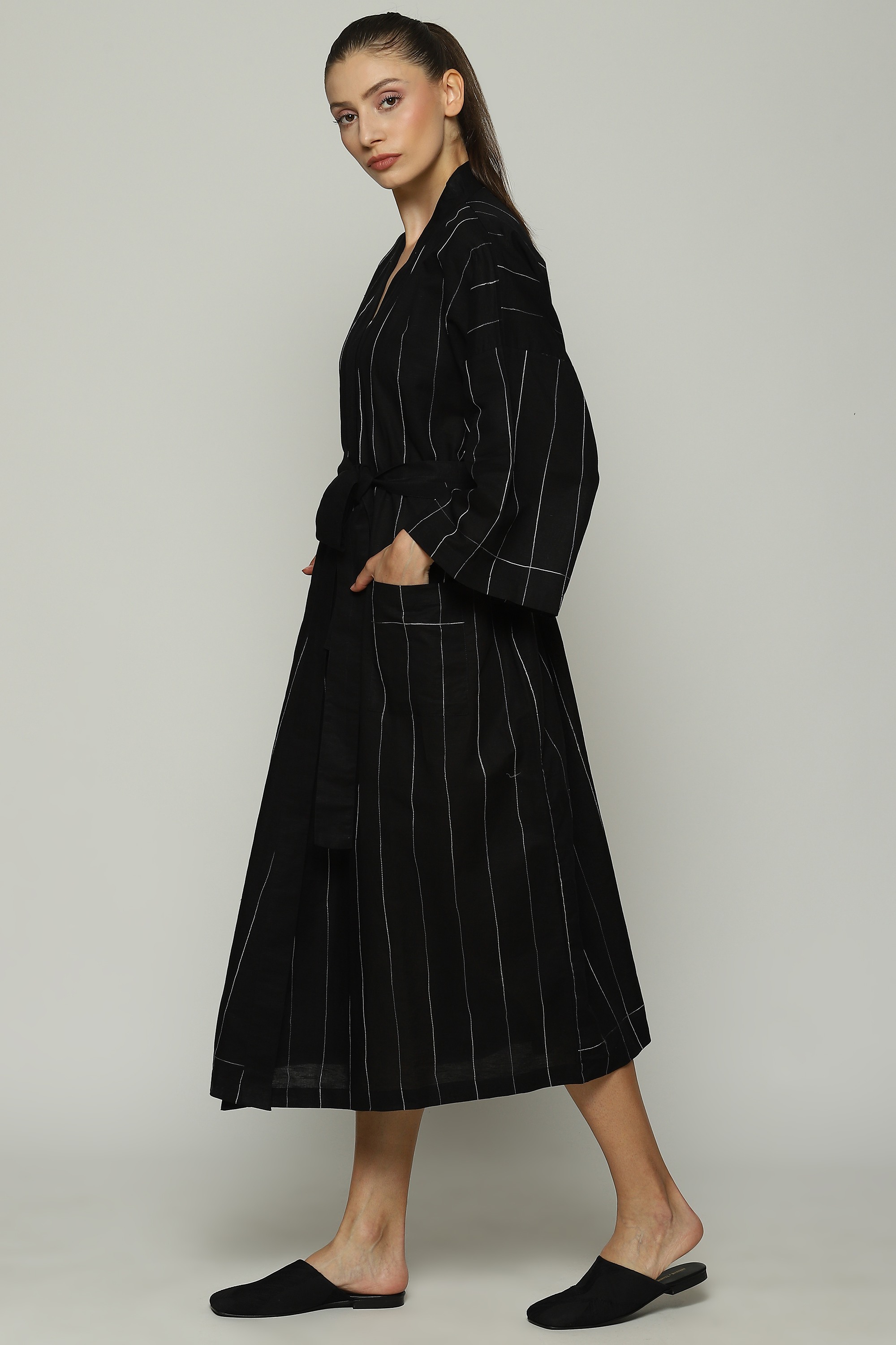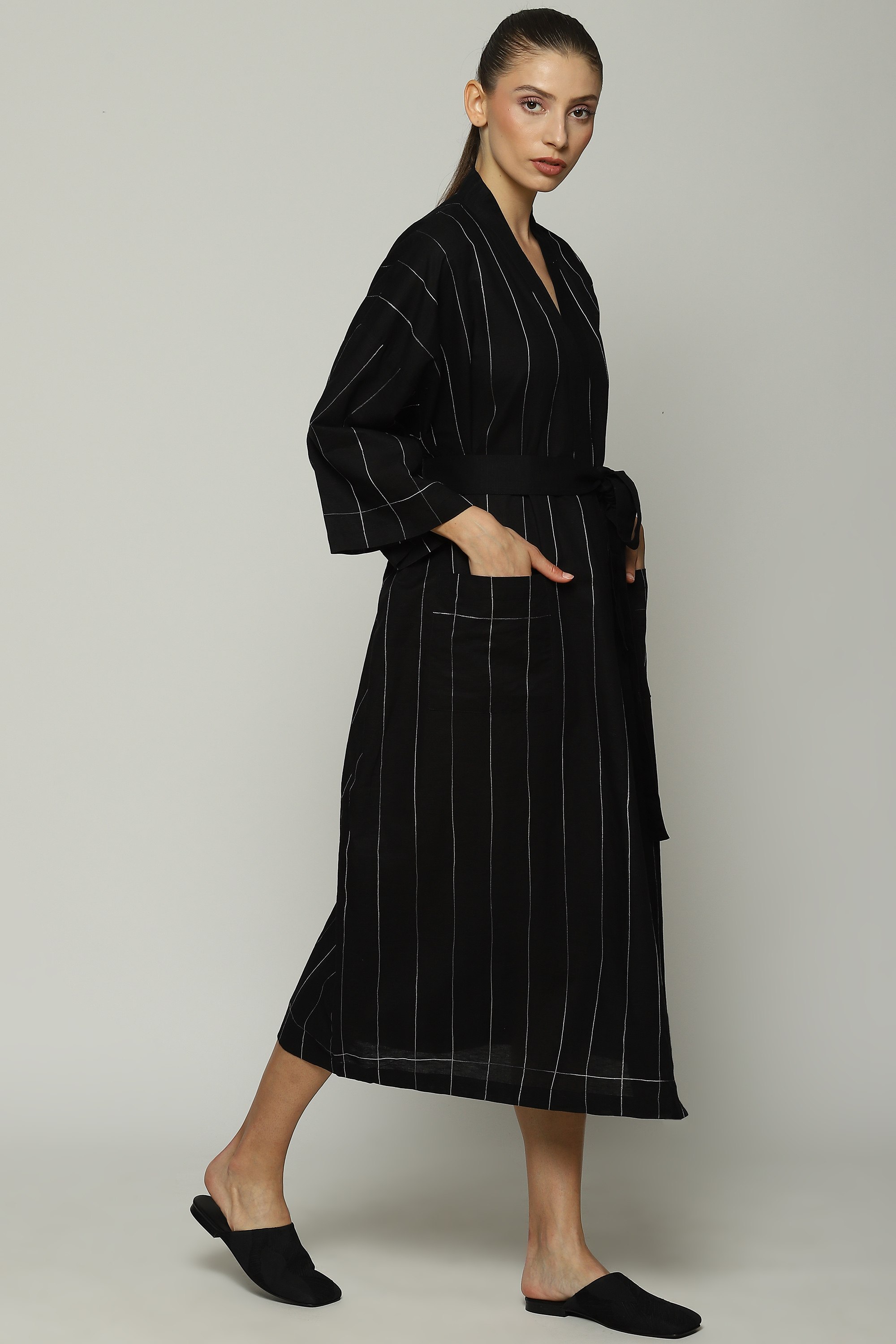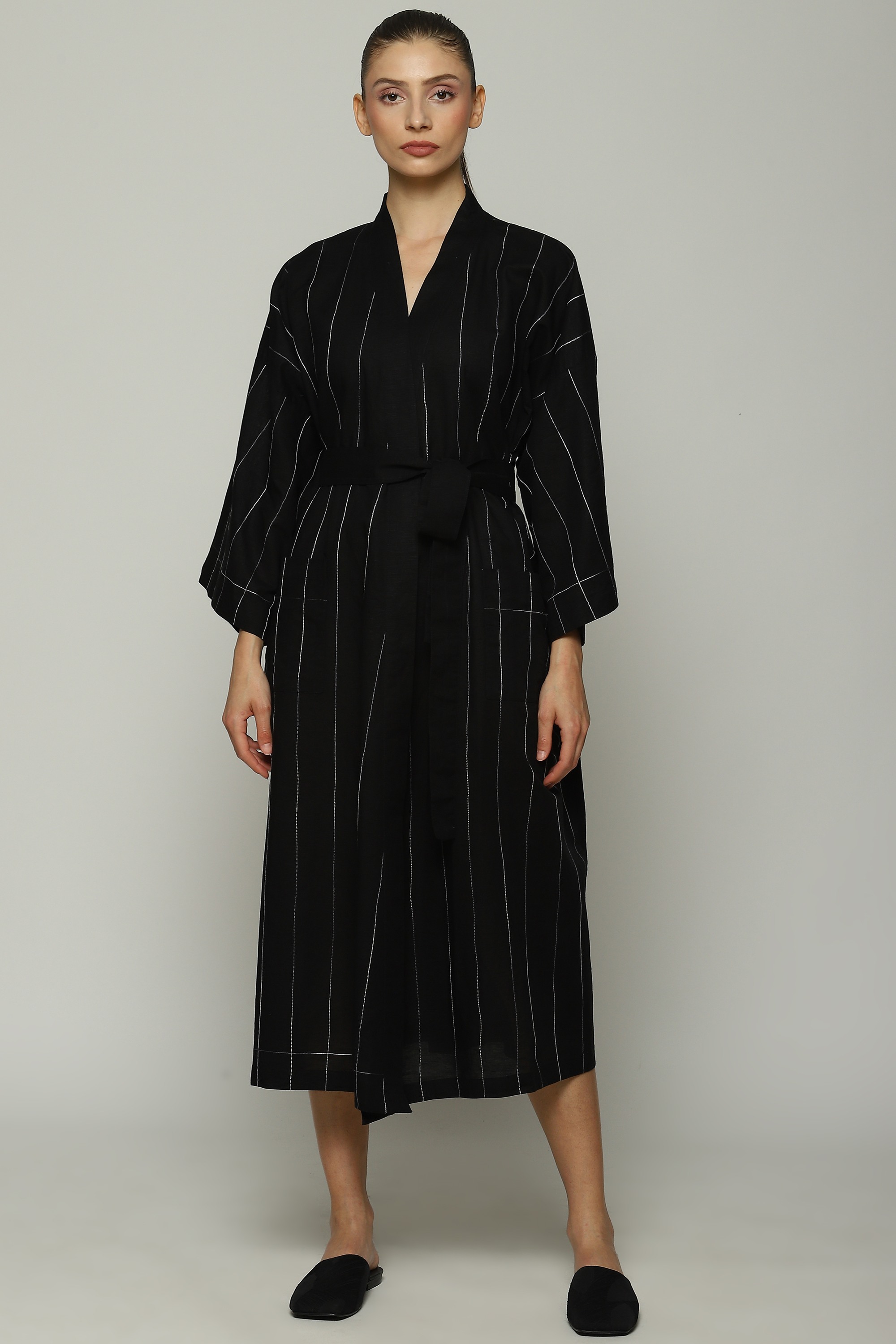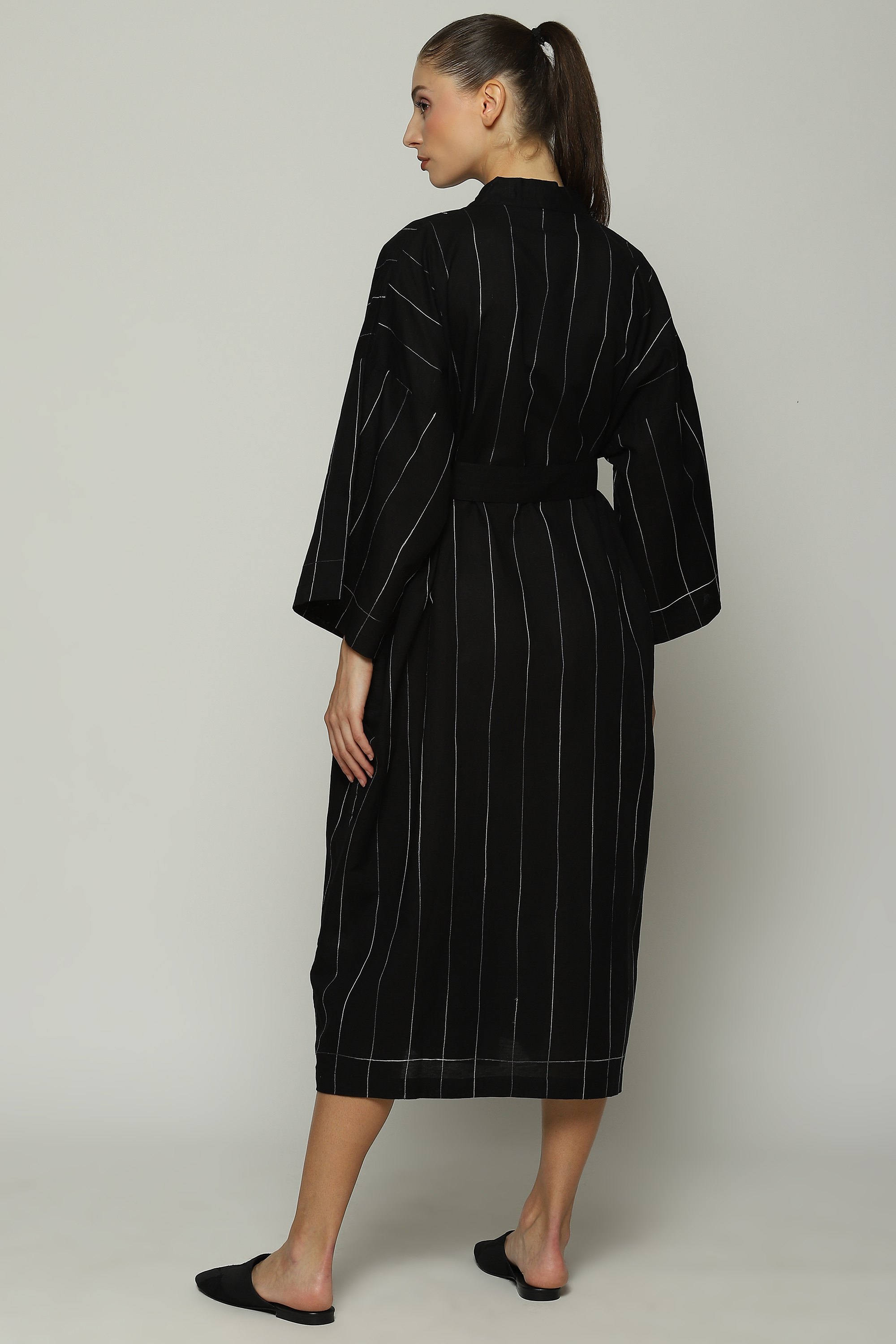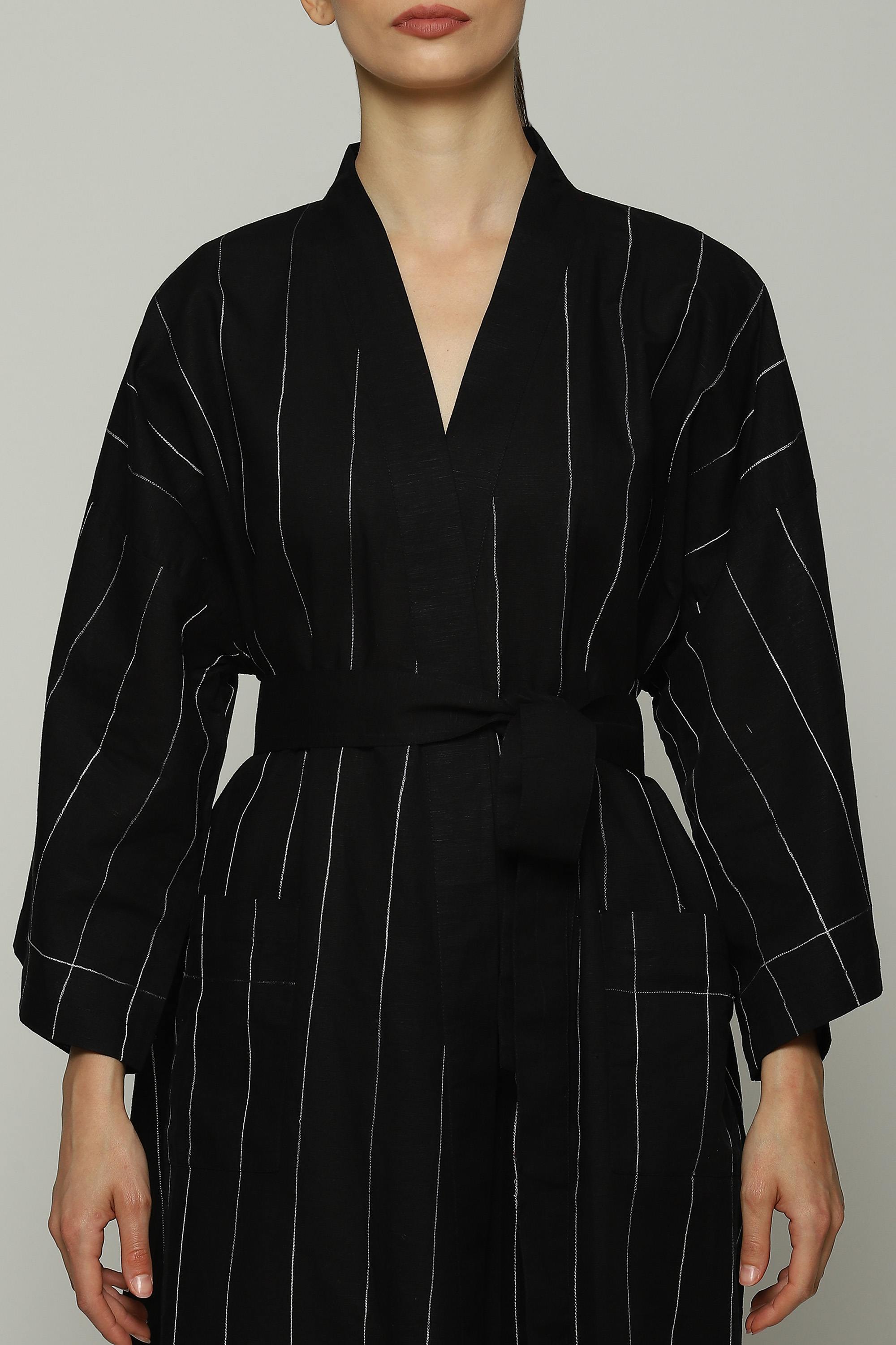 Black cotton/linen kimono with contrast aari embroidery