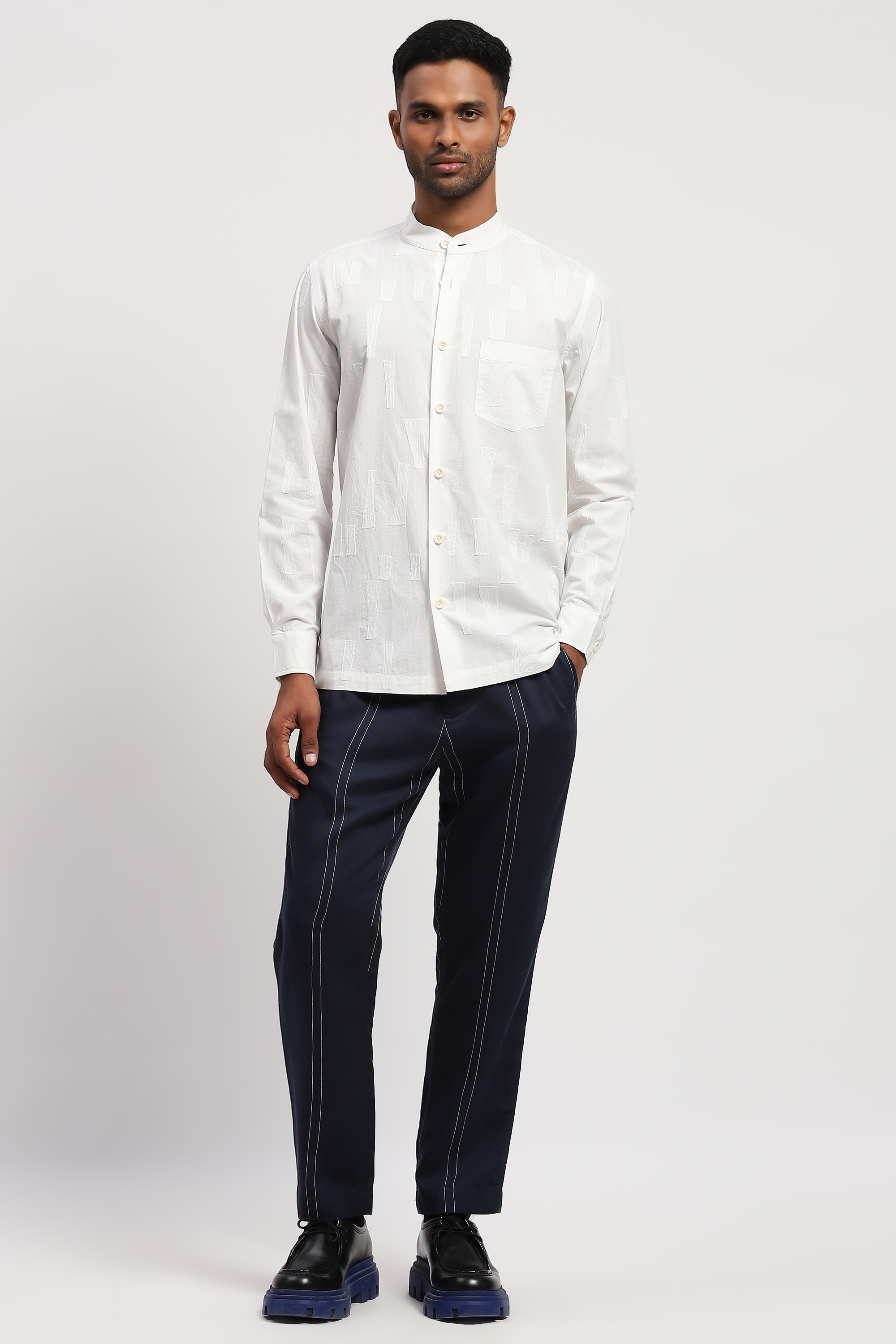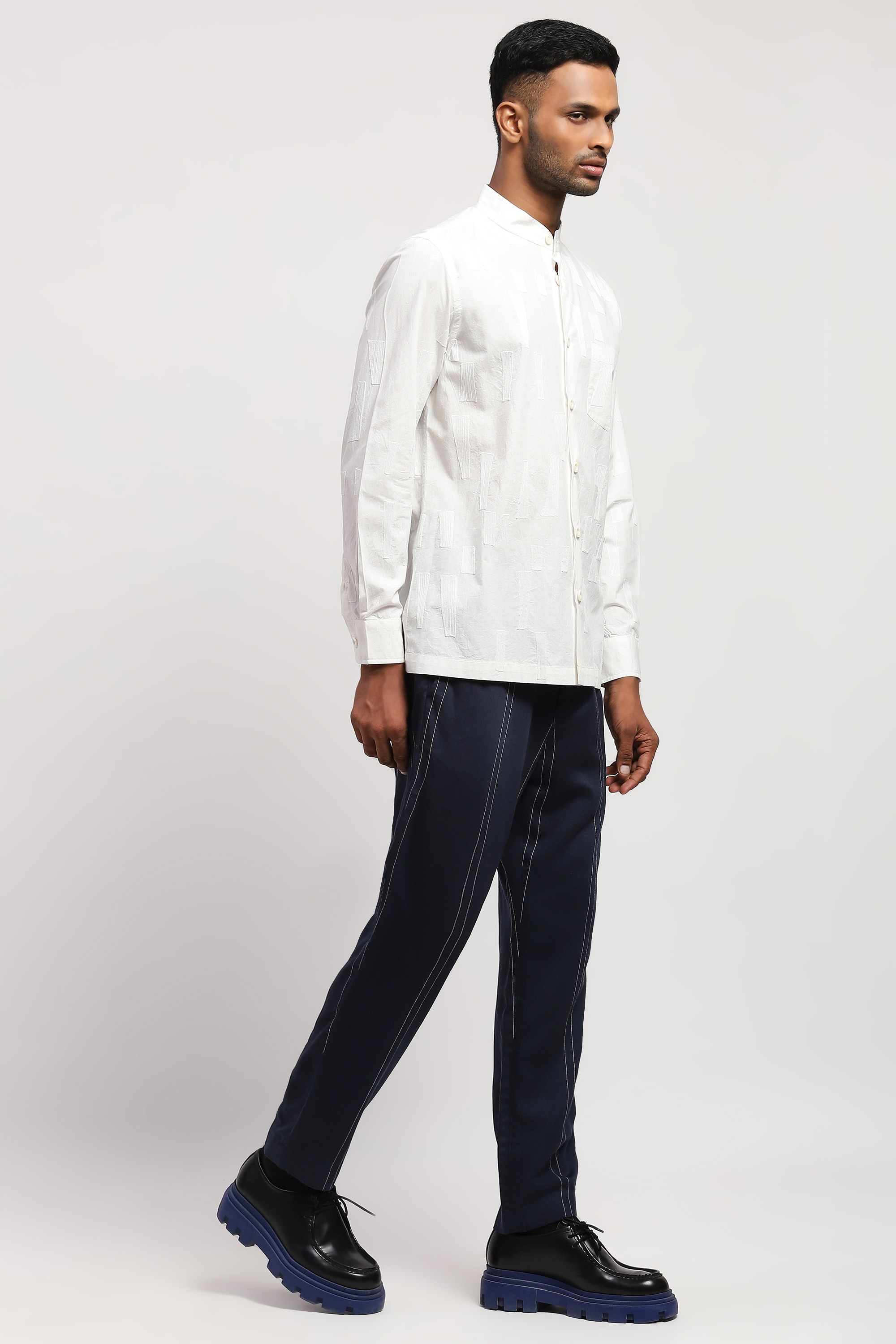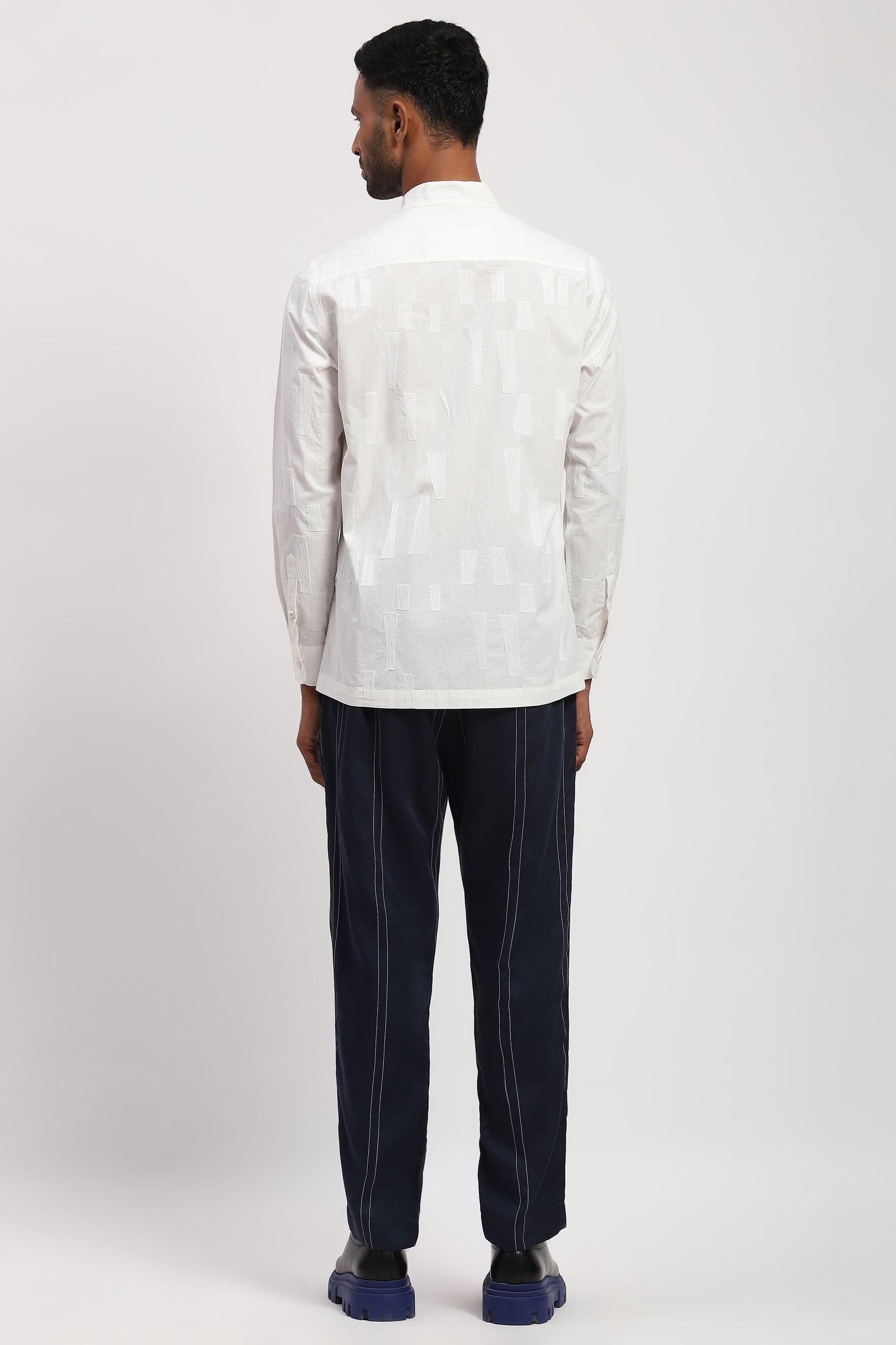 Crafted in 60s poplin, this ivory shirt is crewel embroidered with tonal geometric patterns.