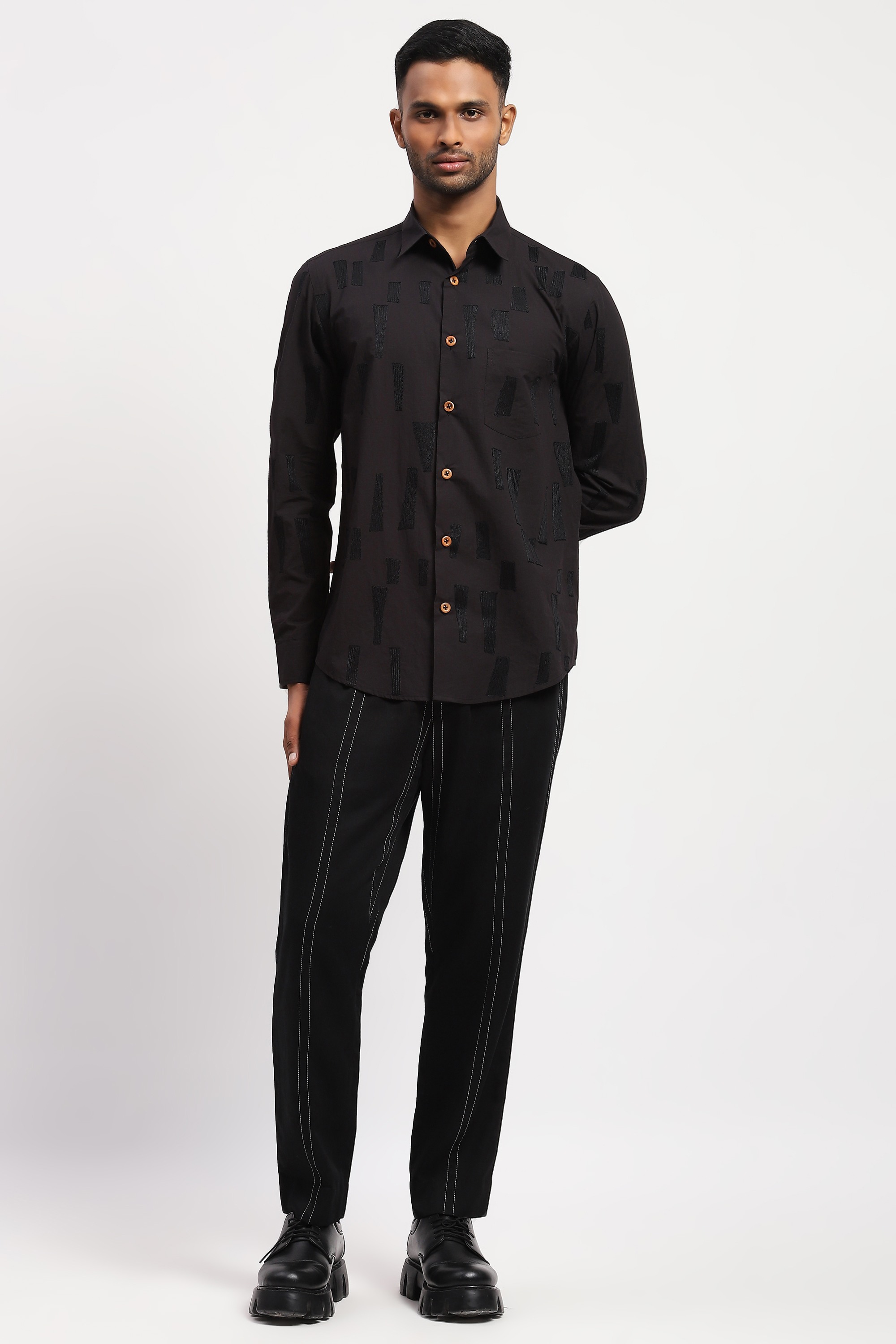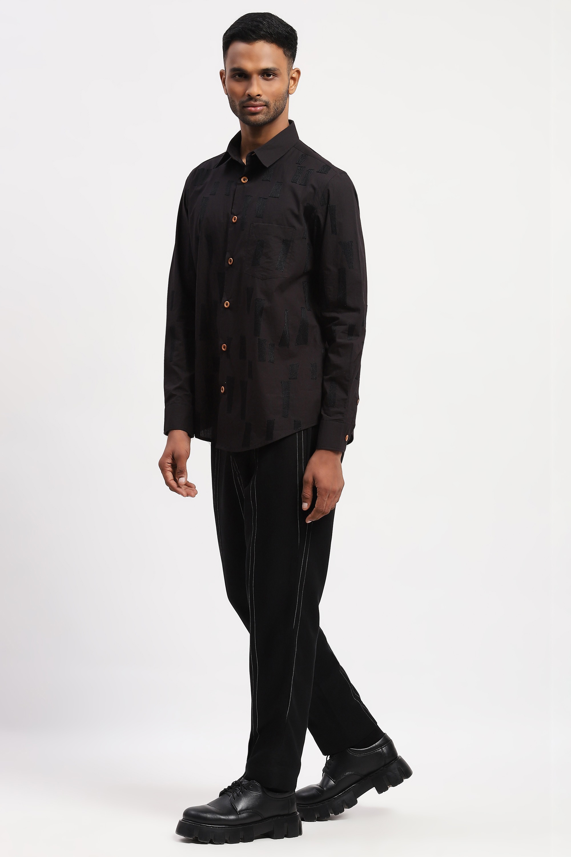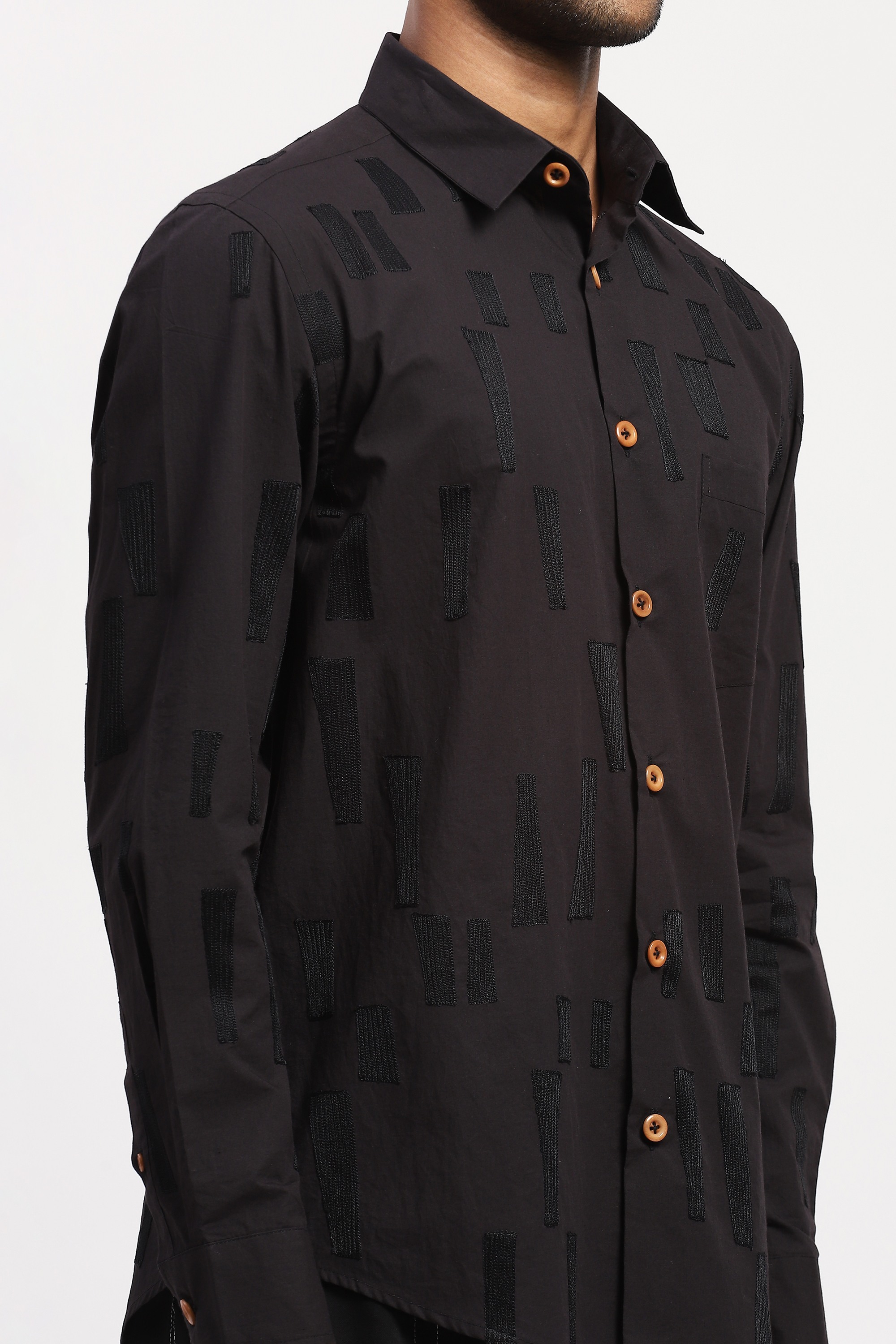Crafted in 60s poplin, this black shirt is crewel embroidered with tonal geometric patterns.