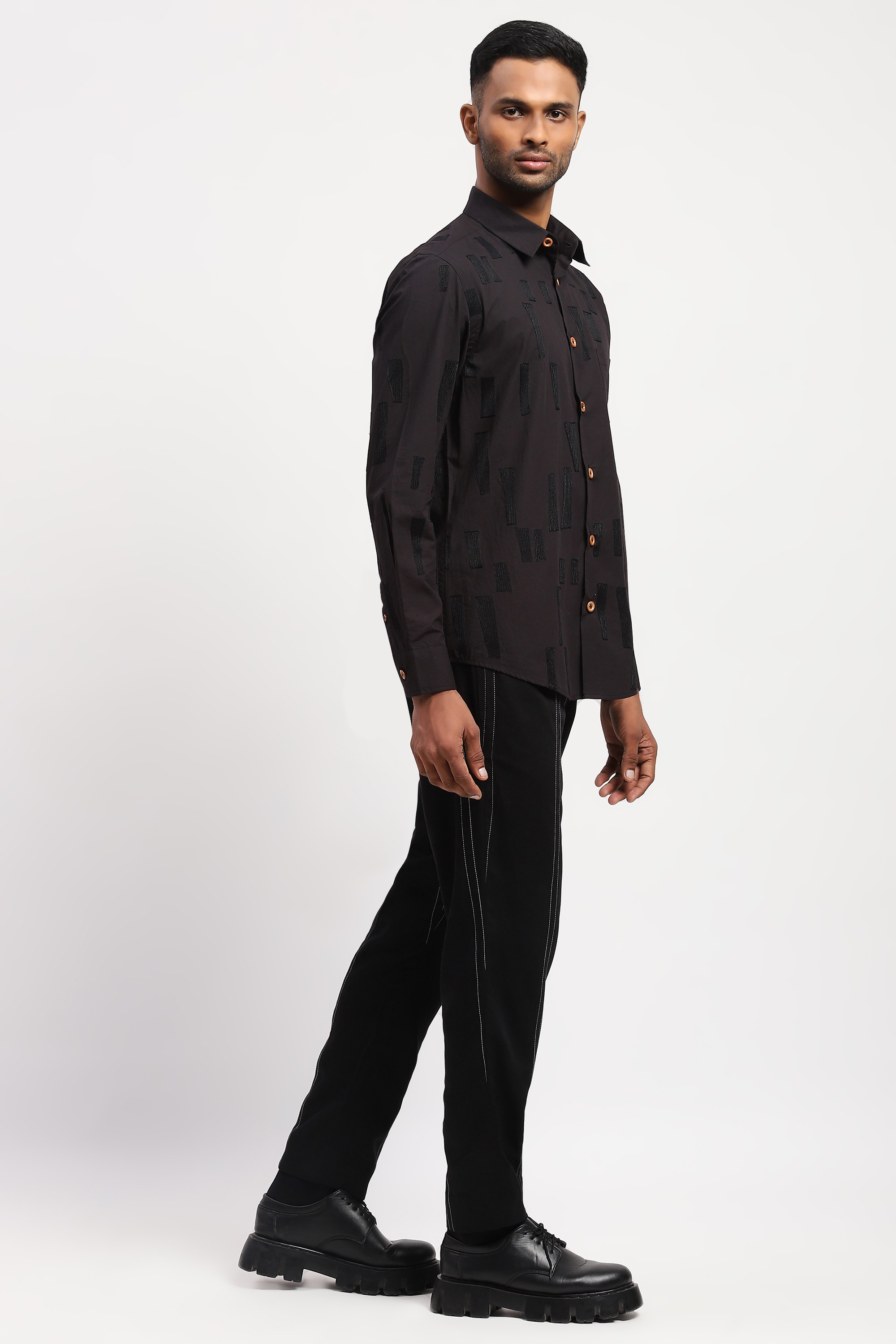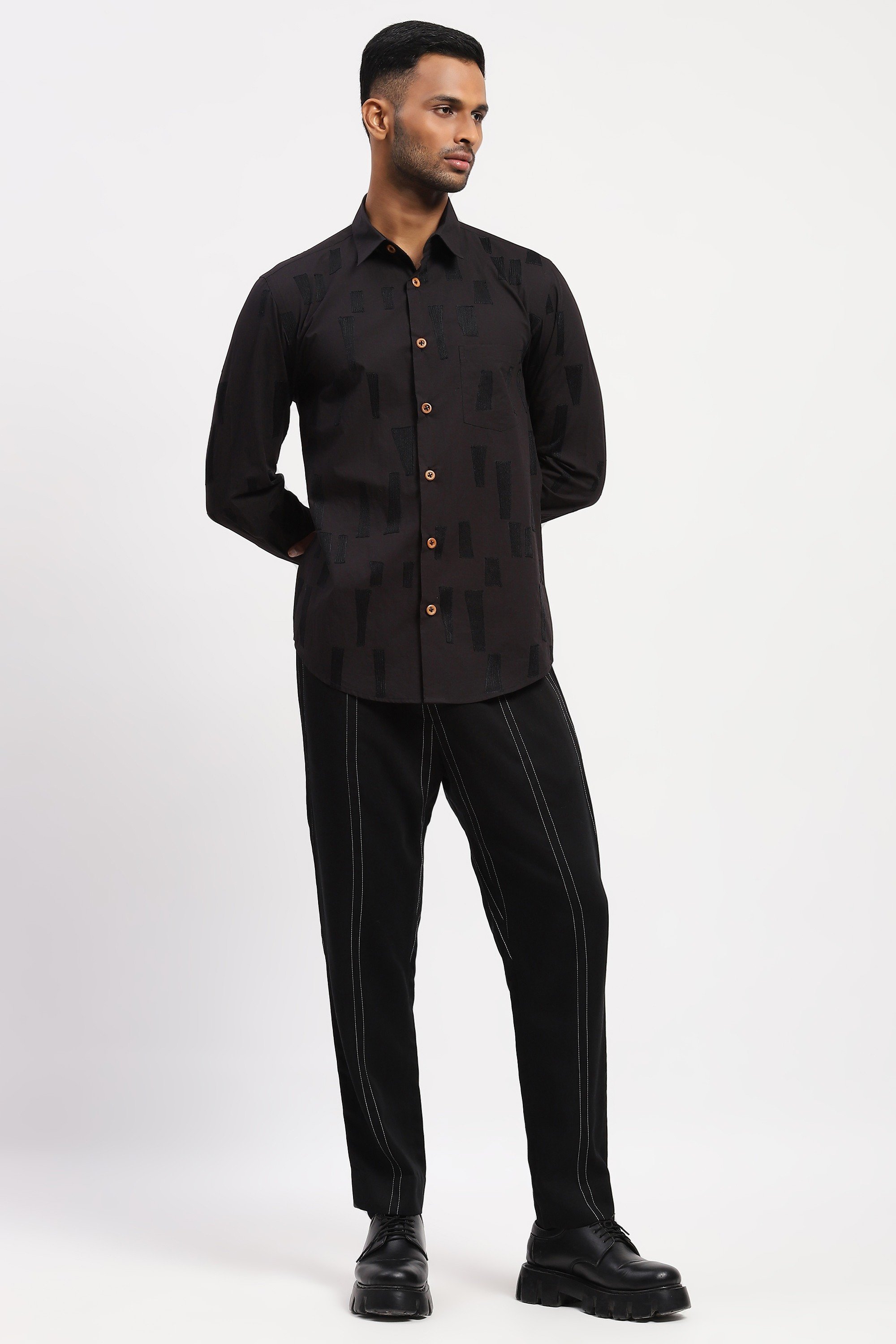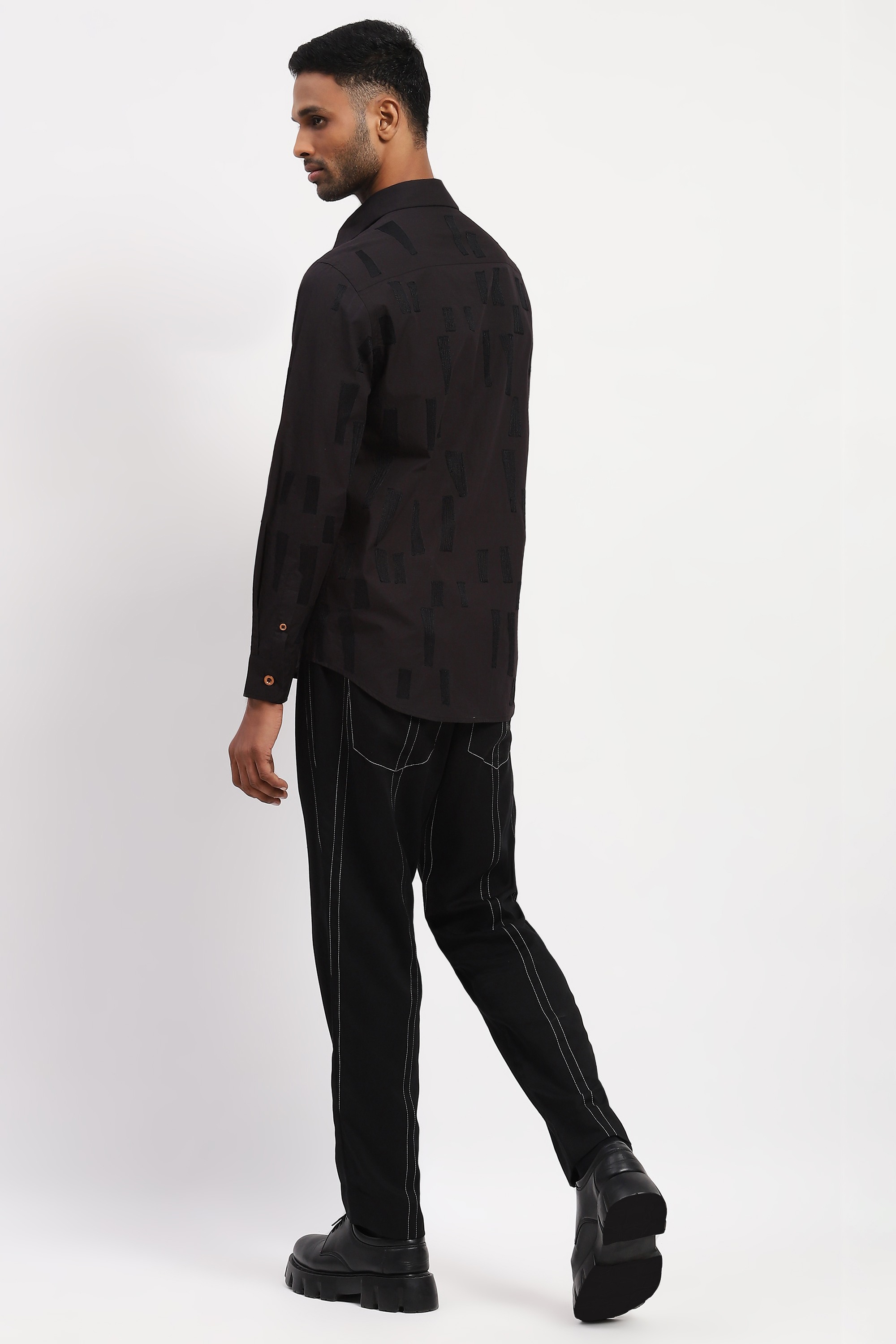 Crafted in 60s poplin, this black shirt is crewel embroidered with tonal geometric patterns.
