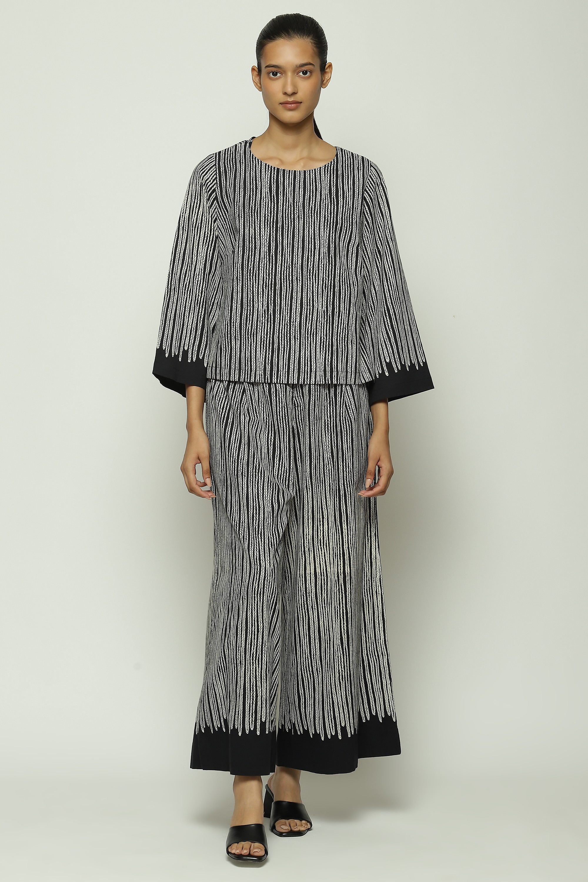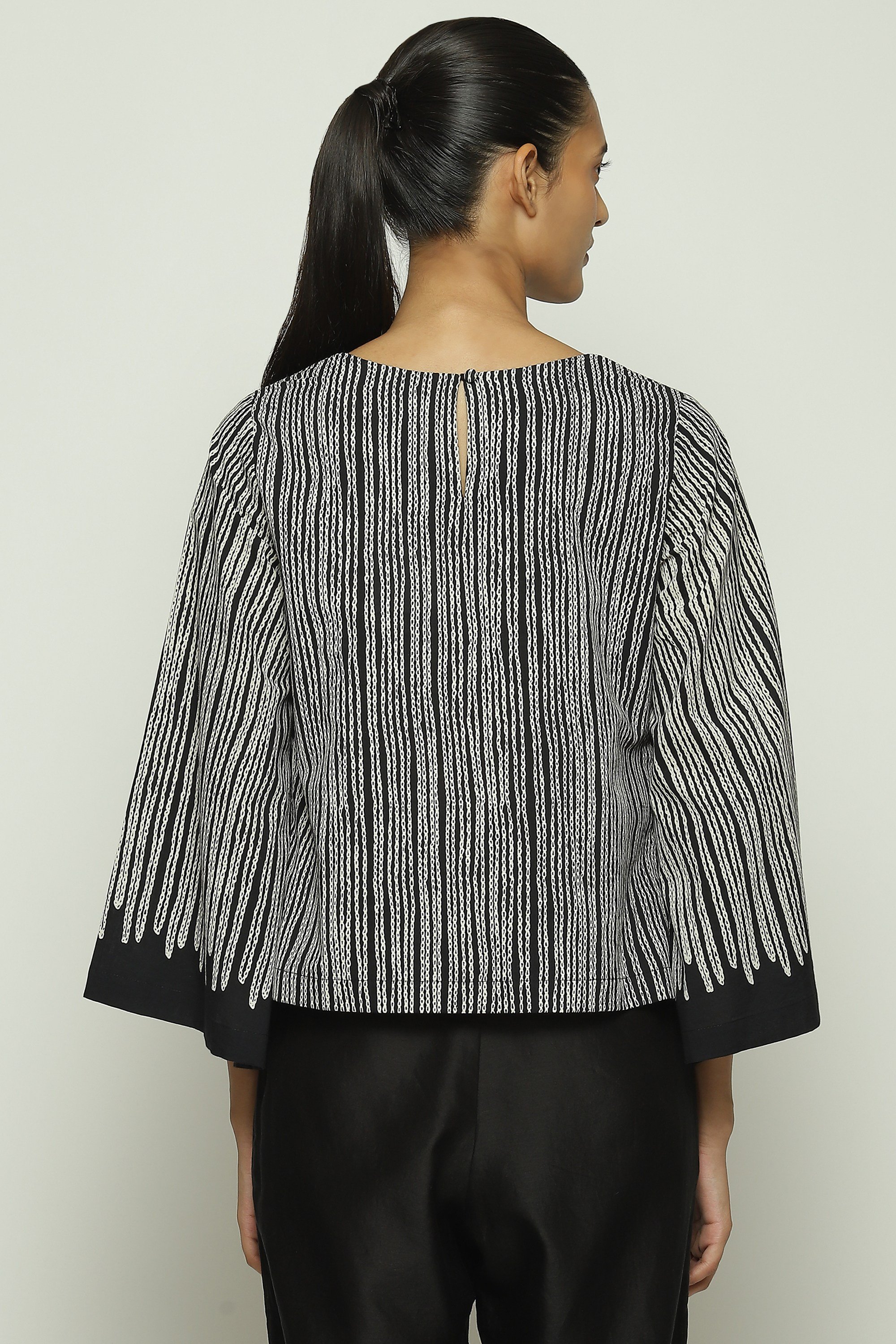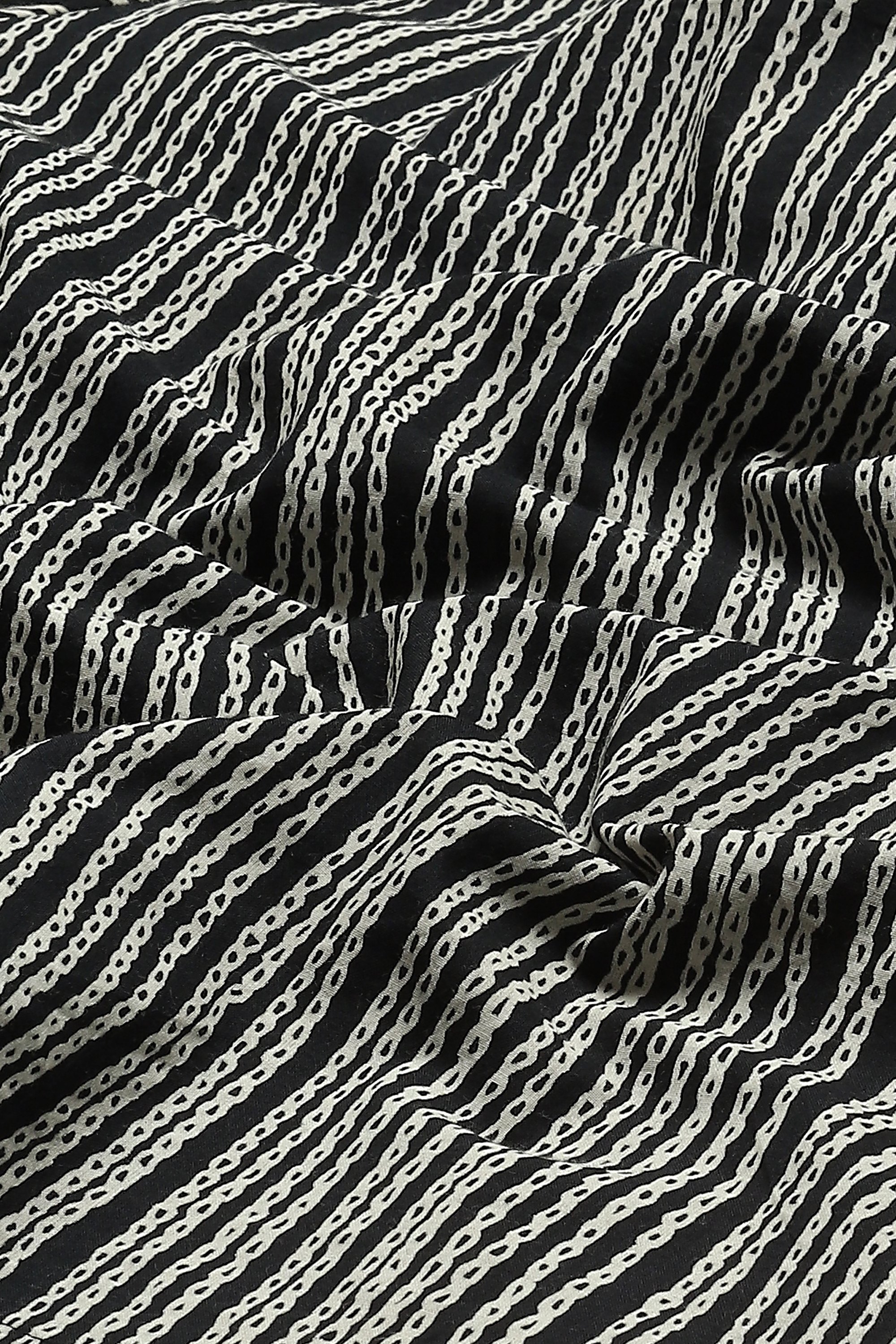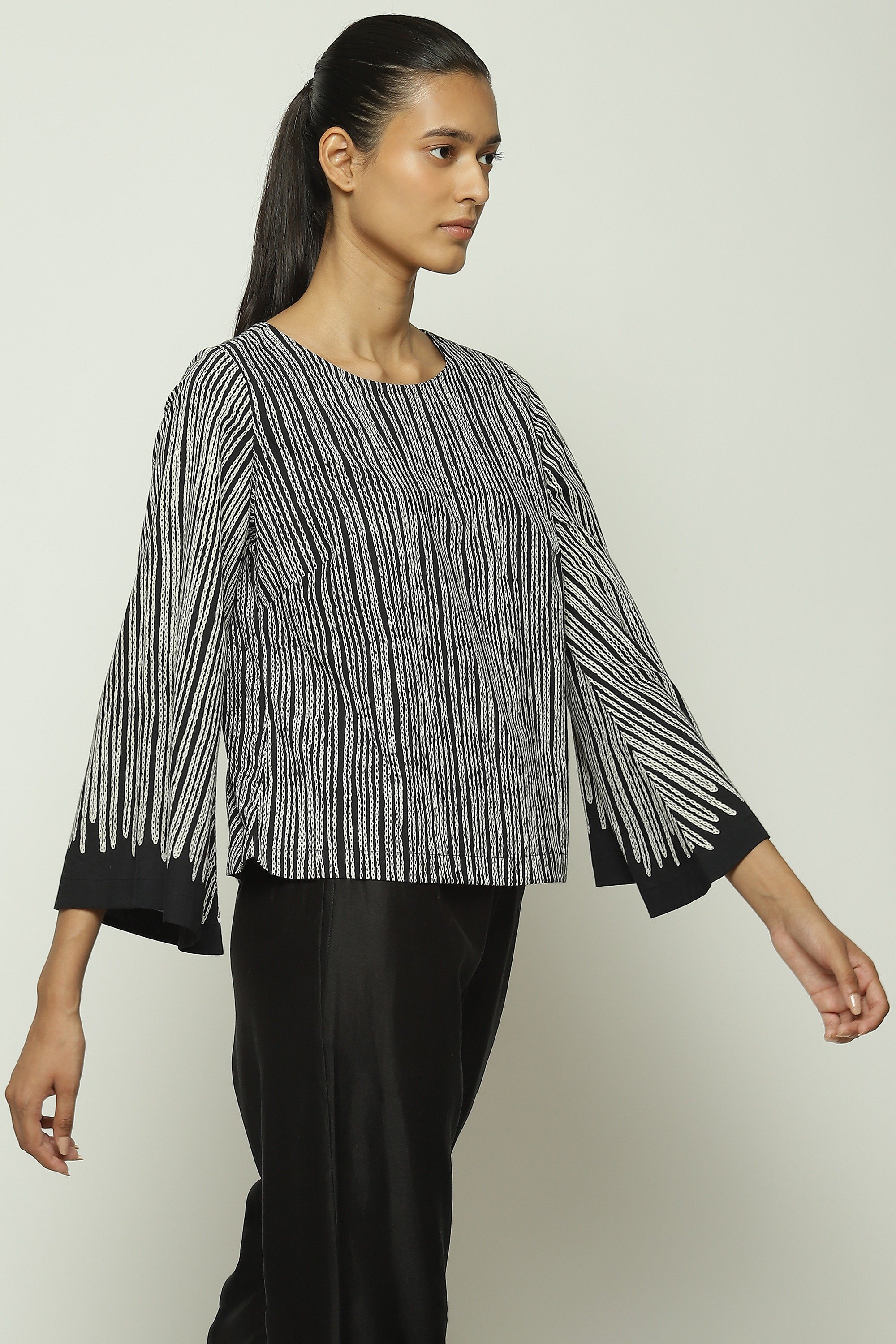 Body Language — from Abraham & Thakore — explores the meaning of communication in an increasingly digitized world. Crafted from voile, this creation is screen printed with Trompe L'oeil crewel stitches.