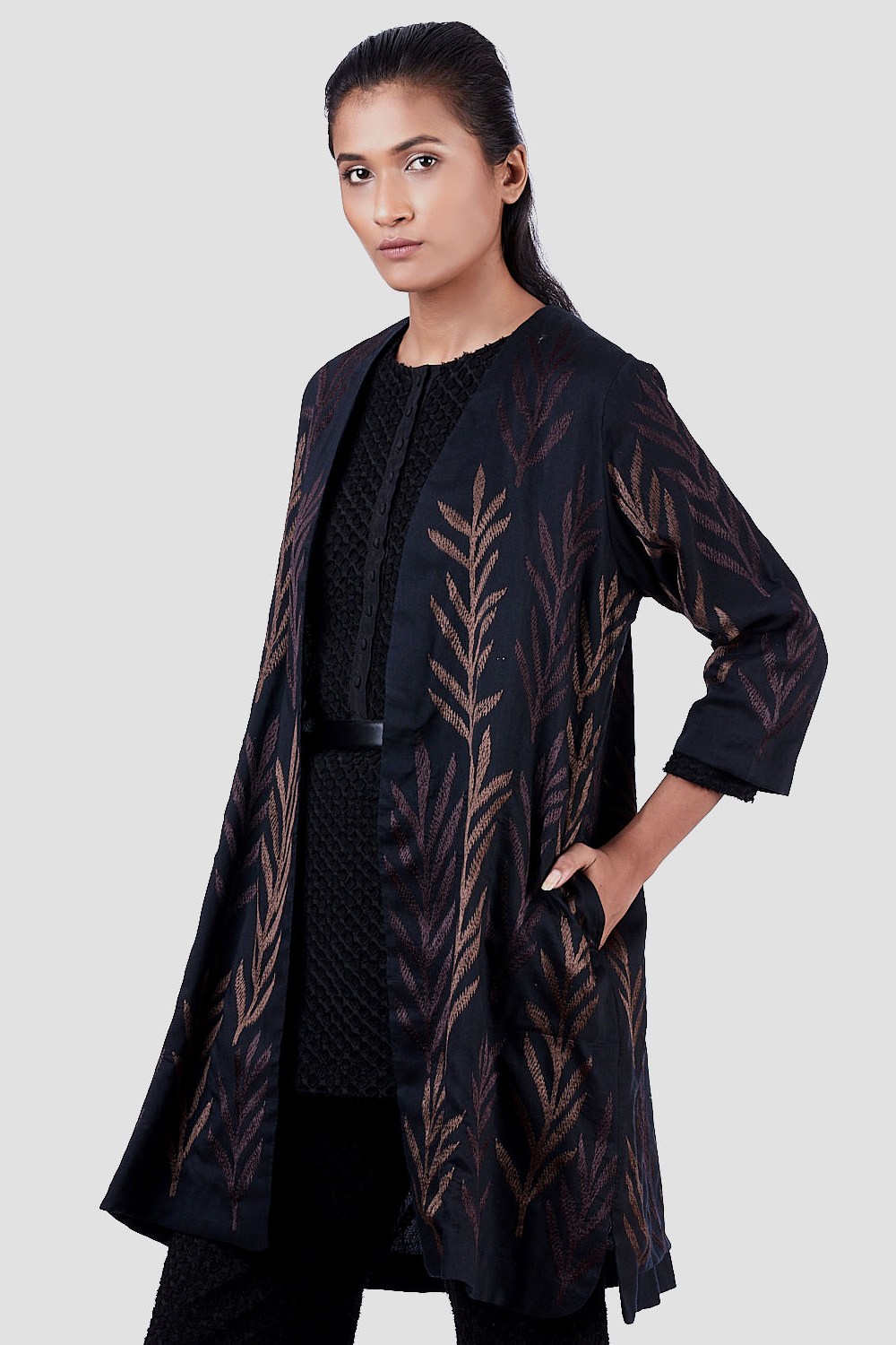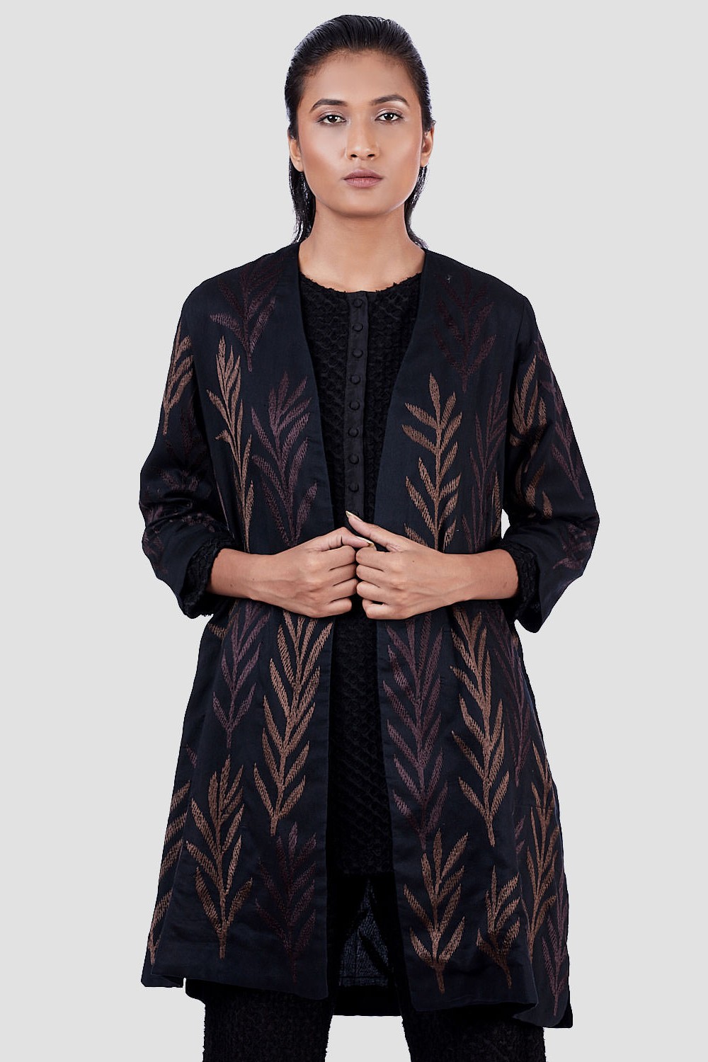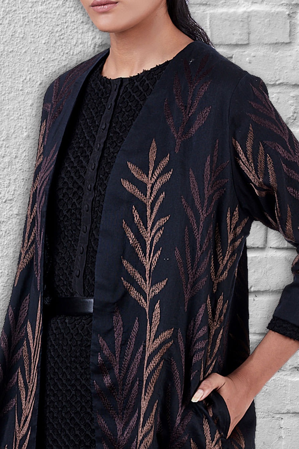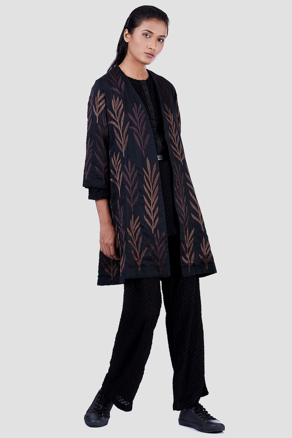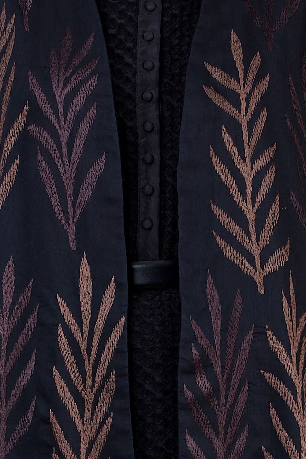 Regular Fit Kimono Jacket. Features Allover With Leaf Embroidery. Garments Are Made From Fabric That Is Washed And Pre-Shrunk To Give A Superior Hand.