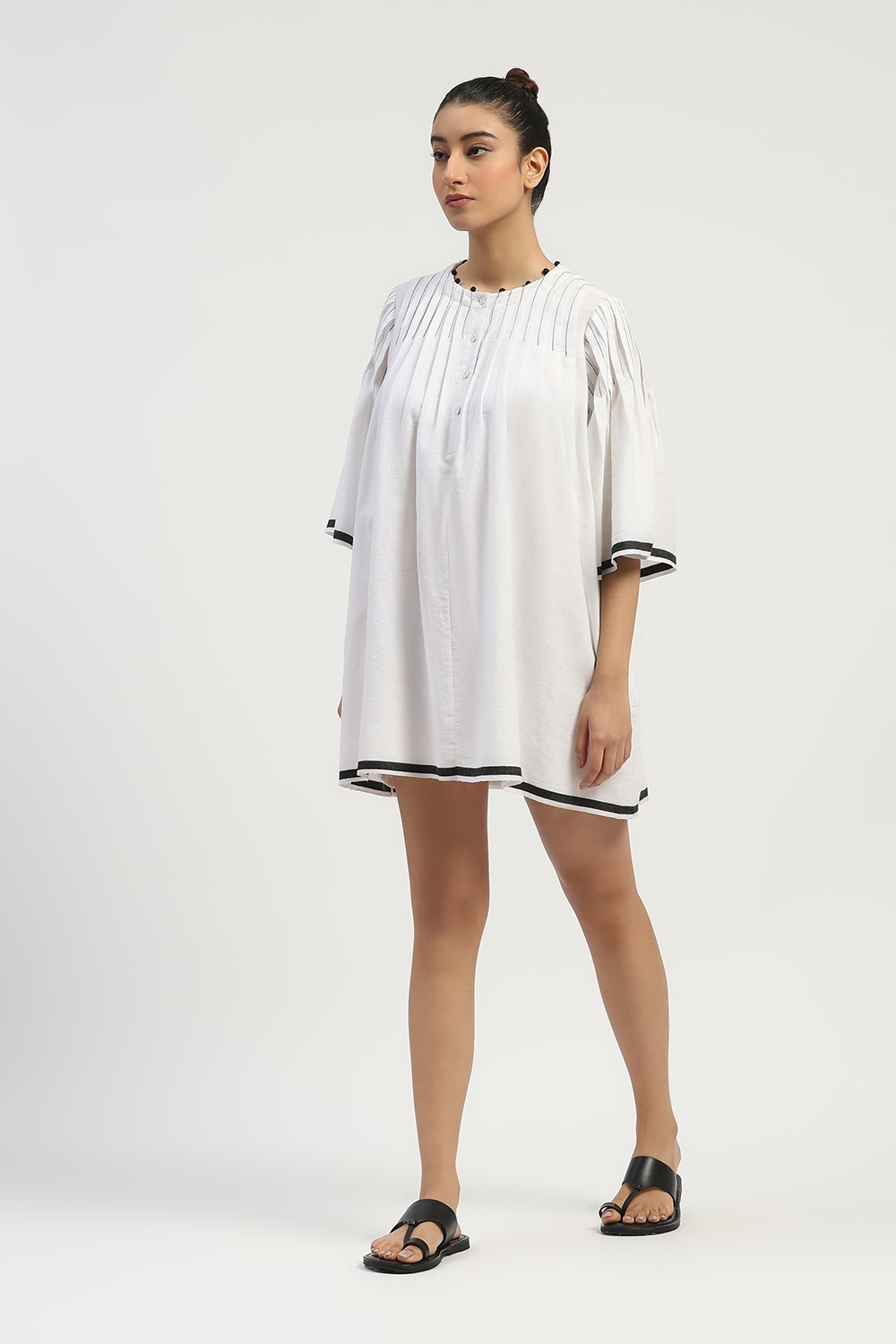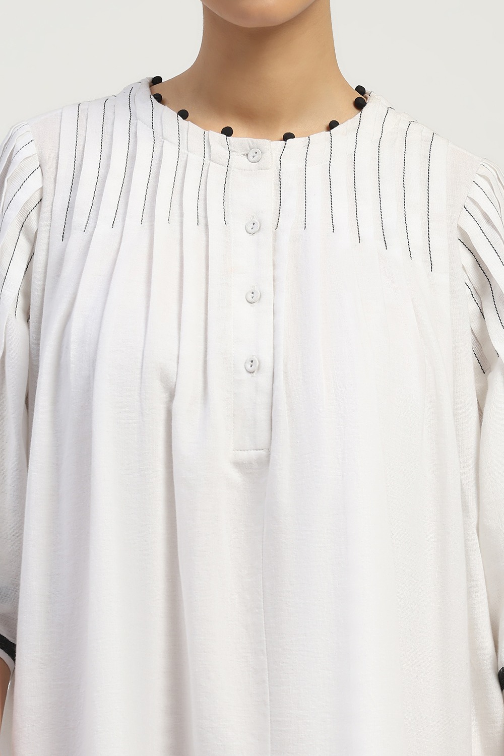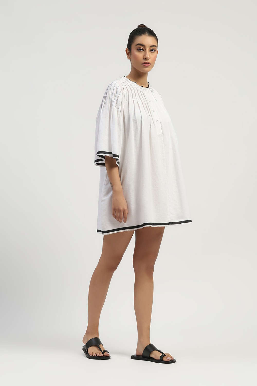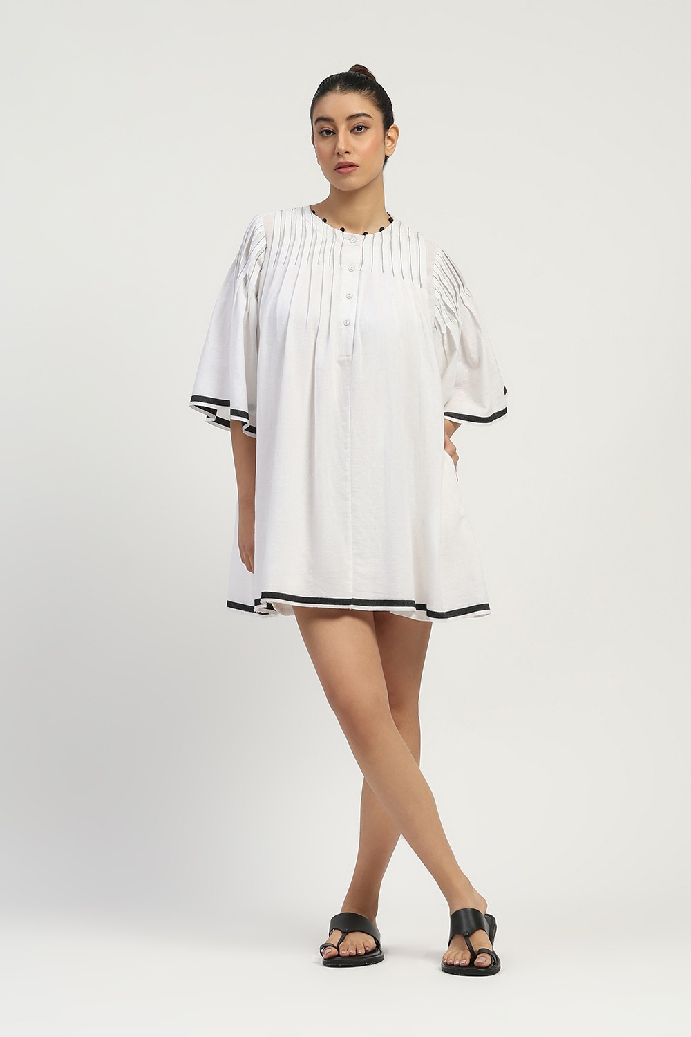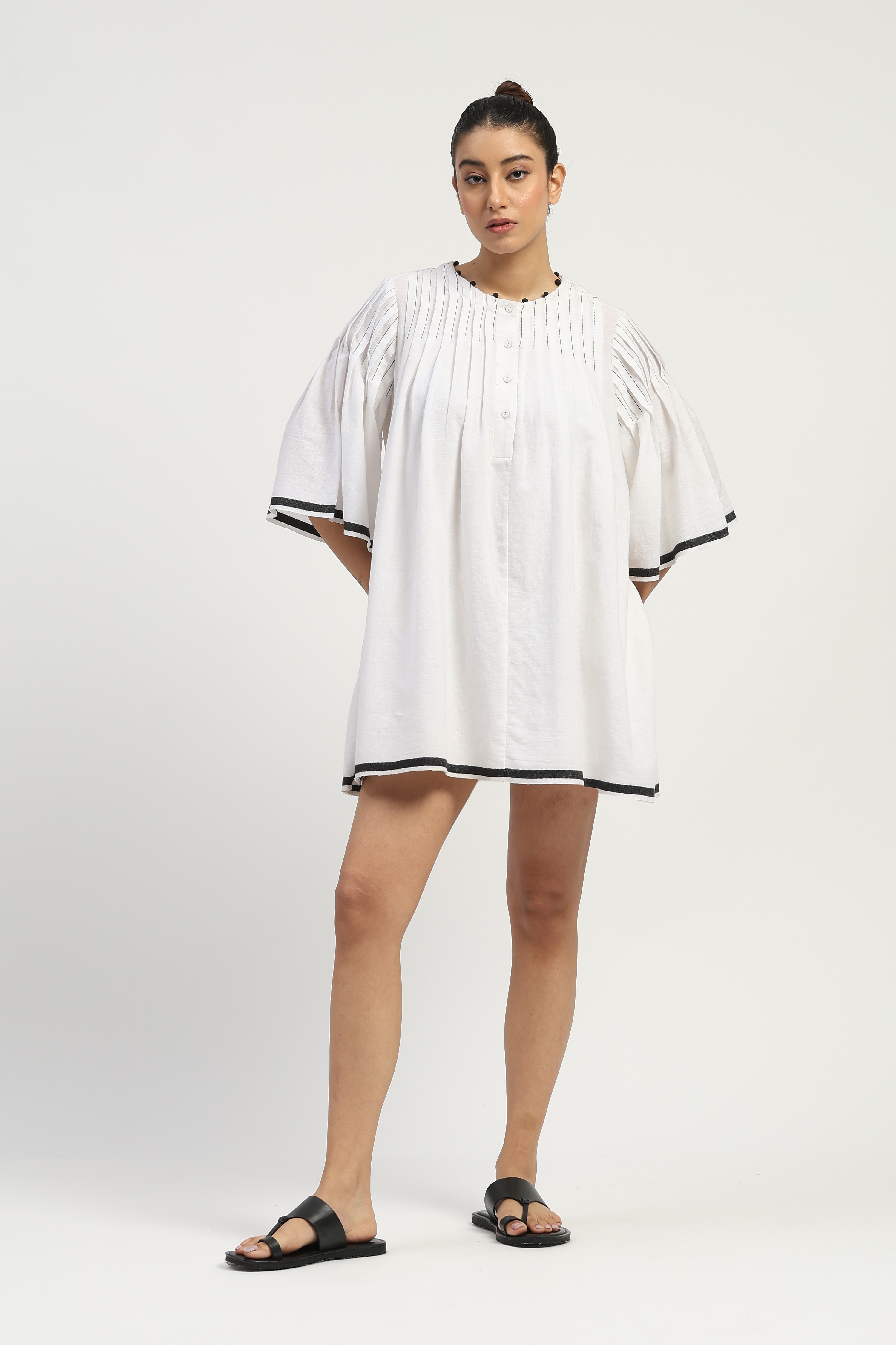 This limited edition piece has been made using a specially woven pure cotton dhoti border fabric in graphic white & black. Fine release pleats and handmade fabric button details make it ideal for a chic summer look.
