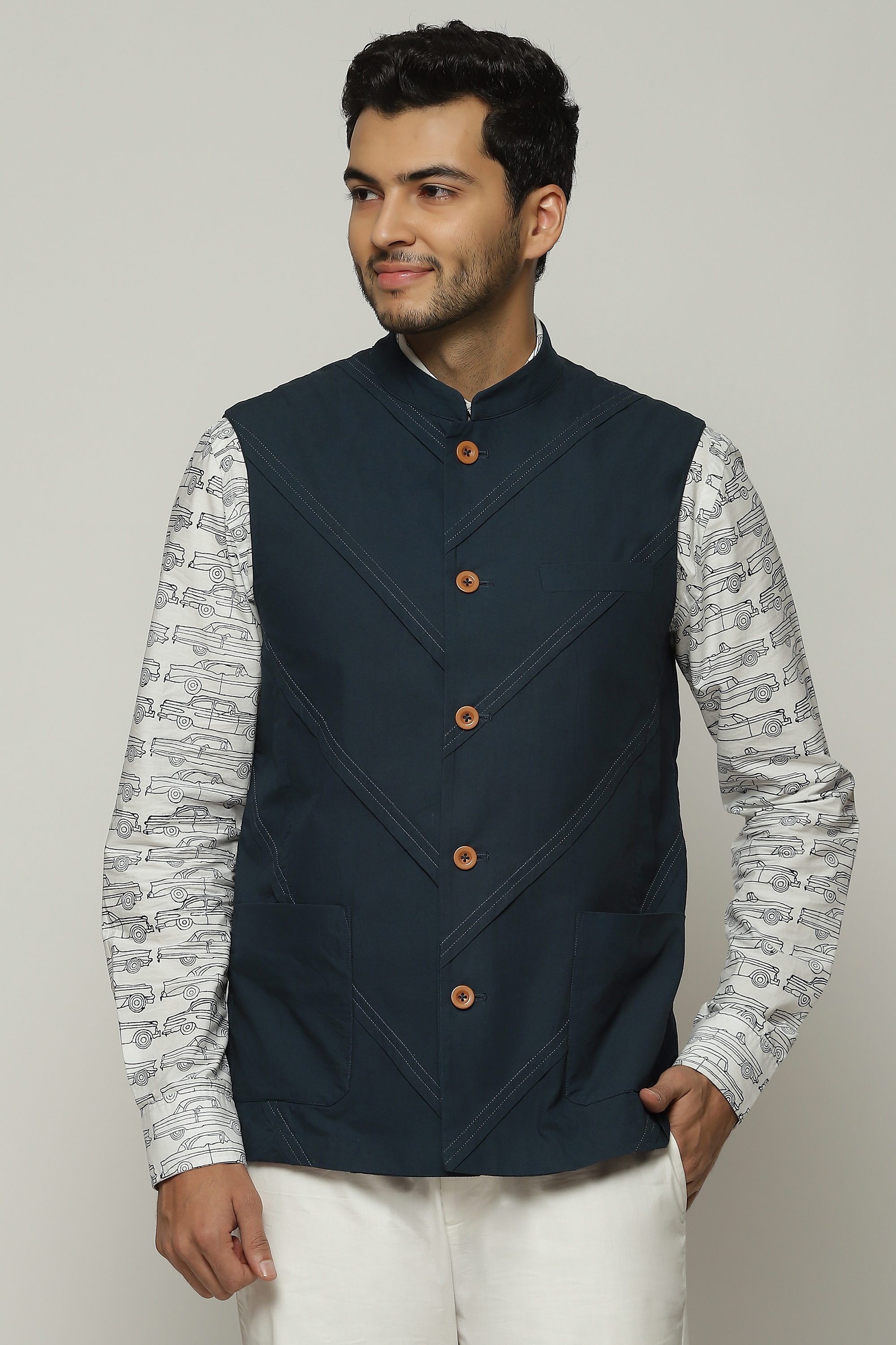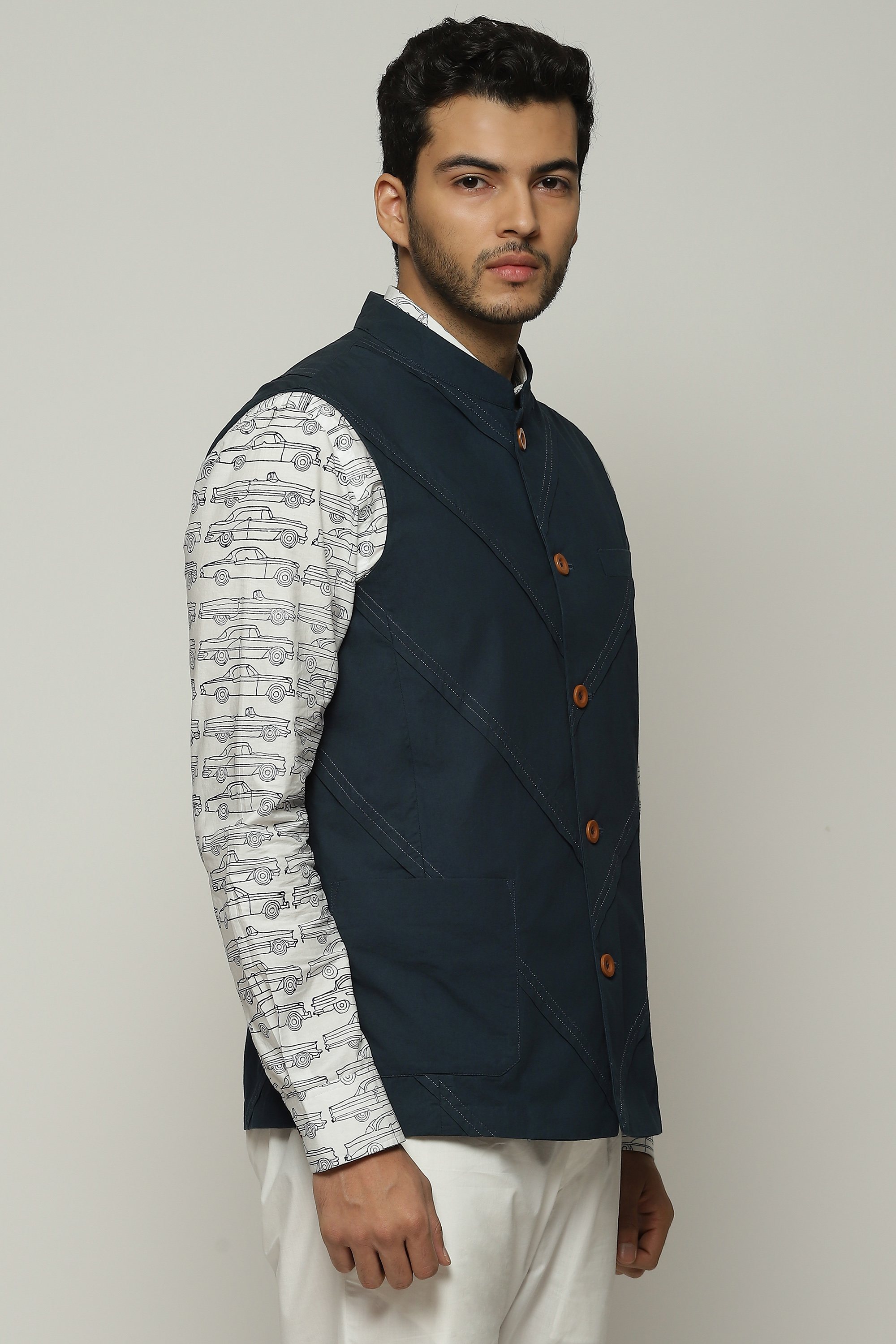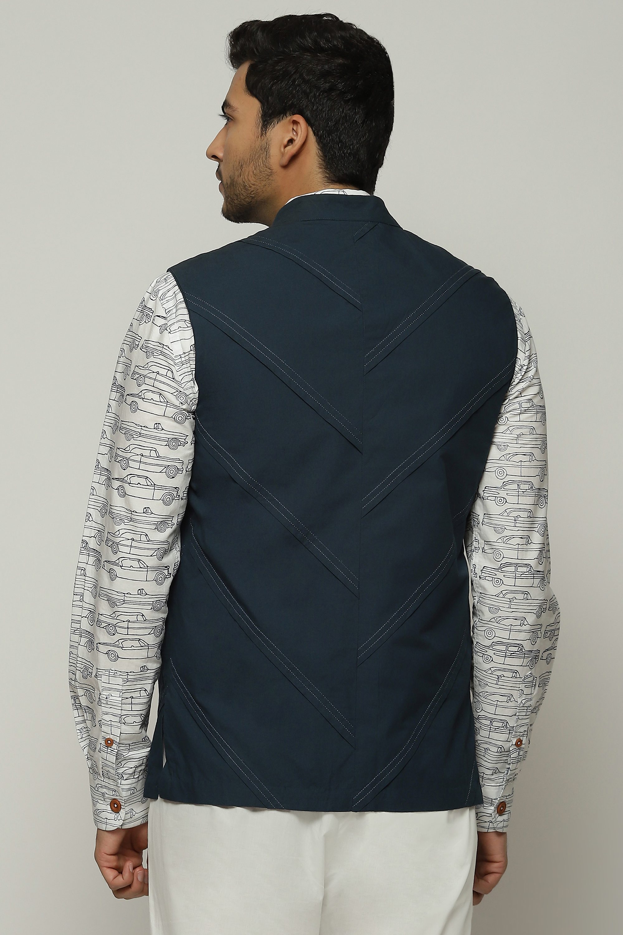 Diagonal pleats line this denim-hued bundi.