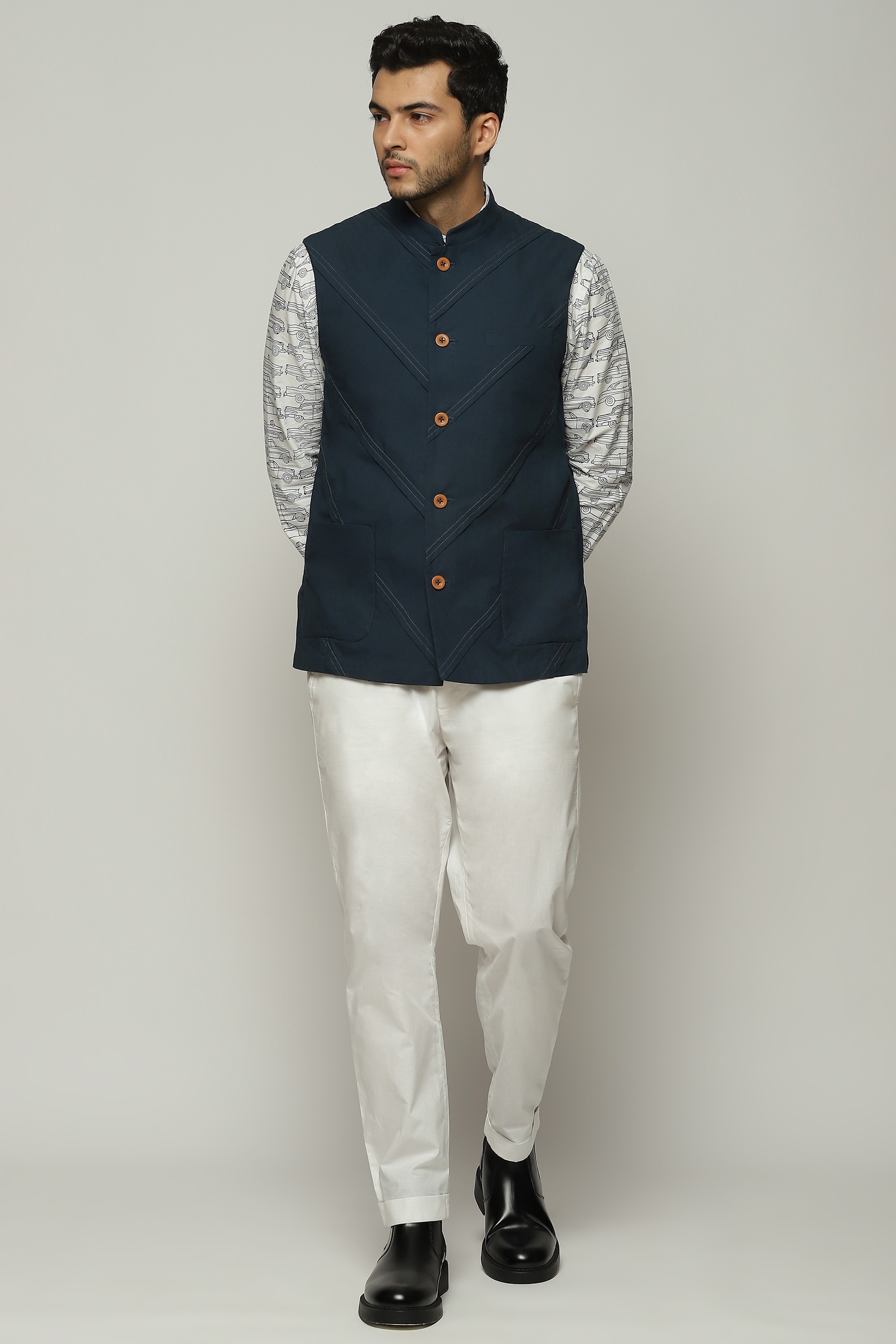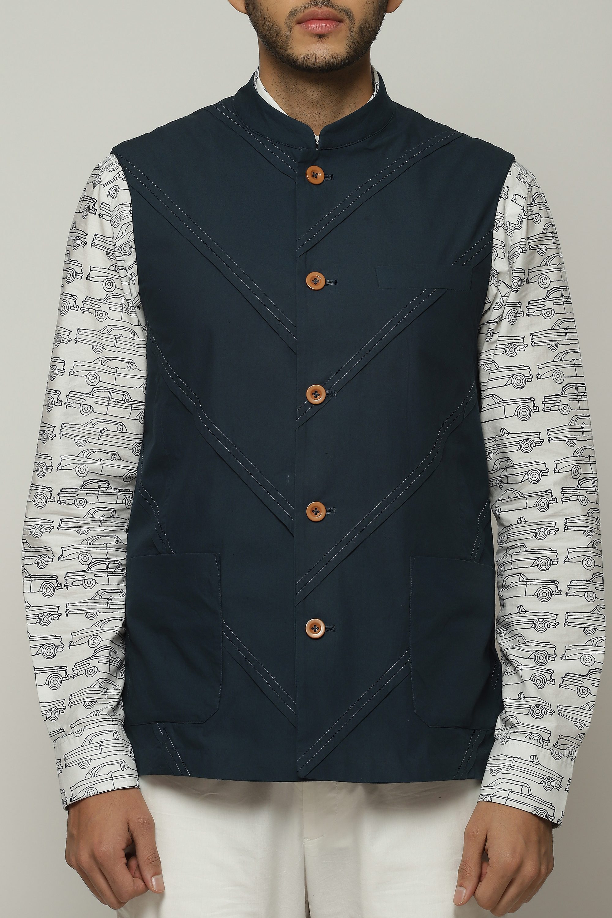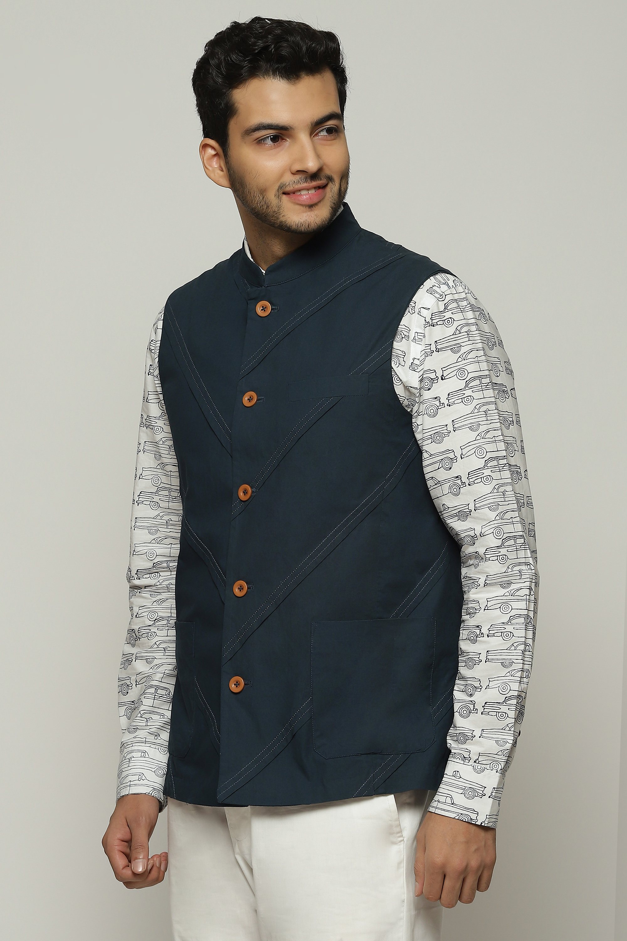 Diagonal pleats line this denim-hued bundi.
