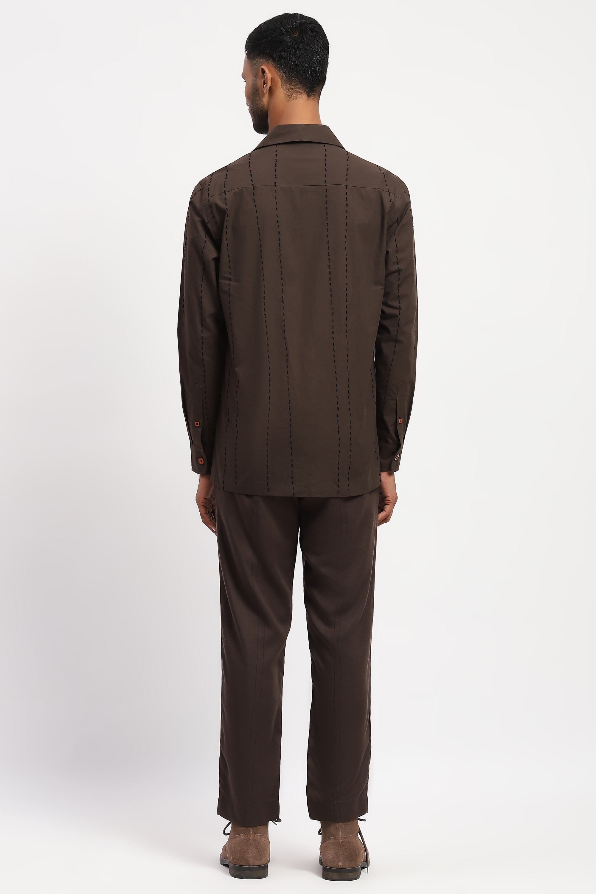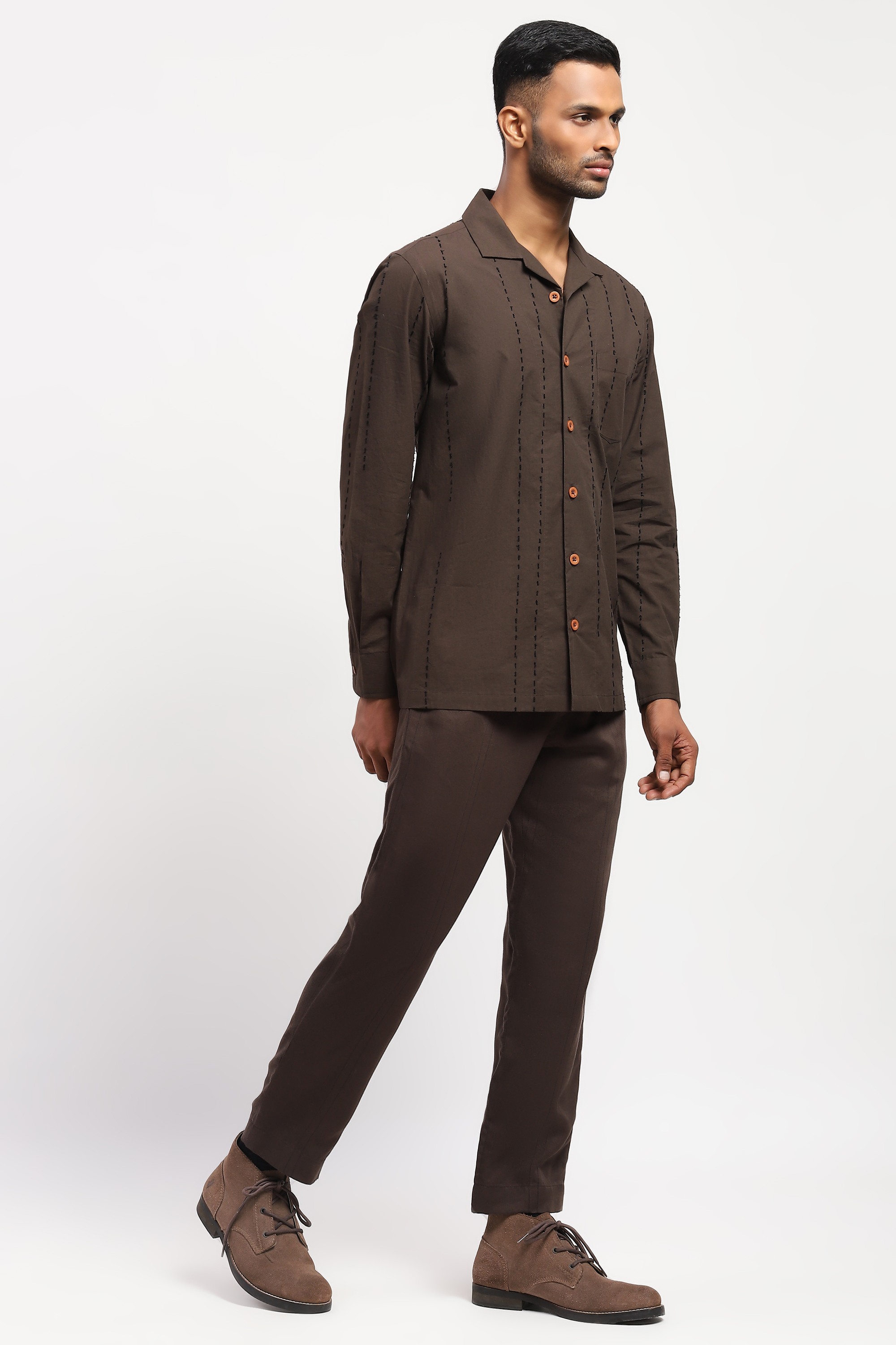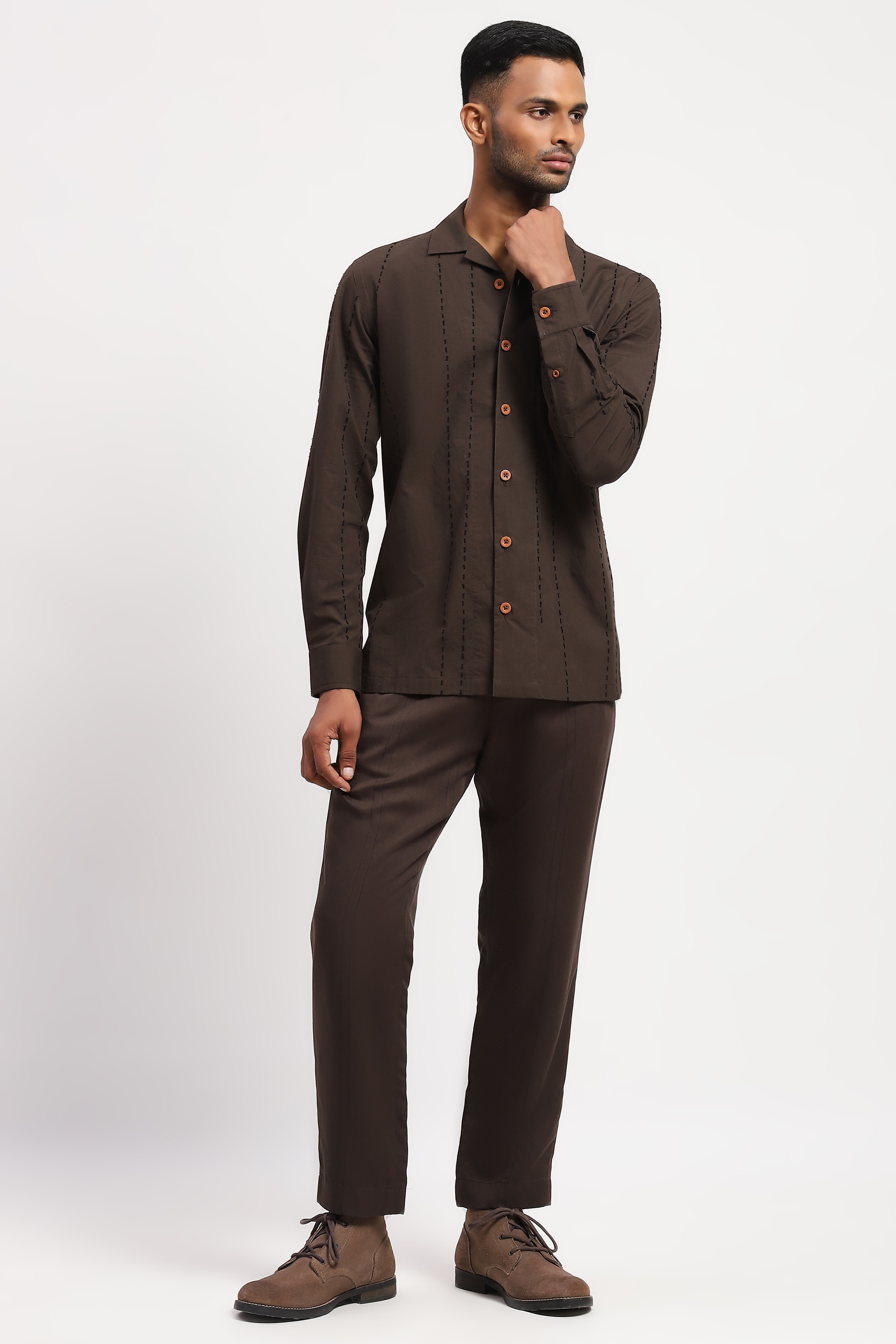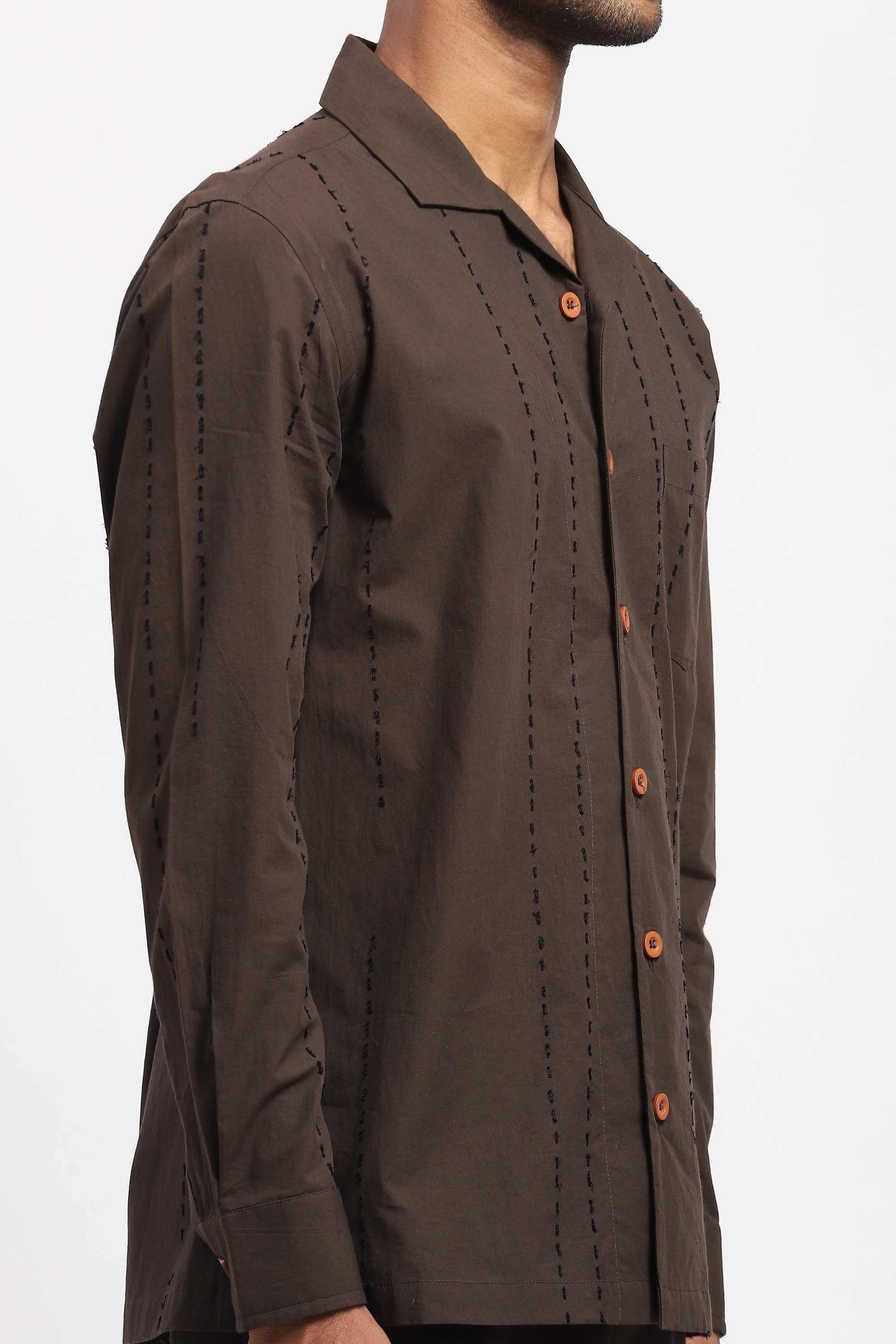 Ideal for stepping out of line, this brown shirt is crafted in breathable cotton poplin. The chevron patterns on this creation are embroidered with silk yarn.