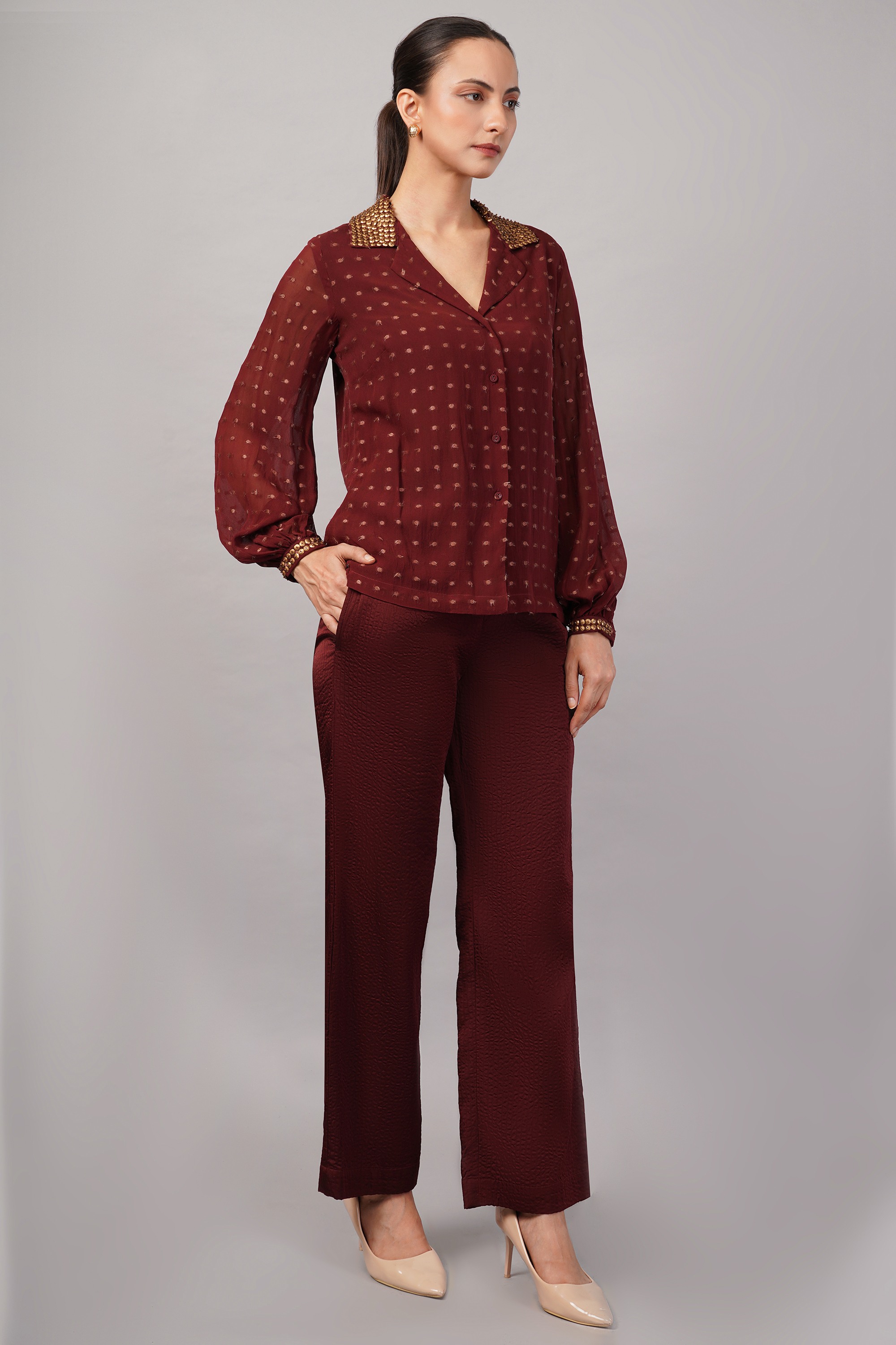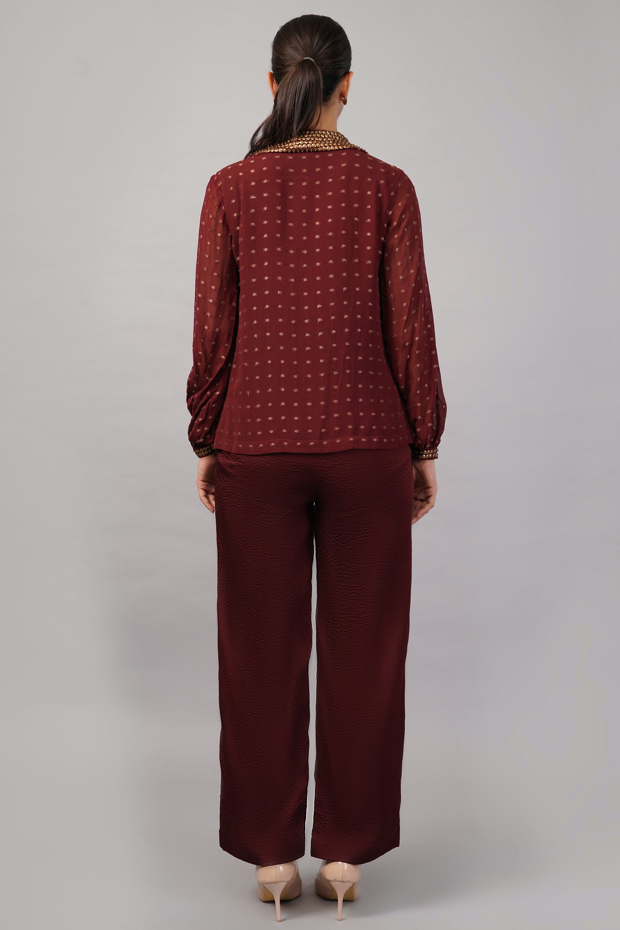 This limited edition piece has been made using a specially woven brocade in a silk georgette base, and embellished with gold sequins. The placement and color add subtle glamour for a striking effect.