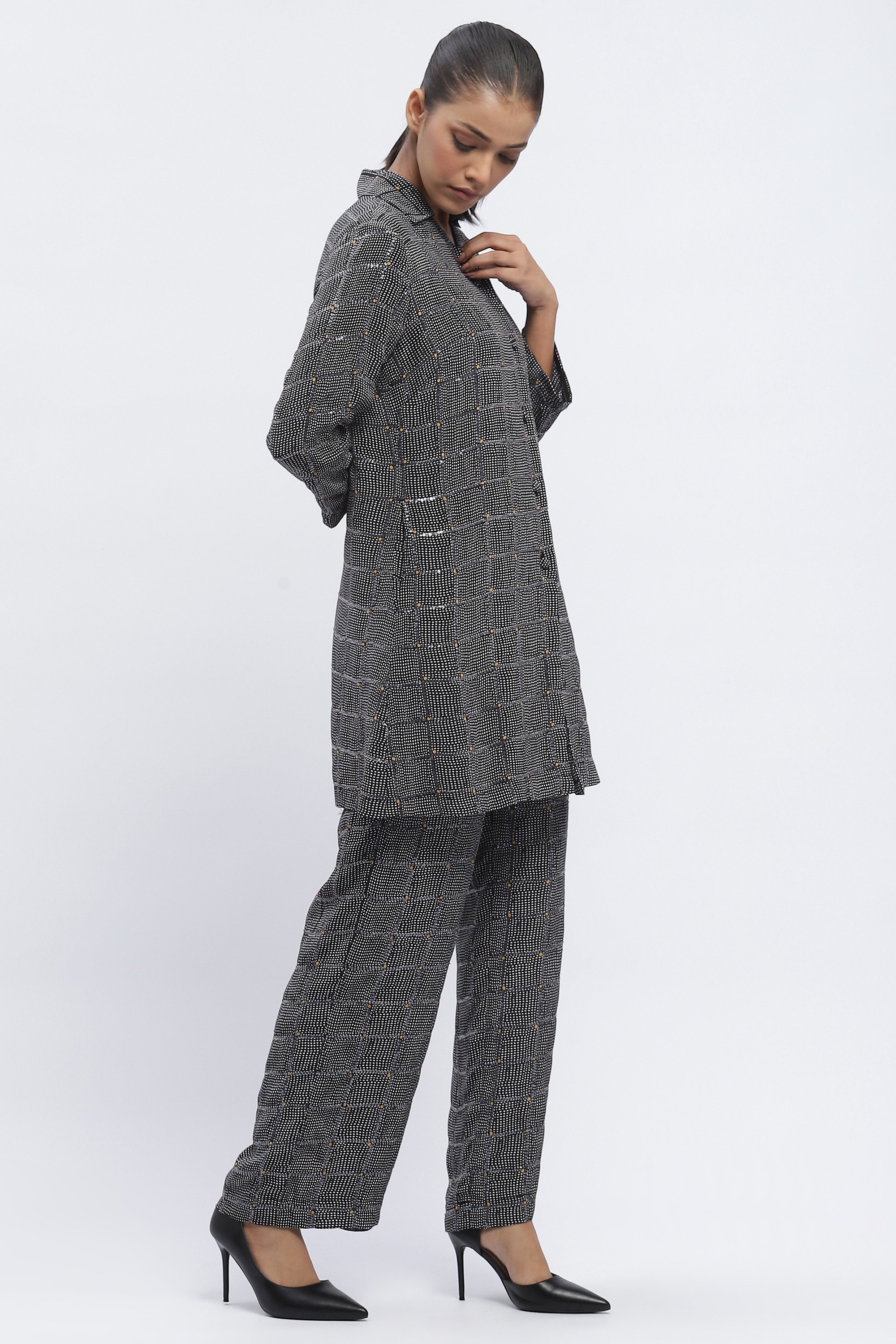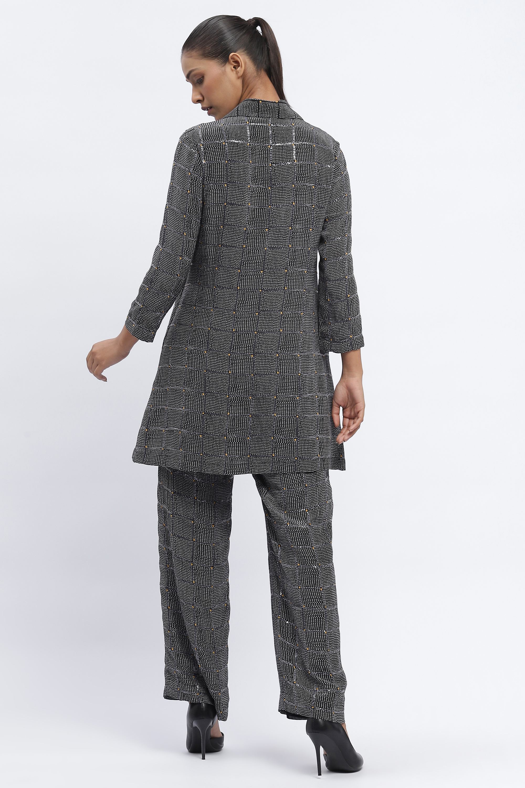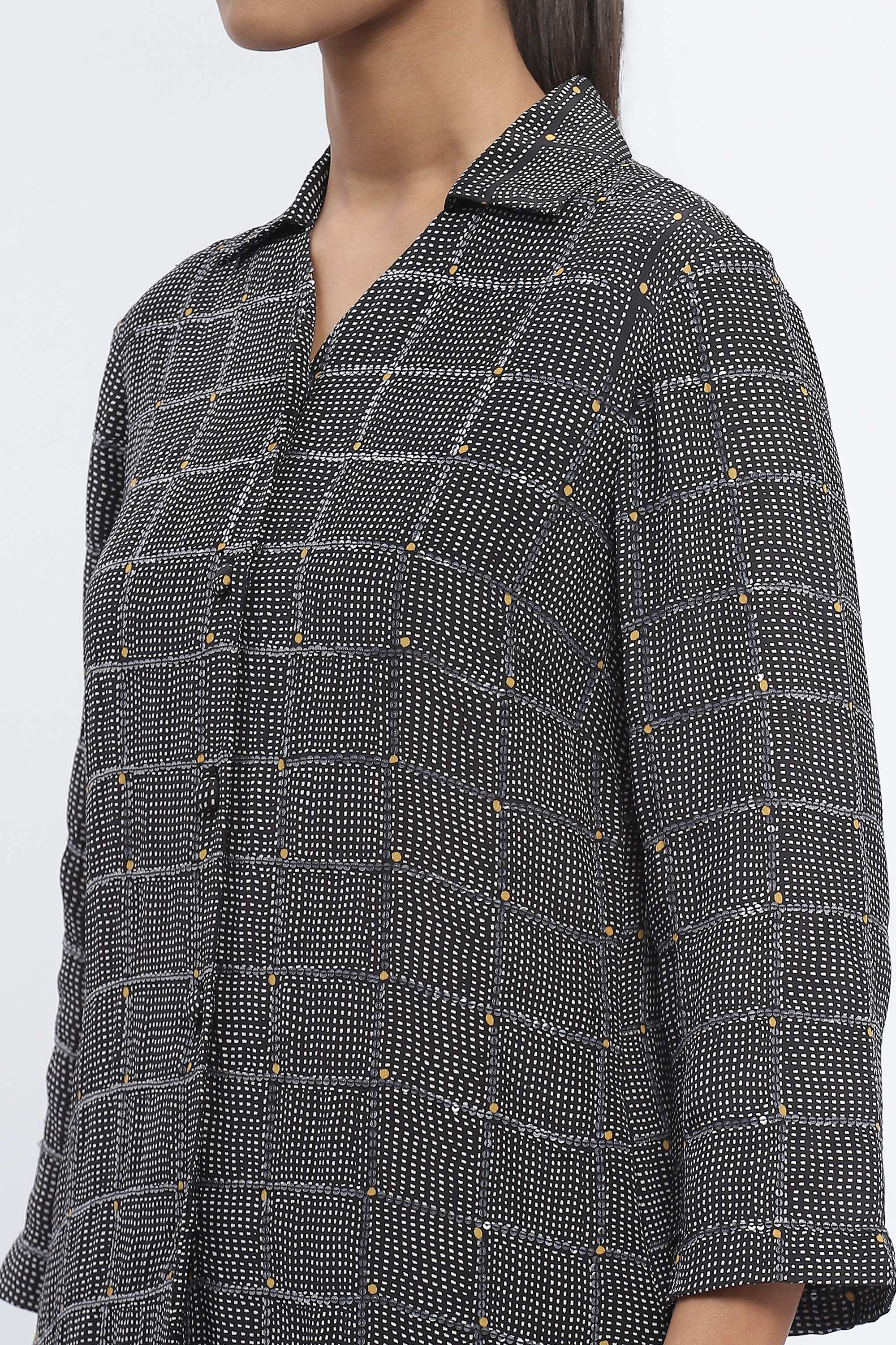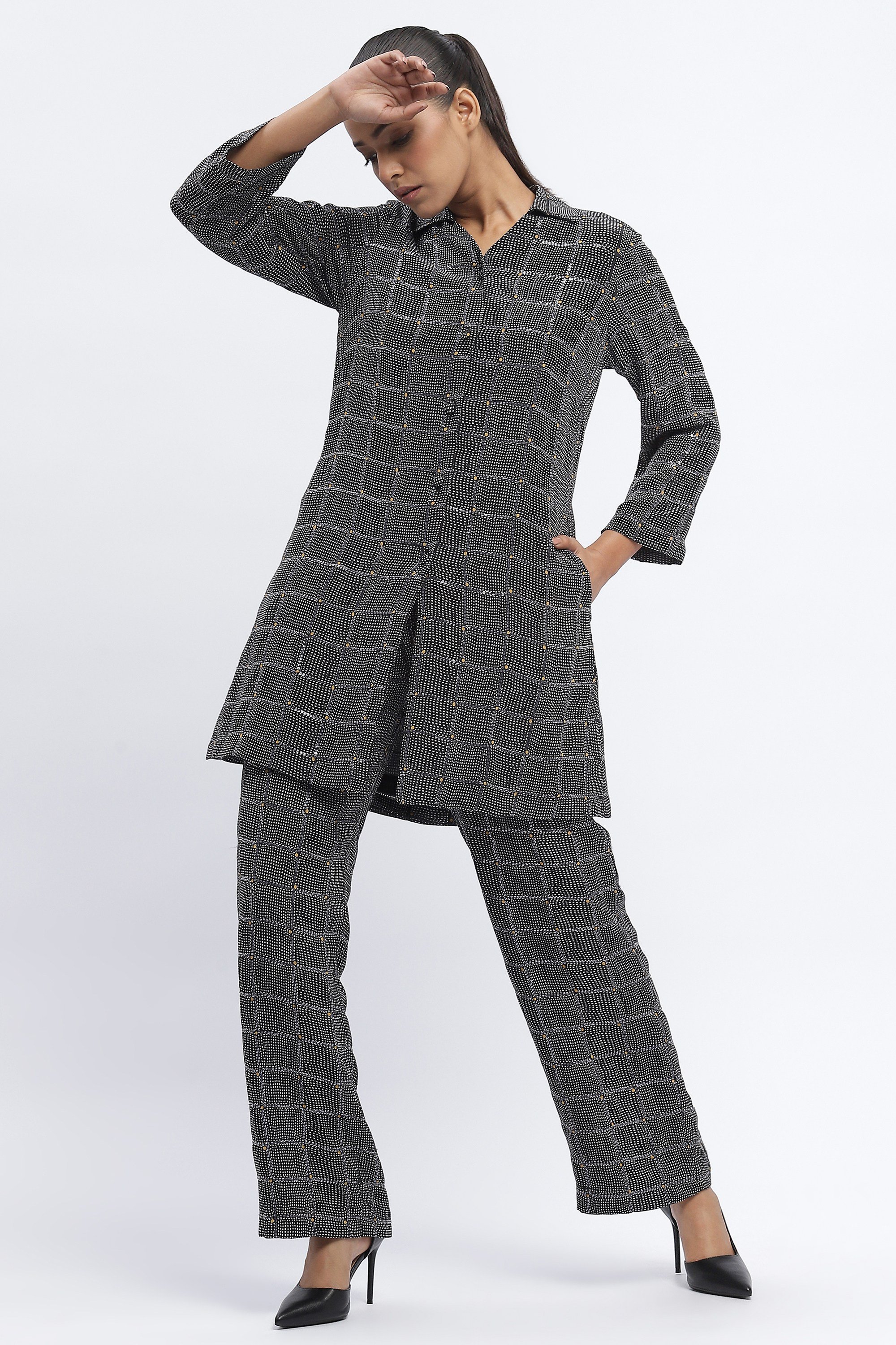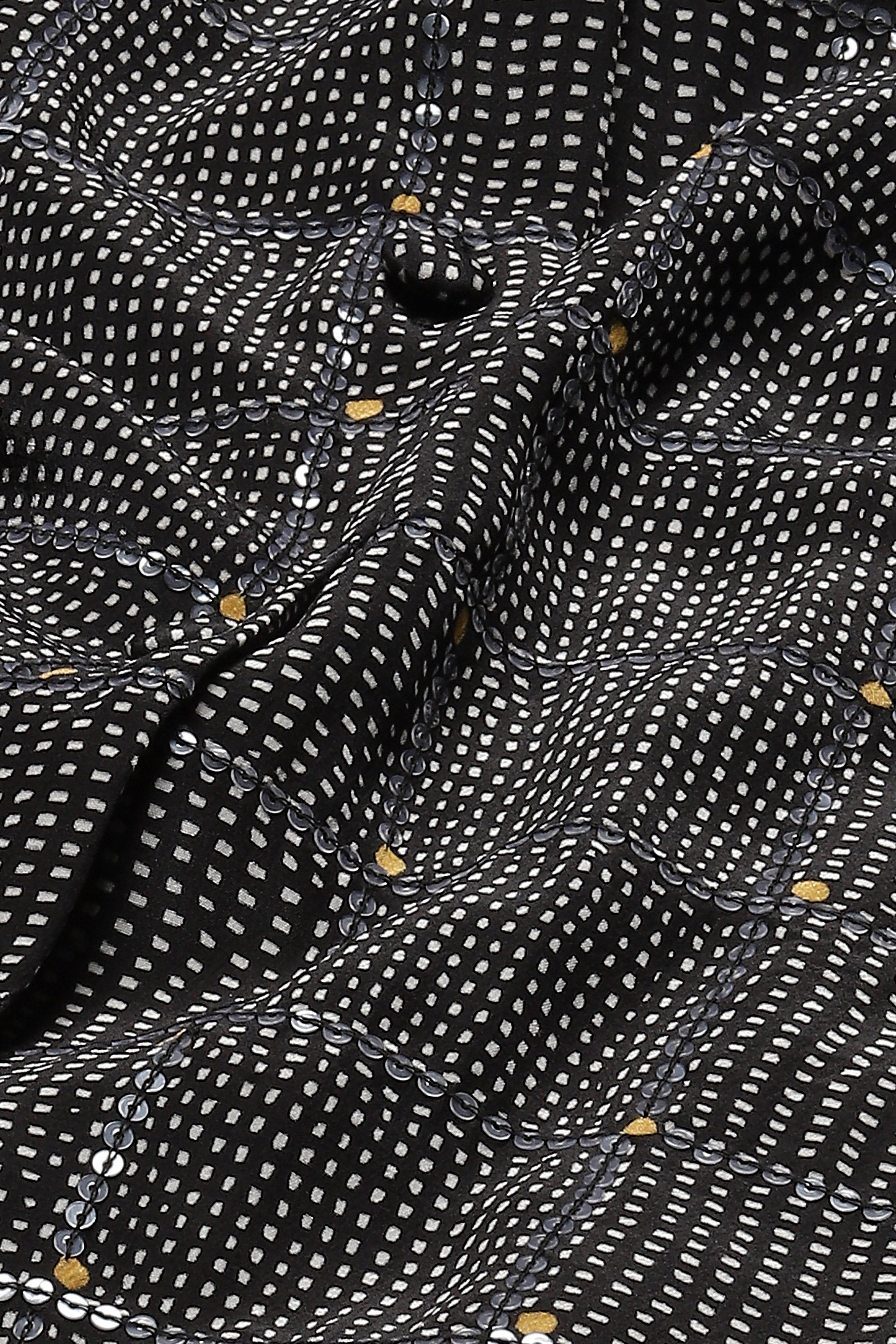 Best paired with an empty schedule, this black long shirt is crafted in fluid chanderi. Hand adda embroidered sequins lend subtle highlights to its digitally printed pattern.