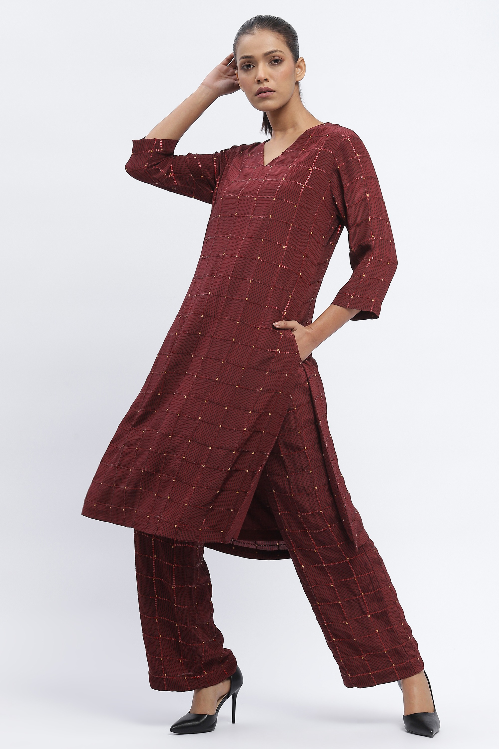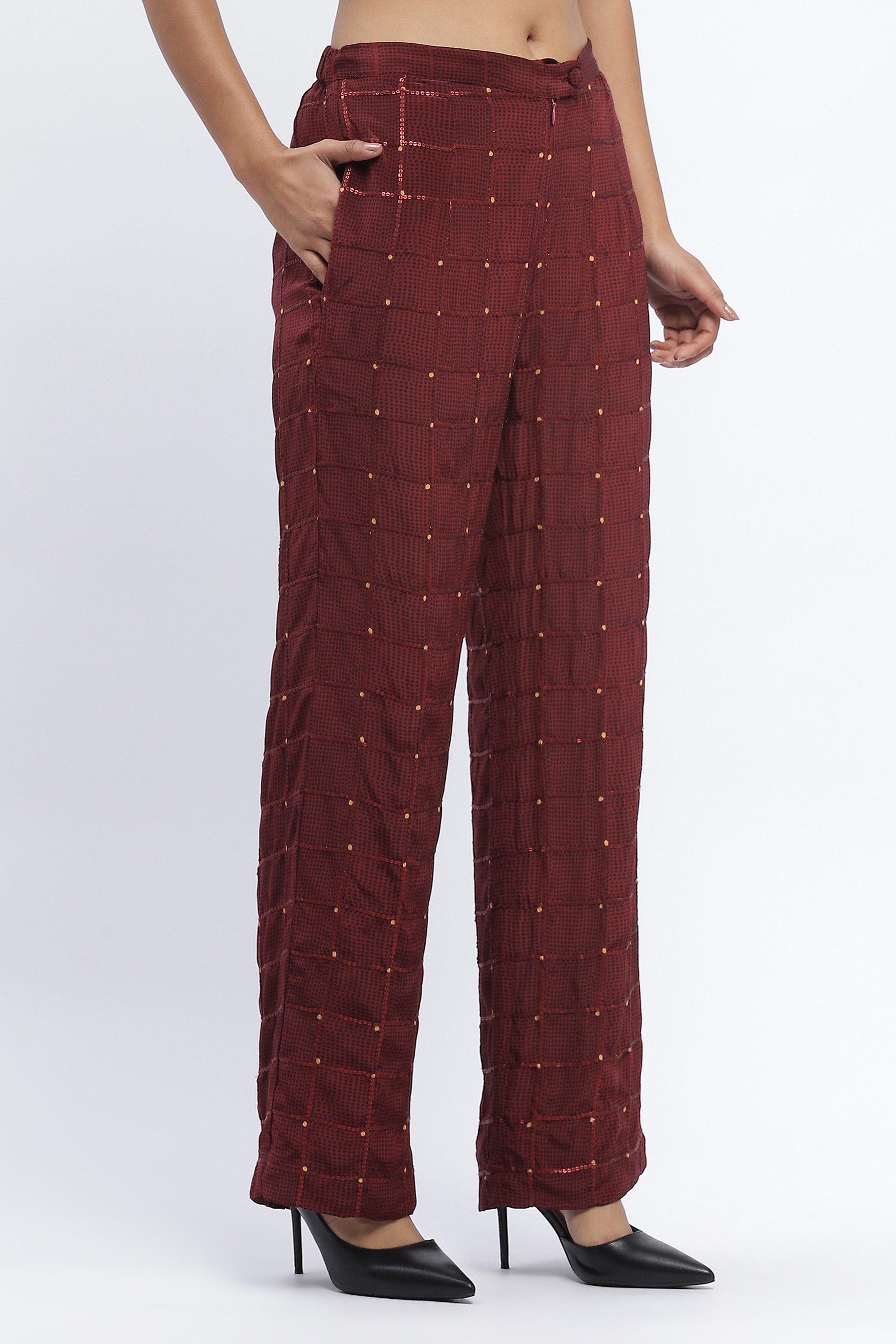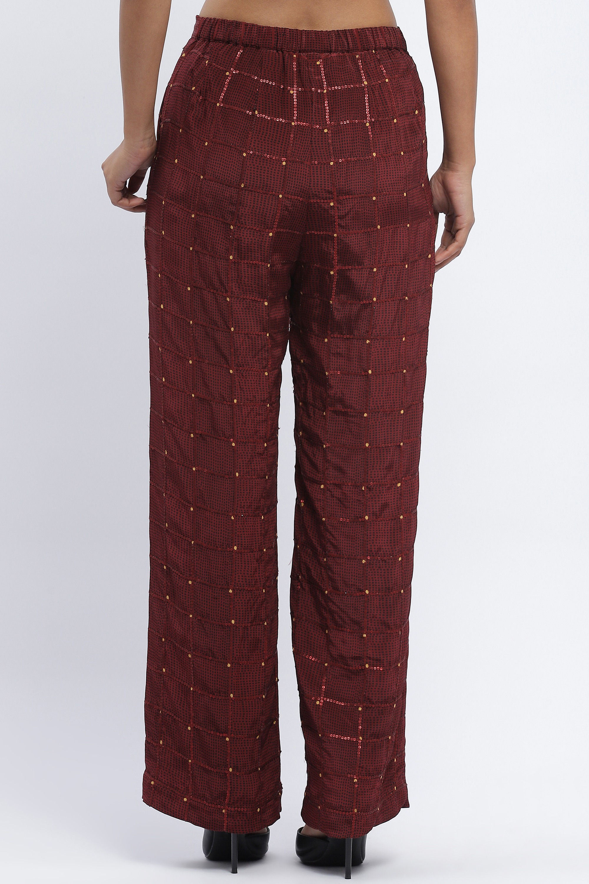 Best paired with an empty schedule, this pair of burgundy trousers is crafted in fluid chanderi. Hand adda embroidered sequins lend subtle highlights to its digitally printed pattern.