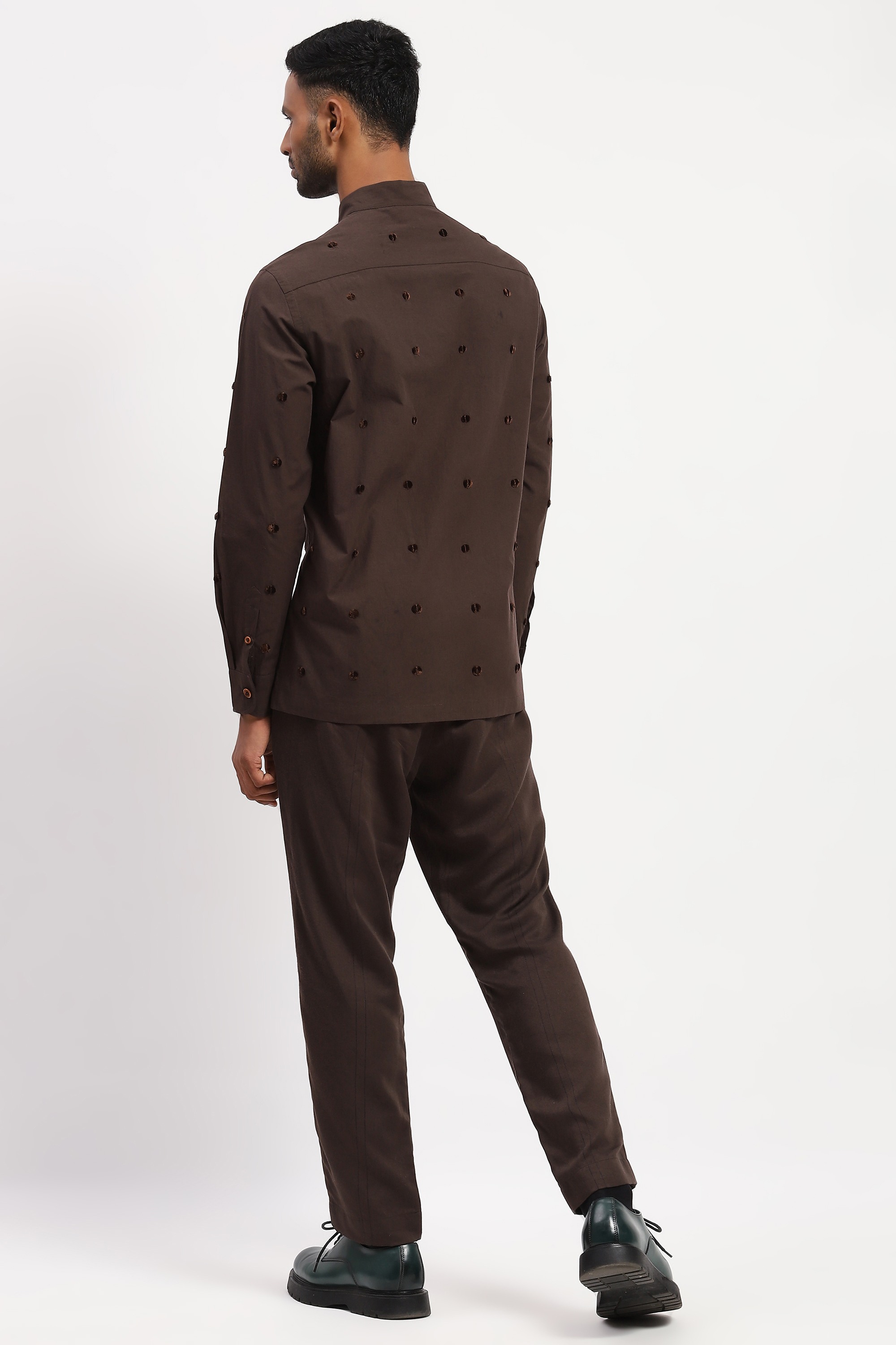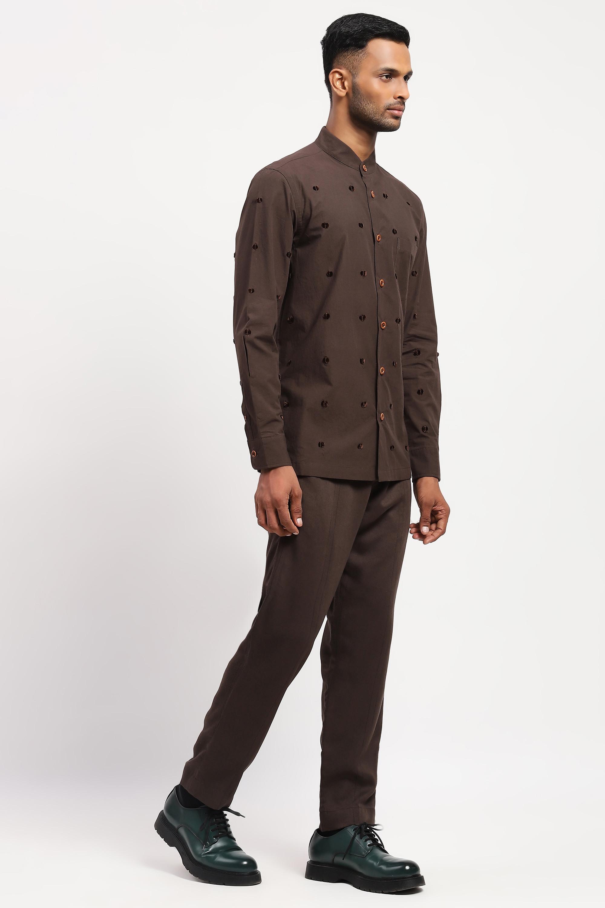 Crafted in 60s poplin, this chocolate shirt is embroidered with dots of fine silk yarn.