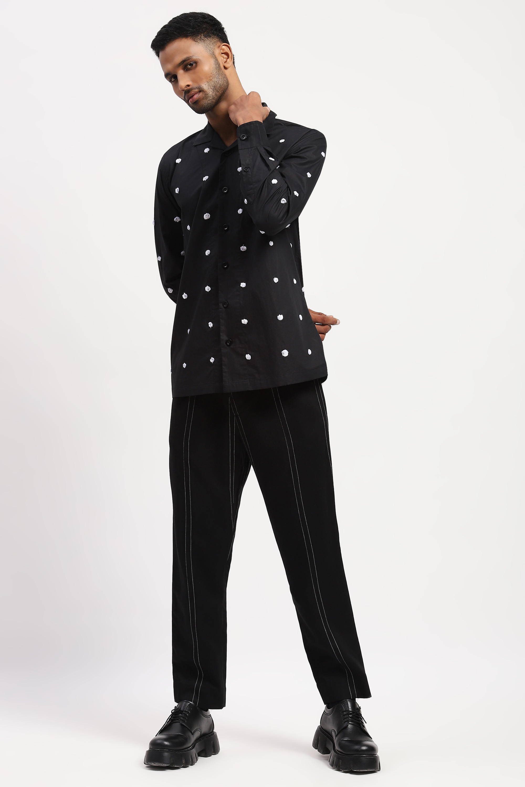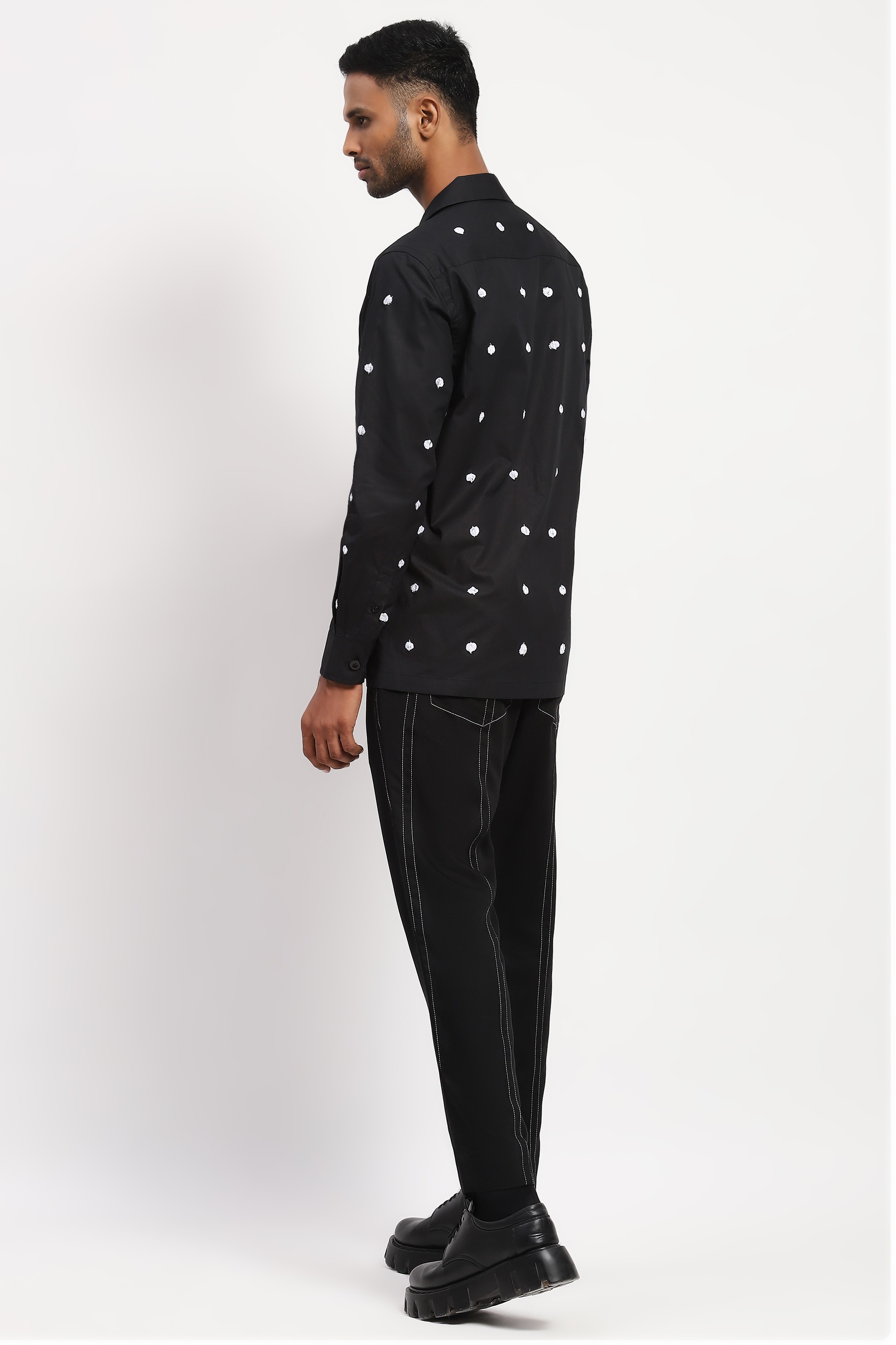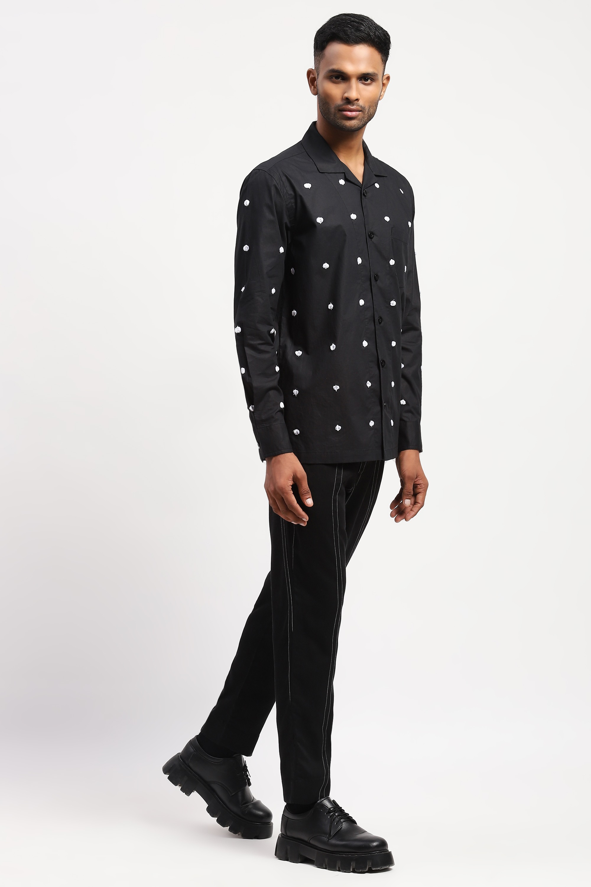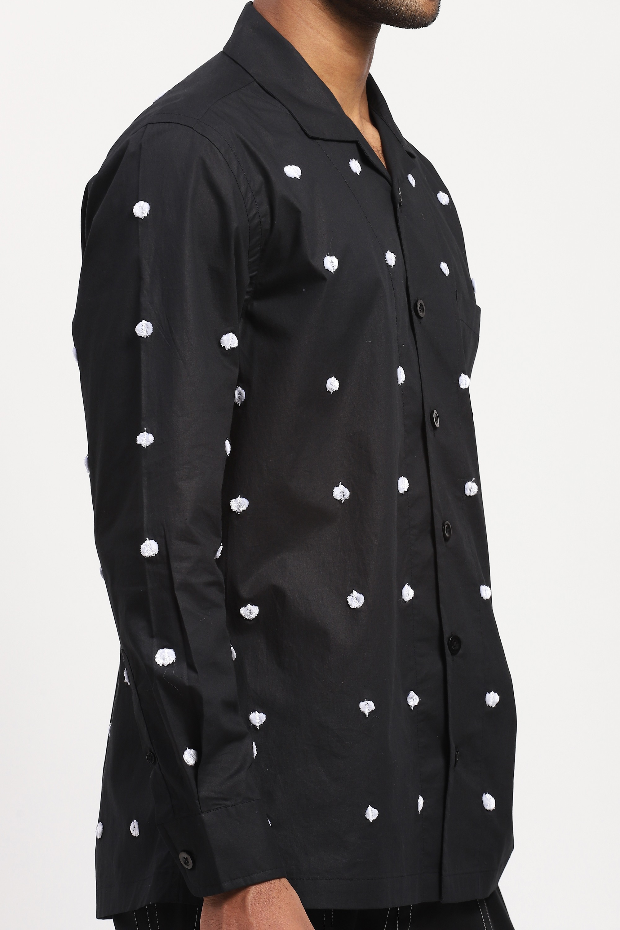 Crafted in 60s poplin, this black shirt is embroidered with dots of fine silk yarn.