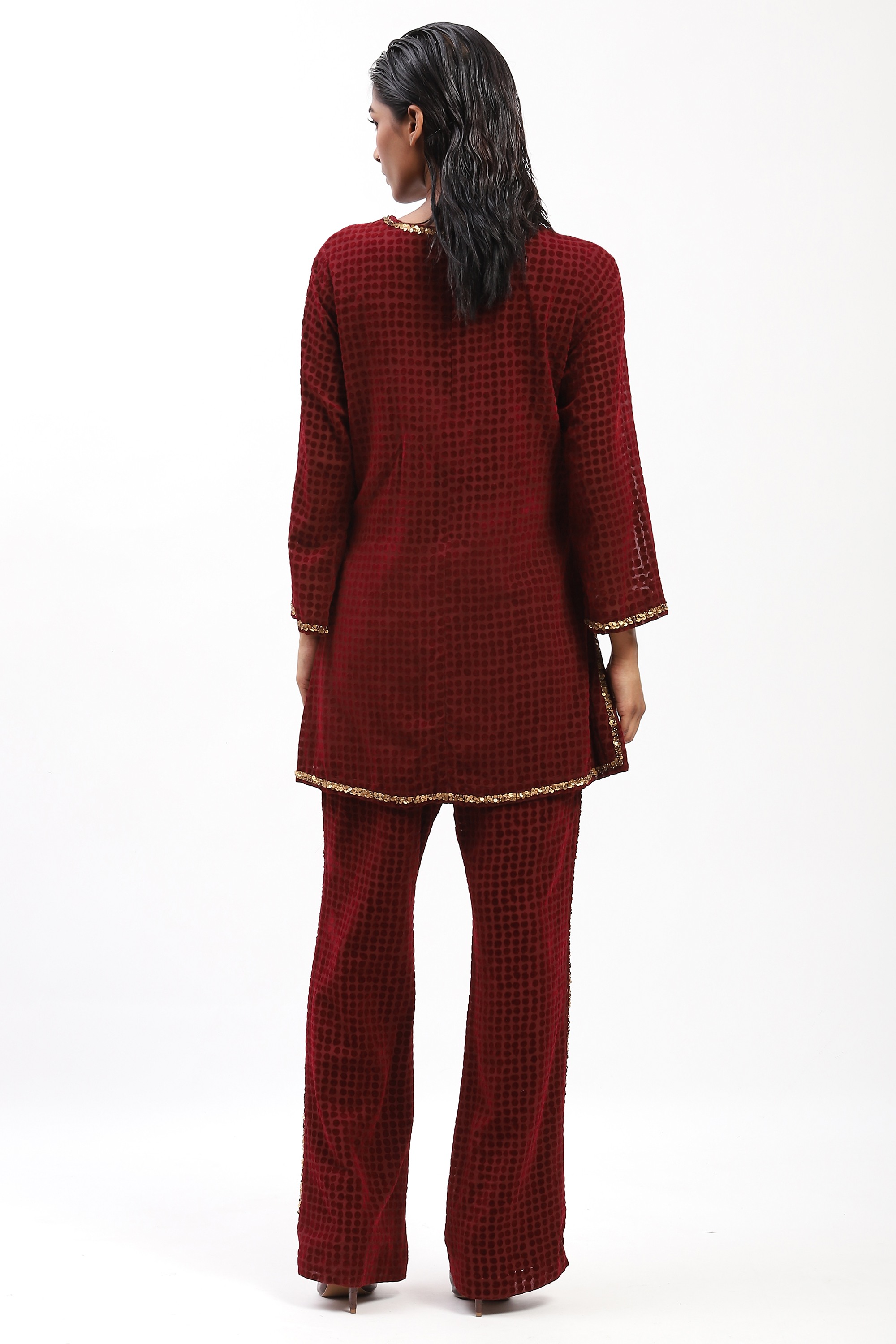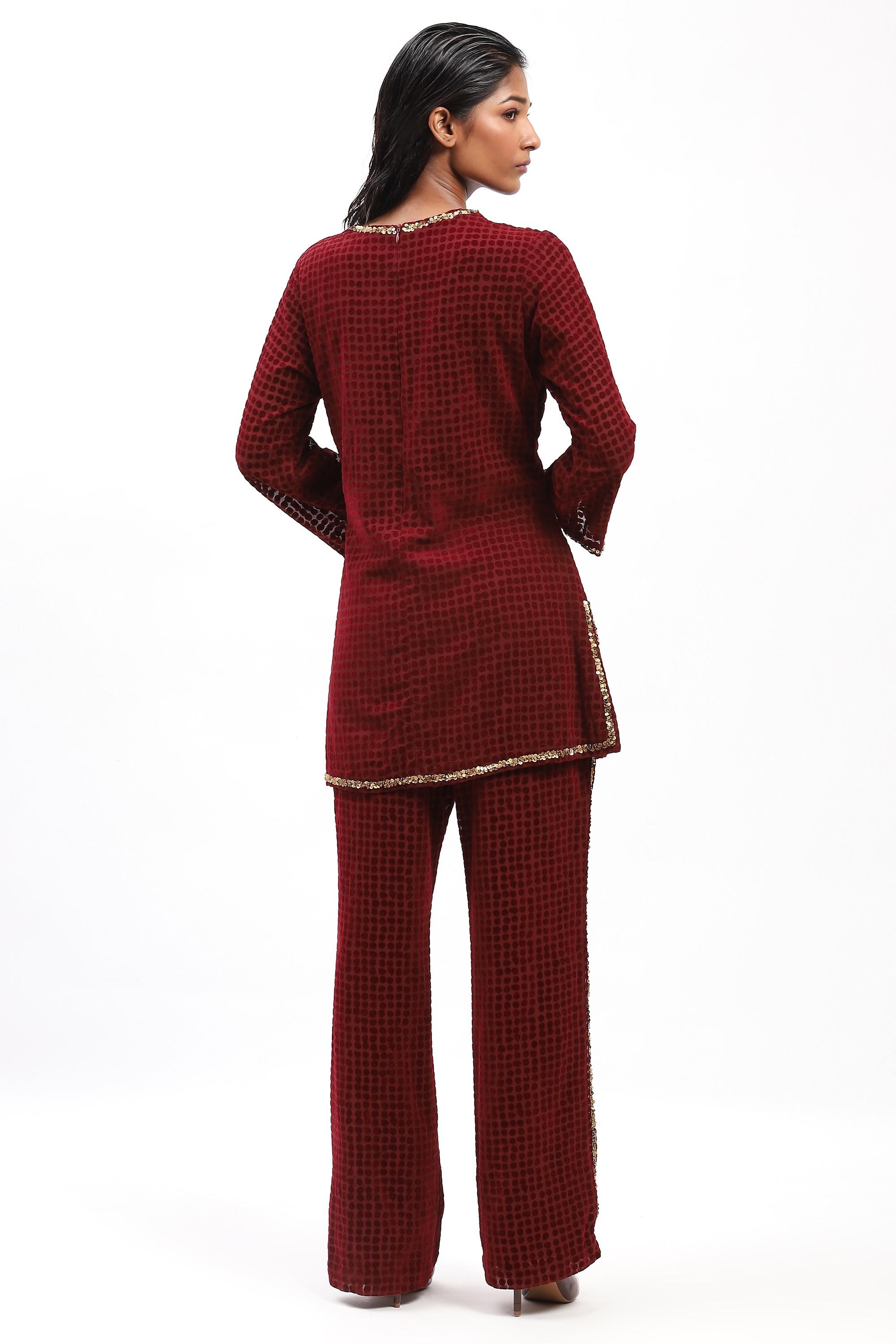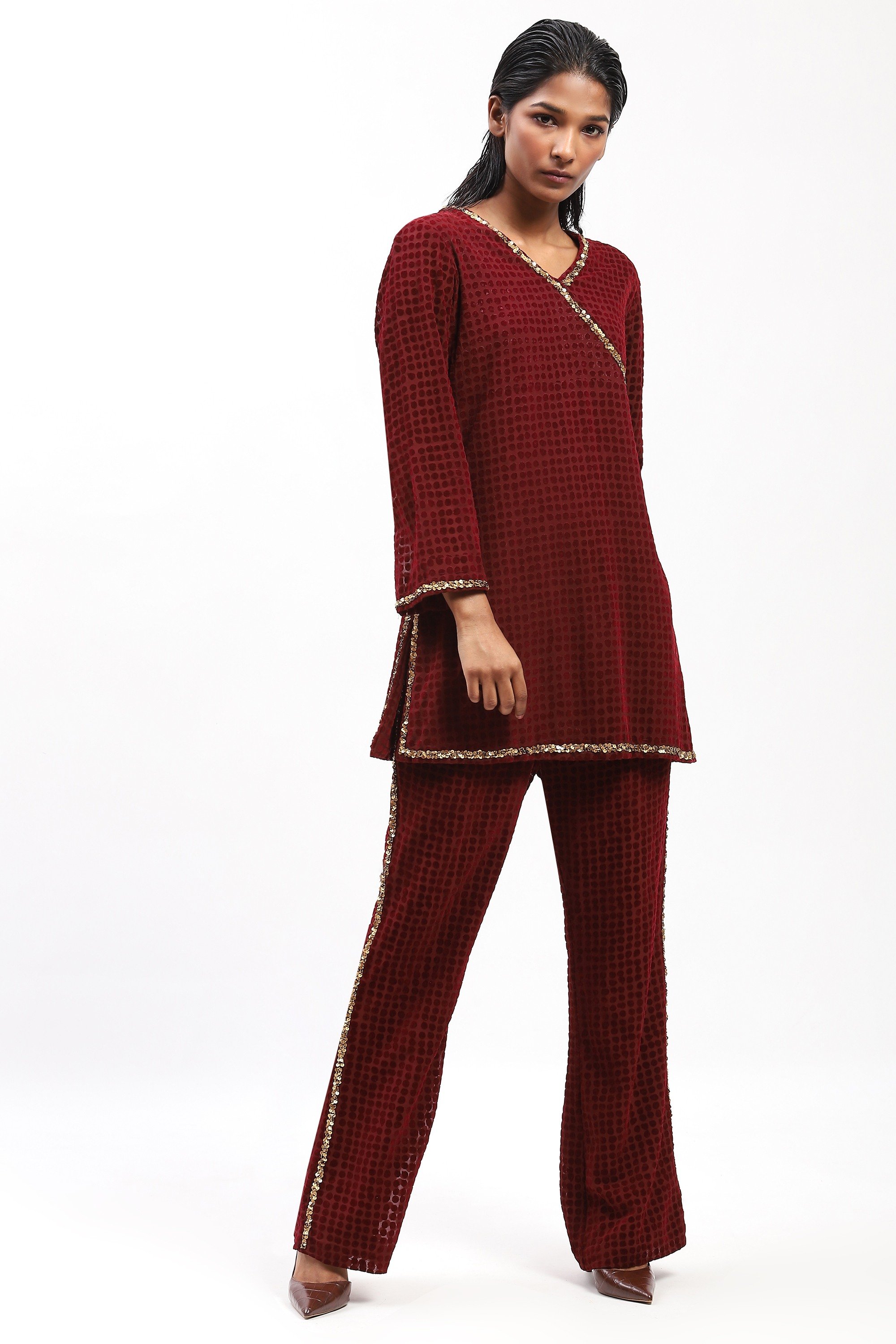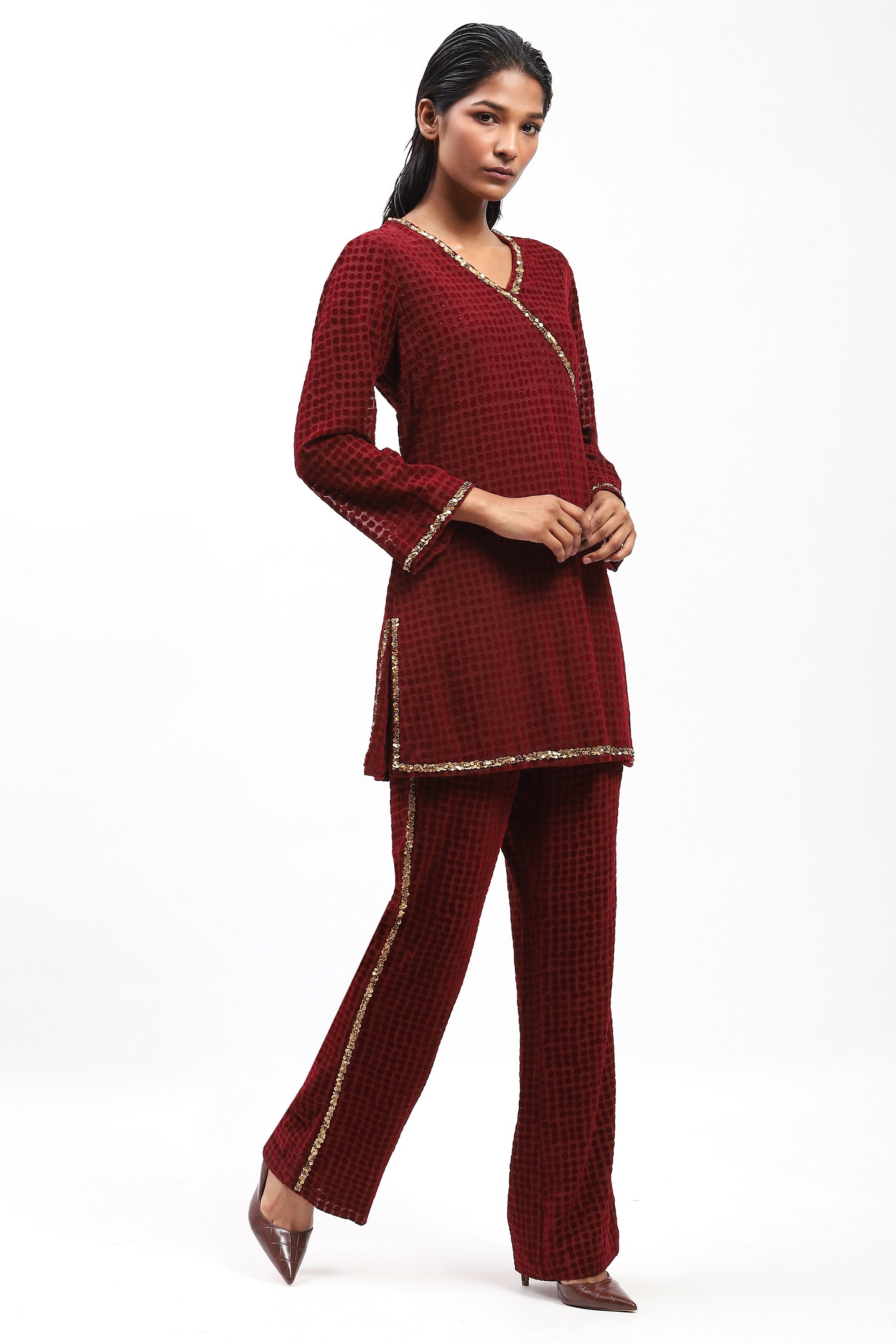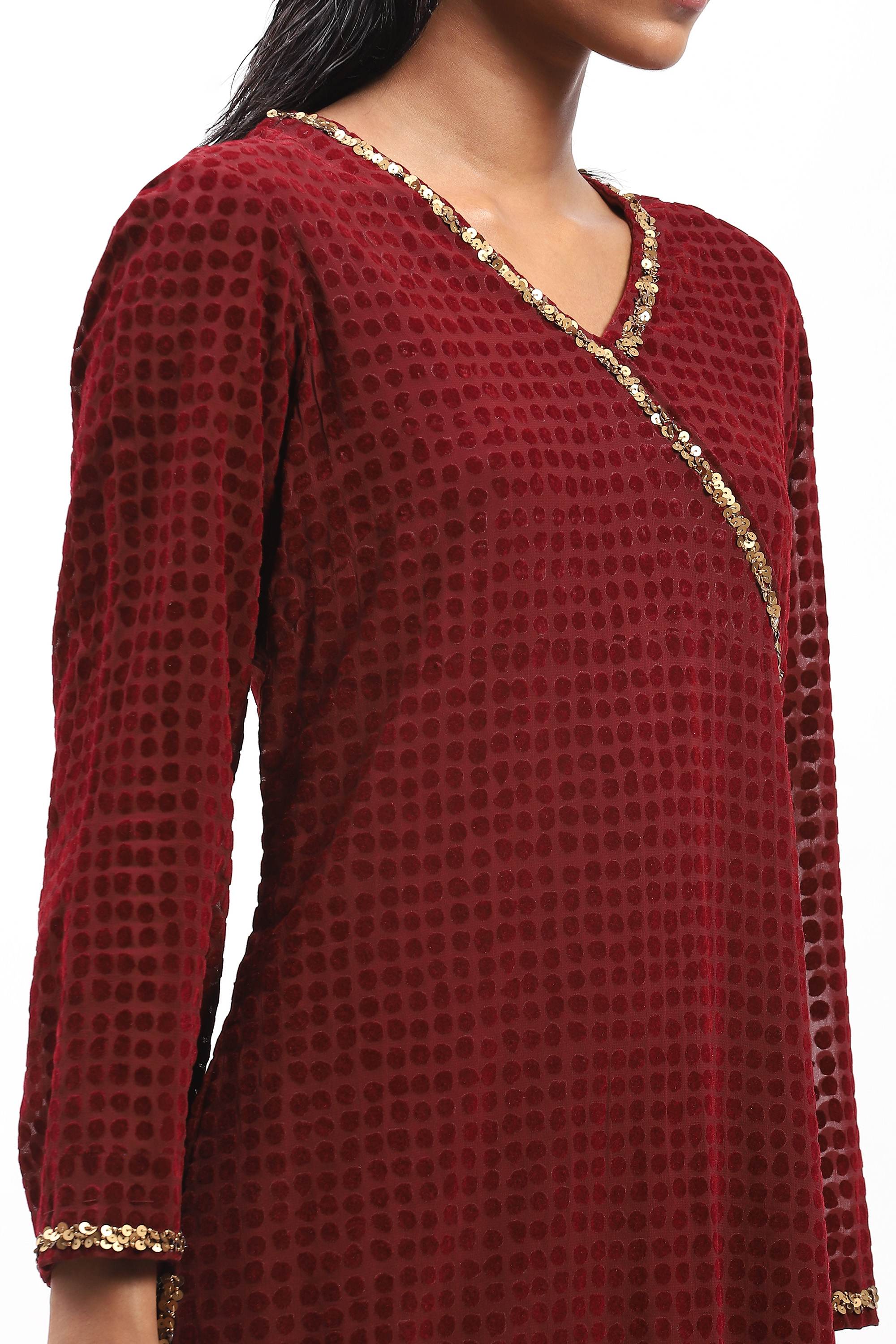 Best worn under subtly shifting colours of light, this burgundy top is crafted in georgette. It is flocked for texture and embroidered with spotlight-ready sequins.