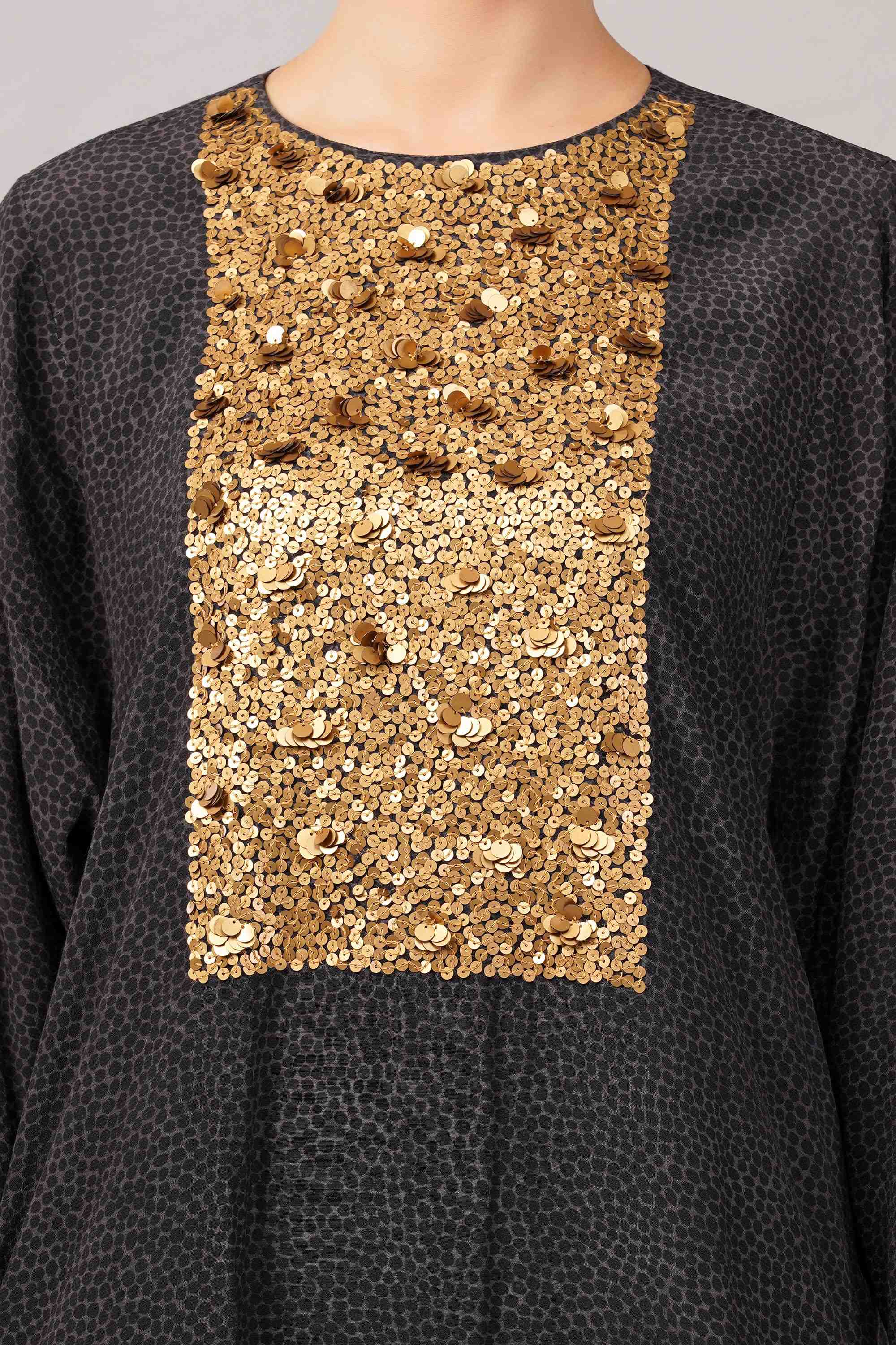 This limited edition piece has been made using mixed gold sequins hand embroidered onto a printed dot base - a play of print and embroidery motifs ideal for increasing glamour quotient.