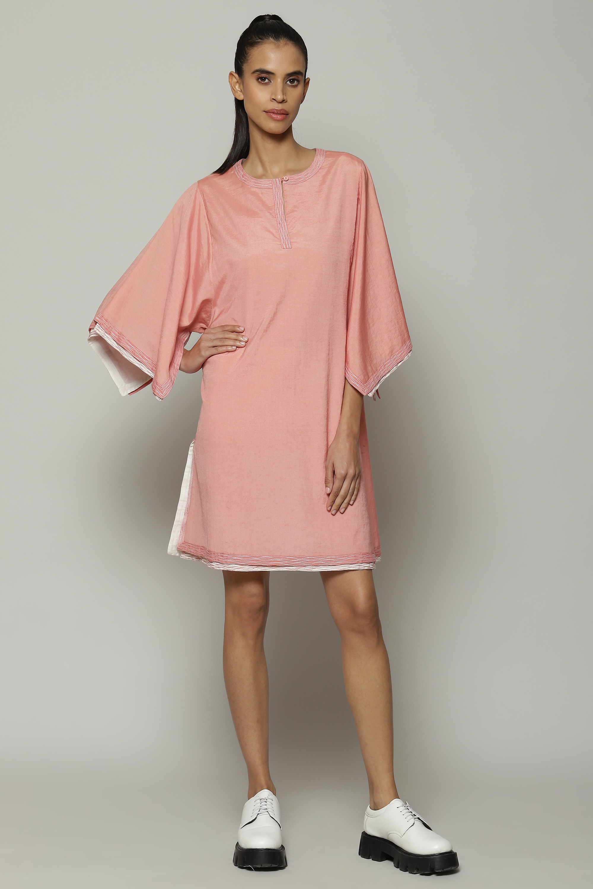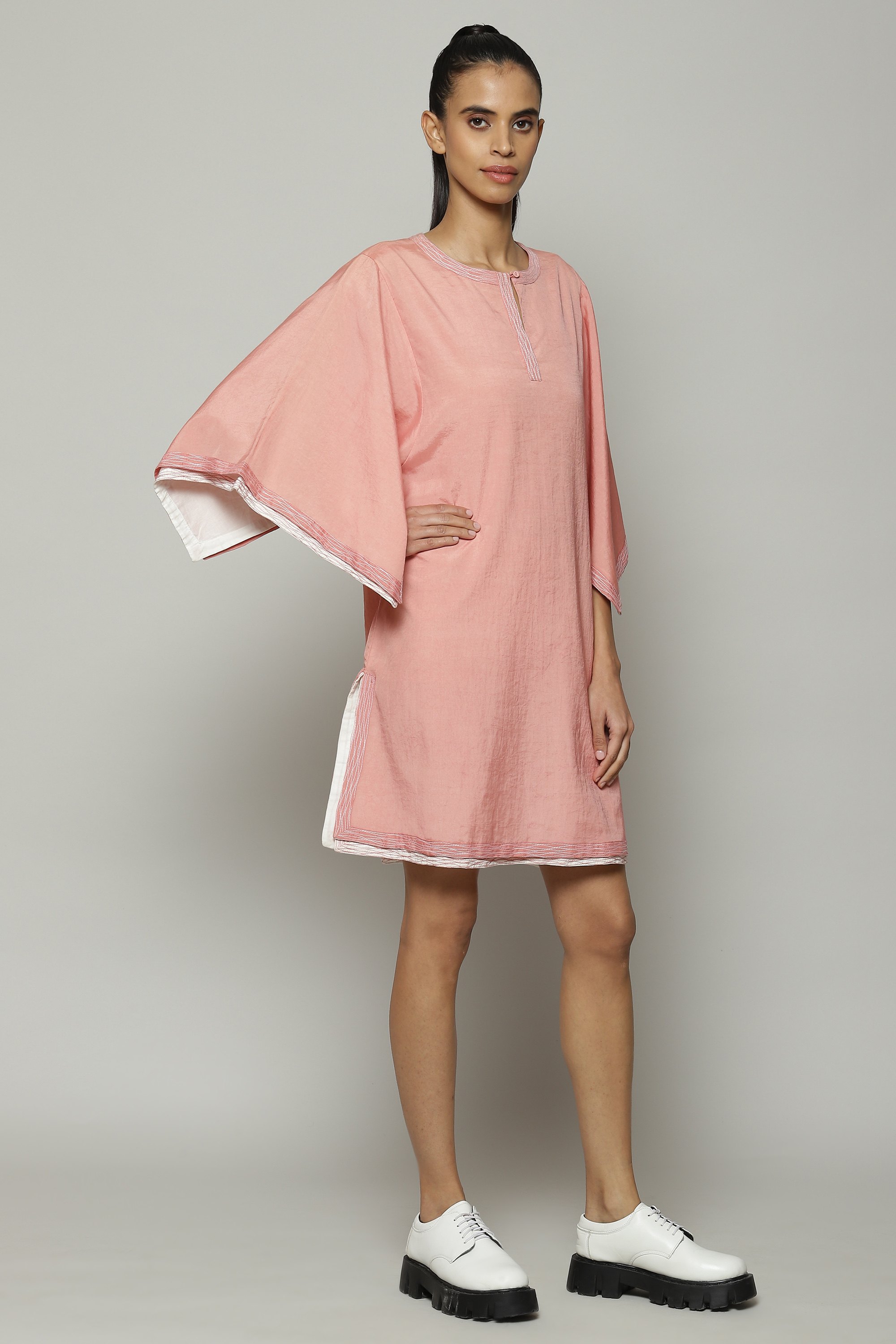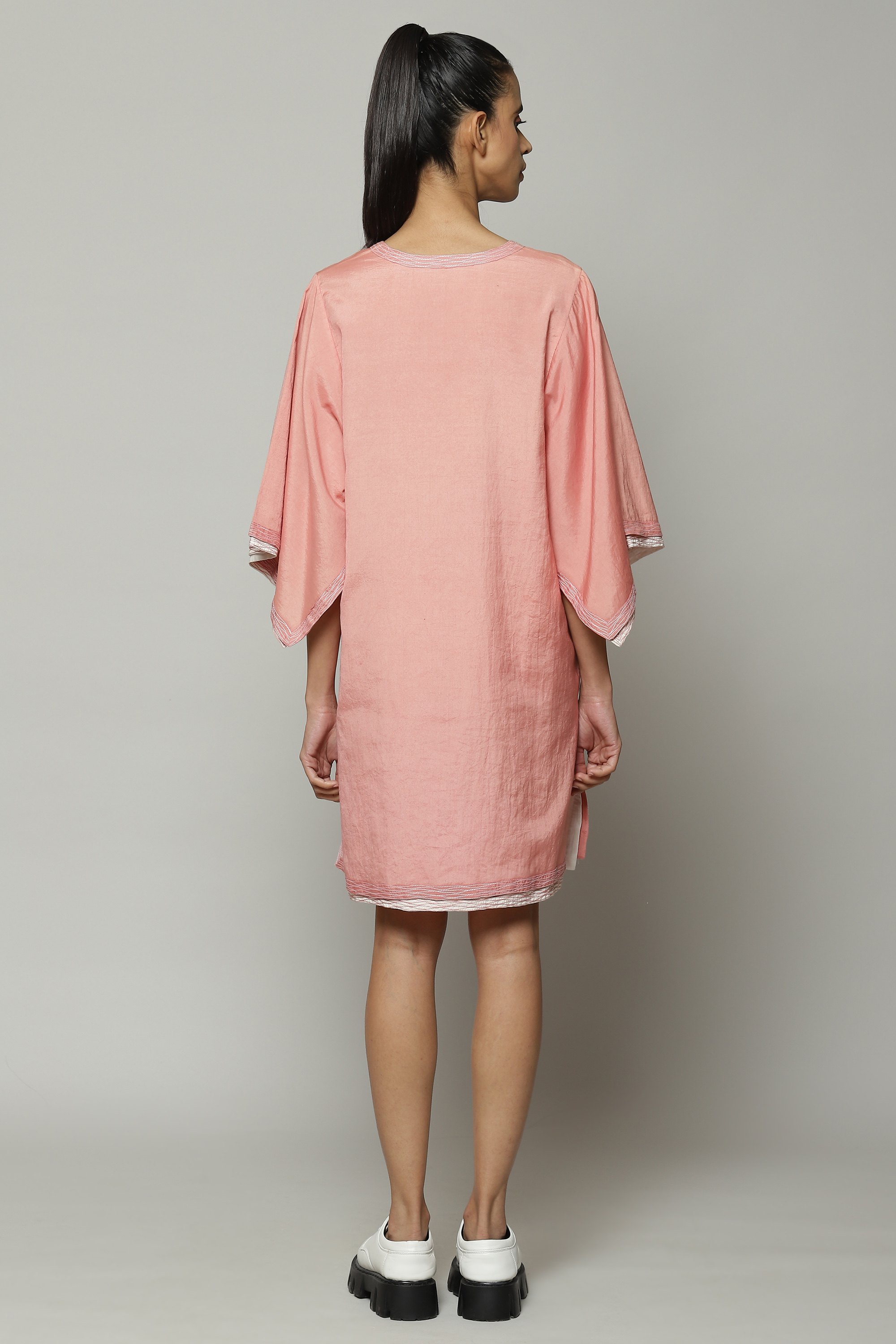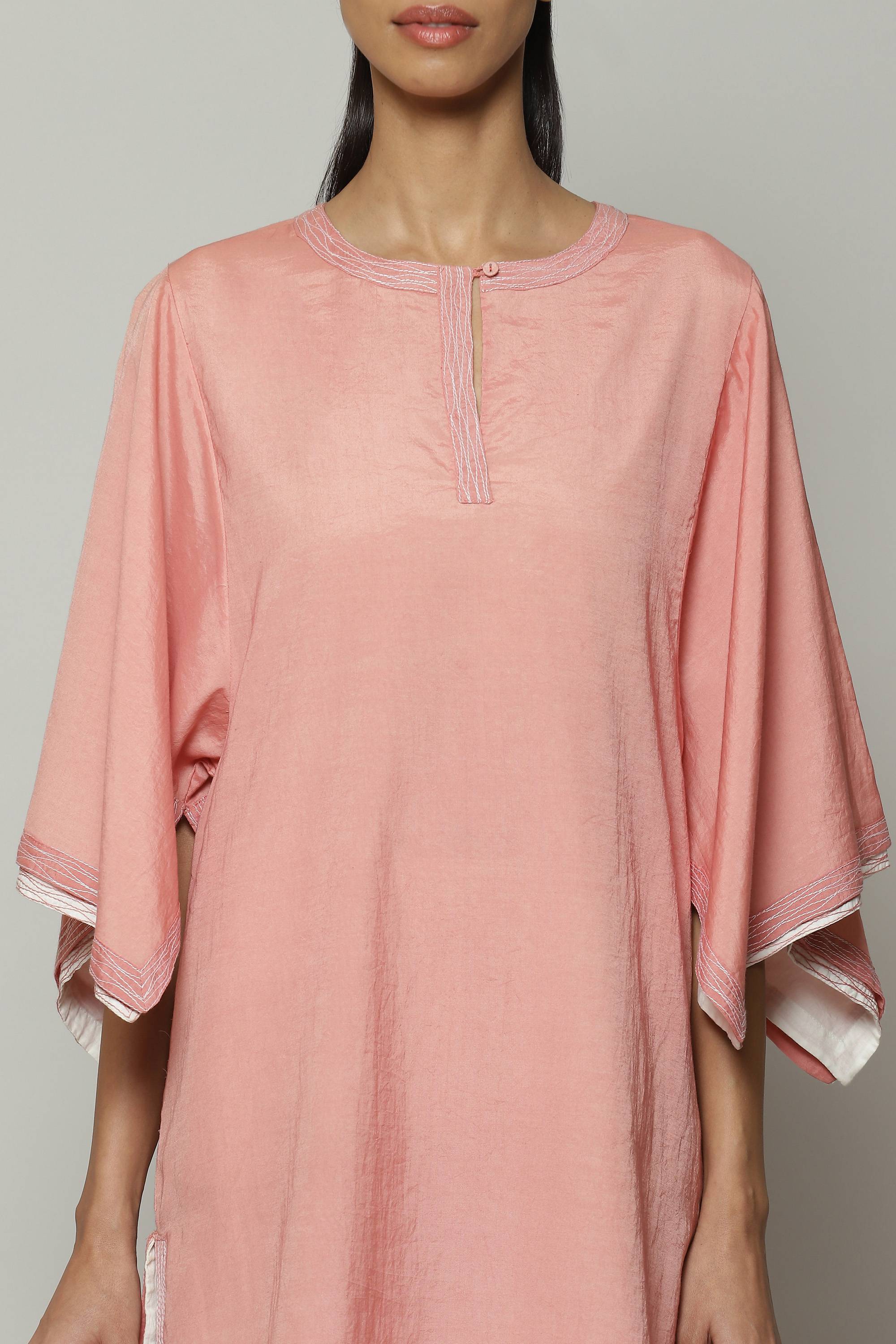 A double sheer kurta in soft baby pink. The piece brings together two layers of contrasting fabric for a subtle double-shaded effect. The oversized sleeves are ideal for sculptors and painters alike.