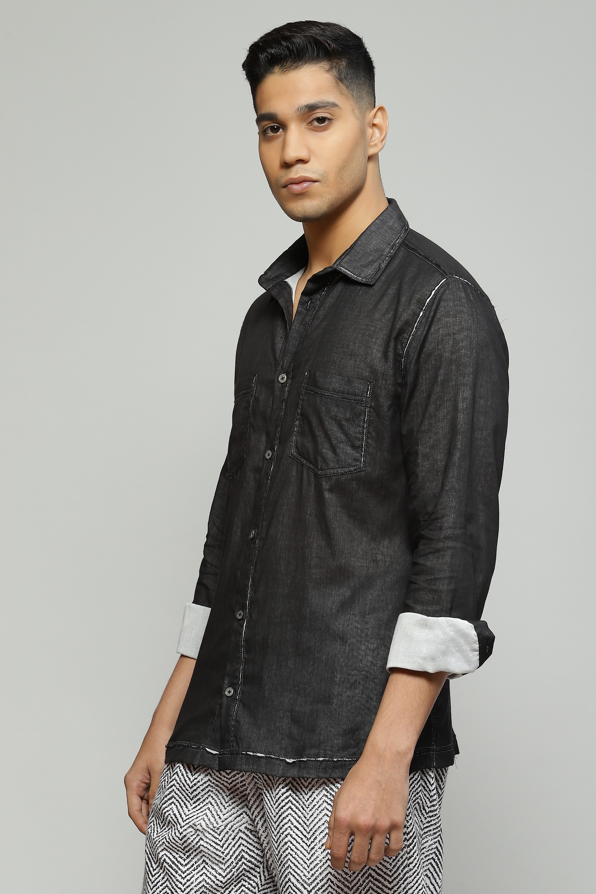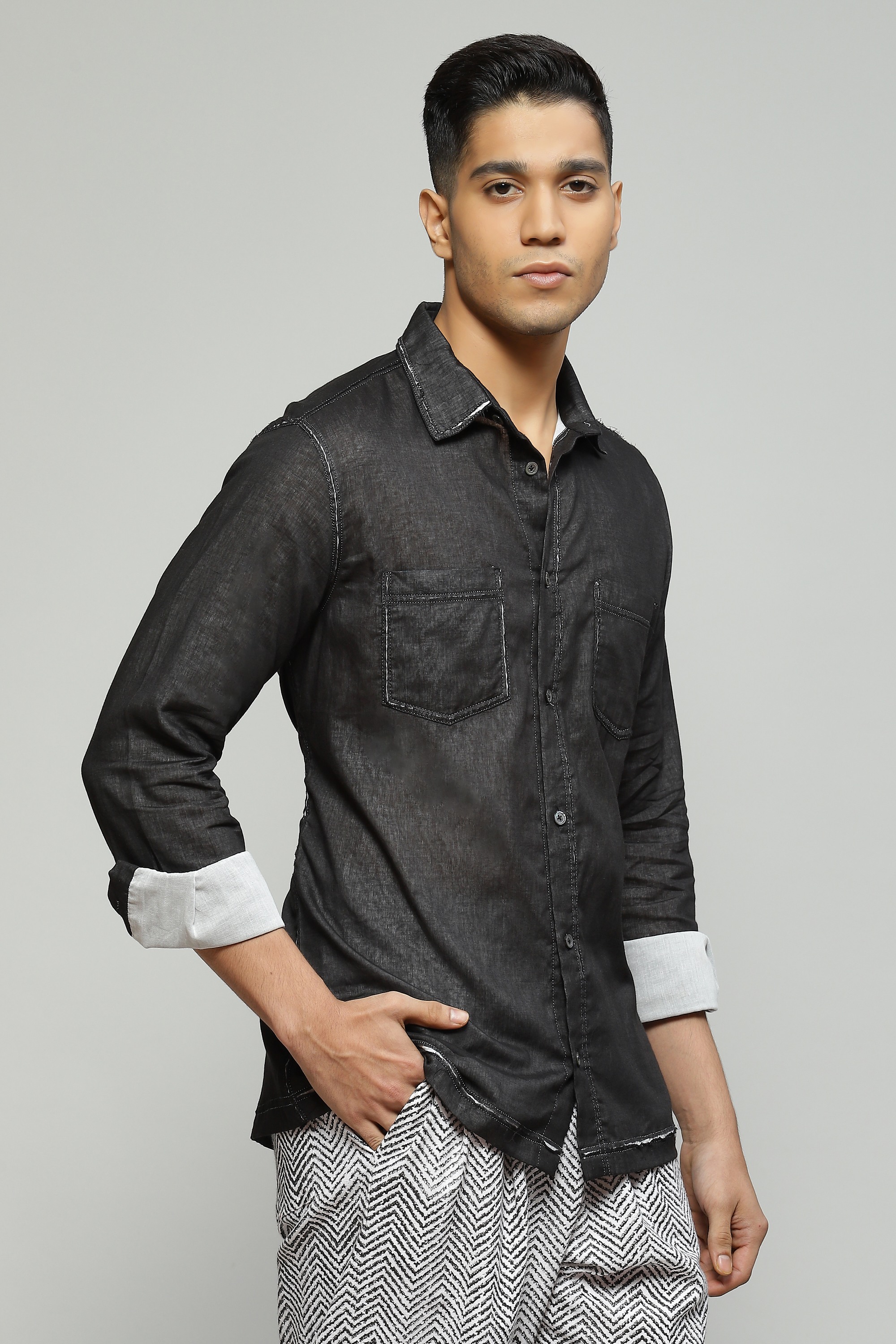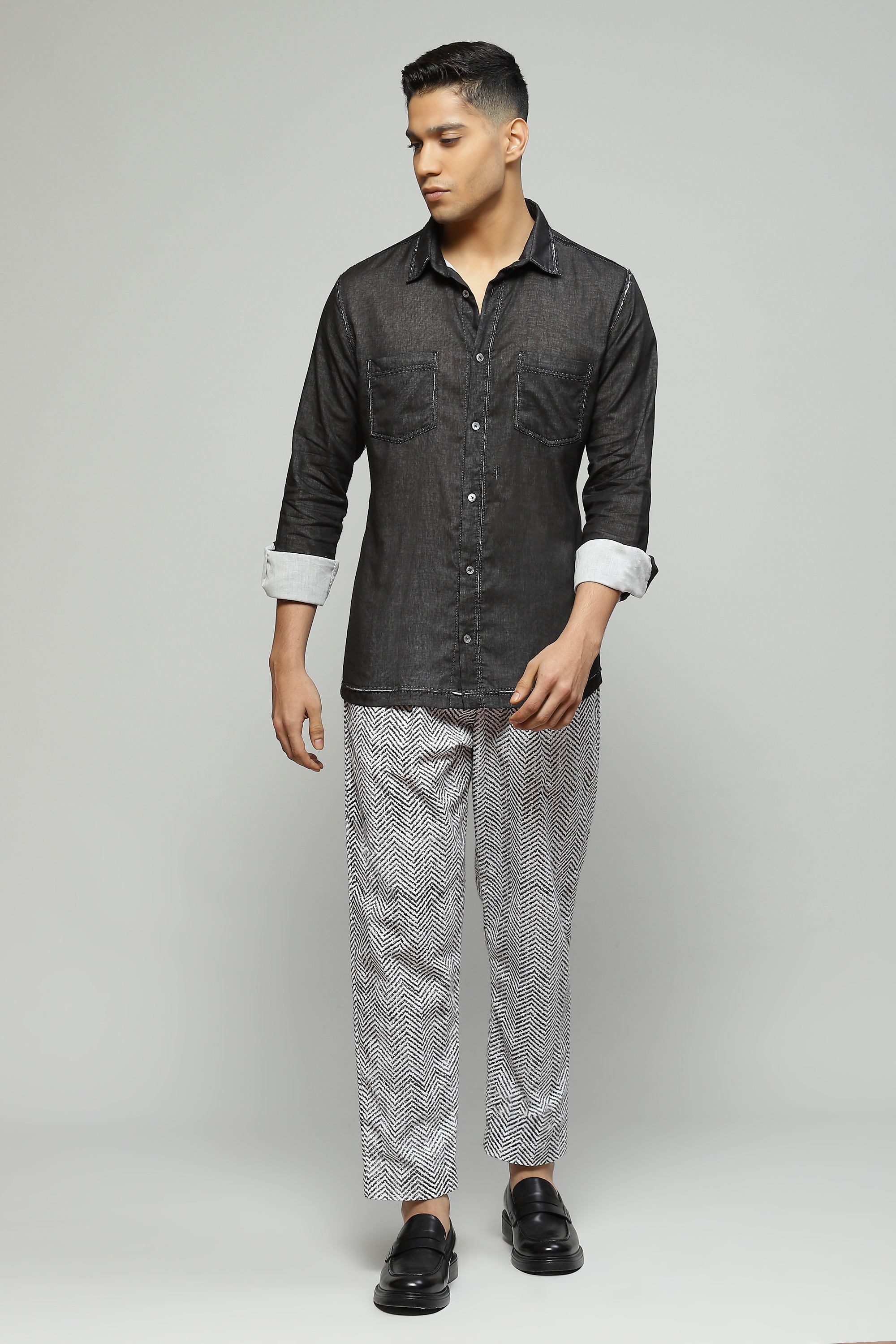 A structured black shirt featuring double voile cutwork Style with pleated black trousers for an elevated monochromatic look