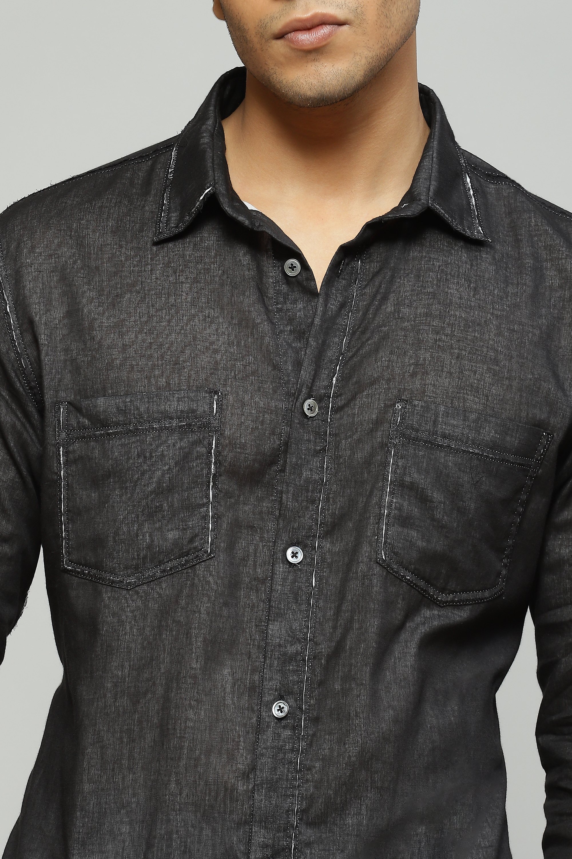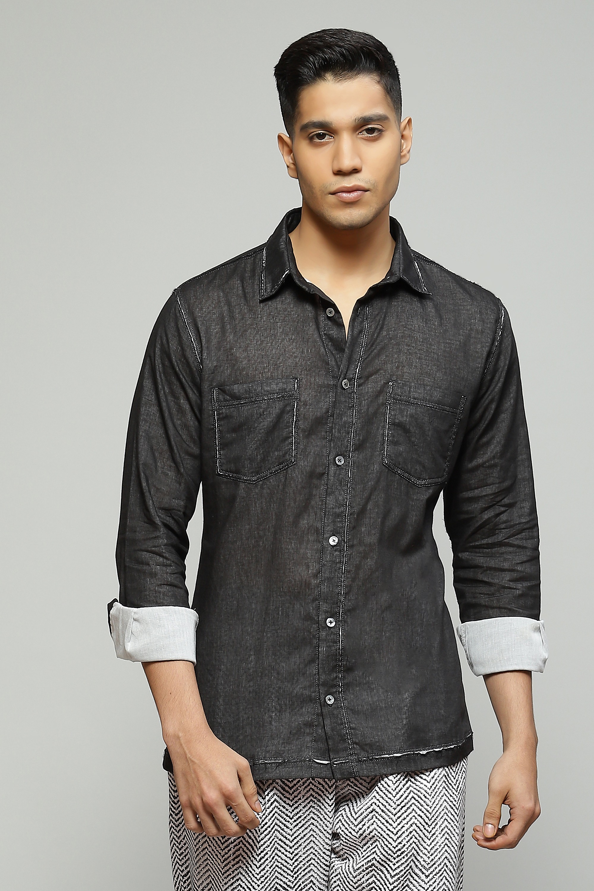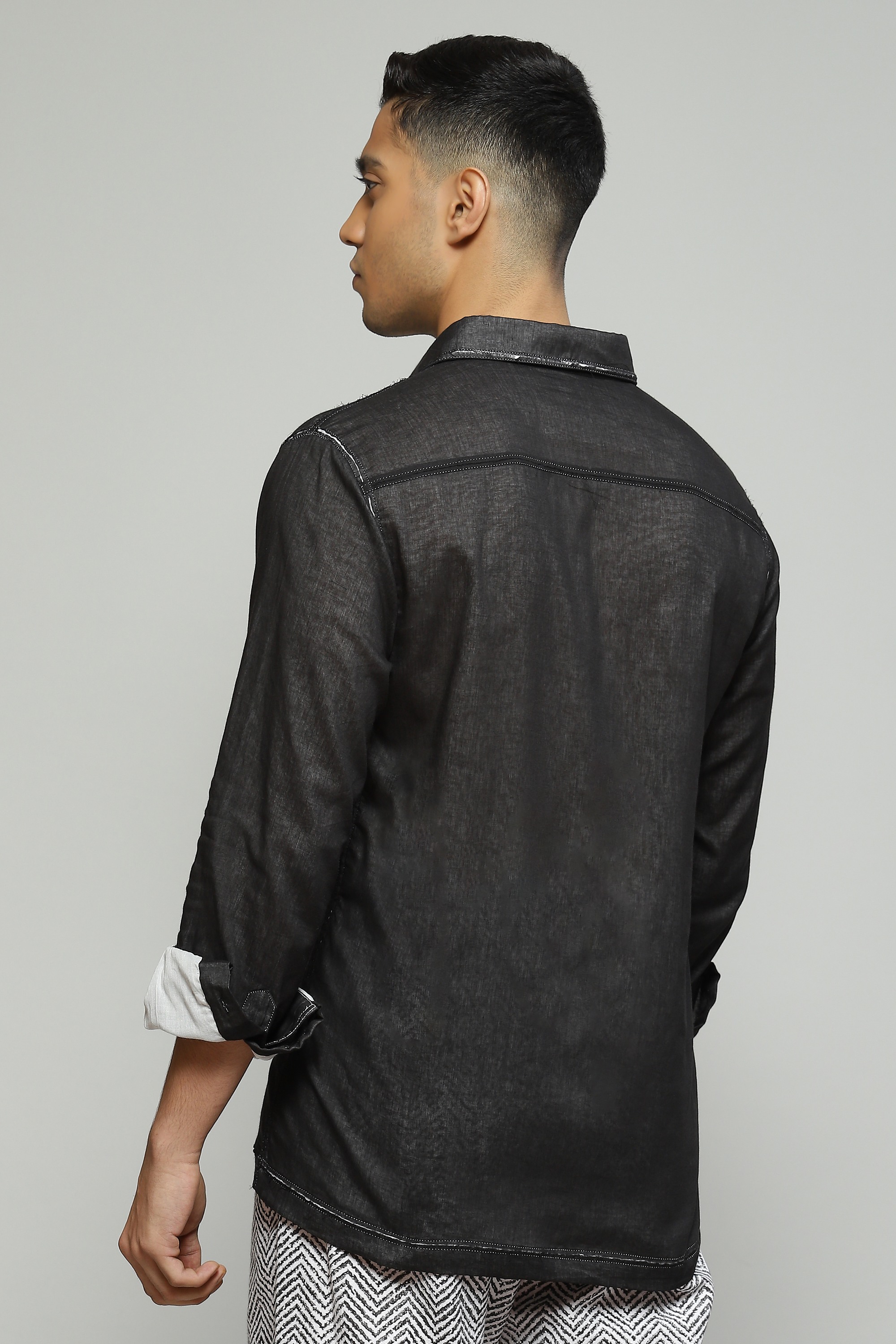 A structured black shirt featuring double voile cutwork Style with pleated black trousers for an elevated monochromatic look