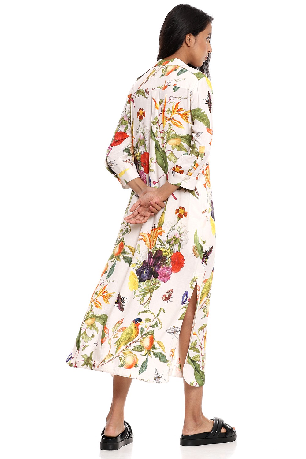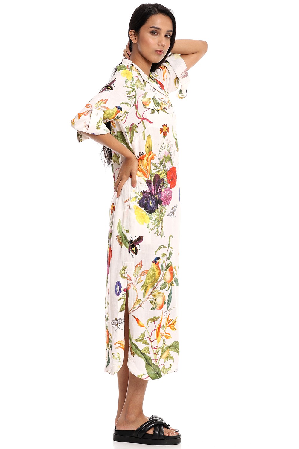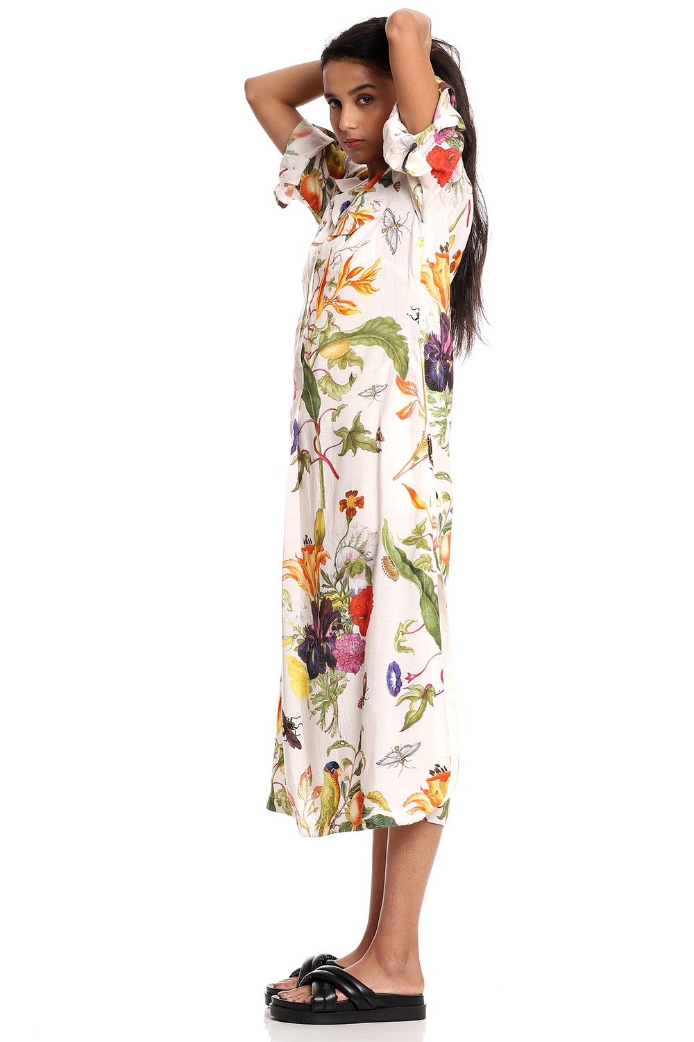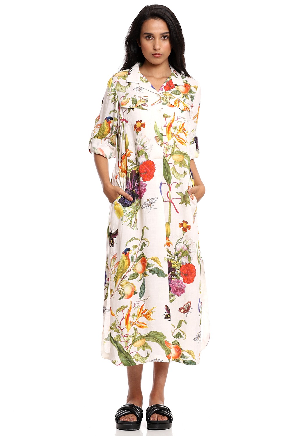 Fall in love and feel fabulous in this relaxed dress silhouette, crafted from a breathable celloulose blend fabric, multicolour tropical print on an ivory ground detailed with epaulettes, roll-up button down sleeves and added pockets.